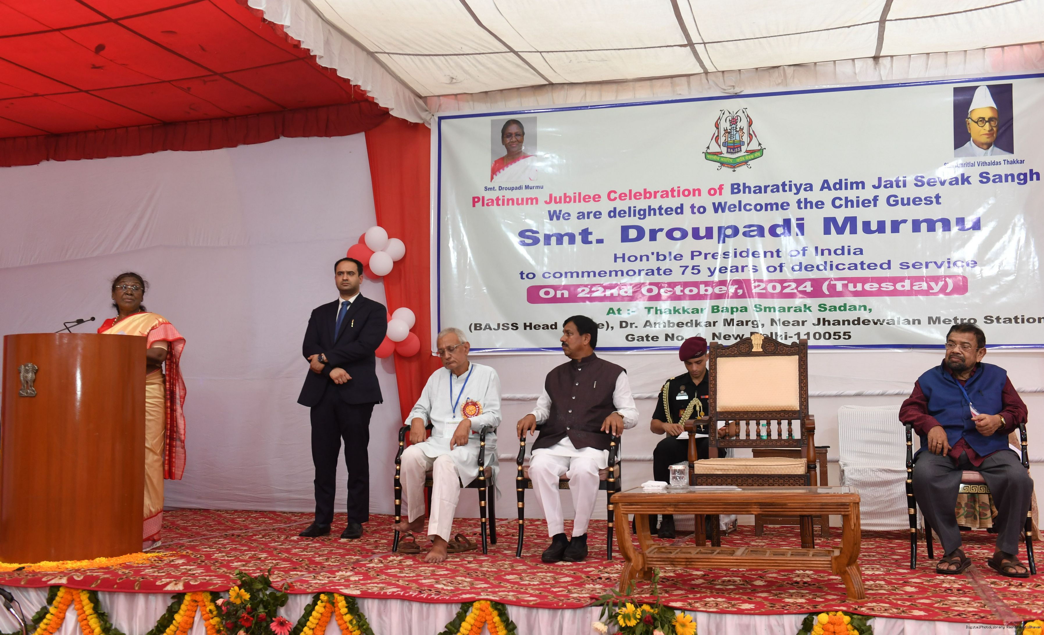 | Caption: | The President of India, Smt. Droupadi Murmu graced an event on the completion of 75 years of Bharatiya Adim Jati Sevak Sangh in New Delhi on October 22, 2024. |