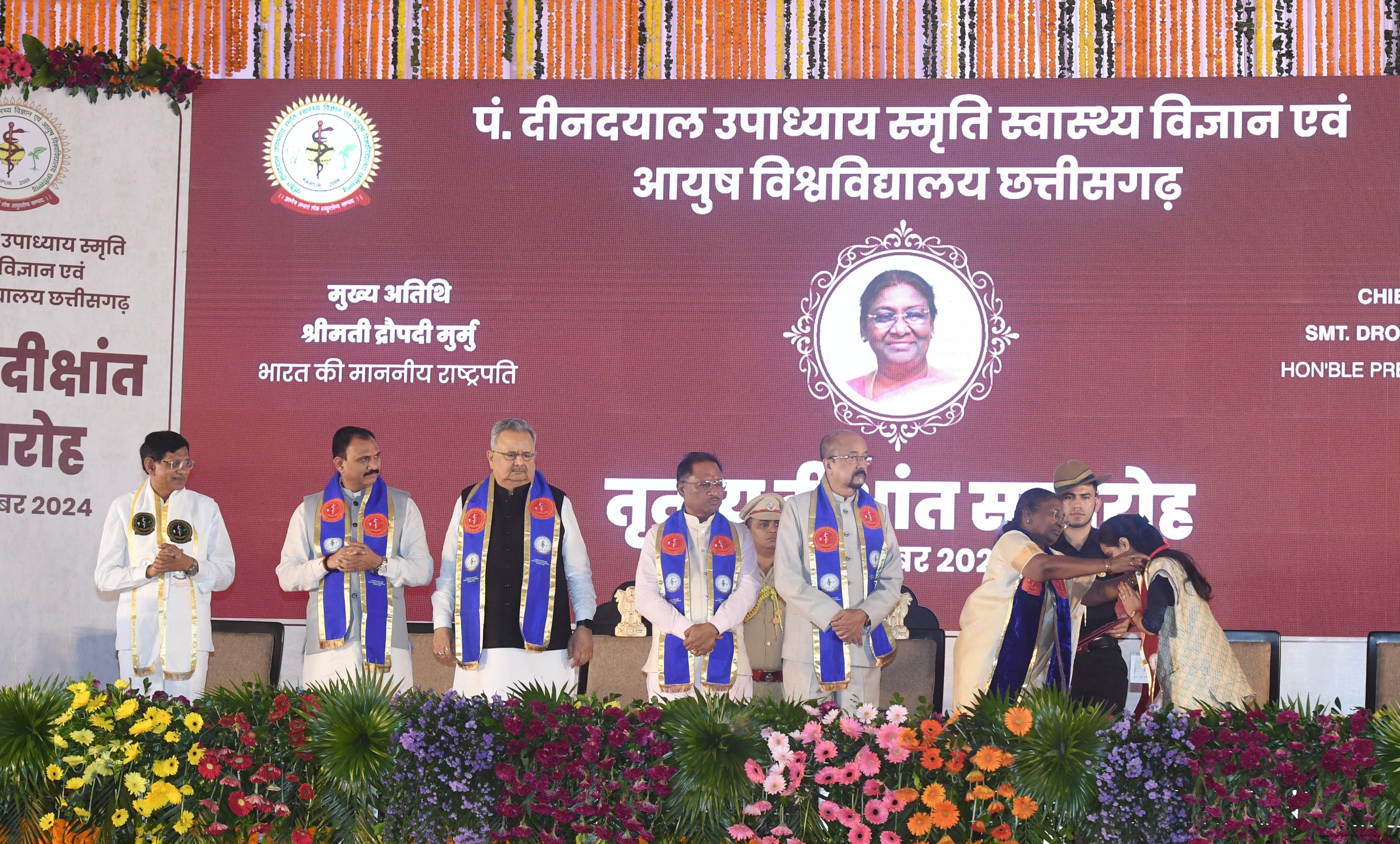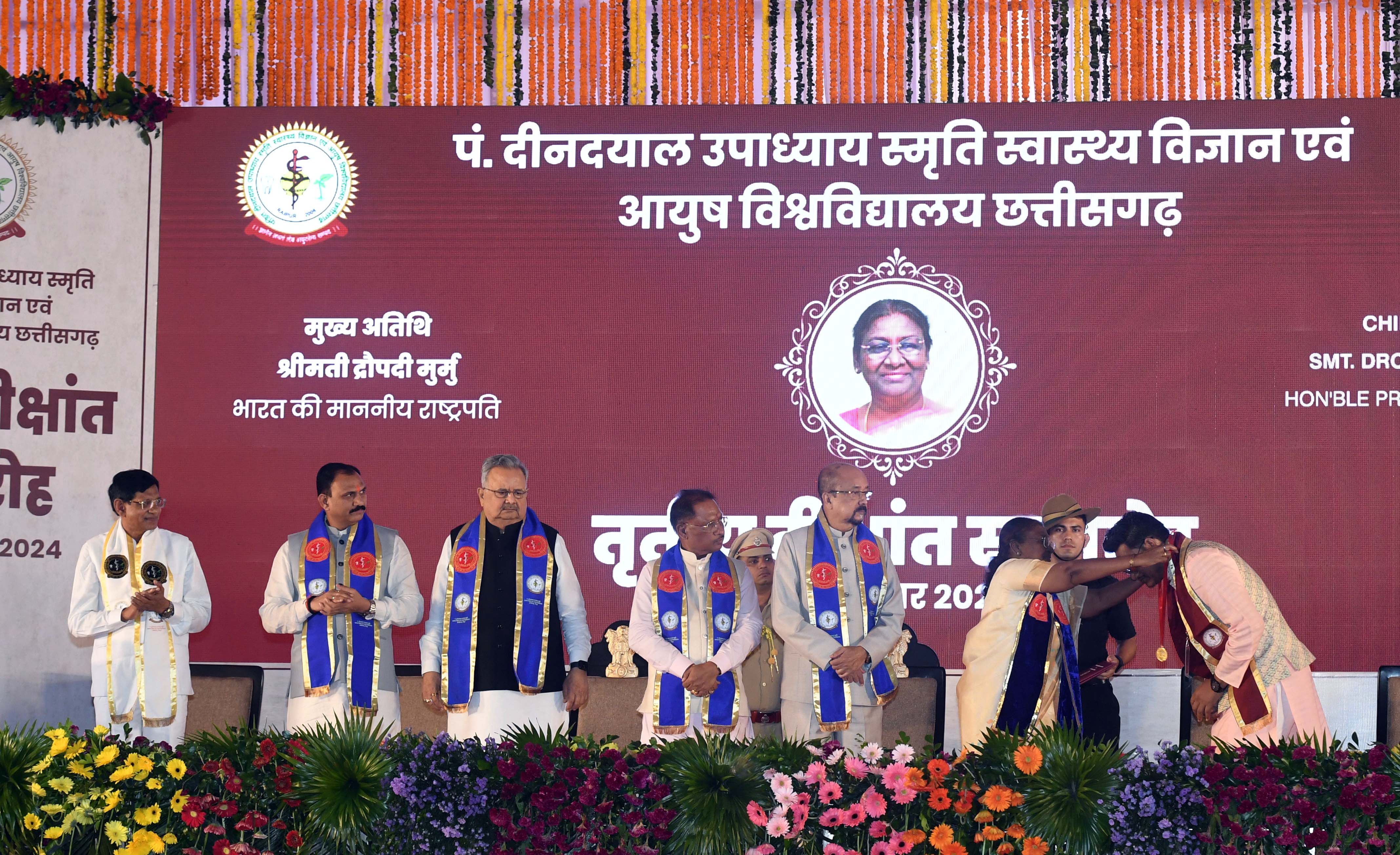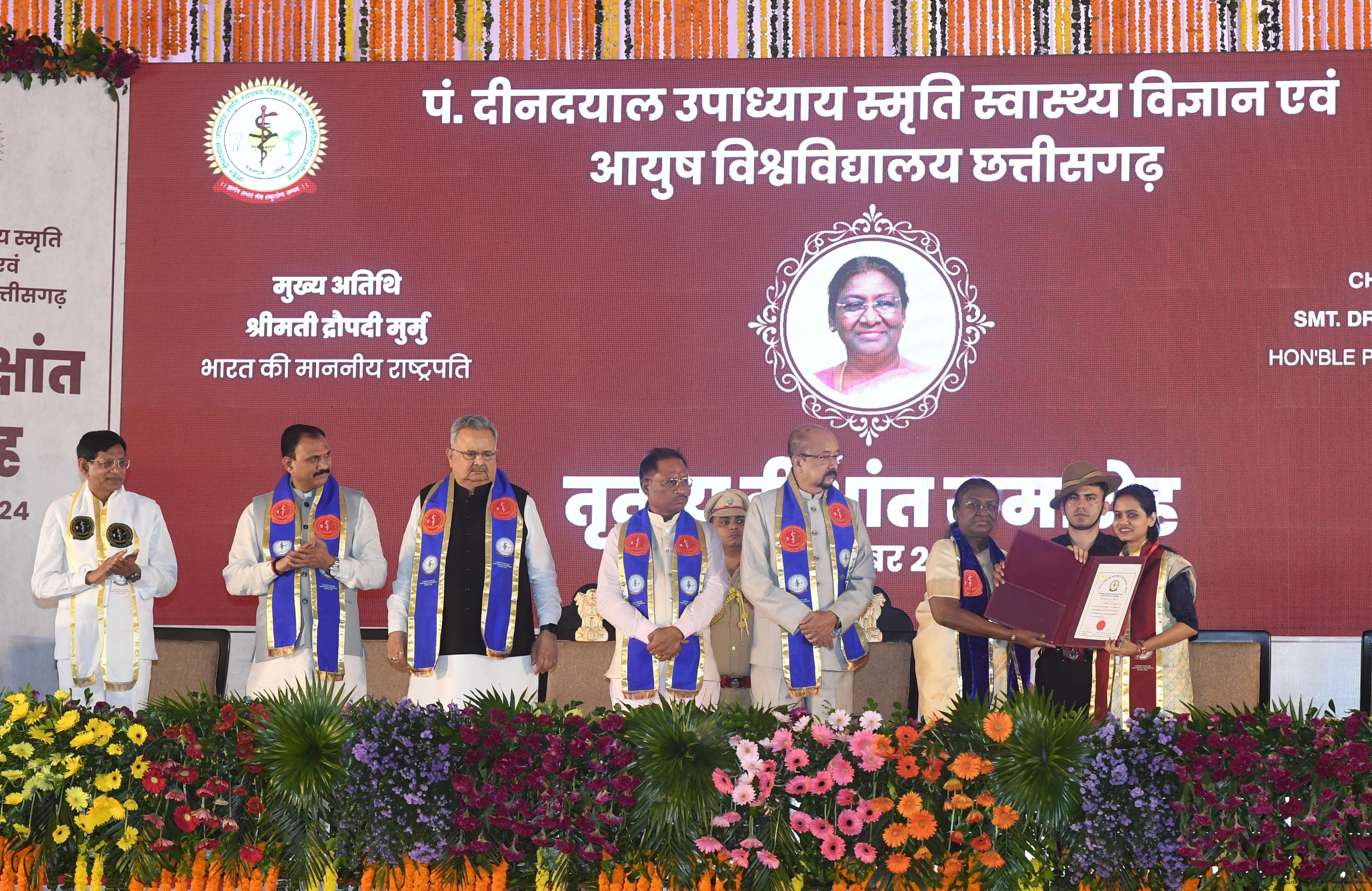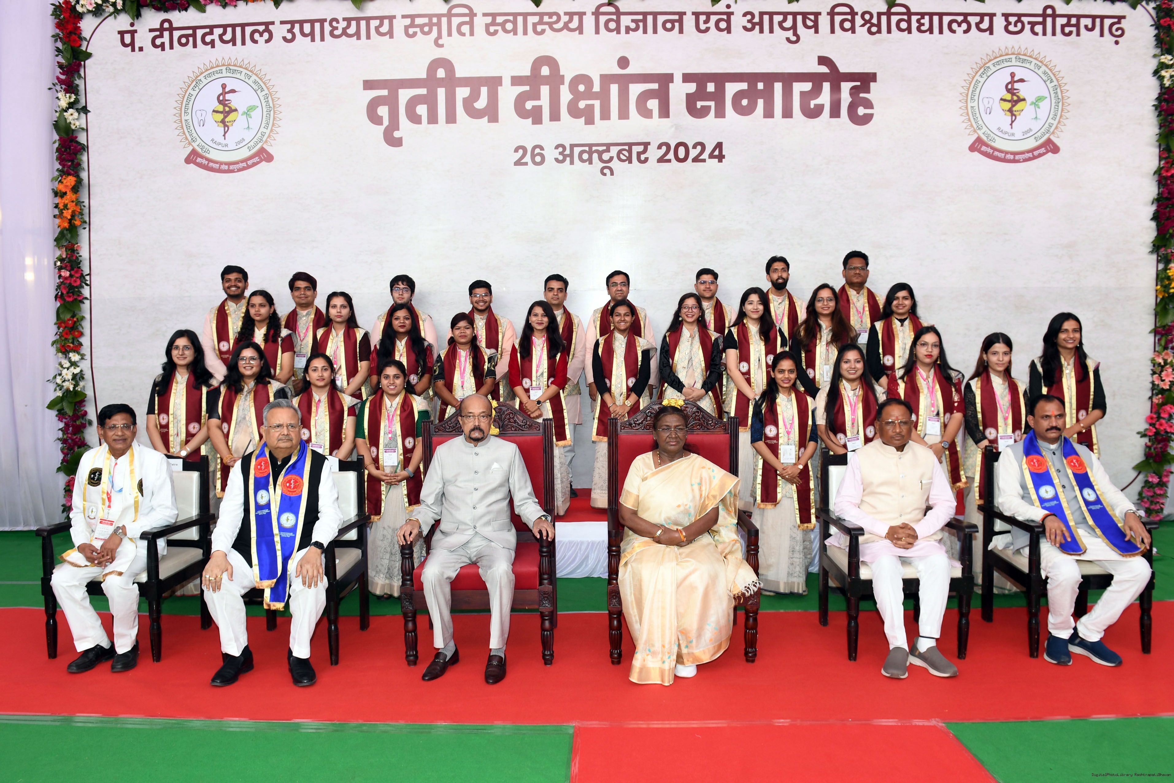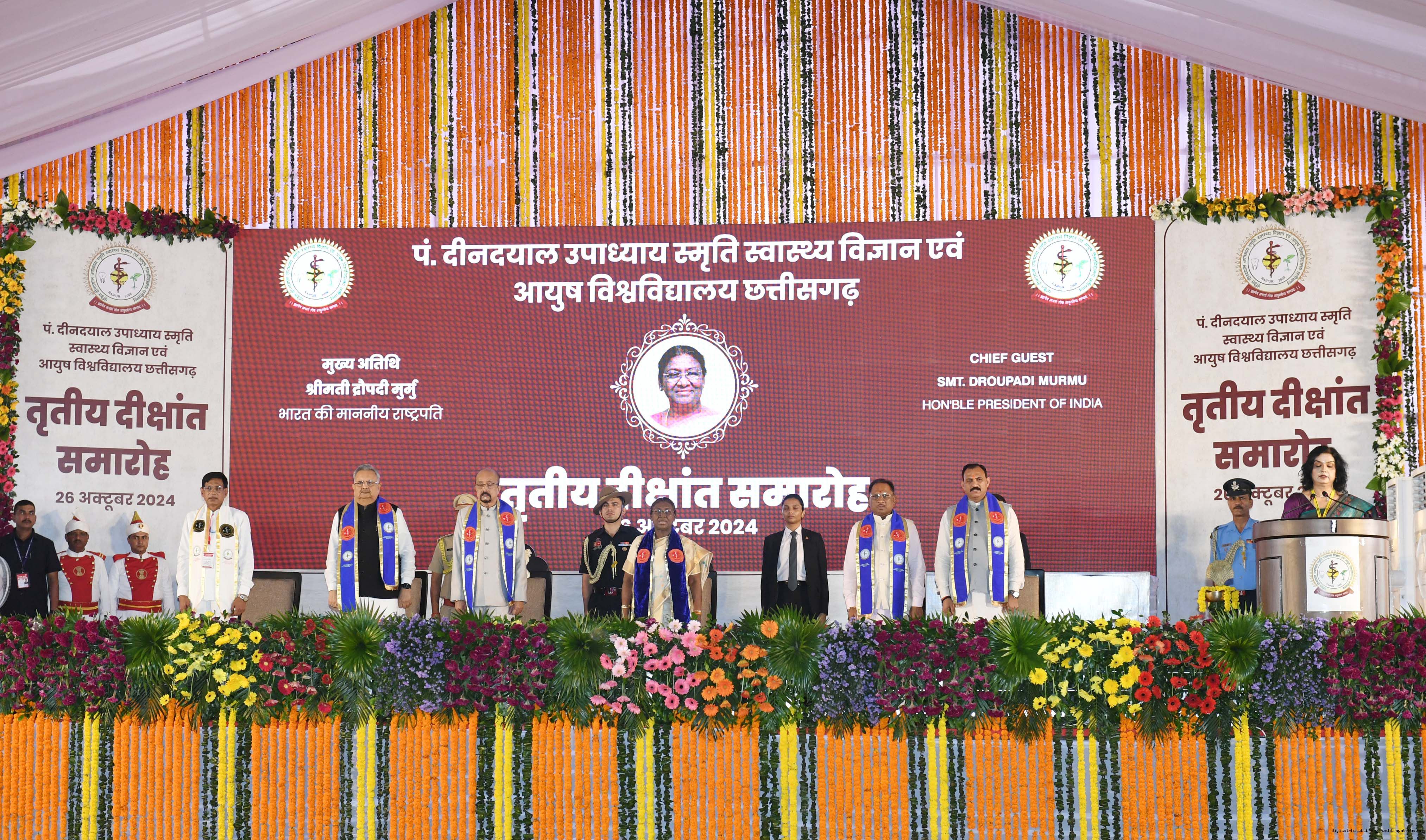 | Caption: | The President of India, Smt. Droupadi Murmu graced the convocation ceremony of Pt. Deendayal Upadhyaya Memorial Health Science and Ayush University of Chhattisgarh at Raipur on October 26, 2024. |