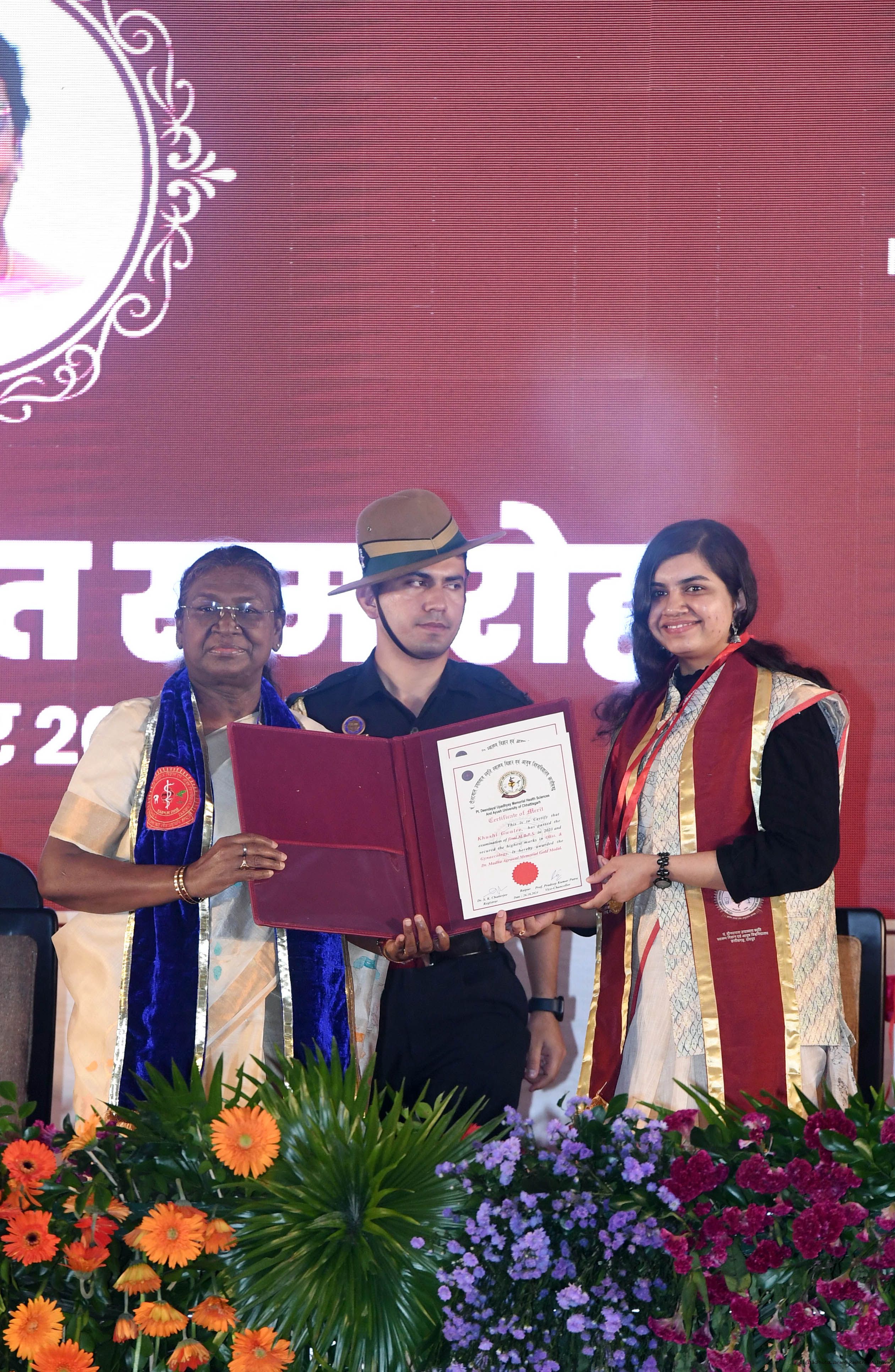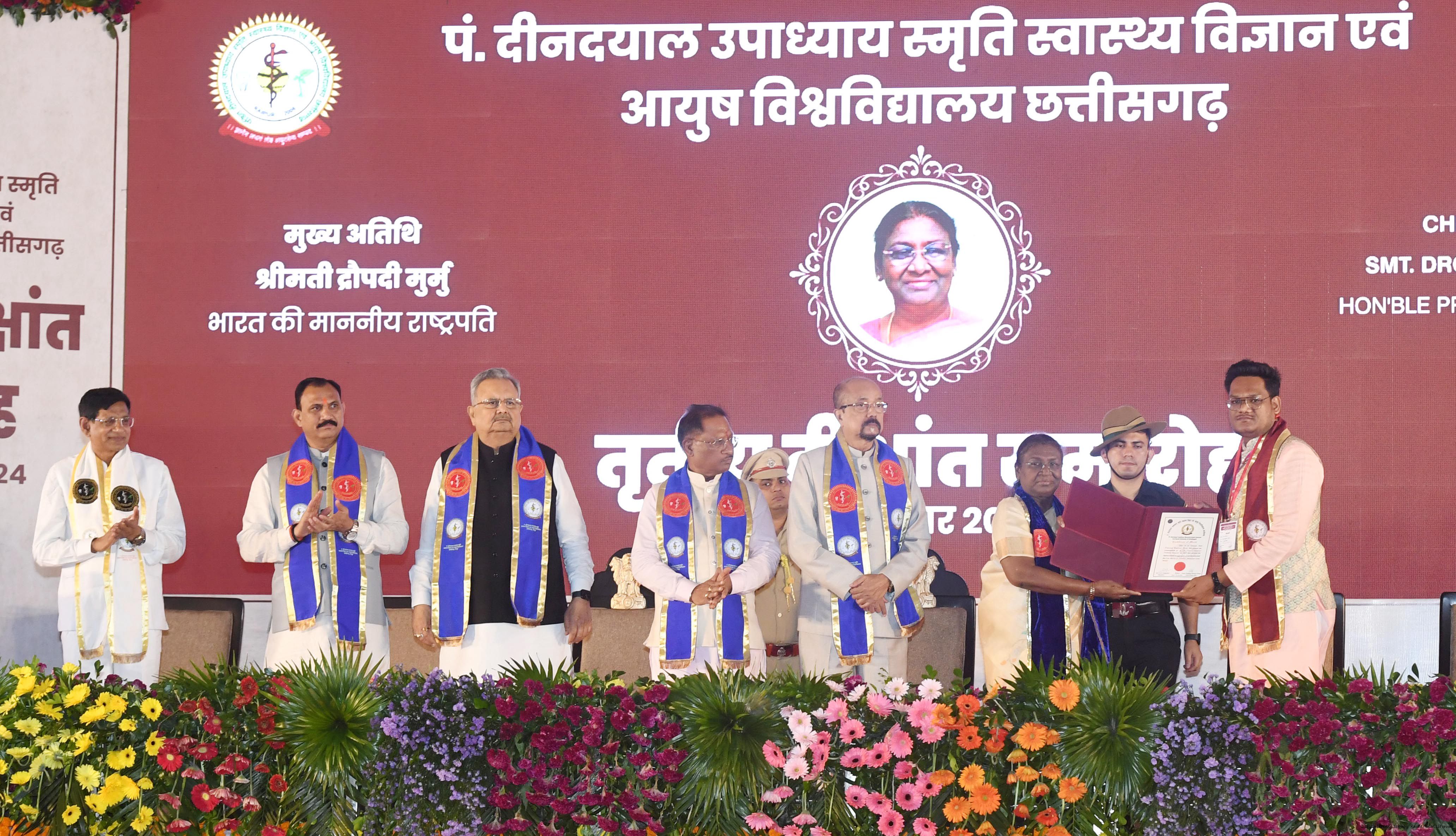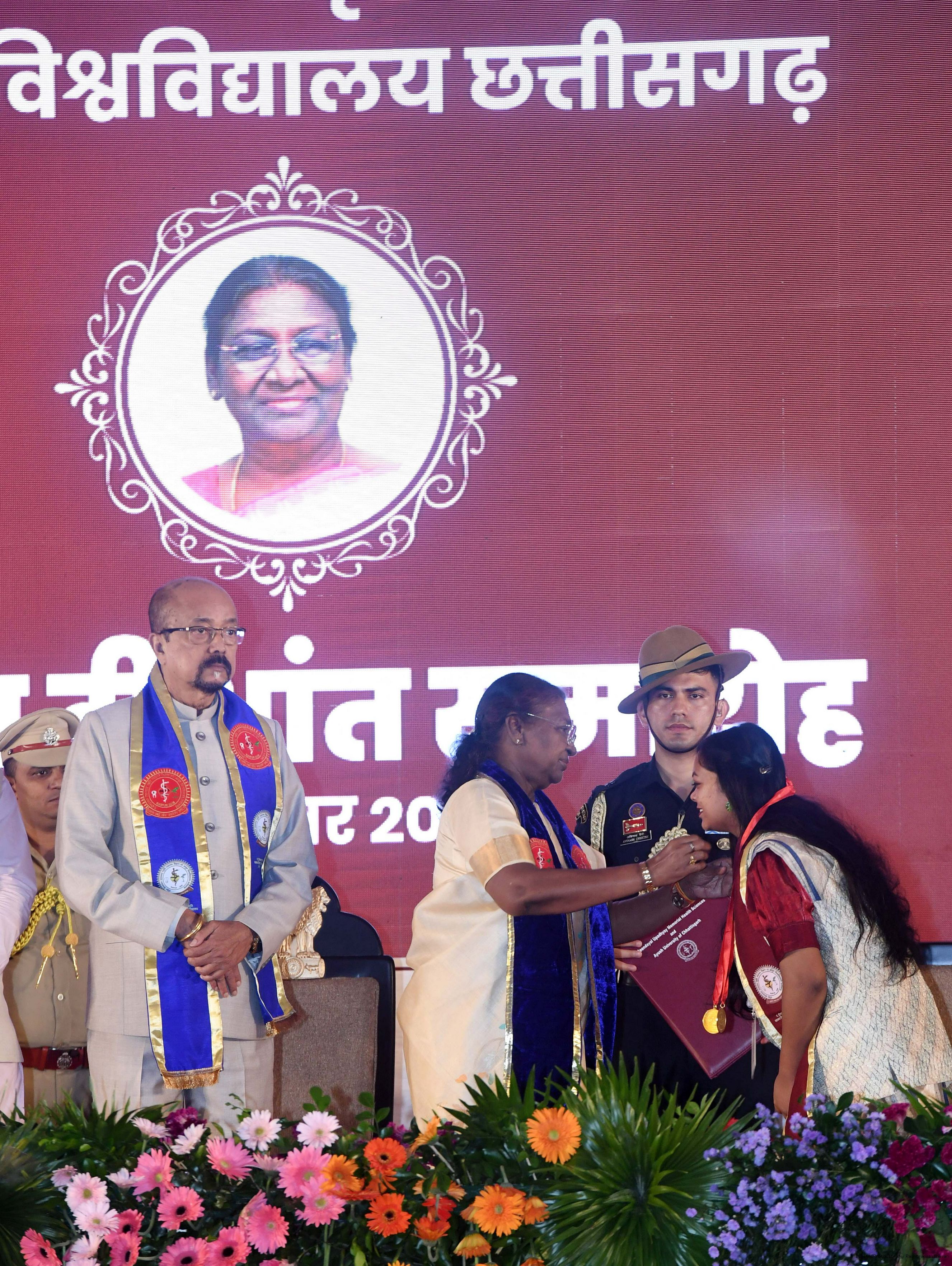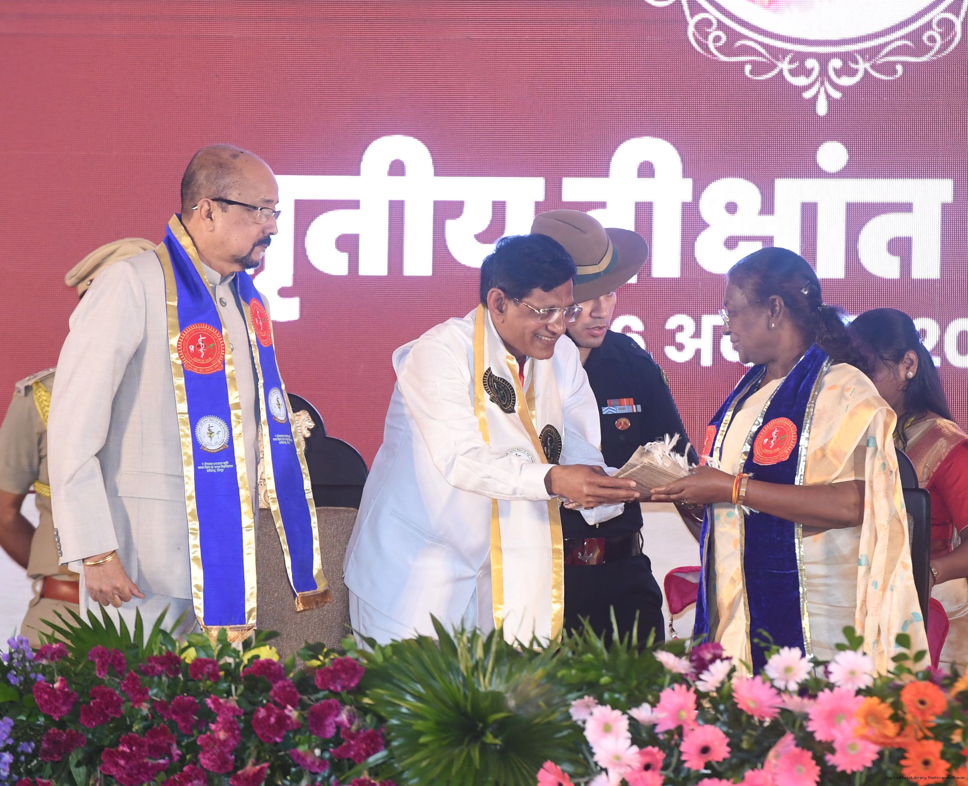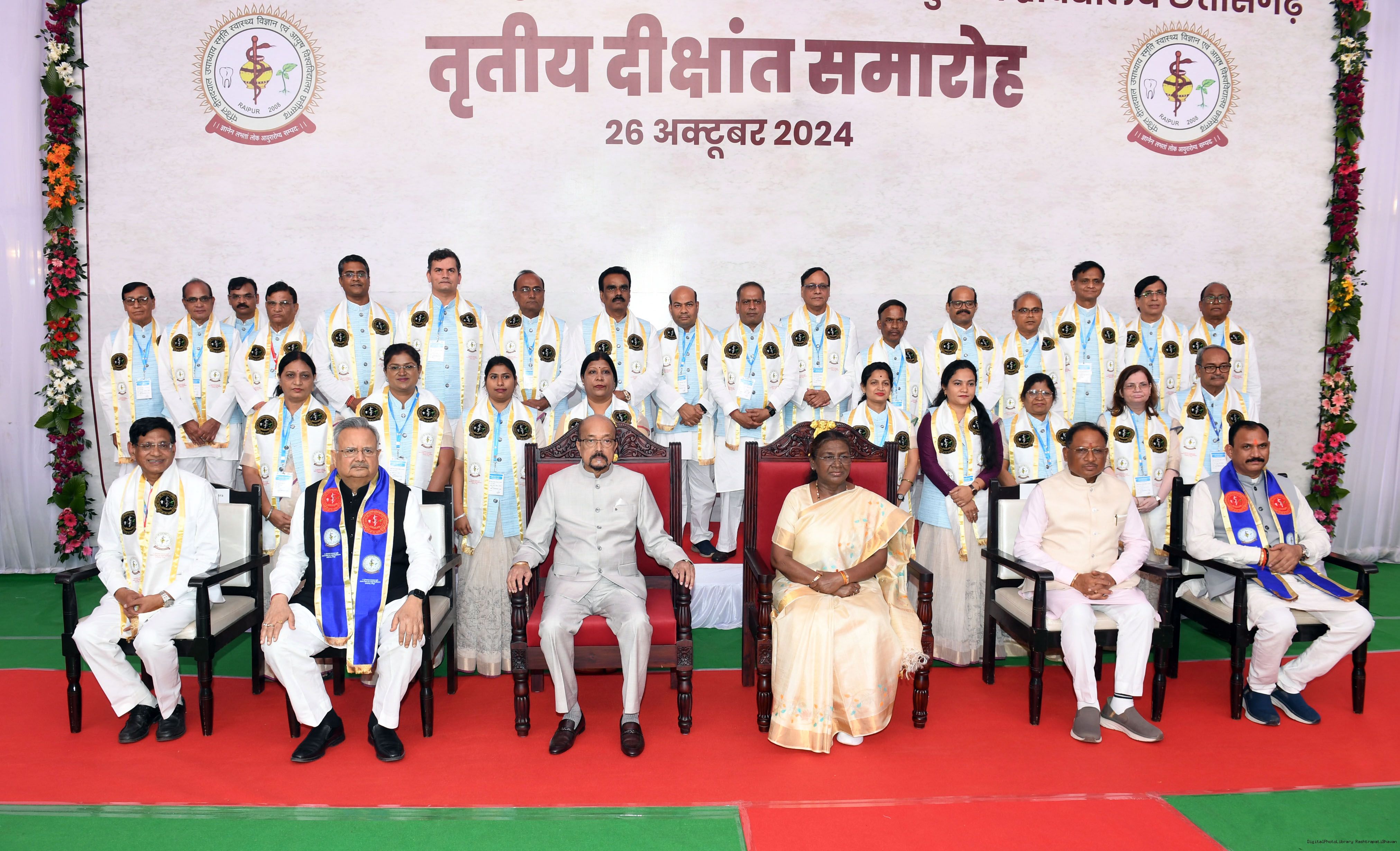 | Caption: | The President of India, Smt. Droupadi Murmu graced the convocation ceremony of Pt. Deendayal Upadhyaya Memorial Health Science and Ayush University of Chhattisgarh at Raipur on October 26, 2024. |