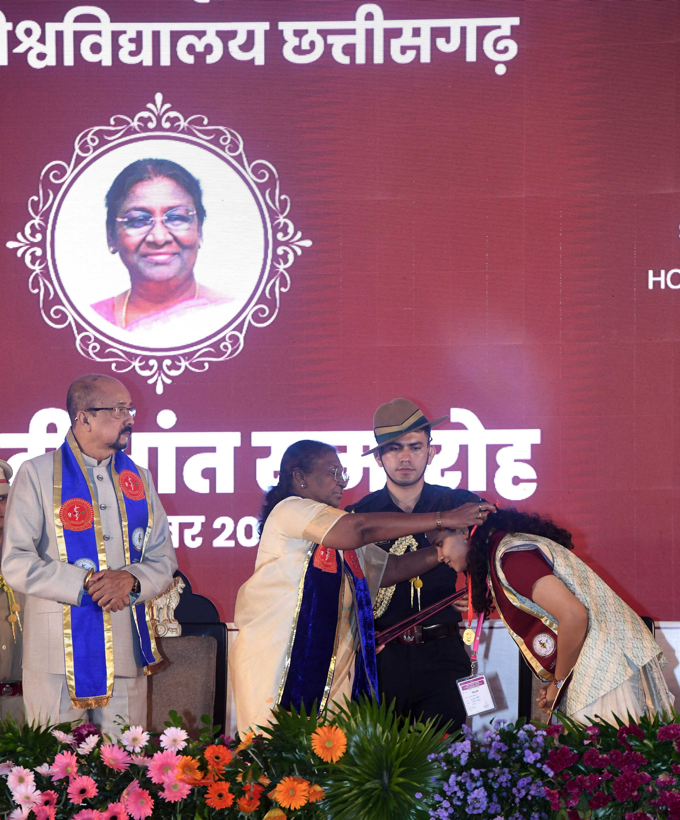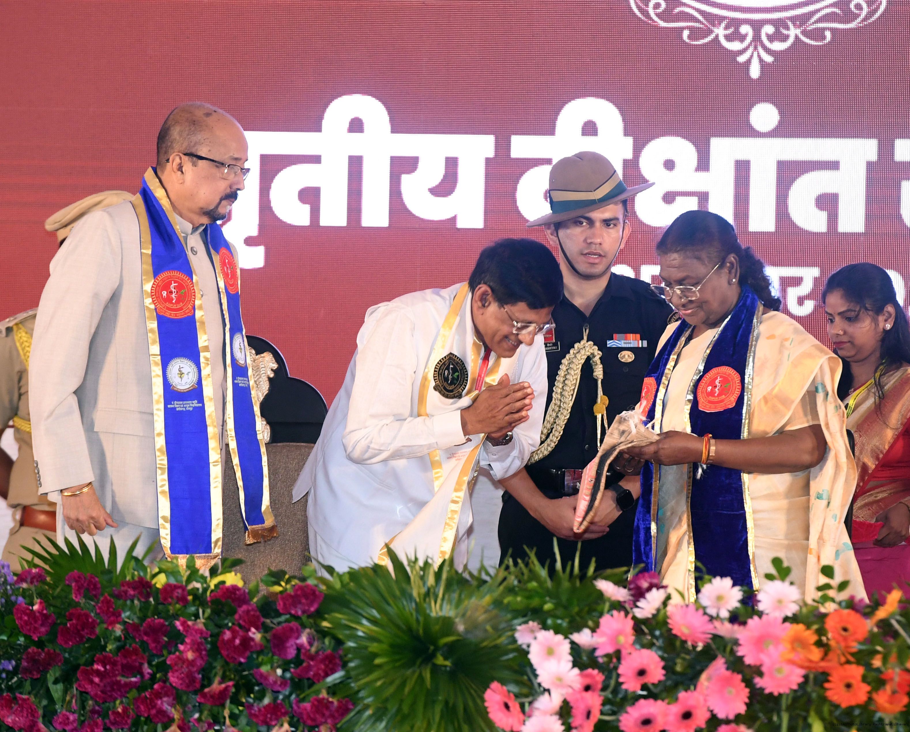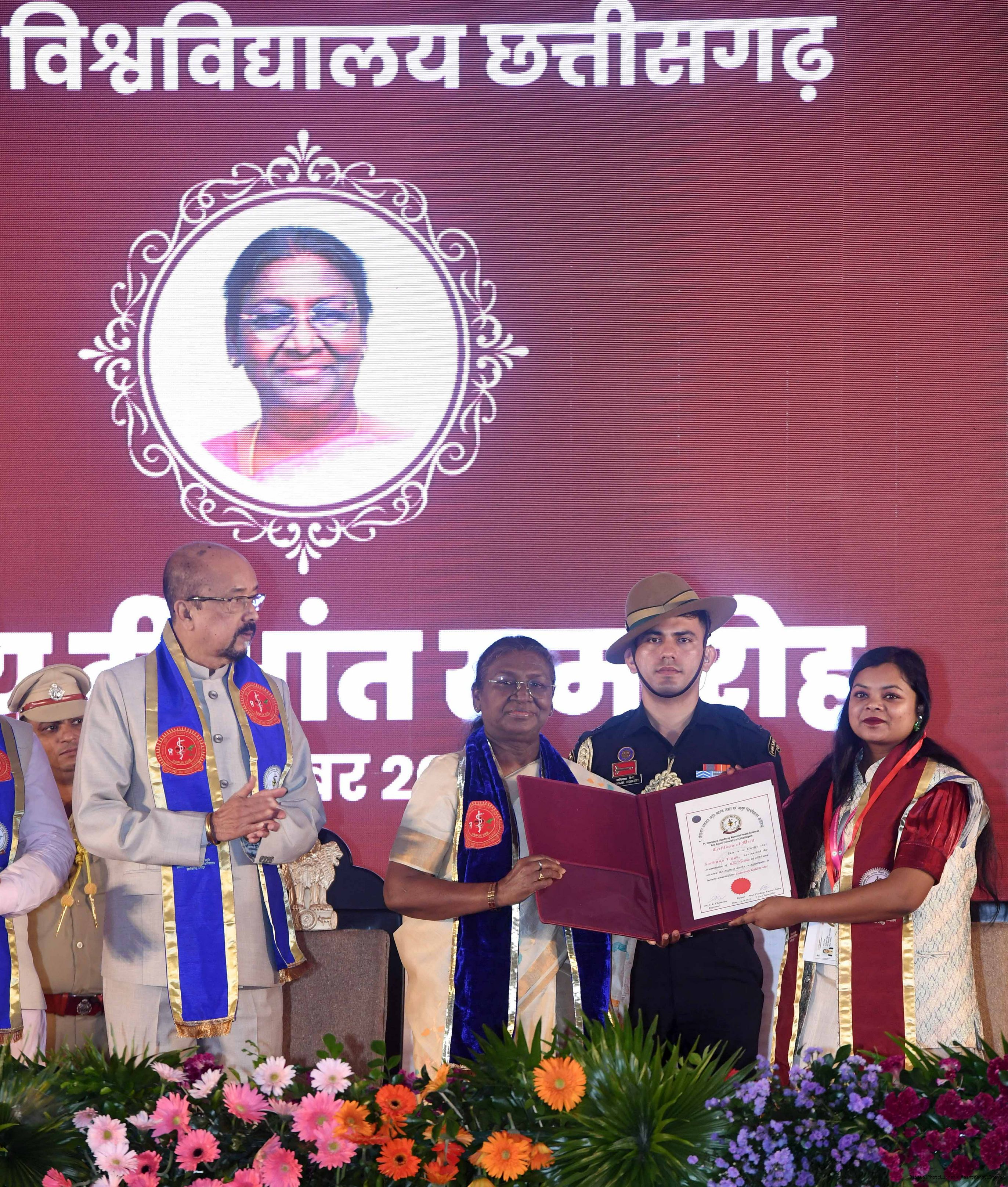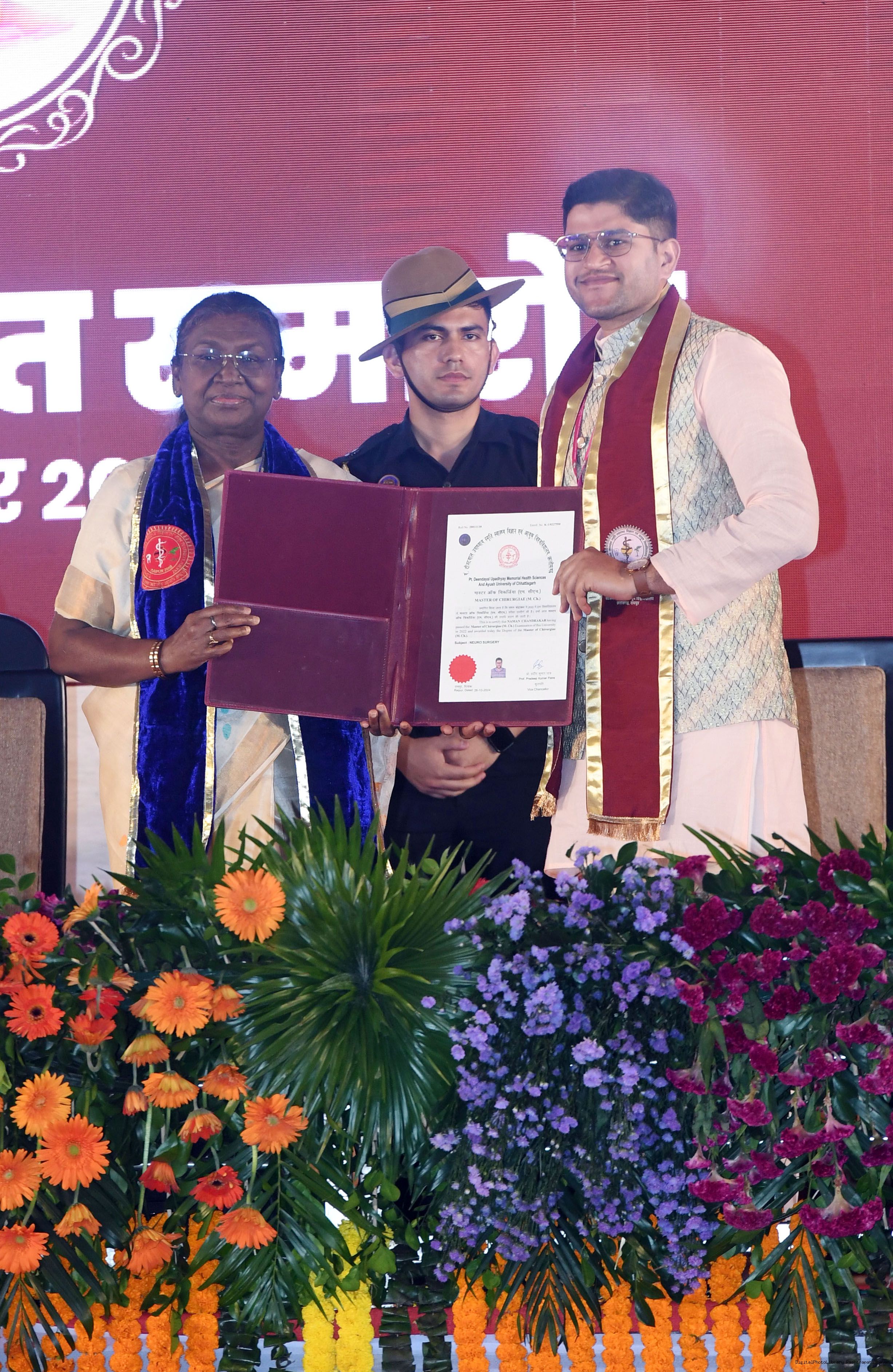 | Caption: | The President of India, Smt. Droupadi Murmu graced the convocation ceremony of Pt. Deendayal Upadhyaya Memorial Health Science and Ayush University of Chhattisgarh at Raipur on October 26, 2024. |