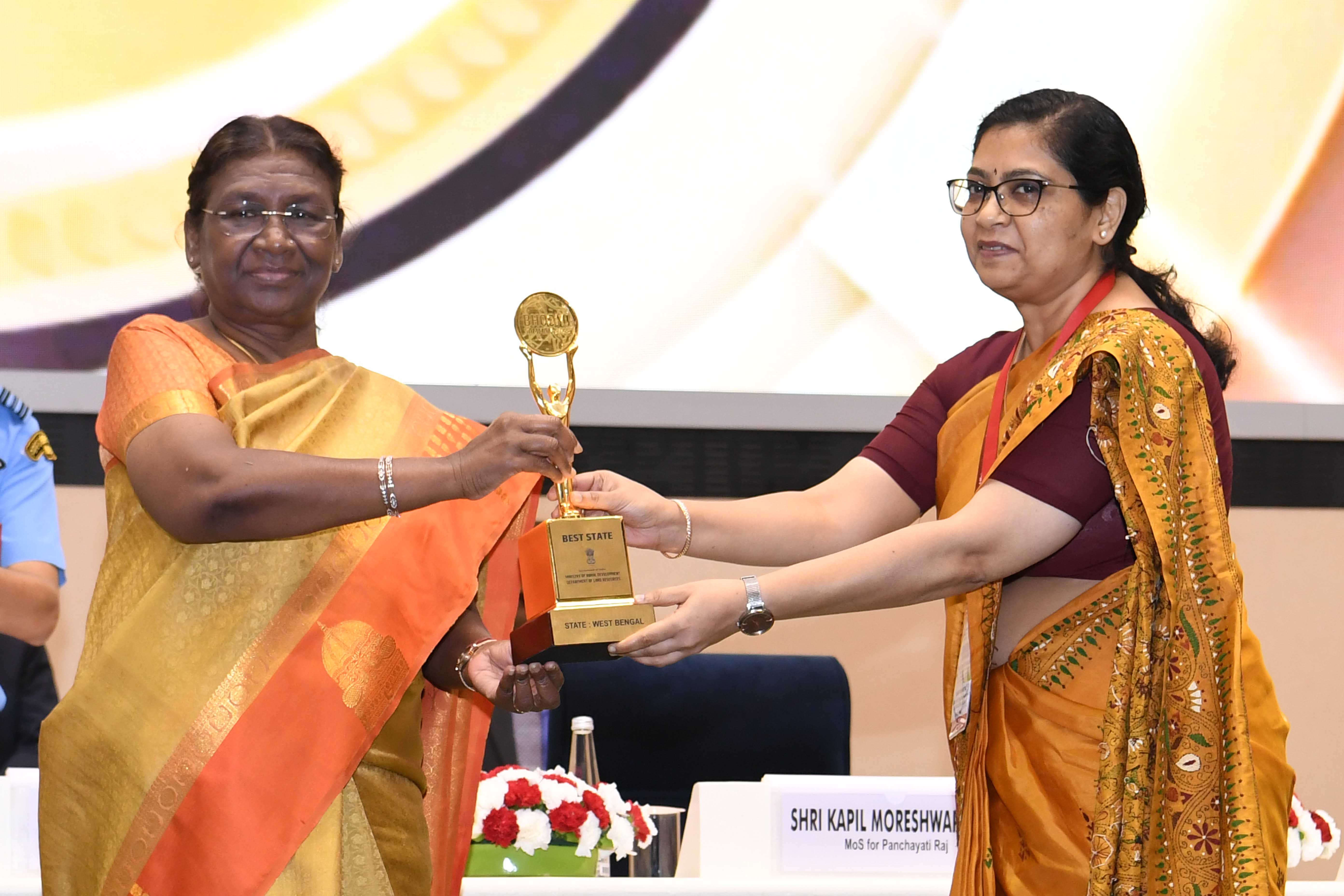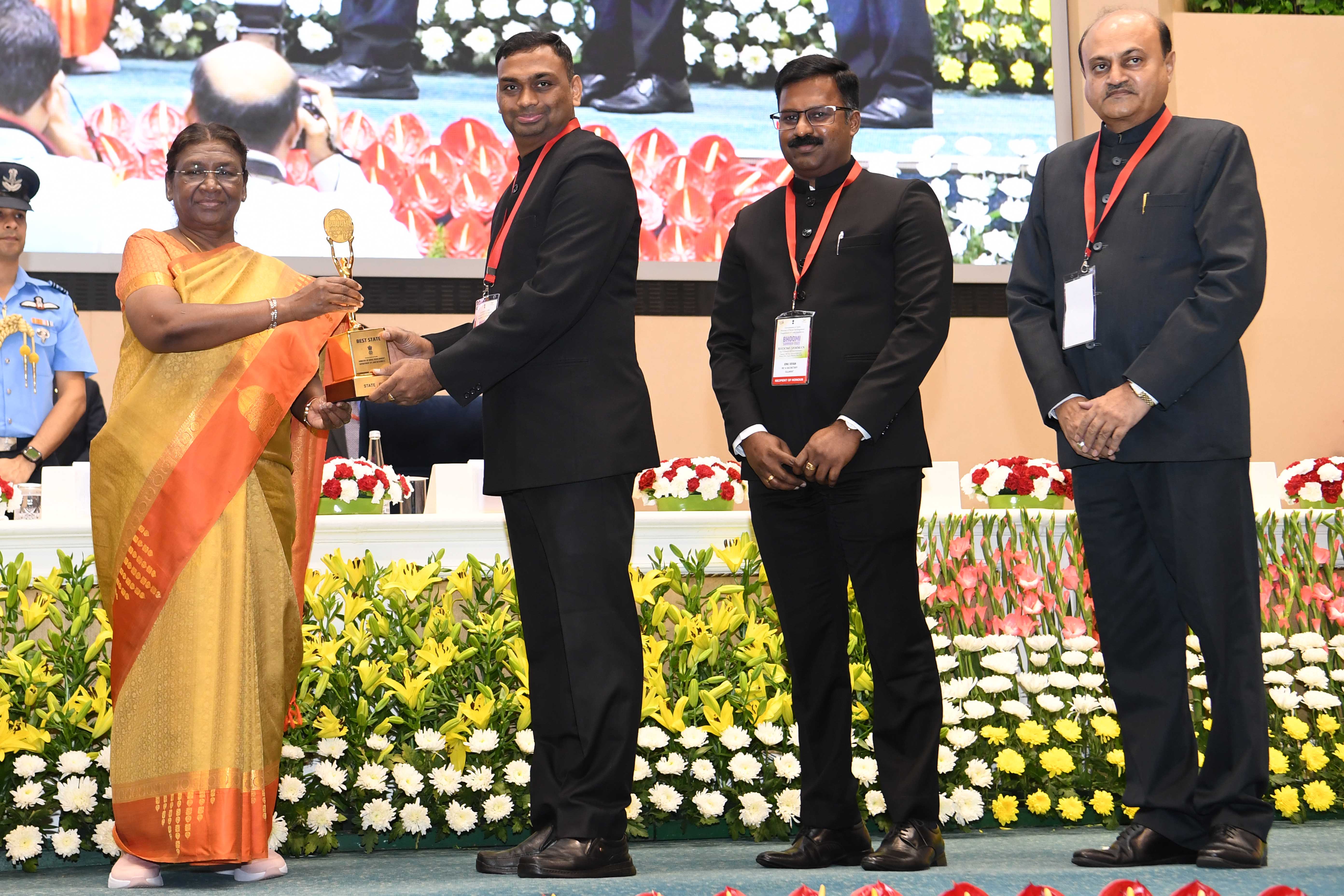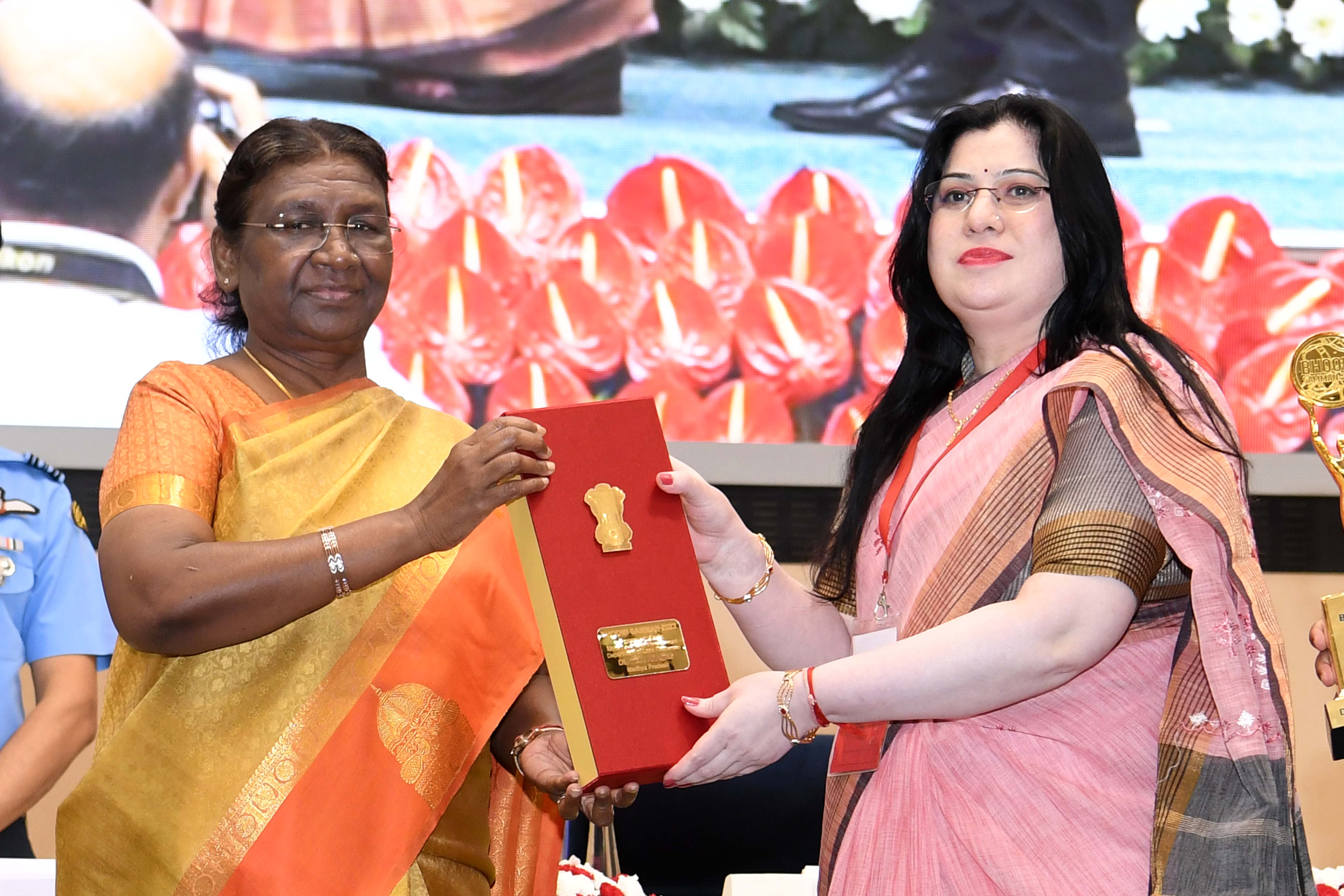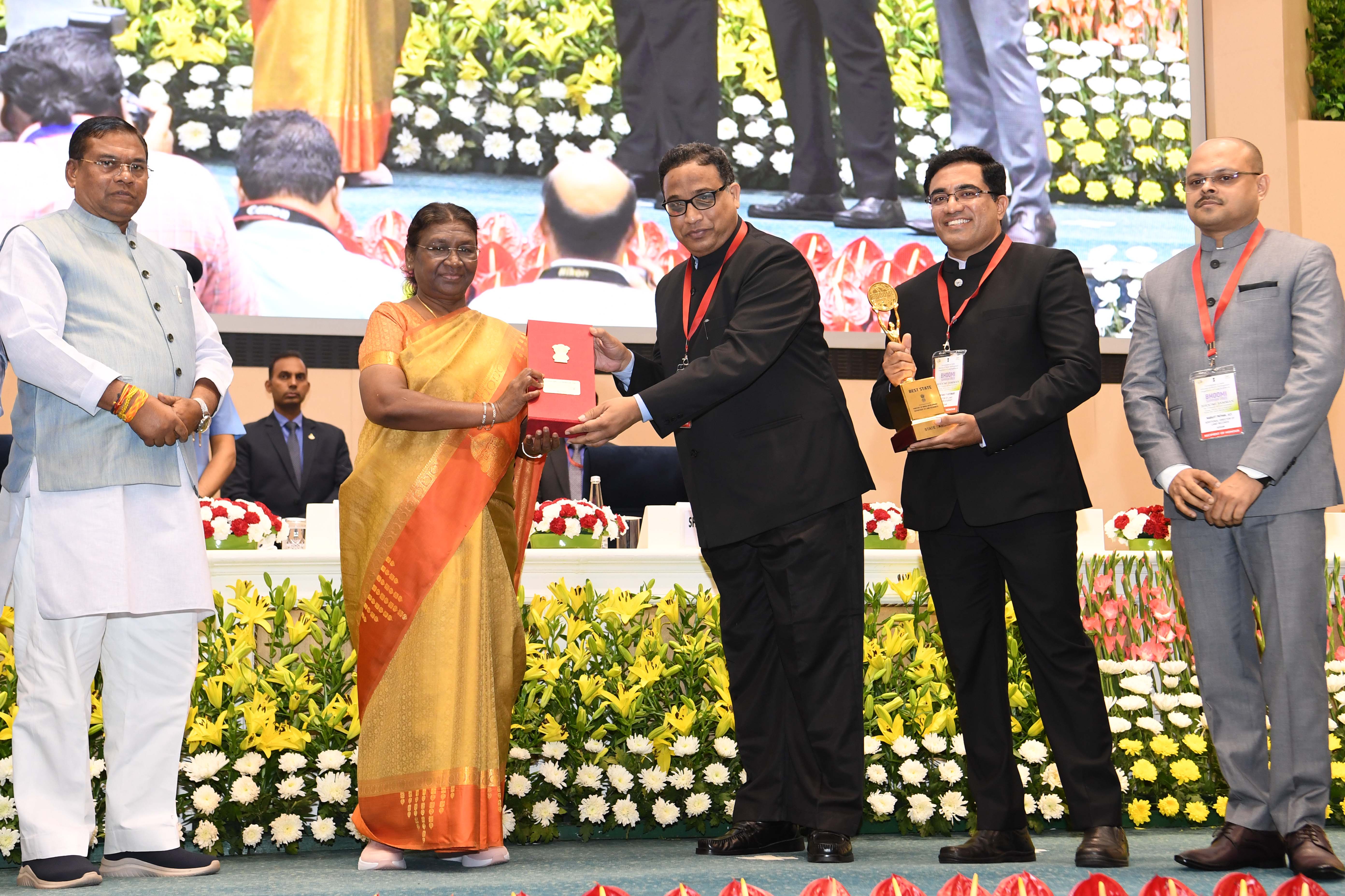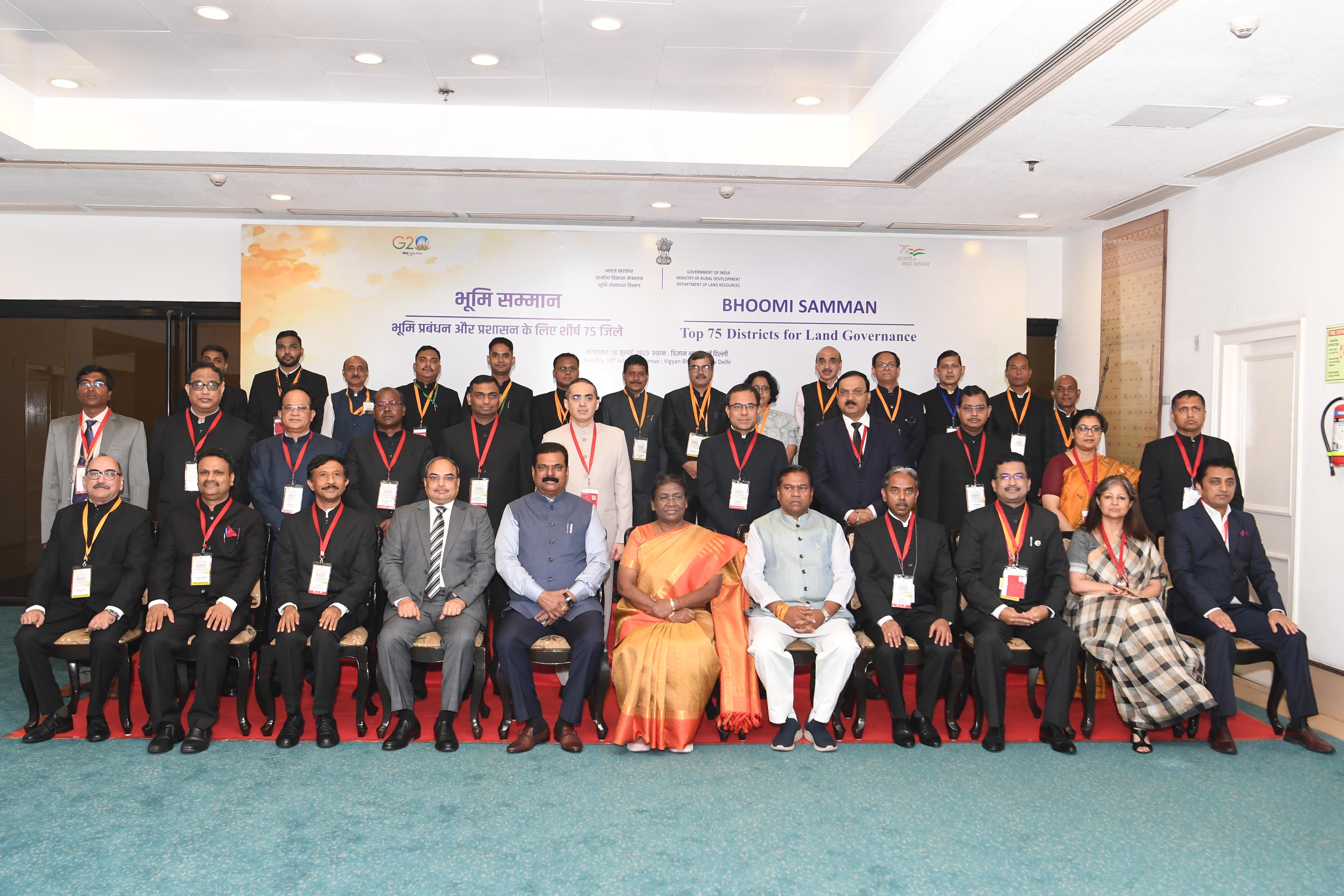 | Caption: | The President of India, Smt Droupadi Murmu presented the "Bhoomi Samman" 2023 at a function organised by the Union Ministry of Rural Development at Vigyan Bhavan in New Delhi on July 18, 2023. |