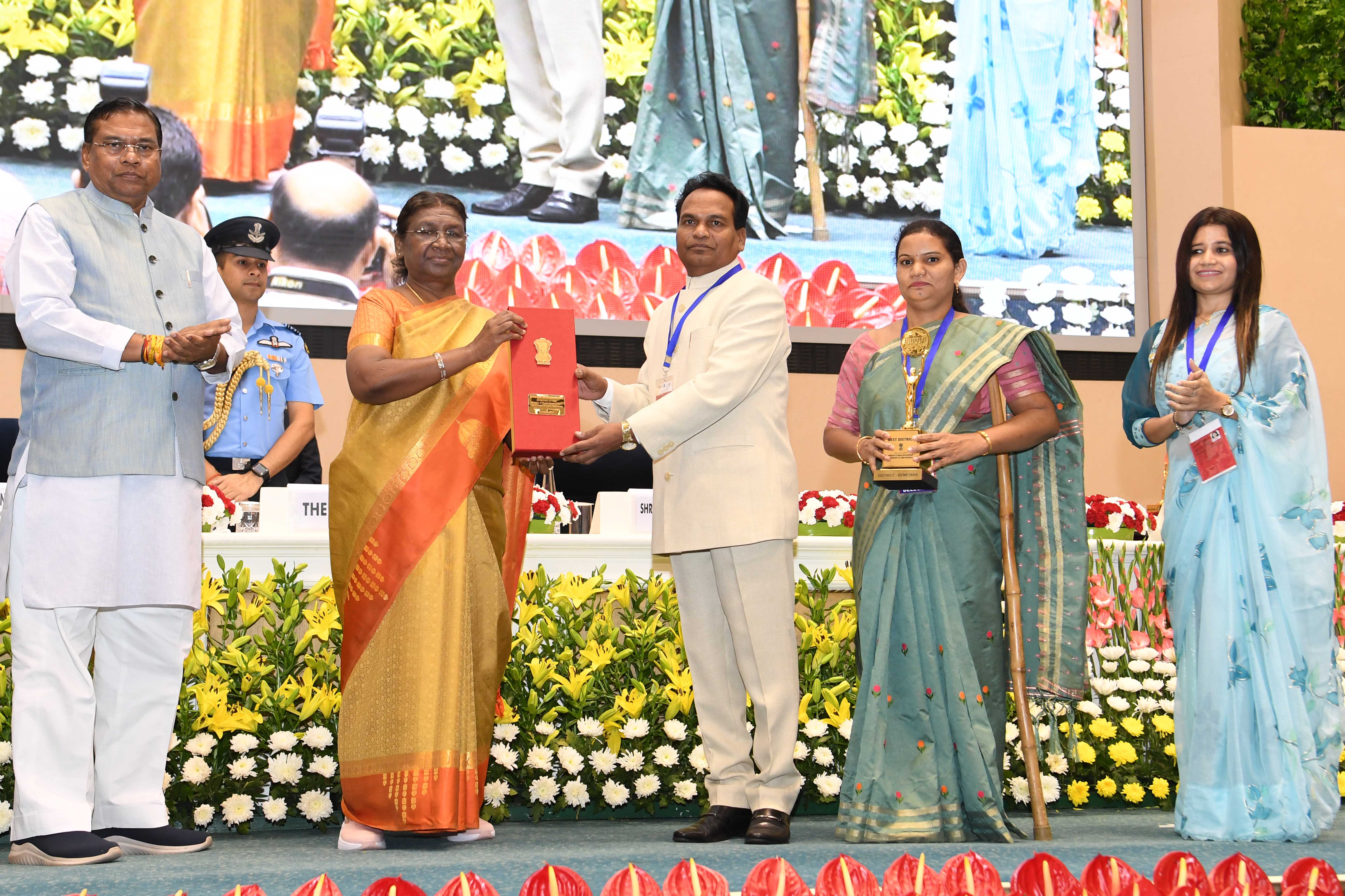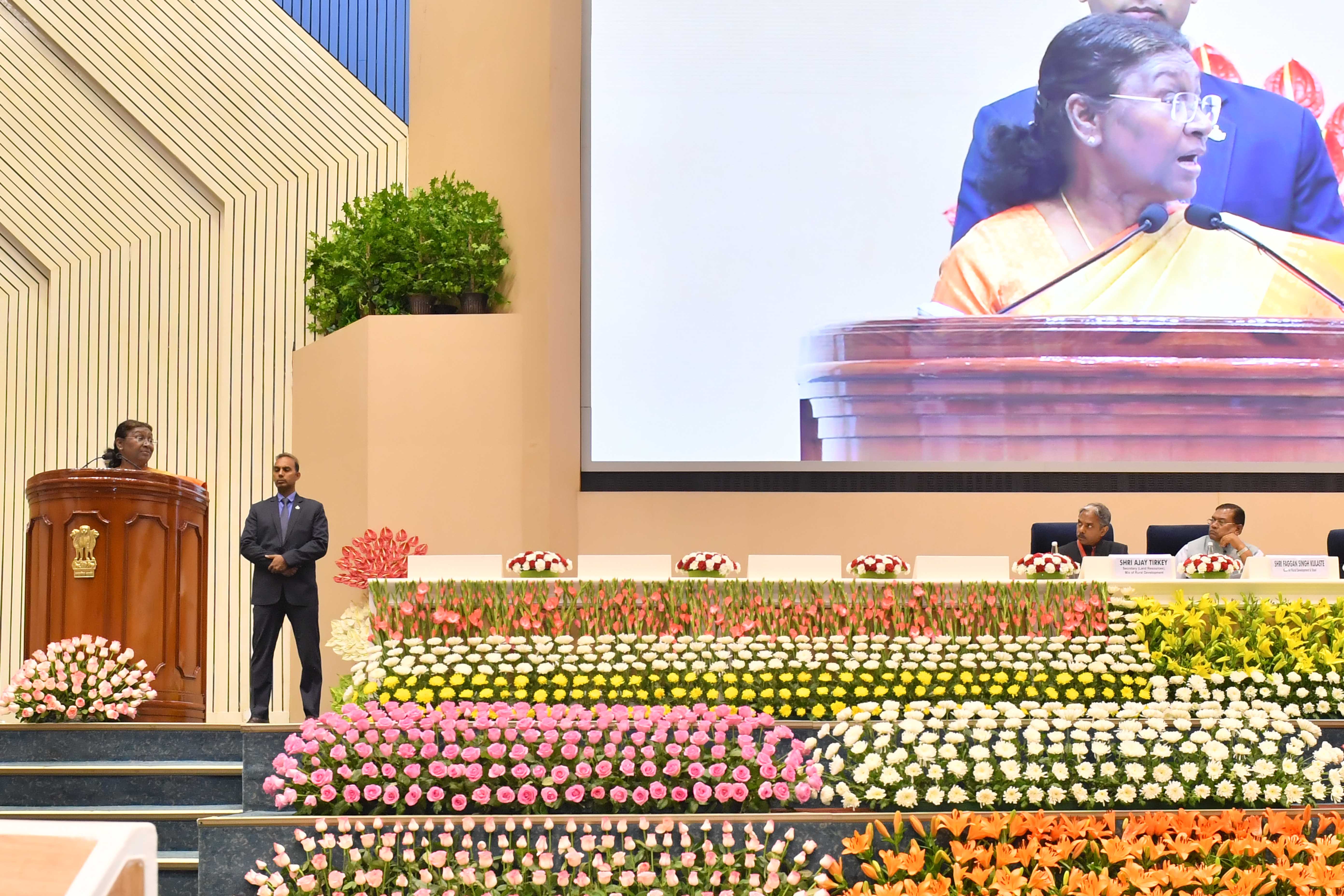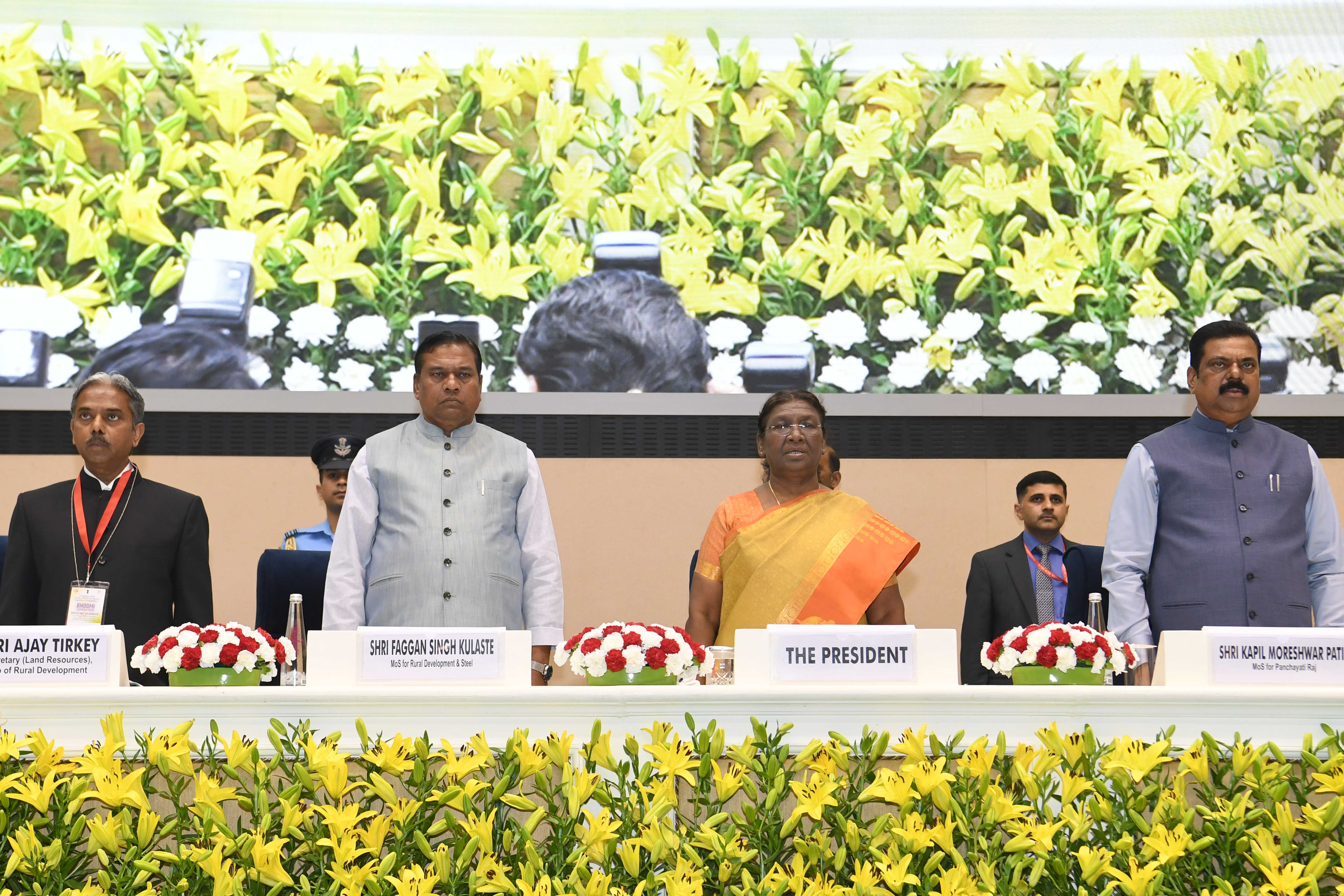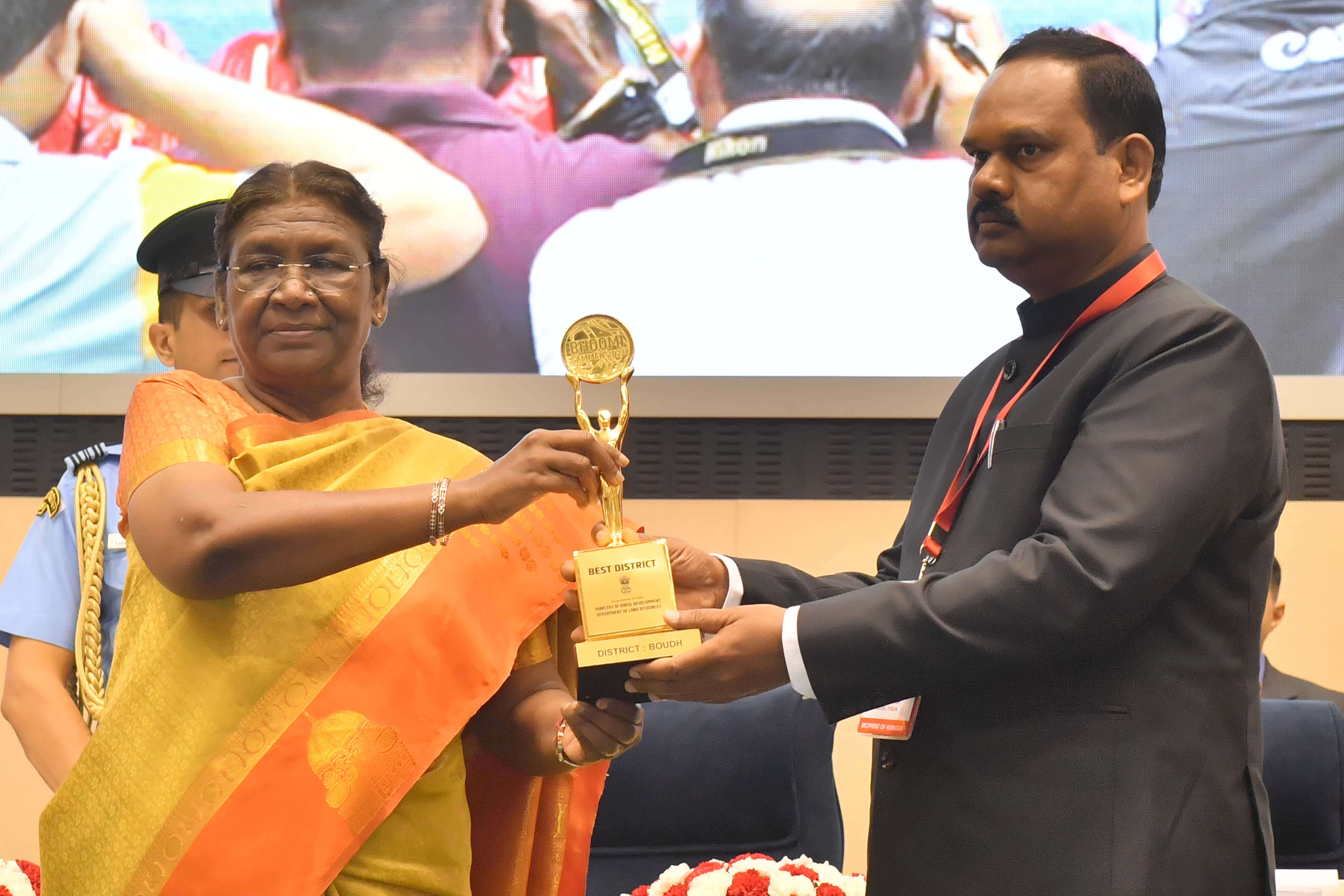 | Caption: | The President of India, Smt Droupadi Murmu presented the "Bhoomi Samman" 2023 at a function organised by the Union Ministry of Rural Development at Vigyan Bhavan in New Delhi on July 18, 2023. |