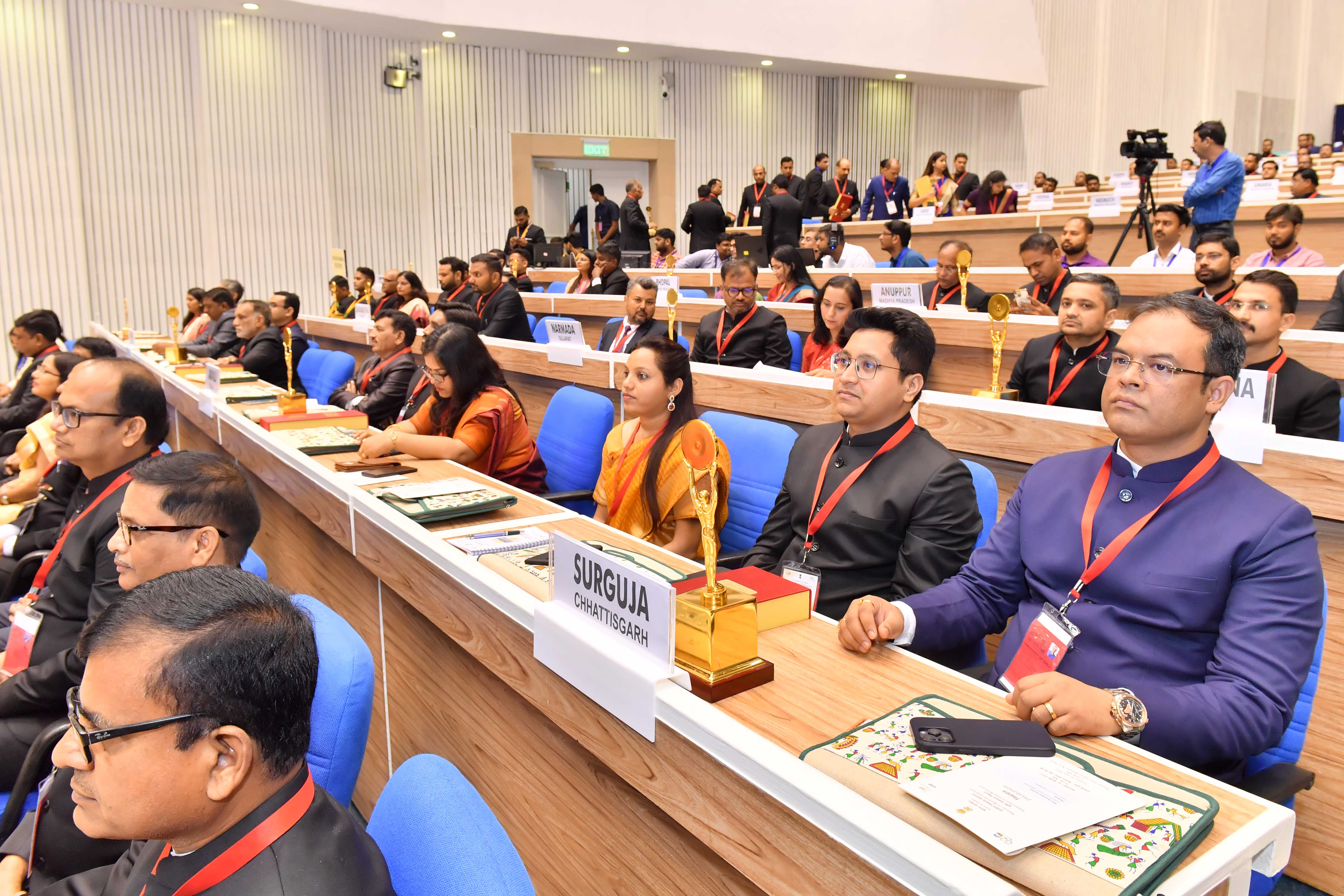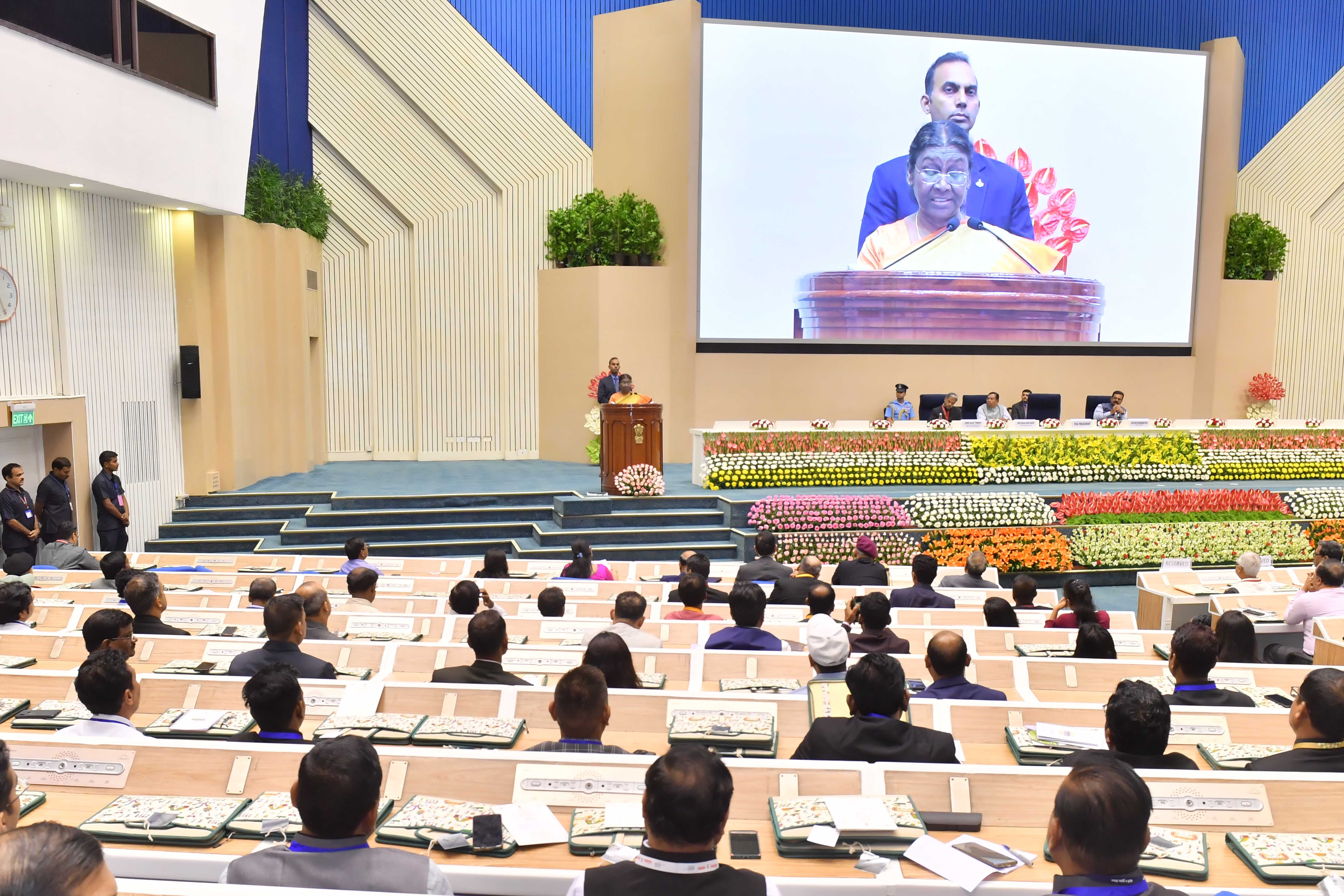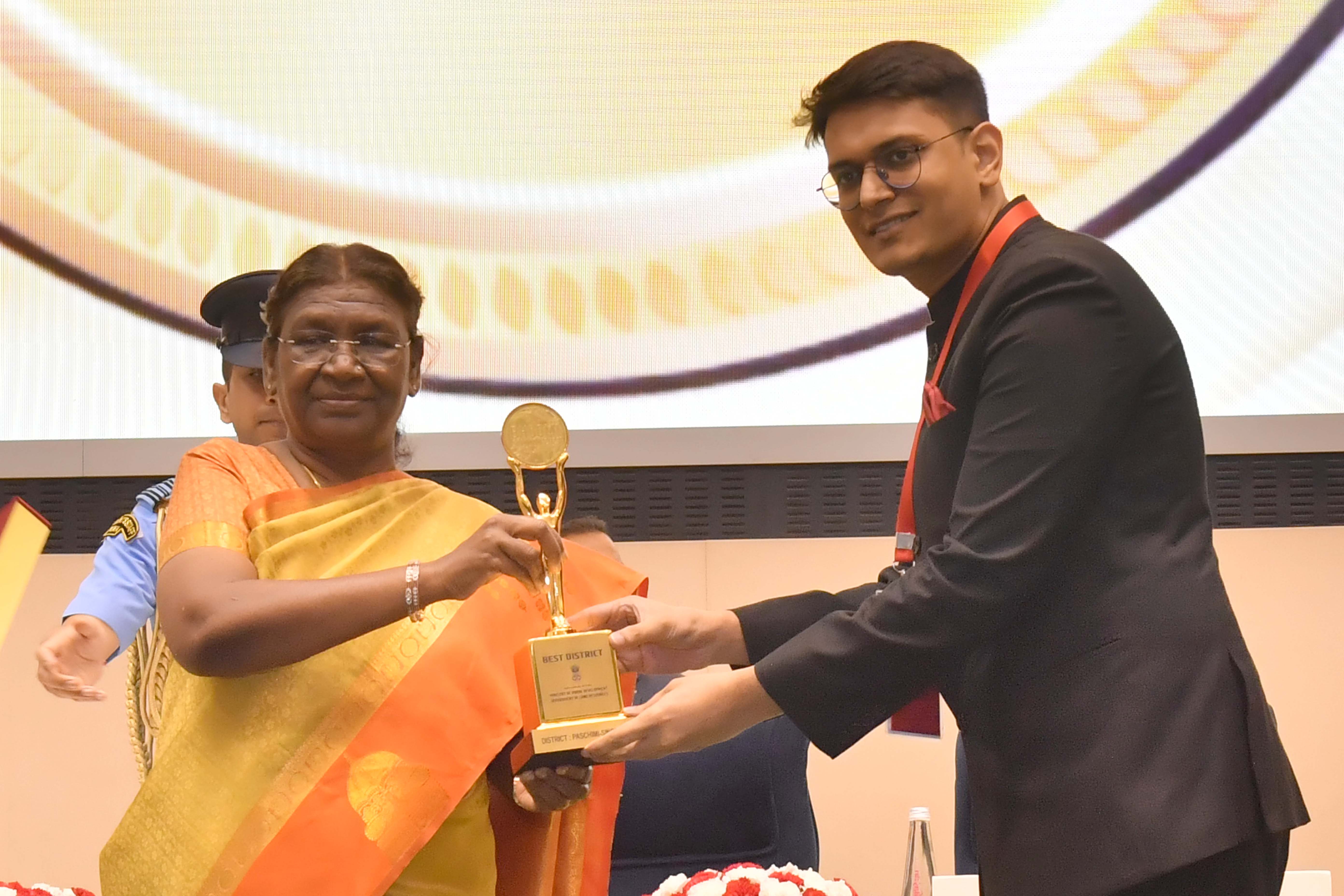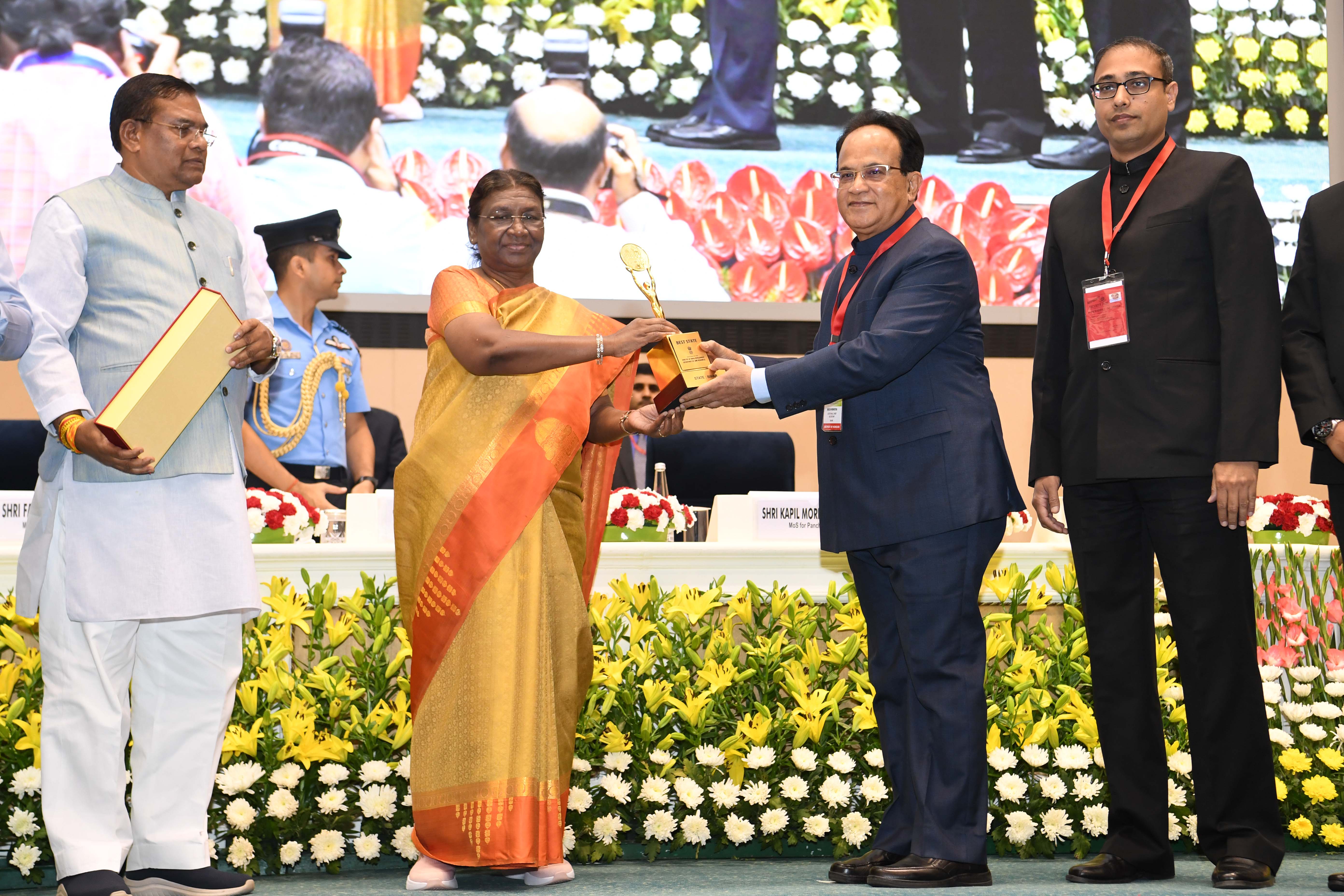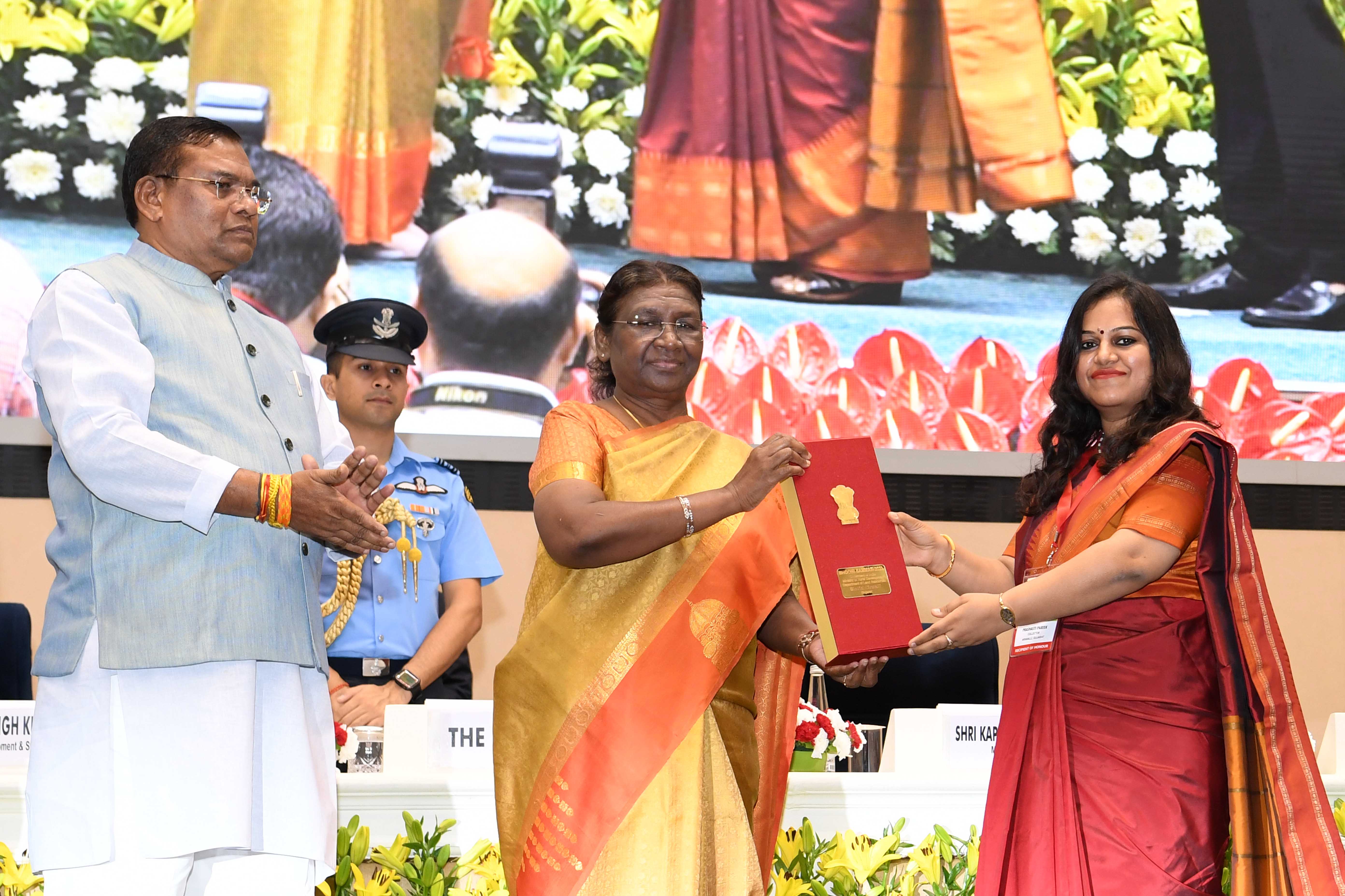 | Caption: | The President of India, Smt Droupadi Murmu presented the "Bhoomi Samman" 2023 at a function organised by the Union Ministry of Rural Development at Vigyan Bhavan in New Delhi on July 18, 2023. |