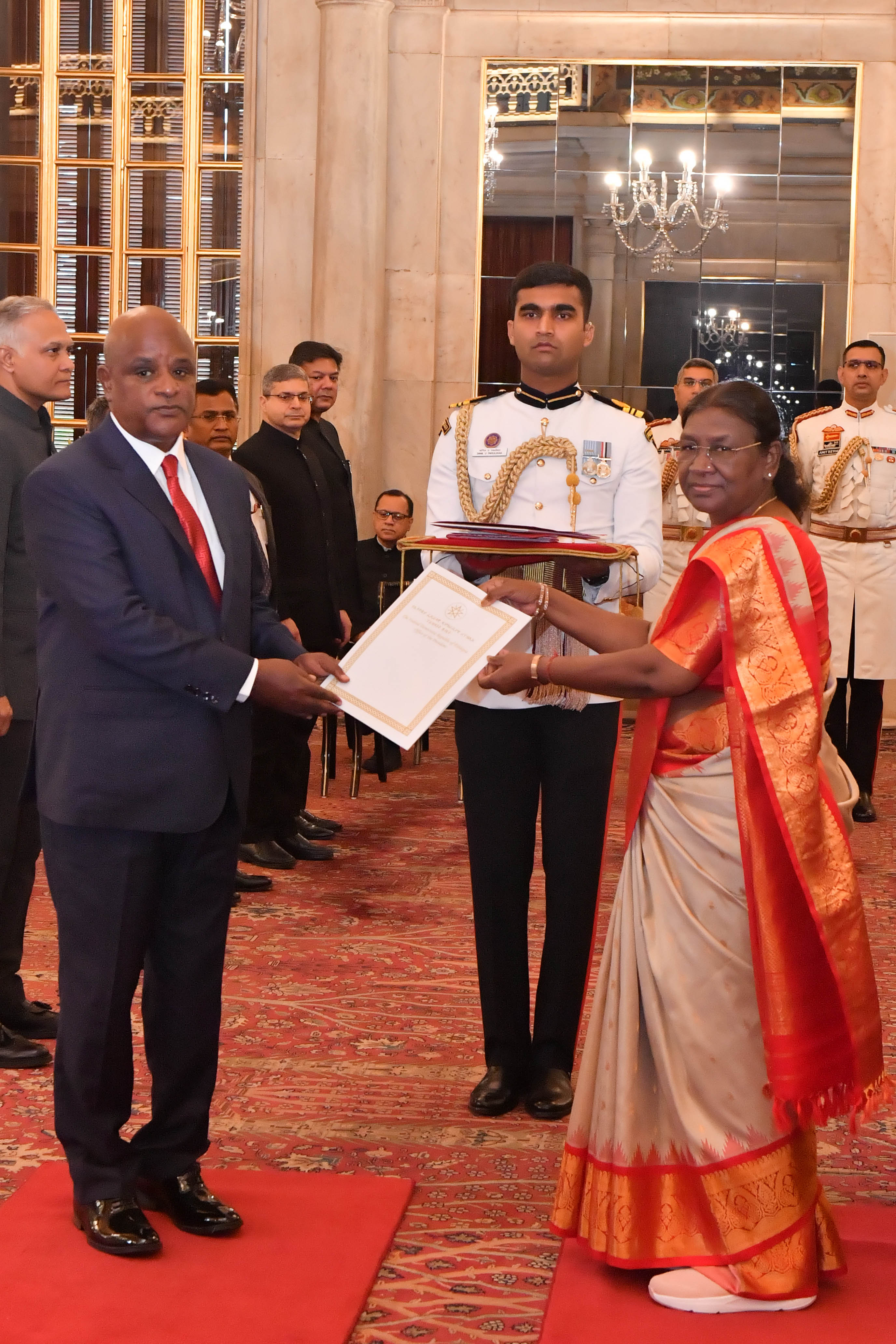 | Caption: | The Ambassador-designate of the Federal Democratic of Ethiopia, H.E. Mr Demeke Atnafu Ambulo presenting his credentials to the President of India Smt. Droupadi Murmu at Rashtrapati Bhavan on July 19, 2023. |