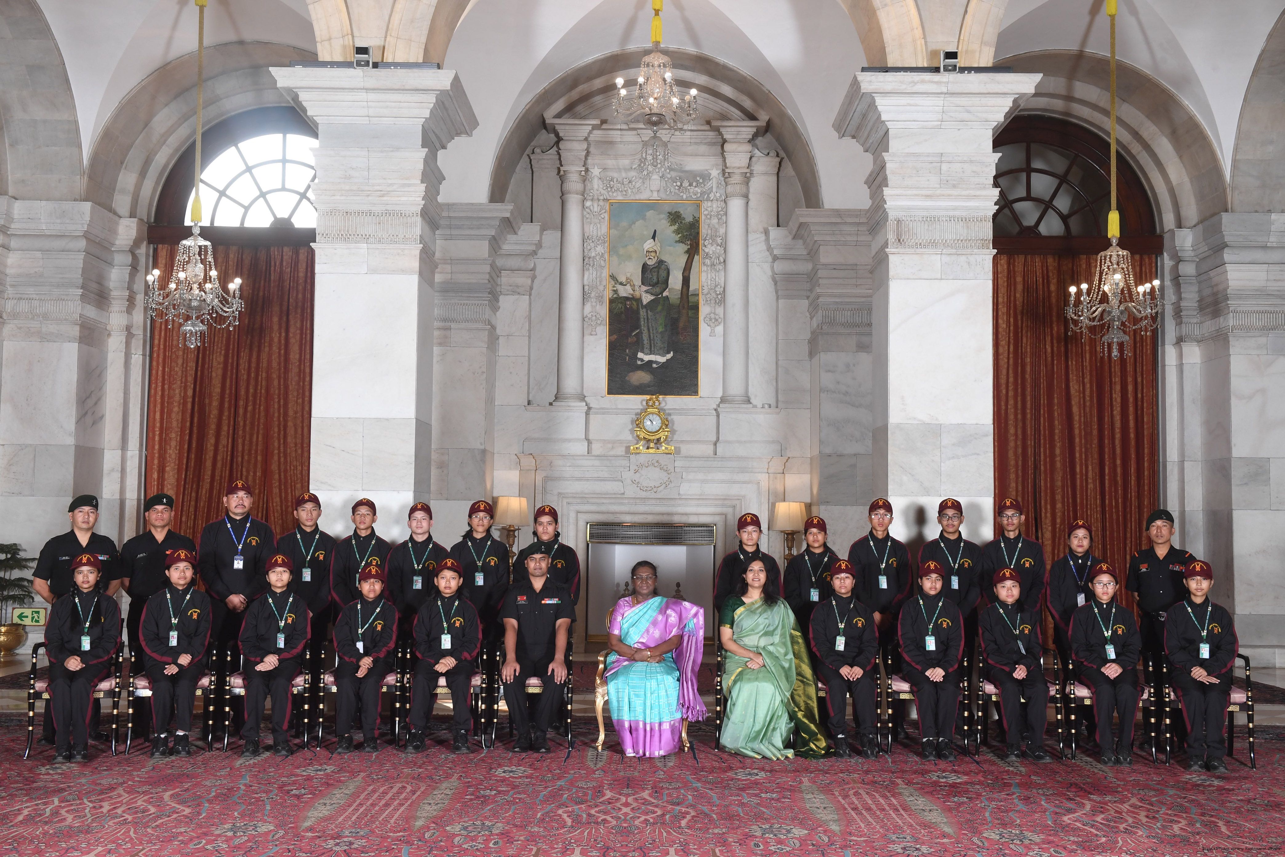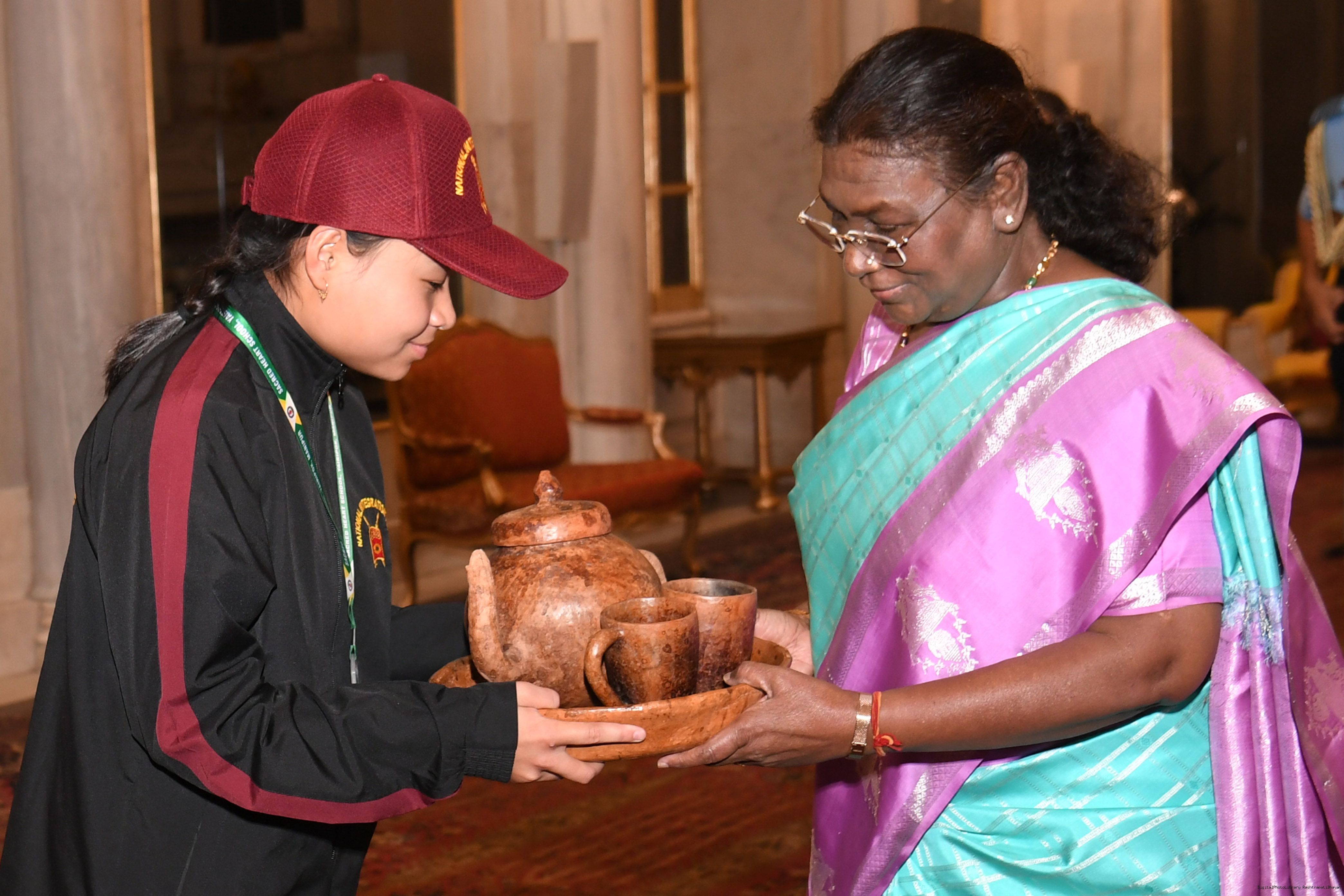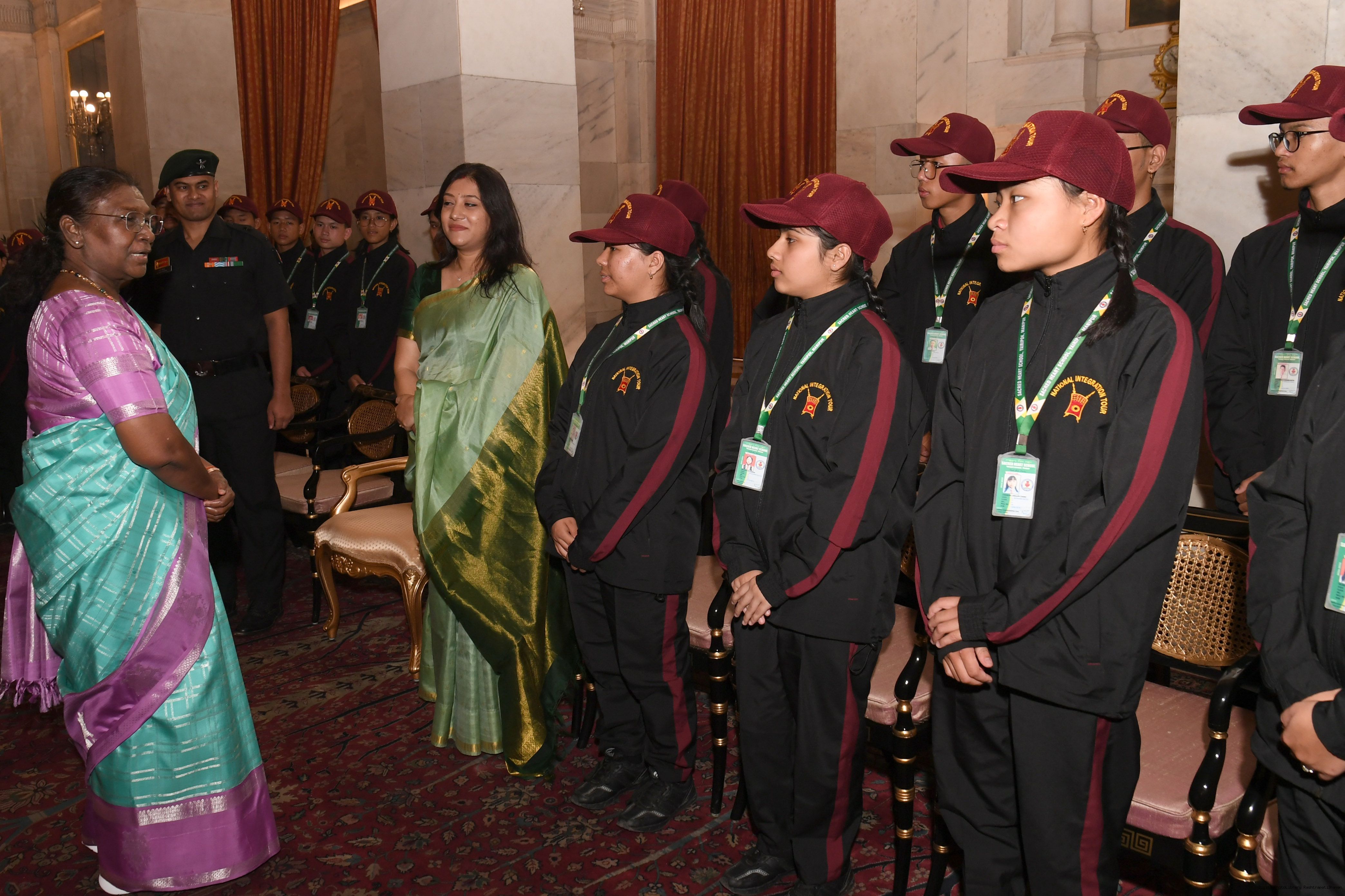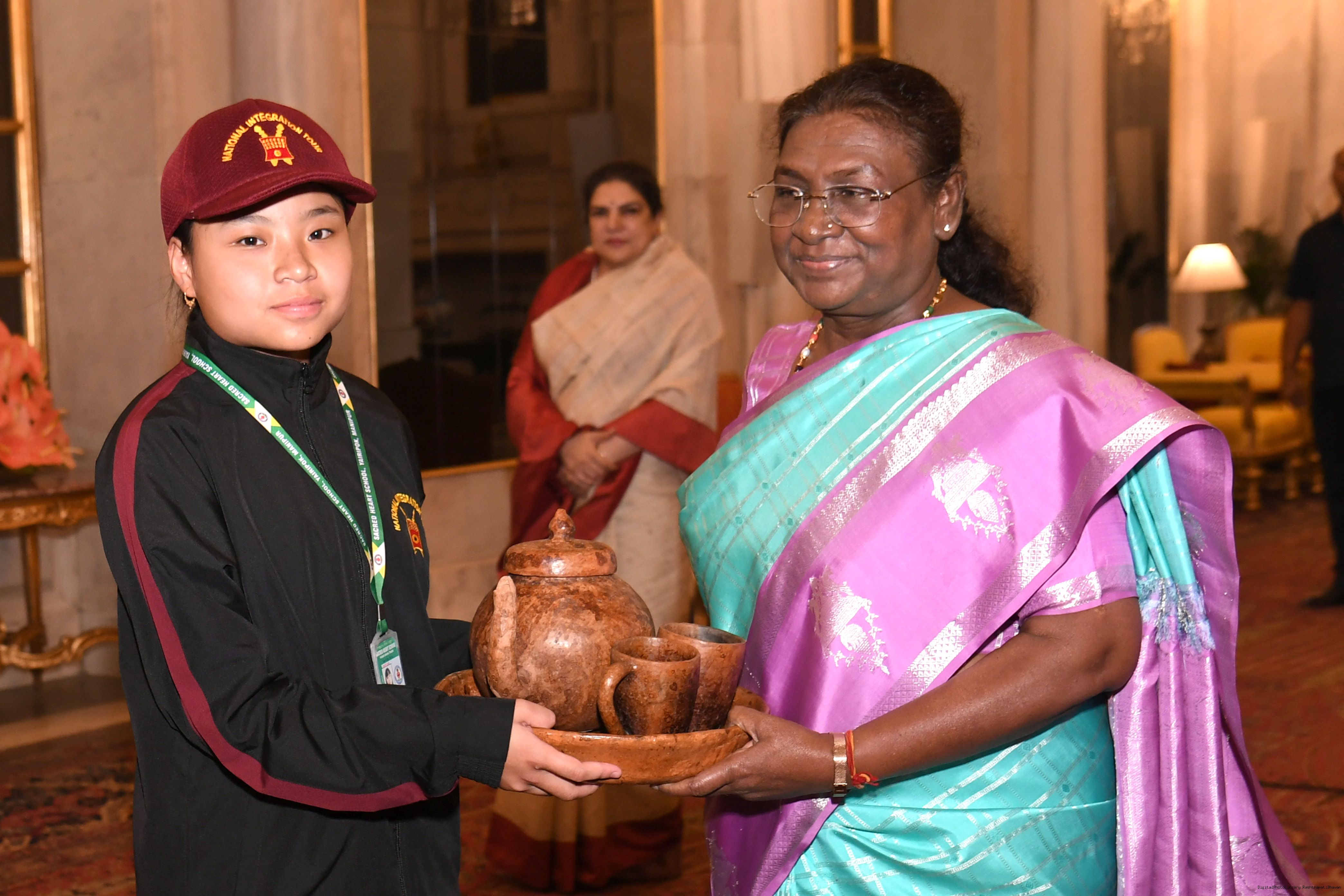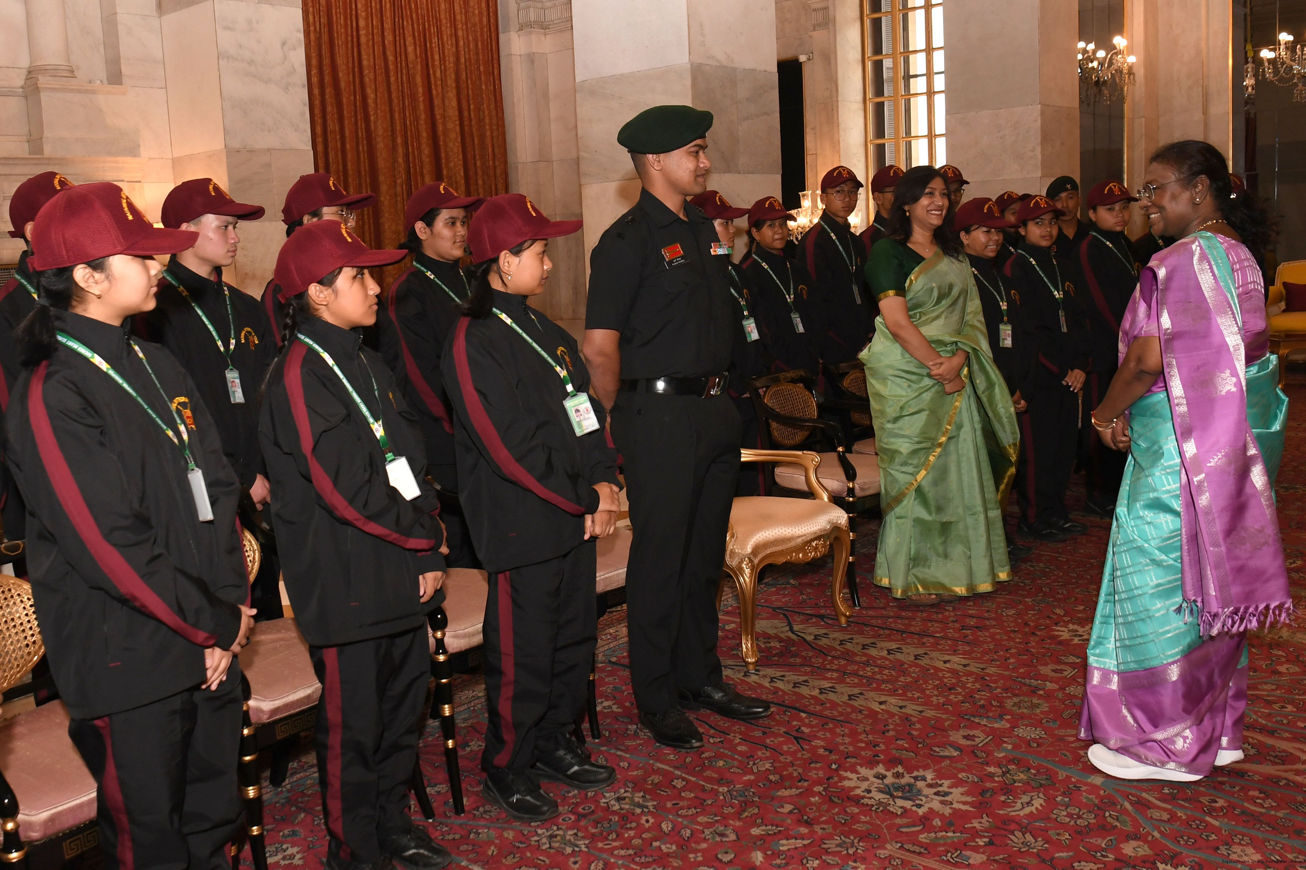 | Caption: | The President of India Smt. Droupadi Murmu met a group of students from Yairipok, Manipur as part of the National Integration Tour at Rashtrapati Bhavan on November 4, 2024. |