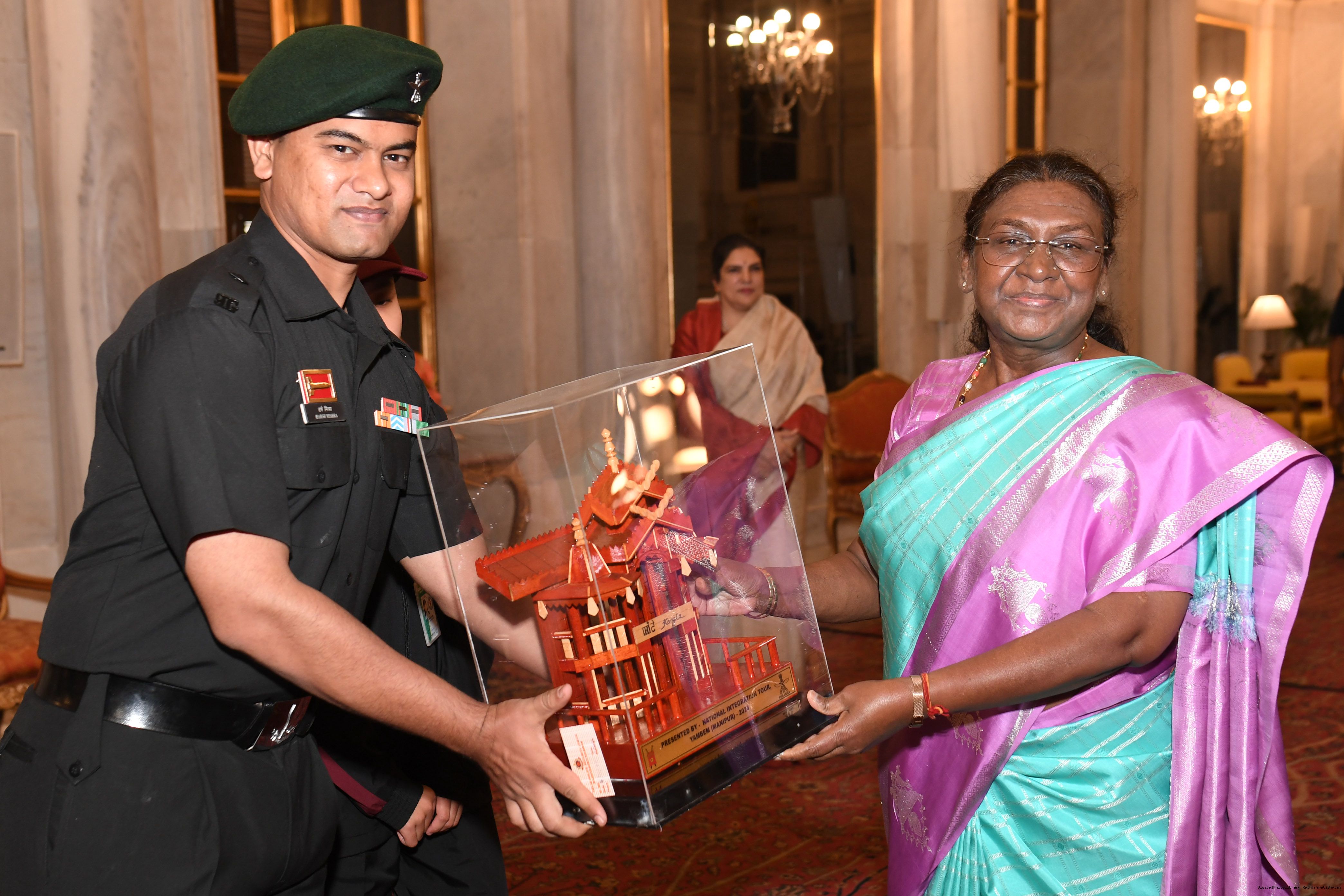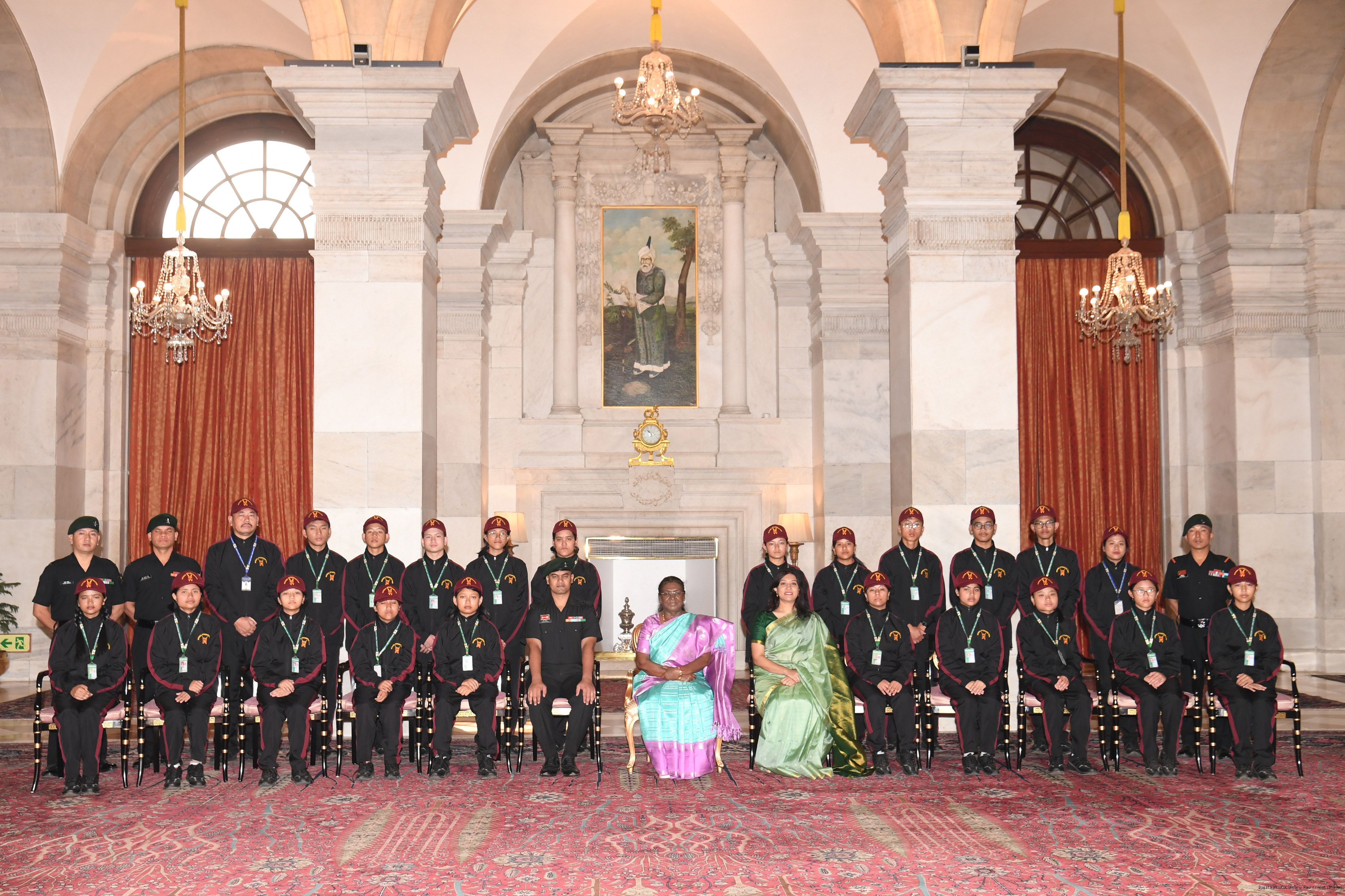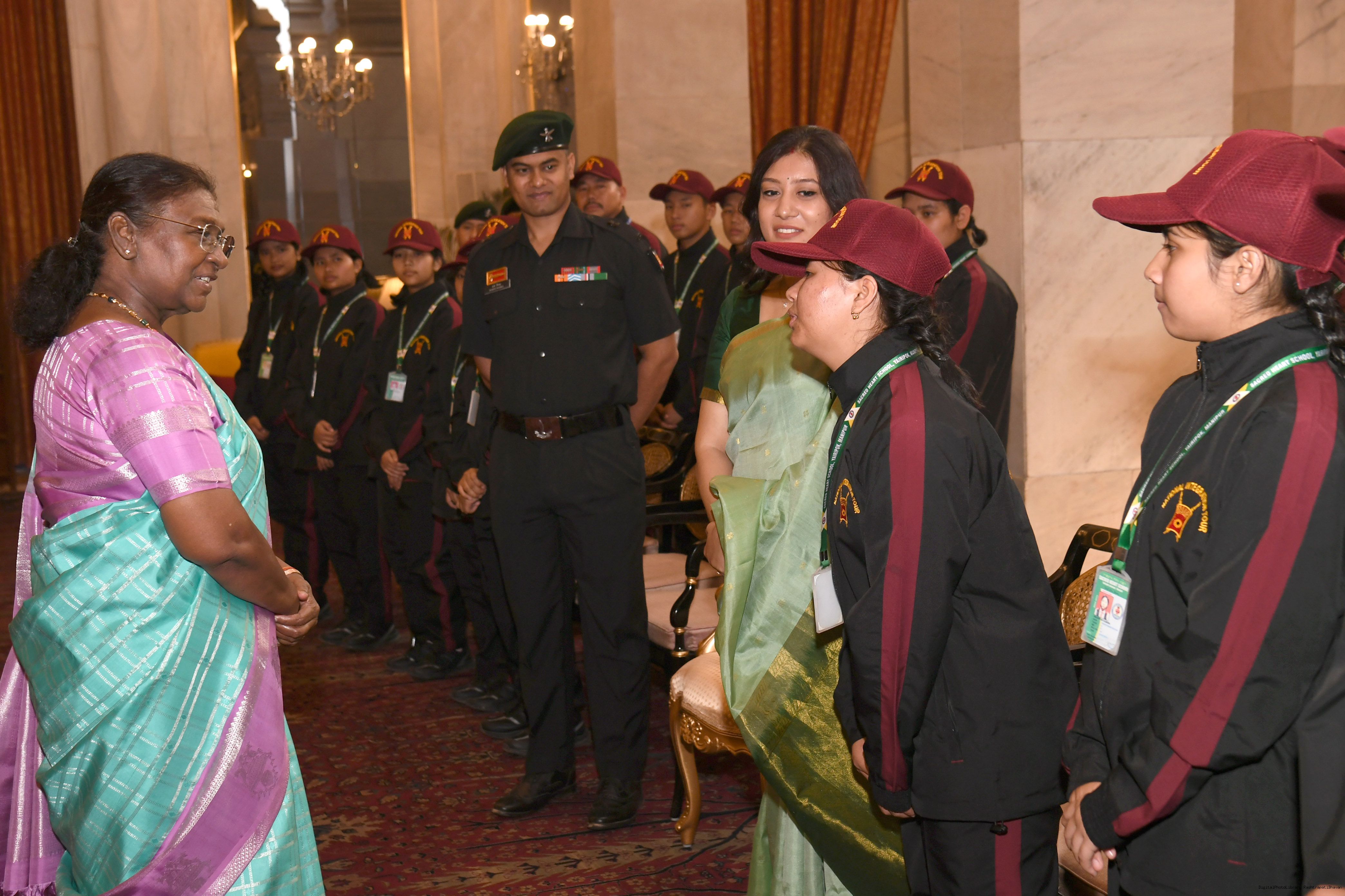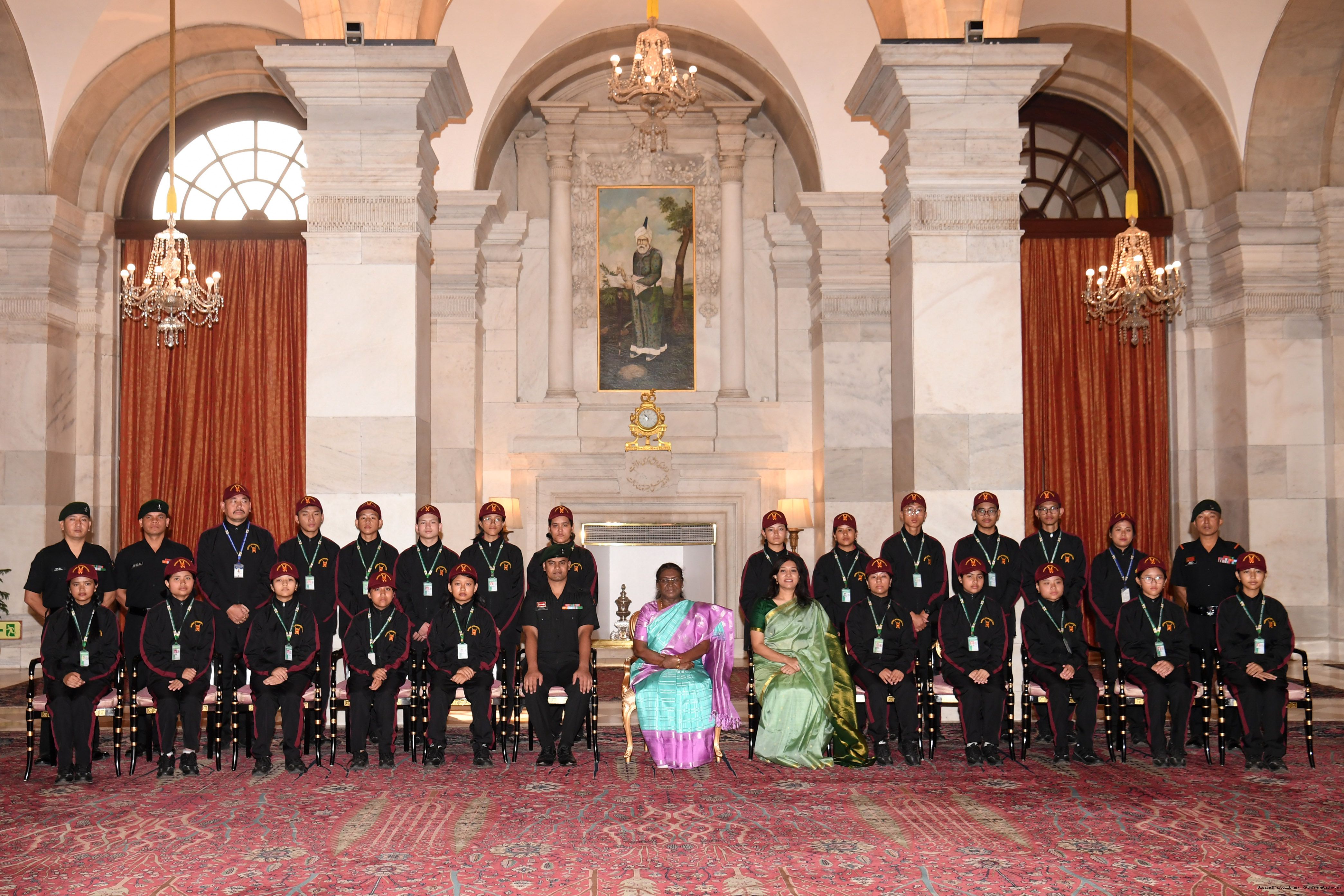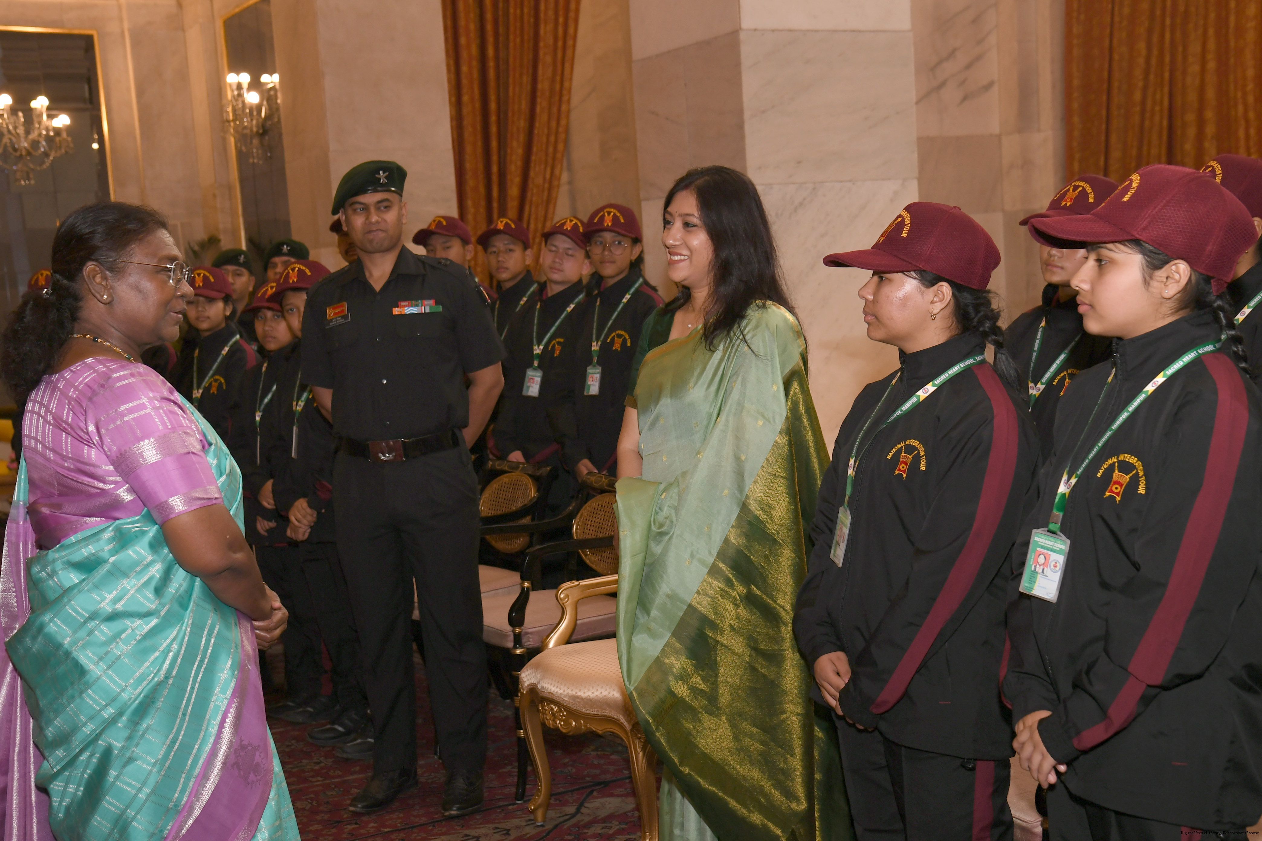 | Caption: | The President of India Smt. Droupadi Murmu met a group of students from Yairipok, Manipur as part of the National Integration Tour at Rashtrapati Bhavan on November 4, 2024. |