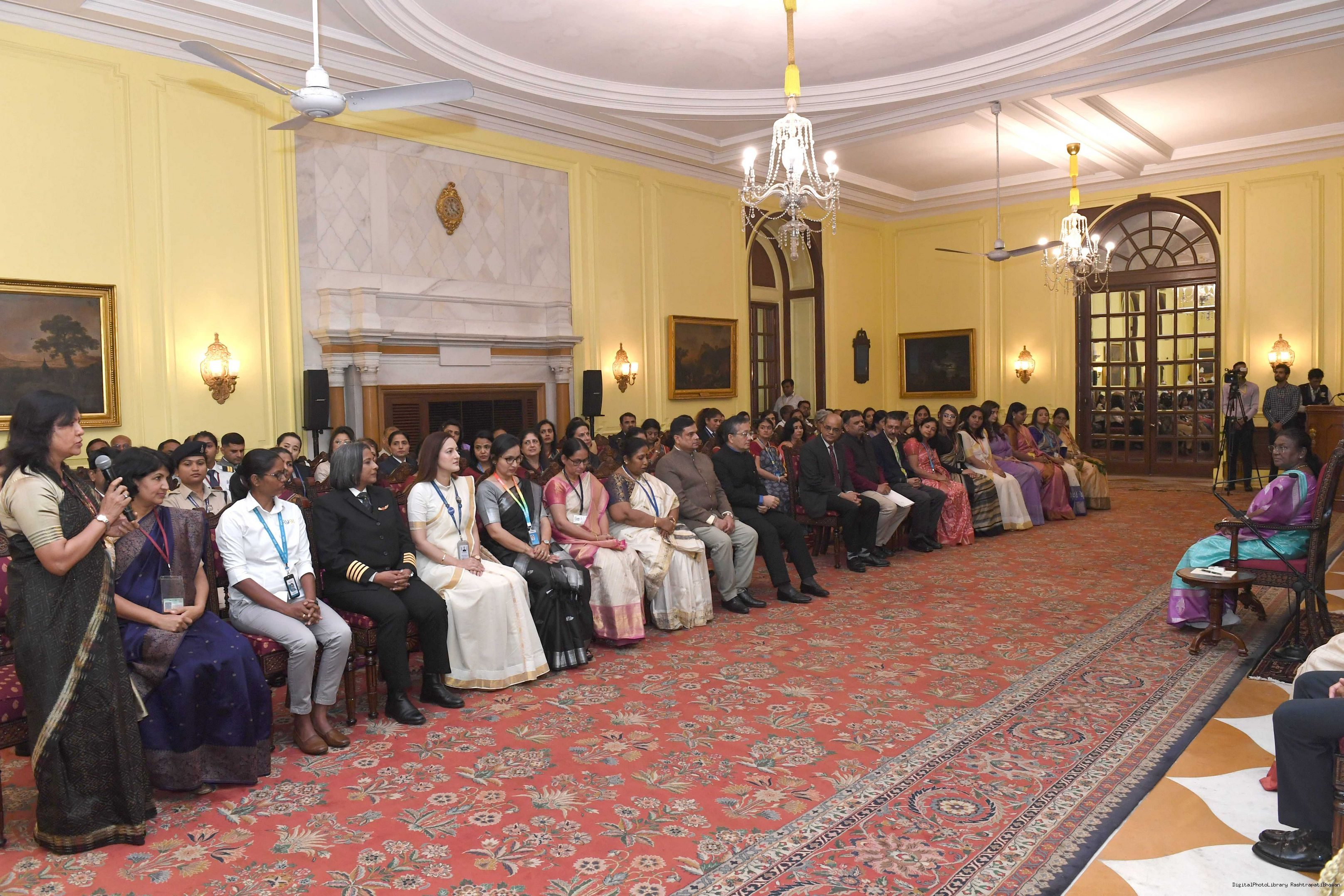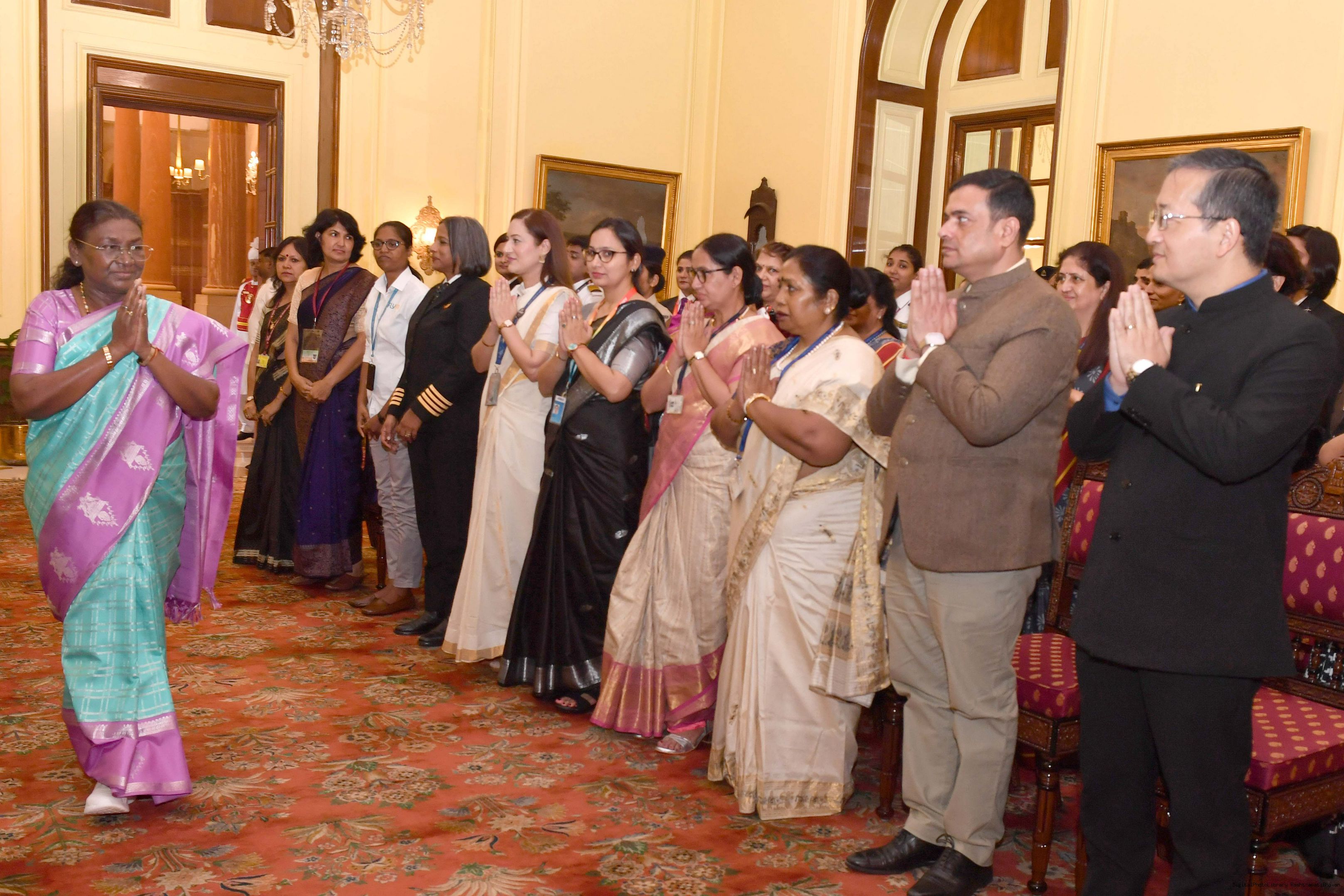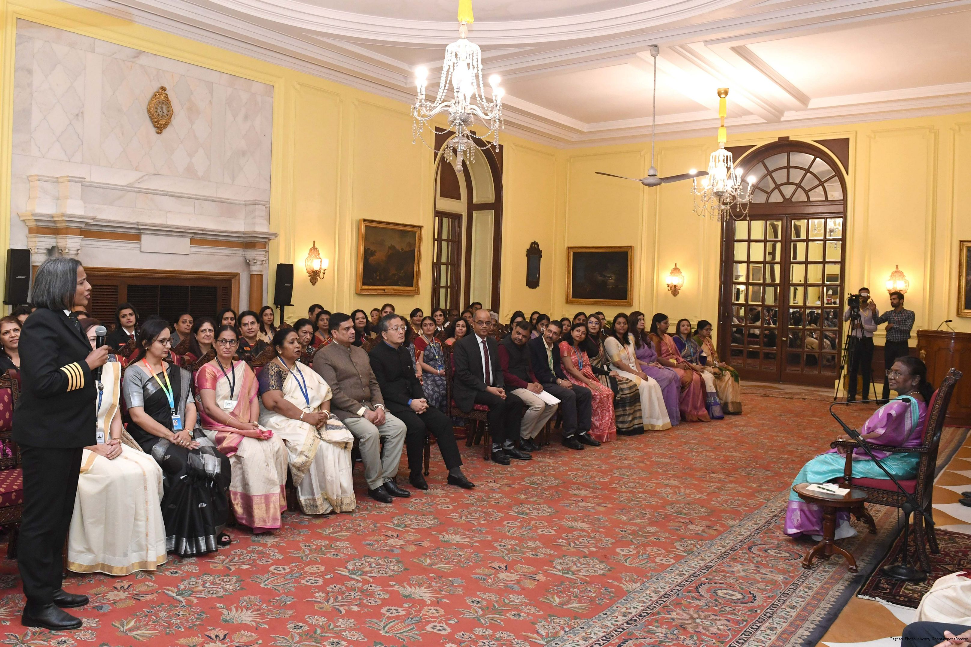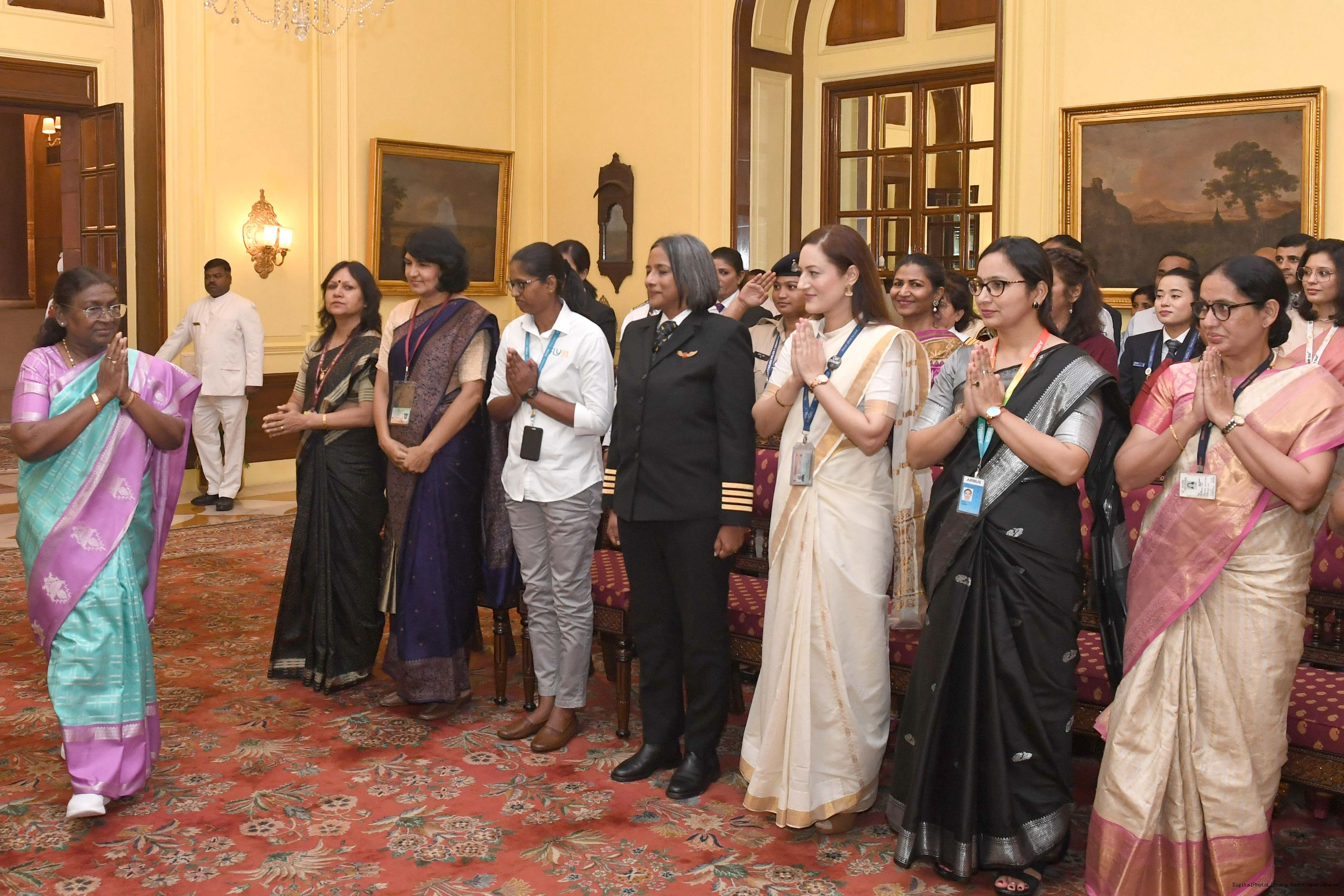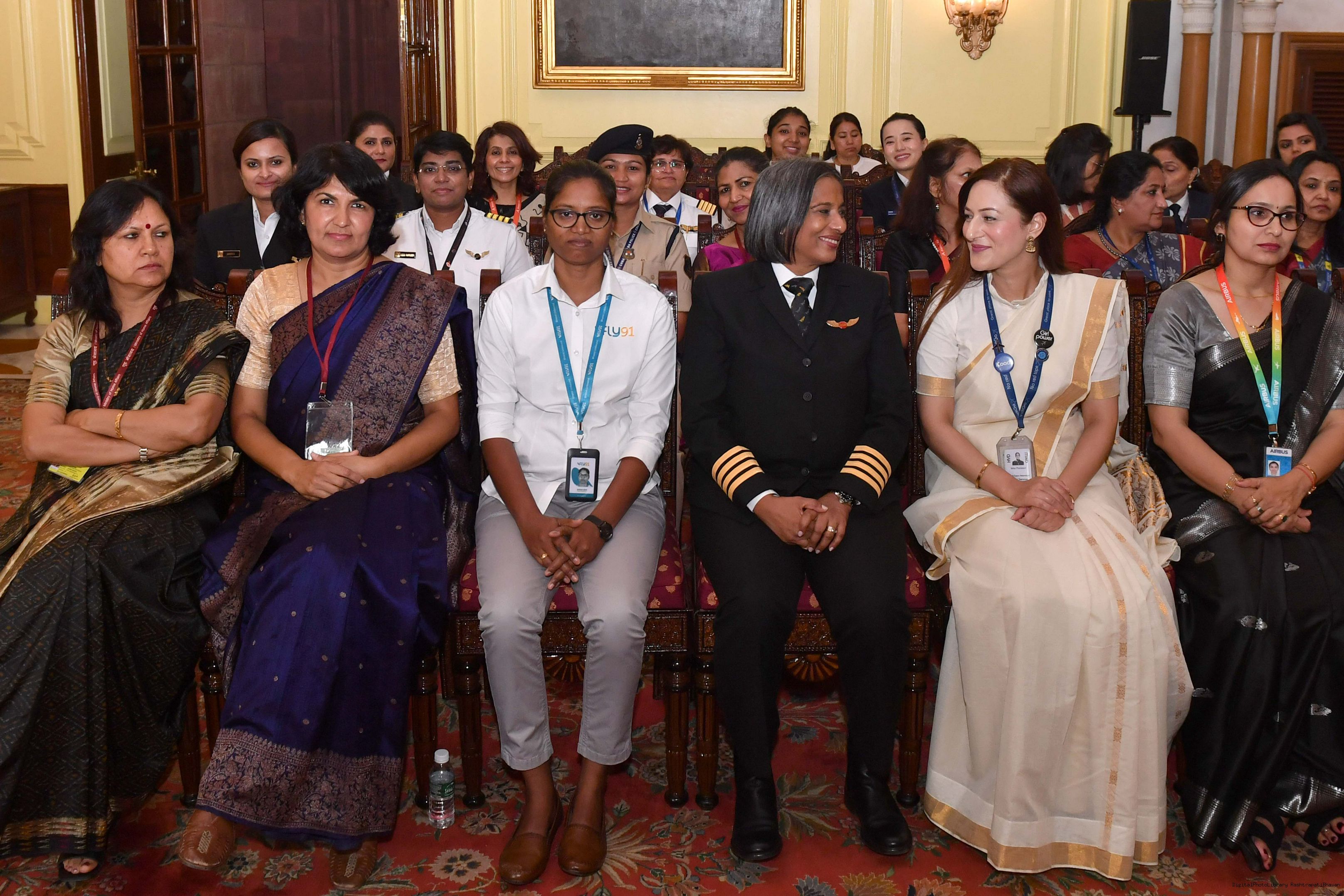 | Caption: | The President of India, Smt Droupadi Murmu interacted with a group of women achievers in the Indian Aviation Sector at Rashtrapati Bhavan on November 4, 2024. |