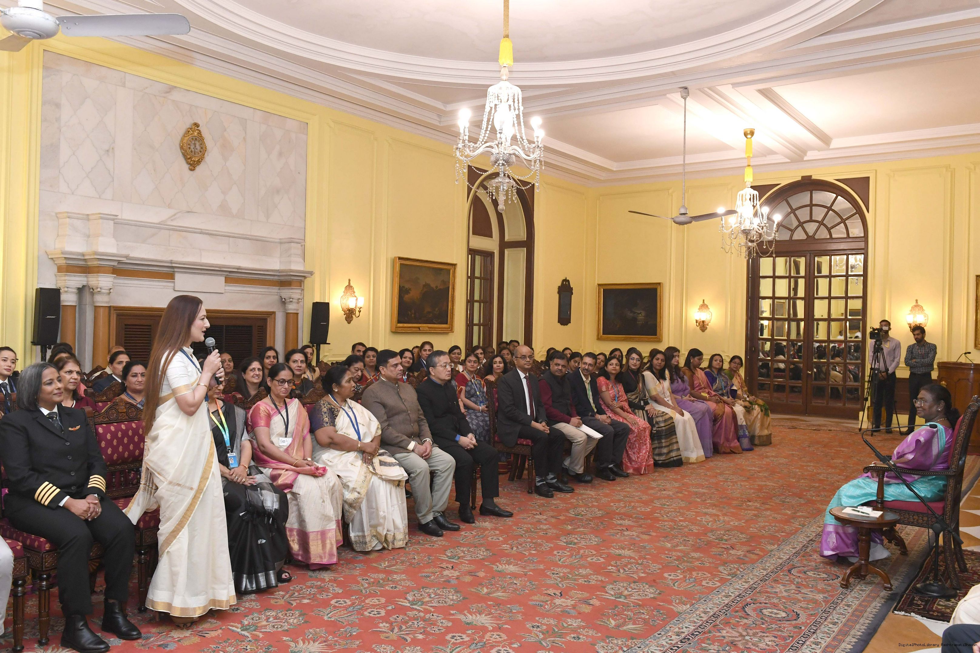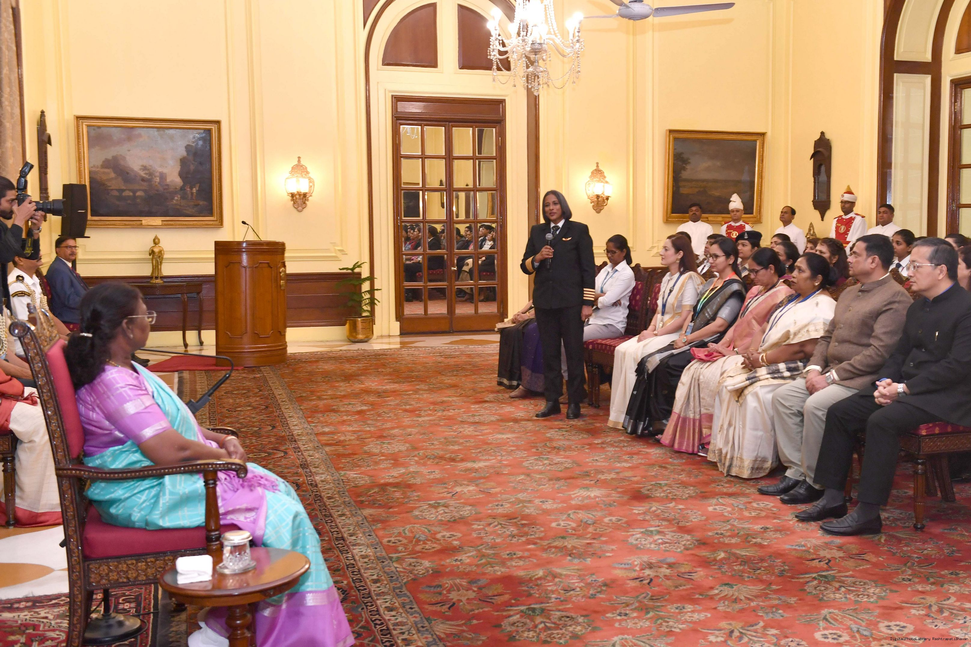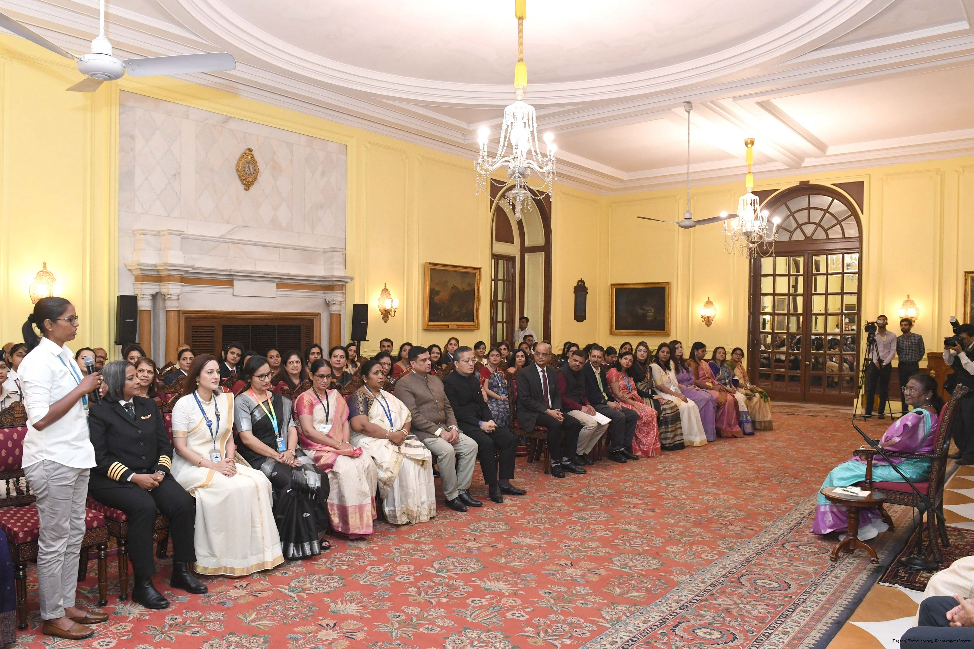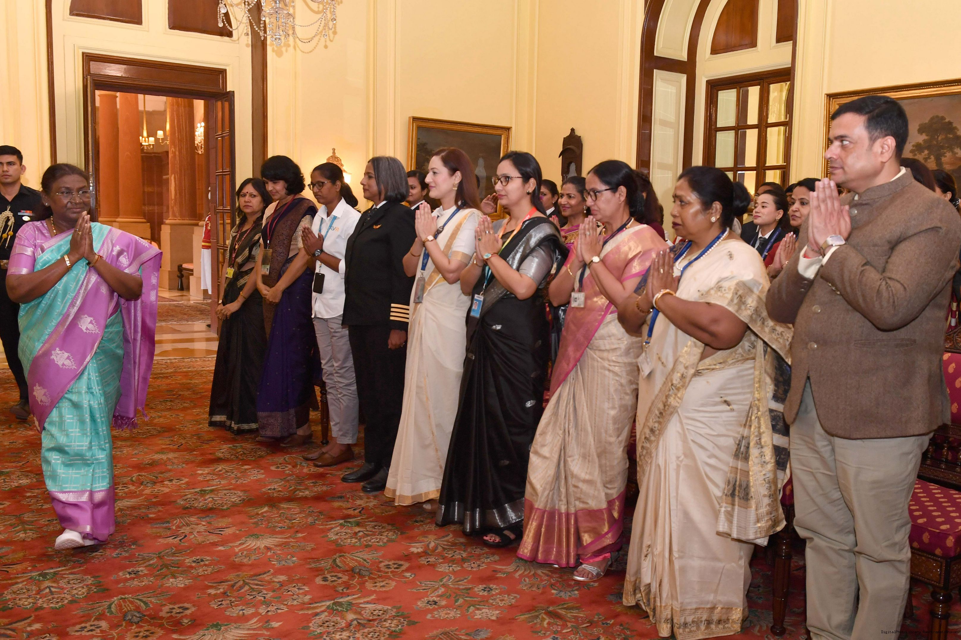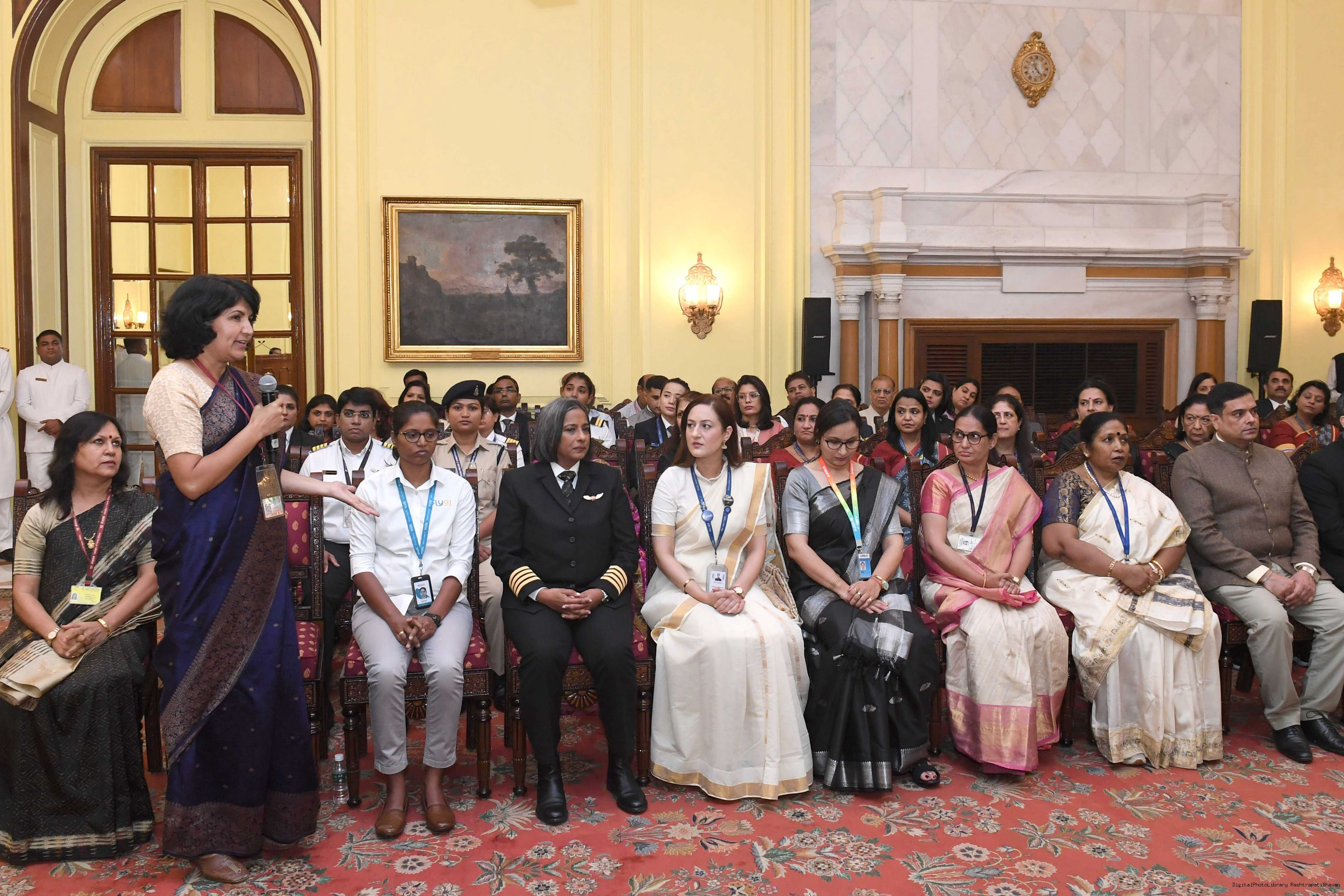 | Caption: | The President of India, Smt Droupadi Murmu interacted with a group of women achievers in the Indian Aviation Sector at Rashtrapati Bhavan on November 4, 2024. |