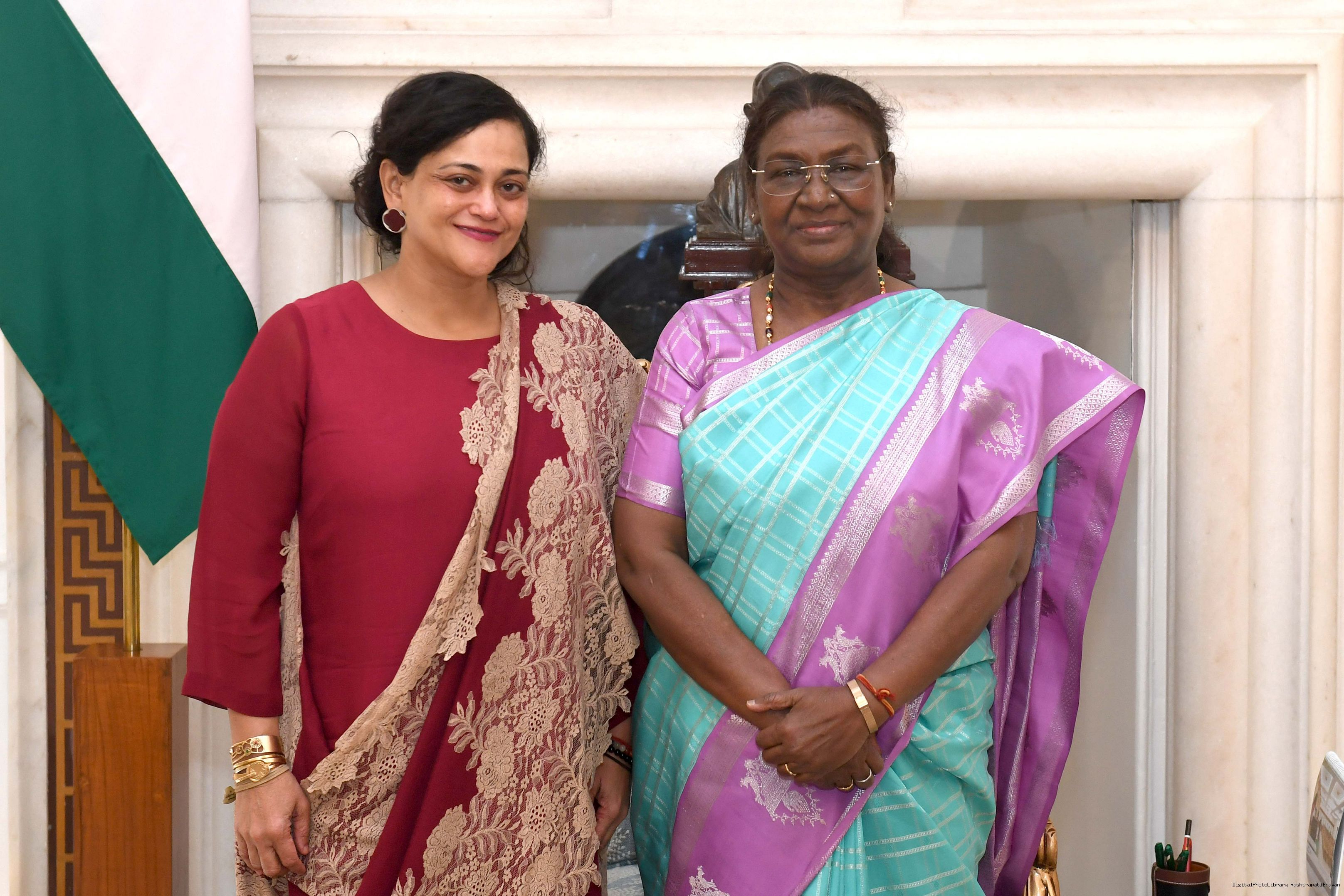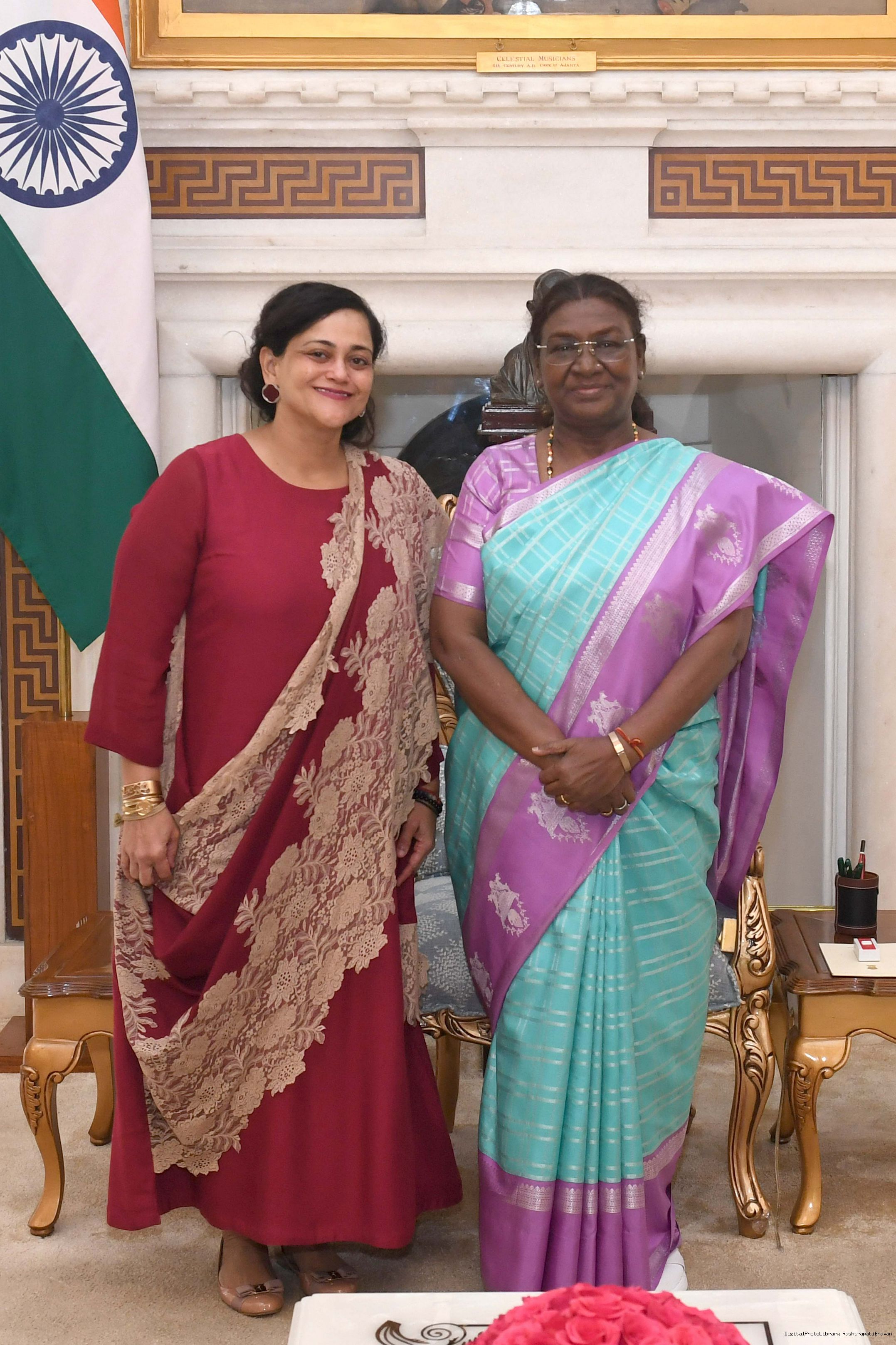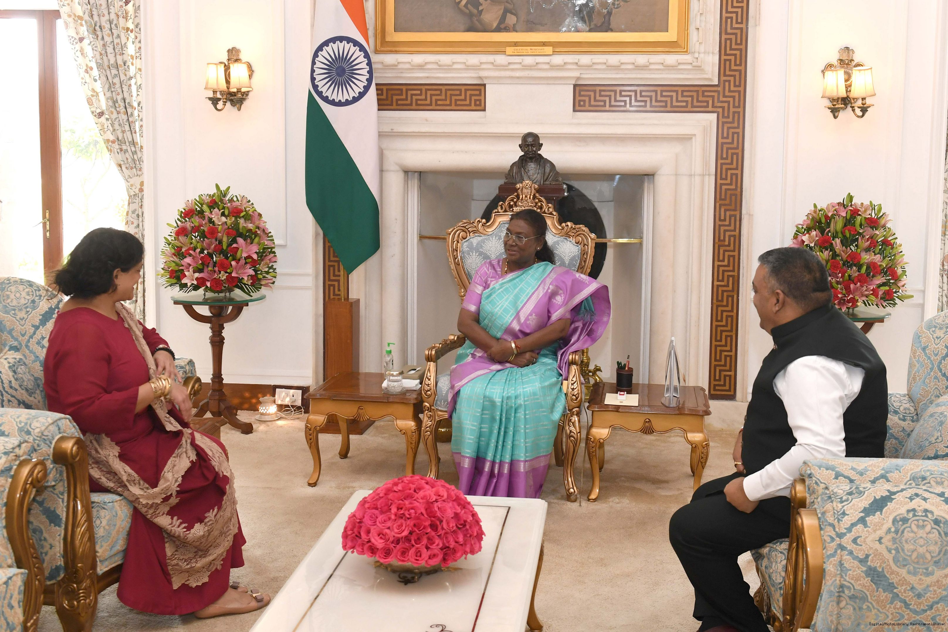 | Caption: | Ms. Kalli Purie, Vice Chairperson Executive Editor-in-Chief, India Today Group along with Shri Supriya Prasad, News Director, Aaj Tak India Today TV meeting with the President of India Smt. Droupadi Murmu at Rashtrapati Bhavan on November 04, 2024. |