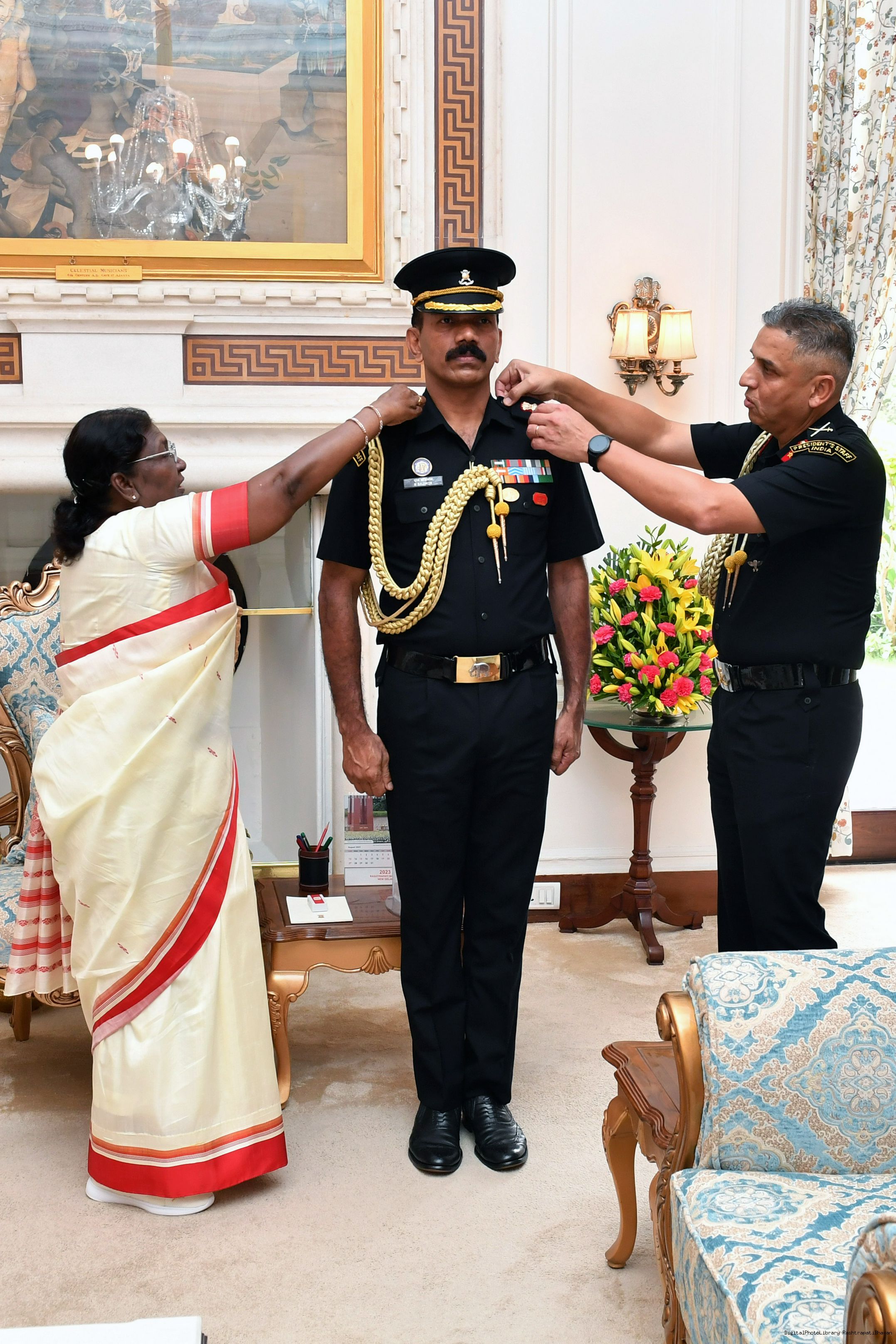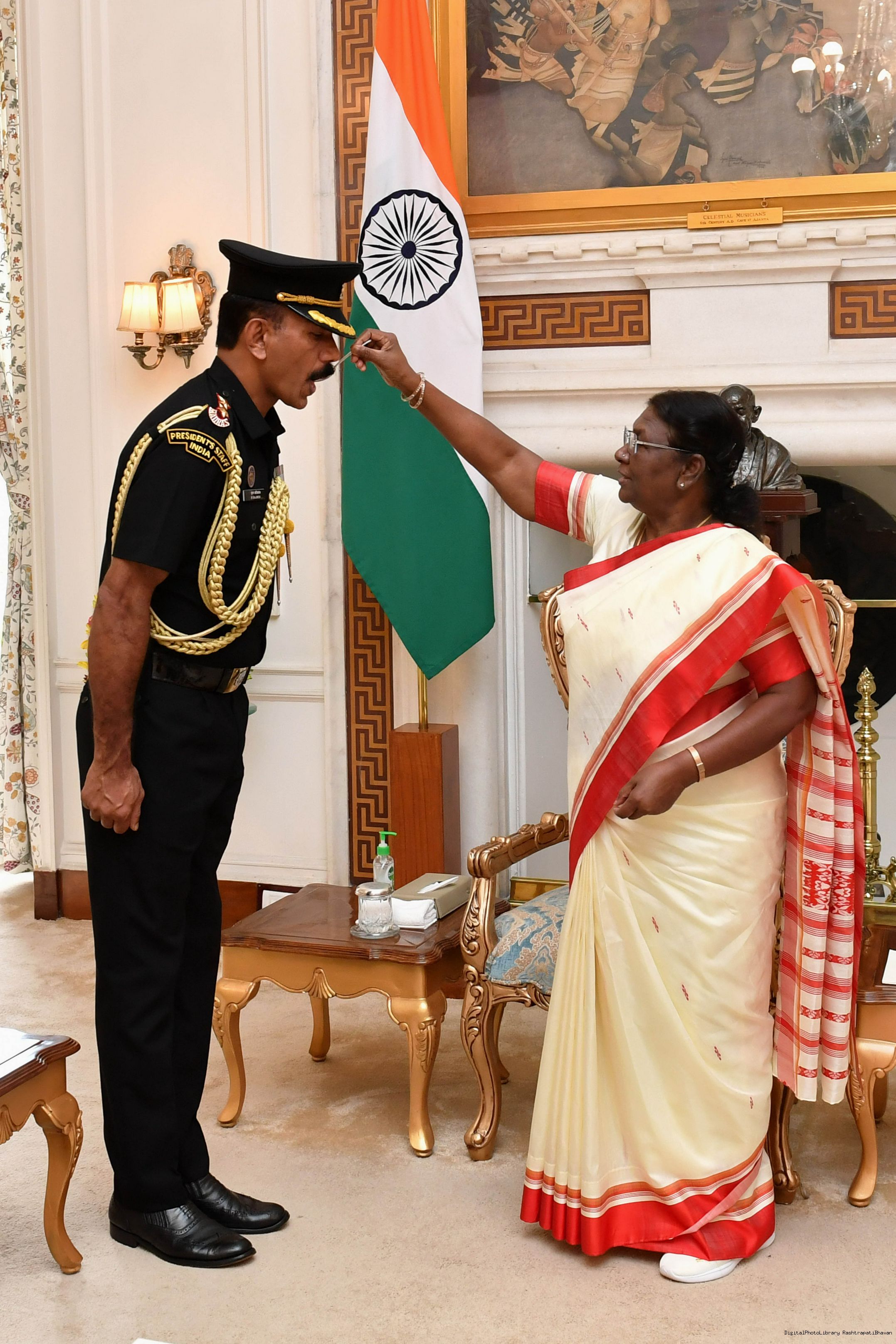 | Caption: | The President of India, Smt. Droupadi Murmu Pipping Ceremony of Sub Maj Hony Lt N Sajimon, JCO ADC to the President at Rashtrapati Bhavan on August 15, 2023. |