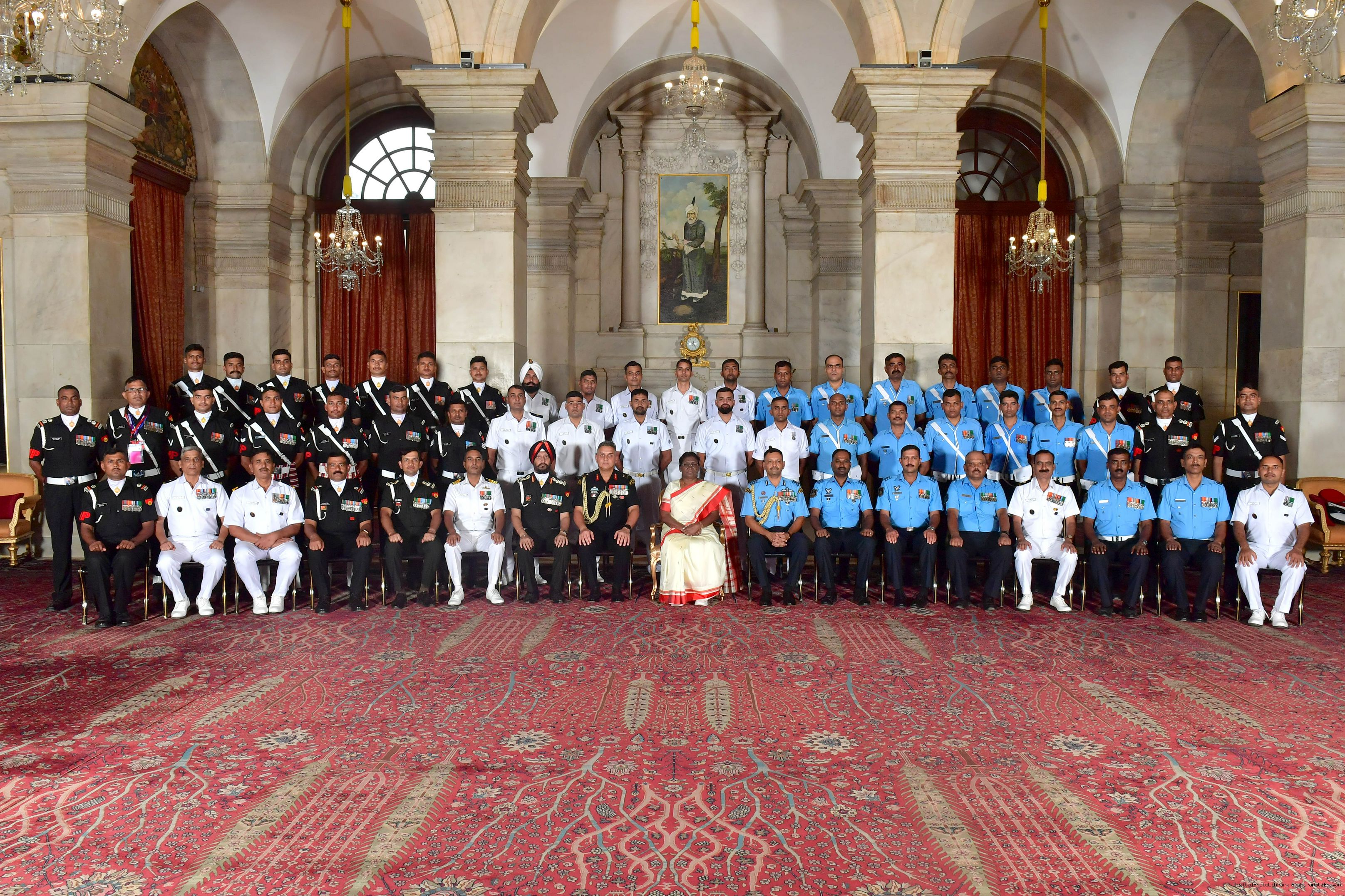 | Caption: | The President of India Smt. Droupadi Murmu posing a Group Photograph with the Tri-Services Provost personnel at Rashtrapati Bhavan on August 15, 2023. |