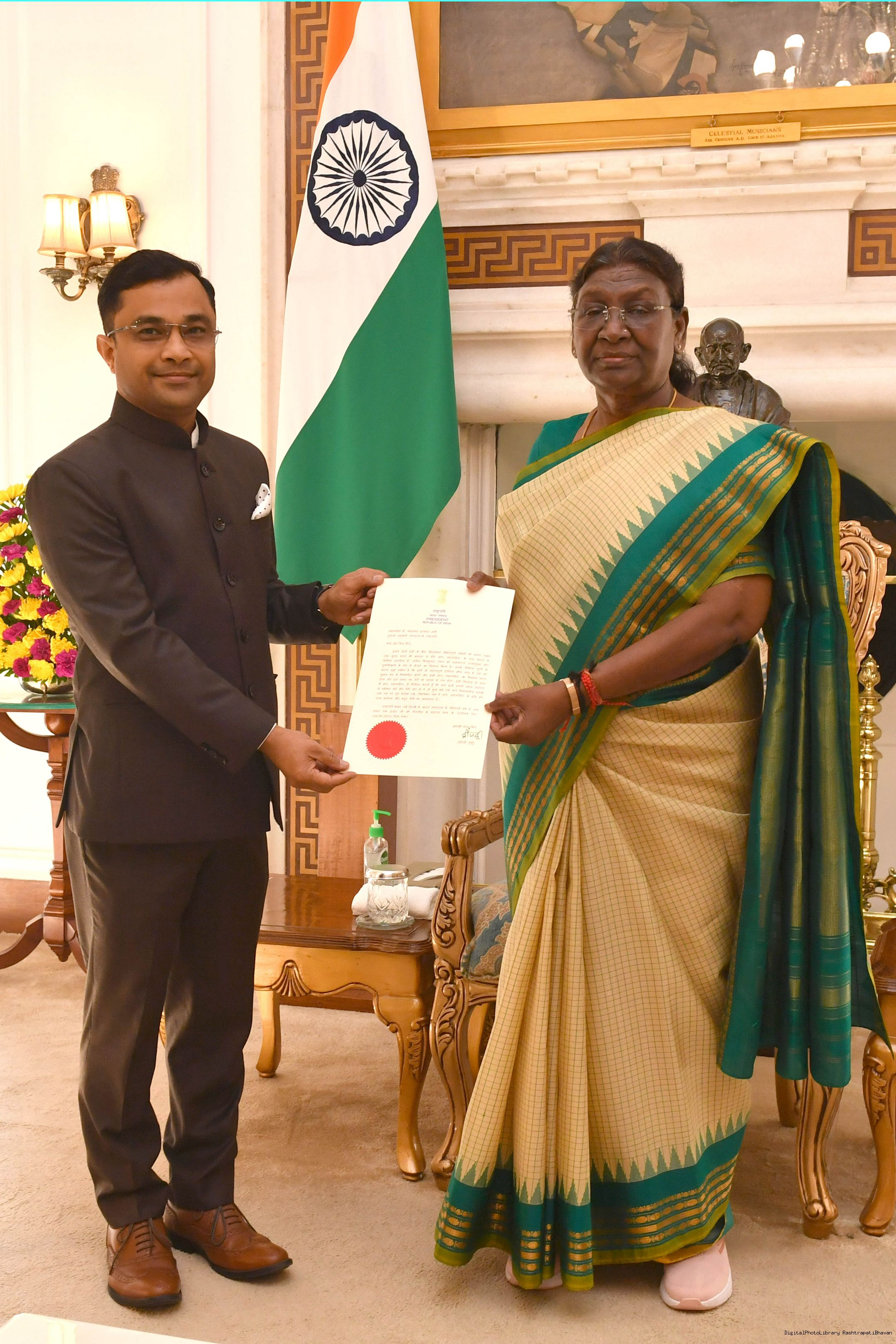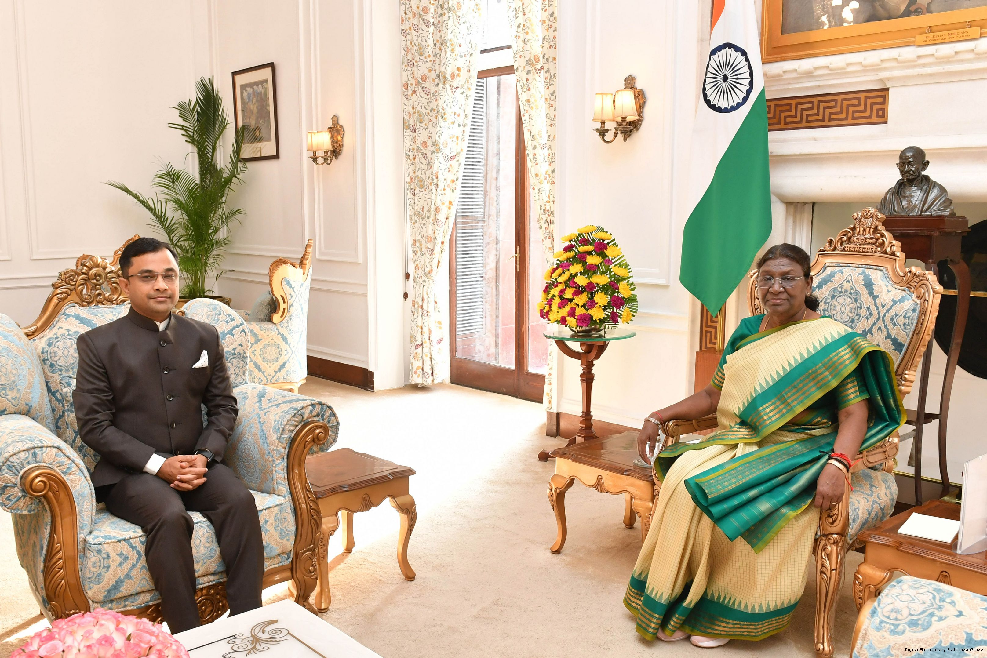 | Caption: | The High Commissioner-designate of India to Cooperative Republic of Guyana, Shri Amit Shivkumer Telang meeting with the President of India, Smt. Droupadi Murmu at Rashtrapati Bhavan on October 16, 2023. |