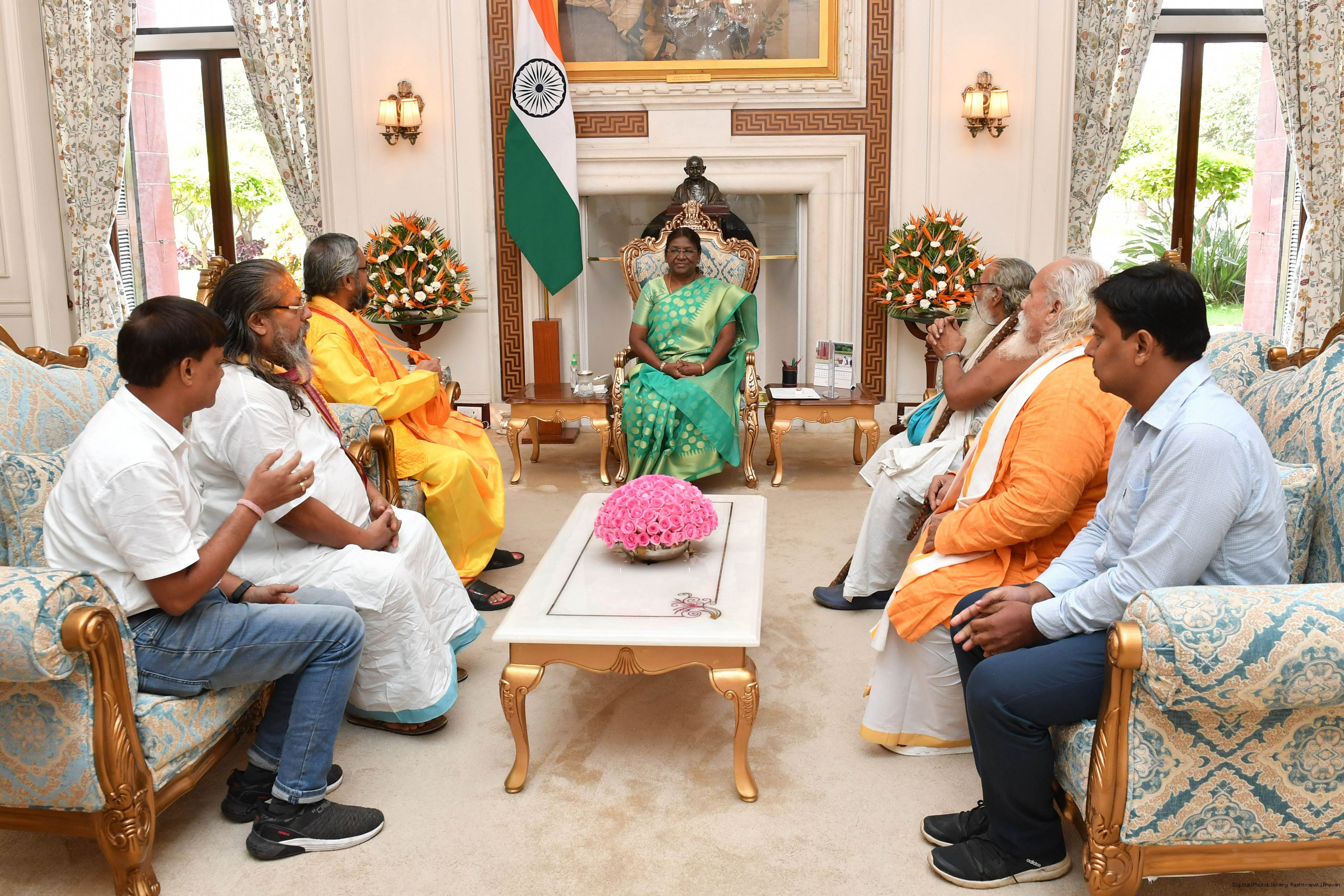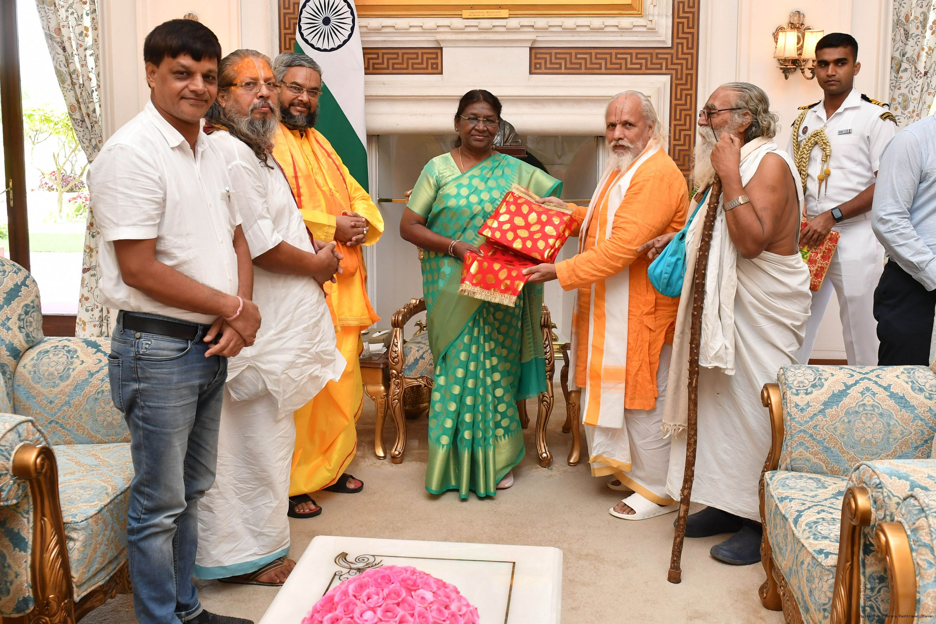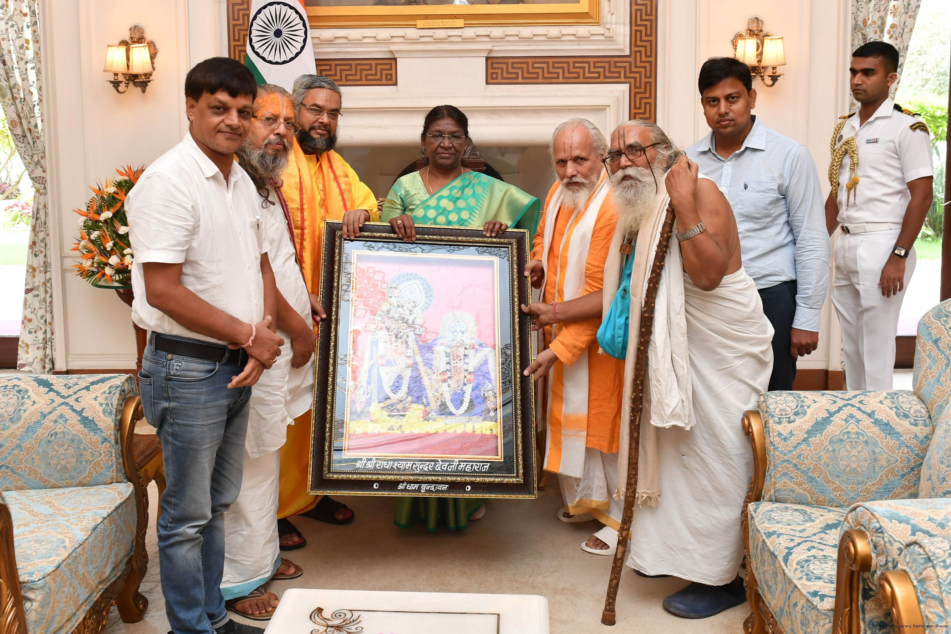 | Caption: | Shri Krishangopalanand Dev Goswami Prabhupad, President, Shri Shri Krishan Janmashtami Mahotsav Samiti along with others meeting with the President of India, Smt. Droupadi Murmu at Rashtrapati Bhavan on August 18, 2023. |