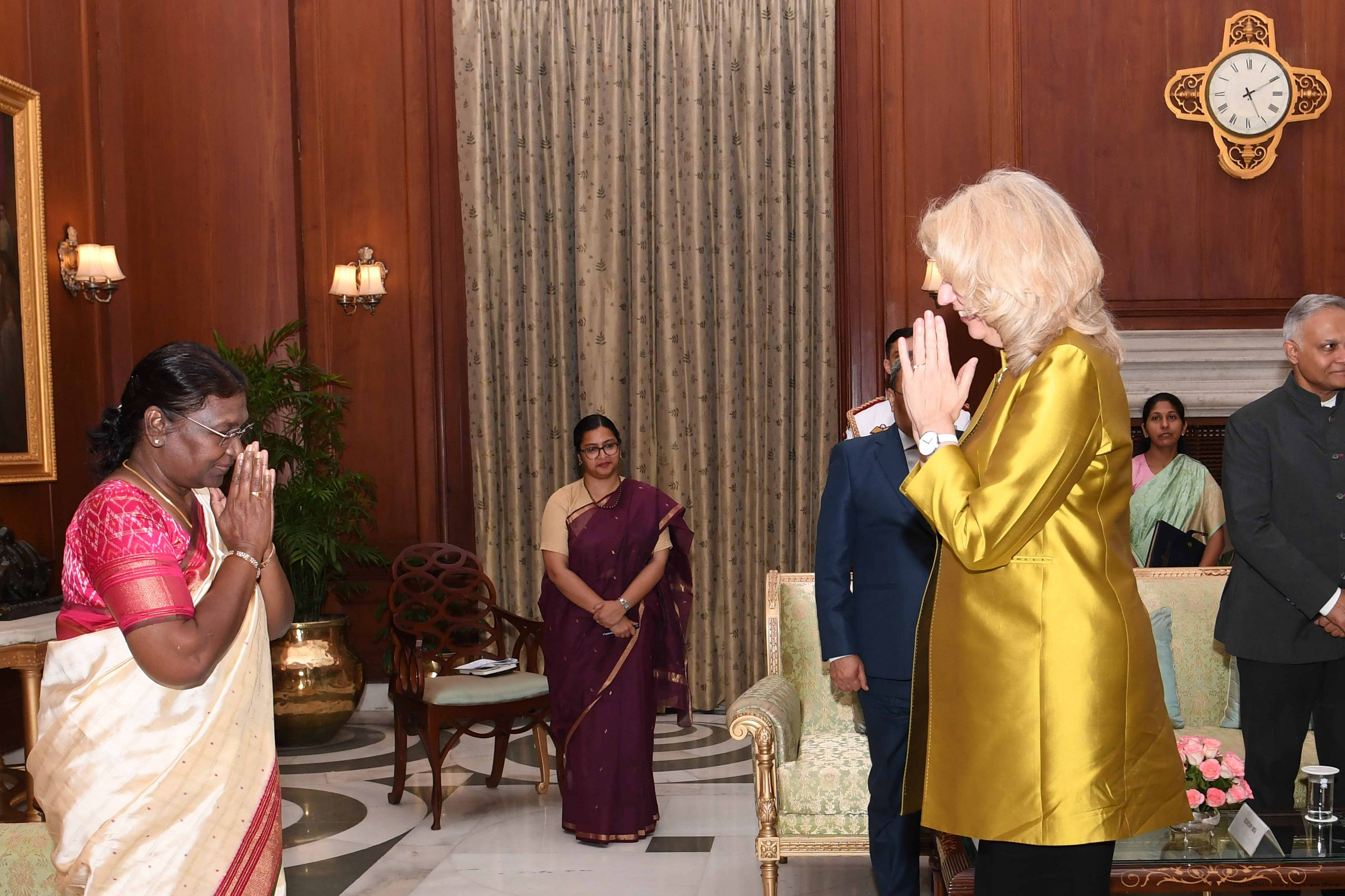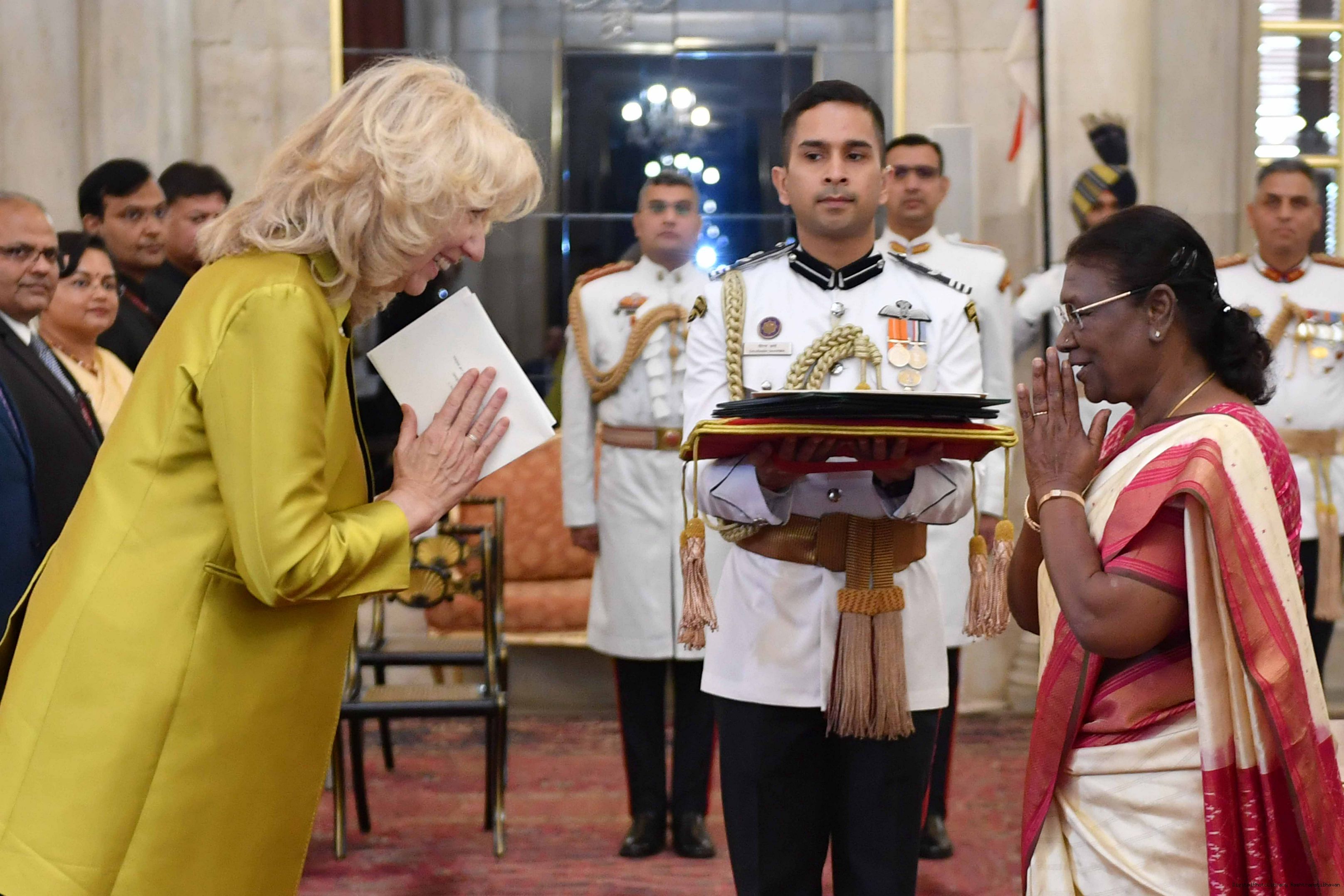 | Caption: | The Ambassador-designate of the Kingdom of the Netherlands, H.E. Mrs. Marie Louisa Gerards presenting her credentials to the President of India, Smt Droupadi Murmu at Rashtrapati Bhavan in New Delhi on August 21, 2023. |