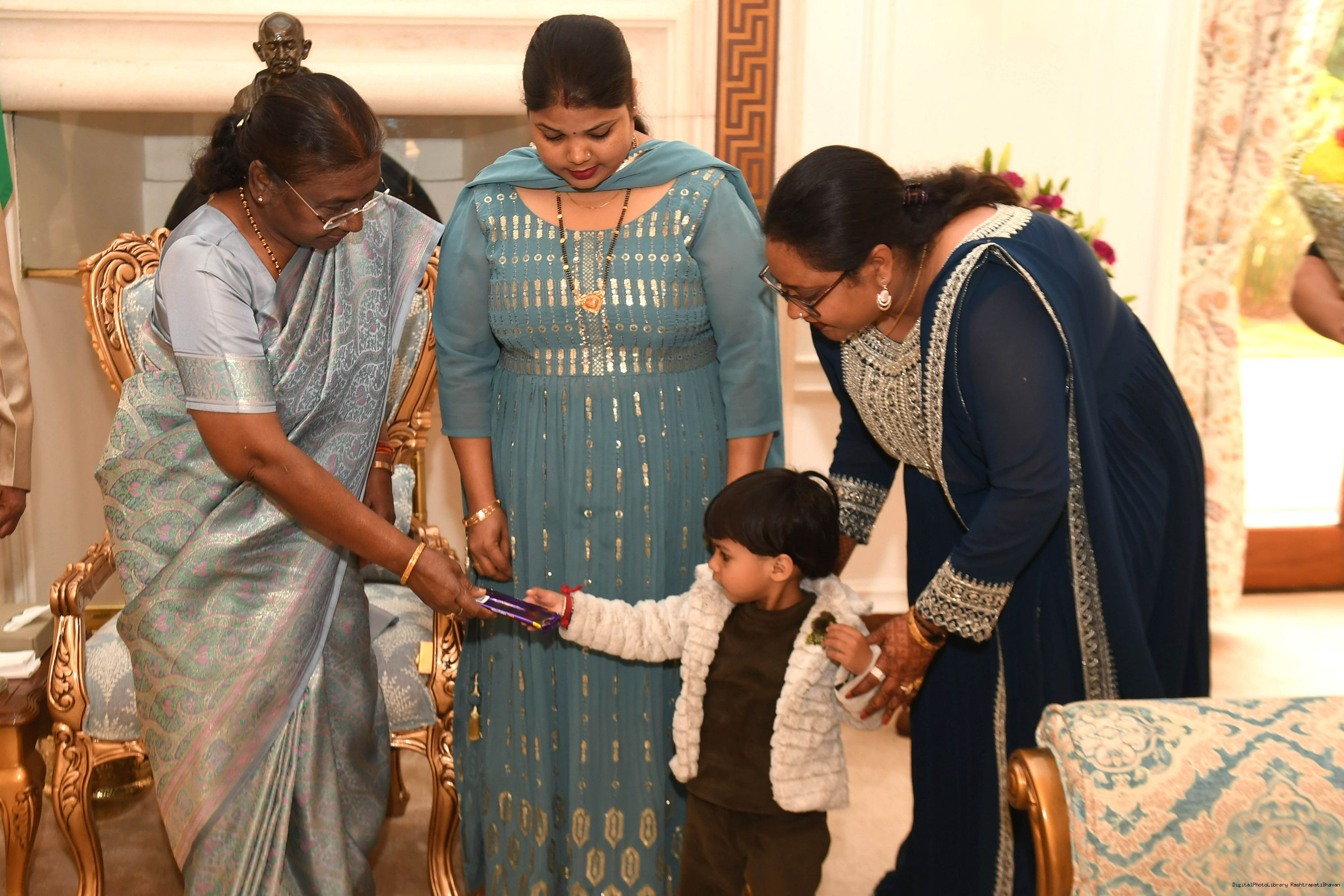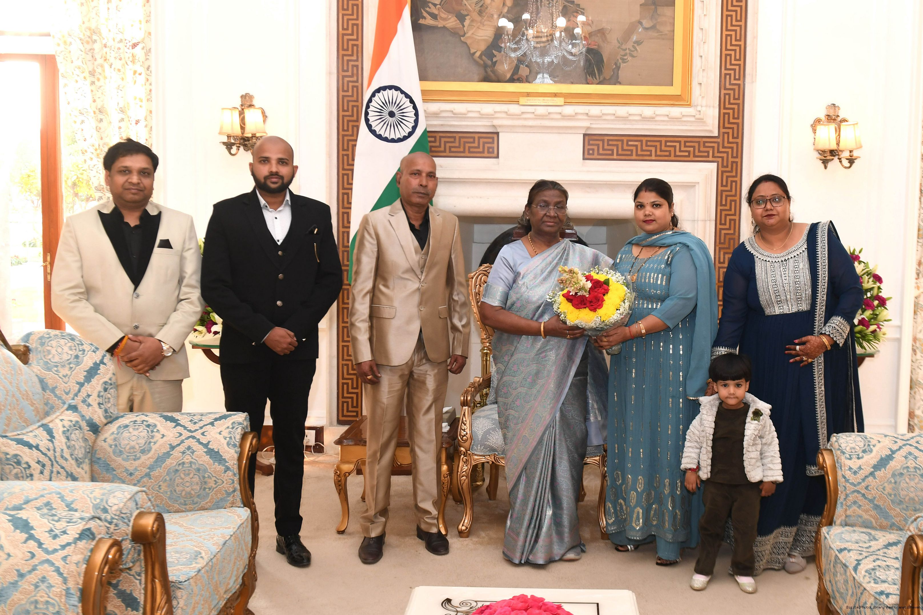 | Caption: | Shri Vipin Kumar, Head Room Attendant (Retd) along with his family members meeting with the President of India Smt Droupadi Murmu at Rashtrapati Bhavan on February 27, 2024. |