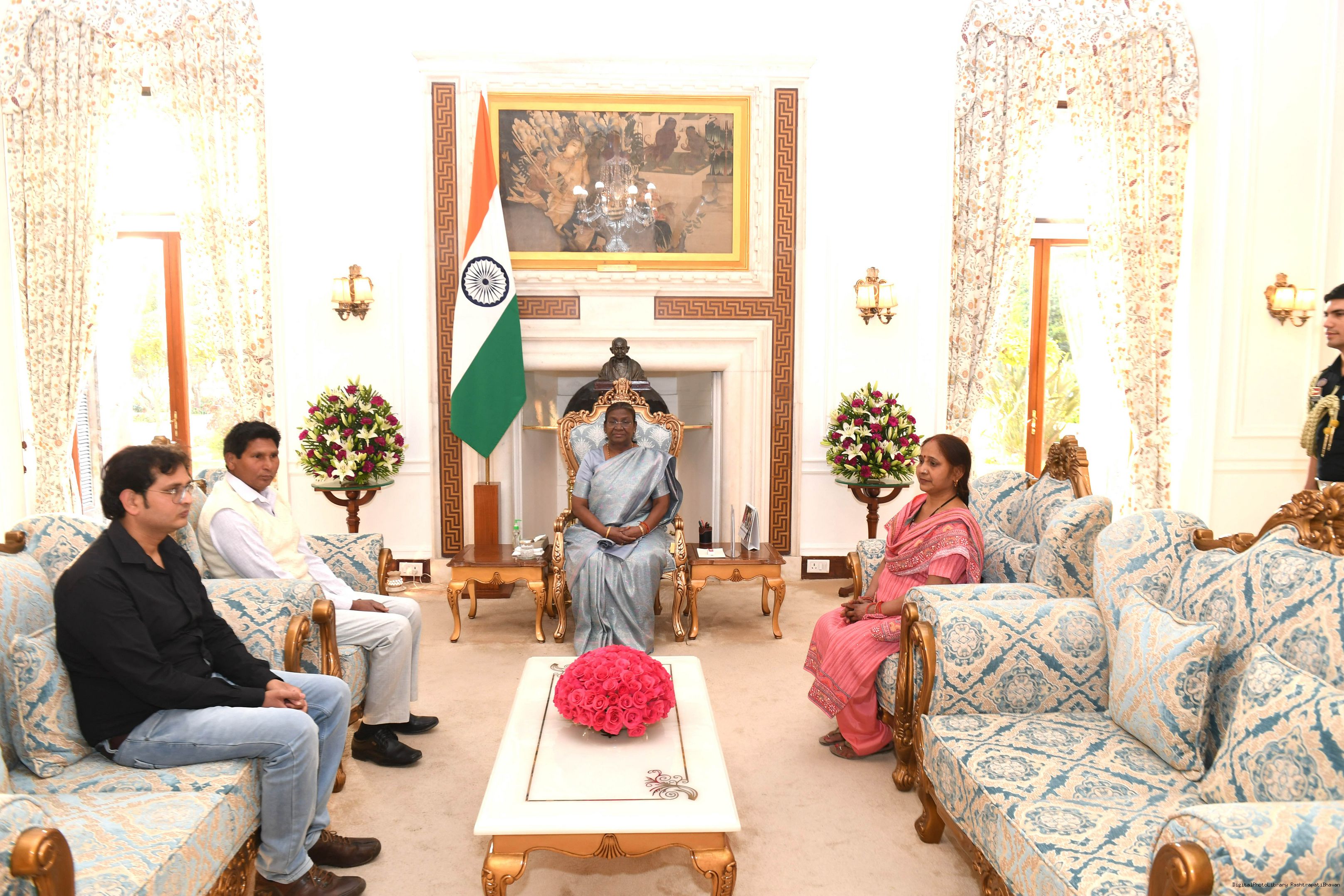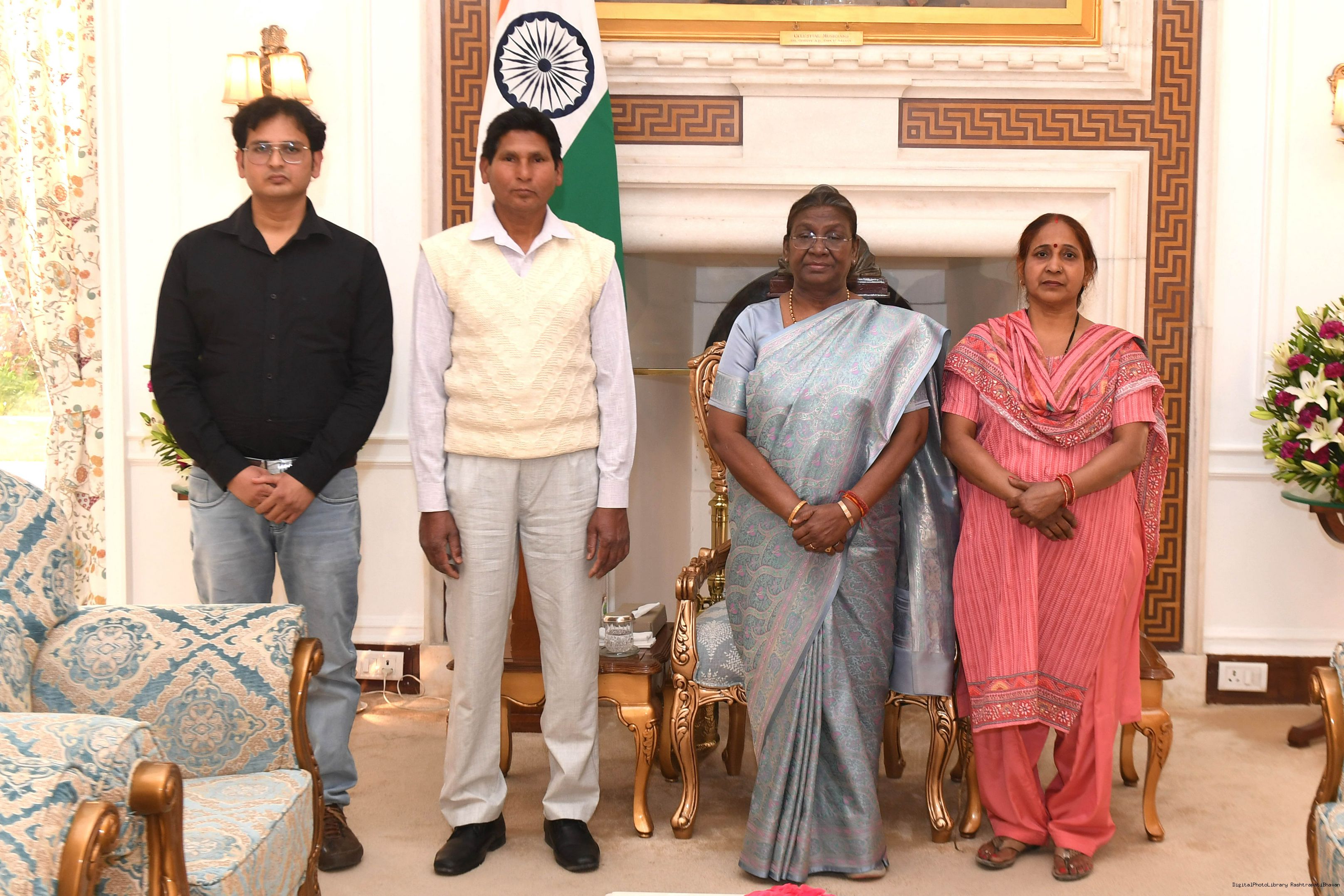 | Caption: | Shri Kishan, Senior Mali (Retd) along with his family members meeting with the President of India Smt Droupadi Murmu at Rashtrapati Bhavan on February 27, 2024. |