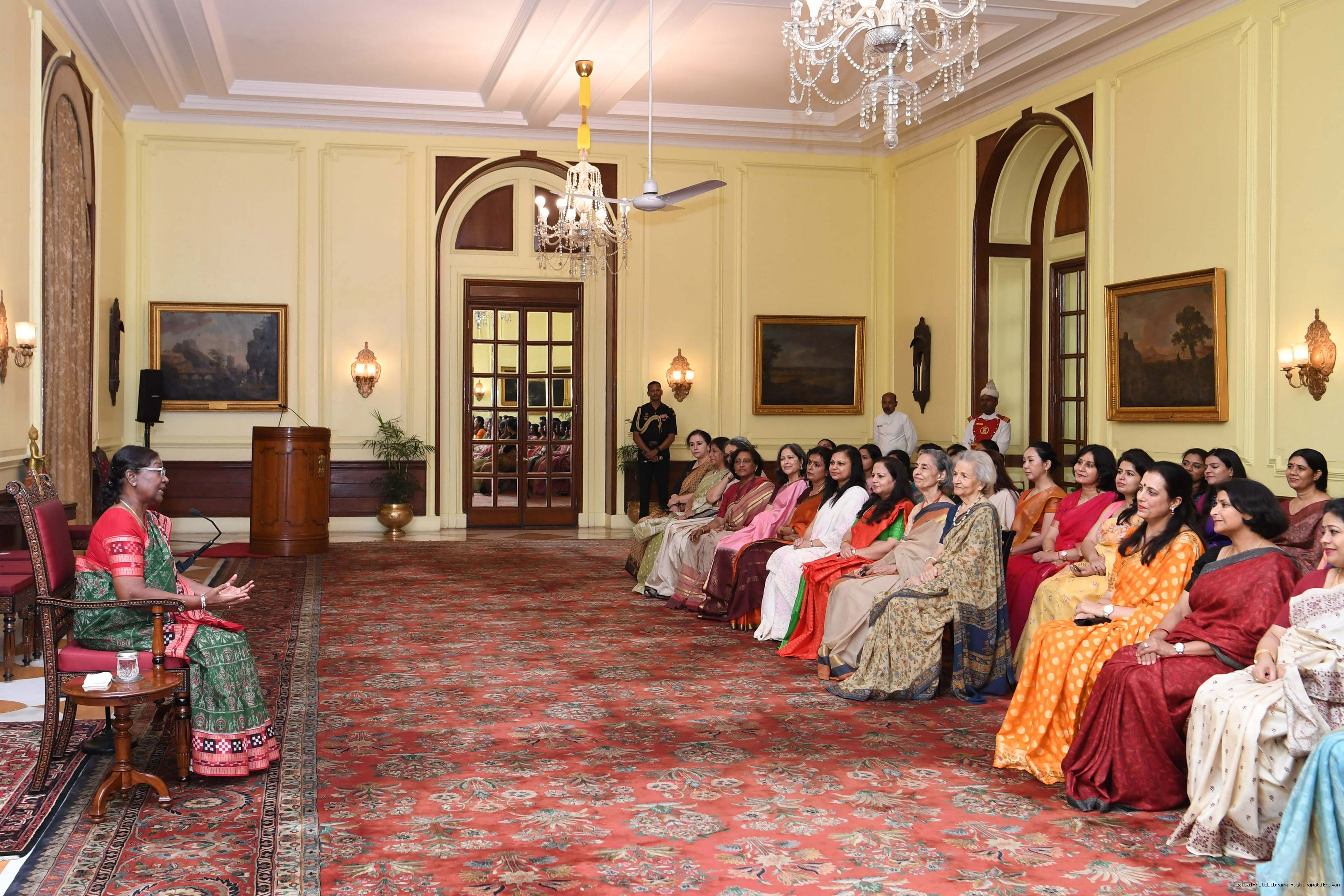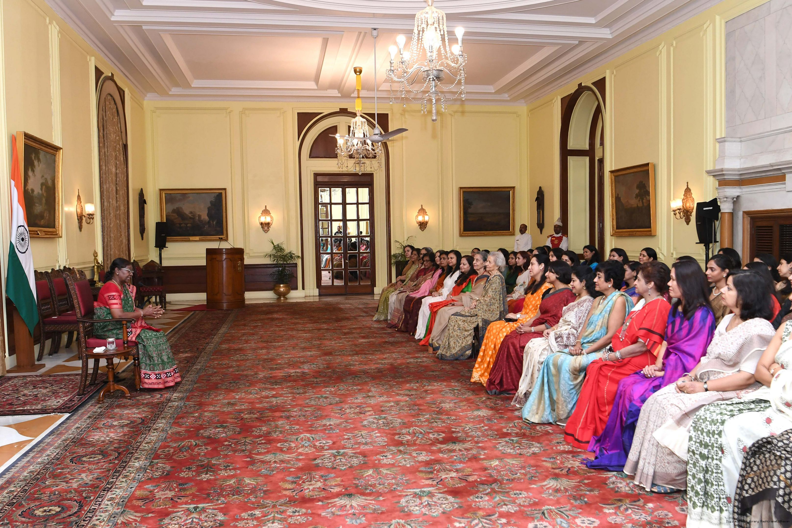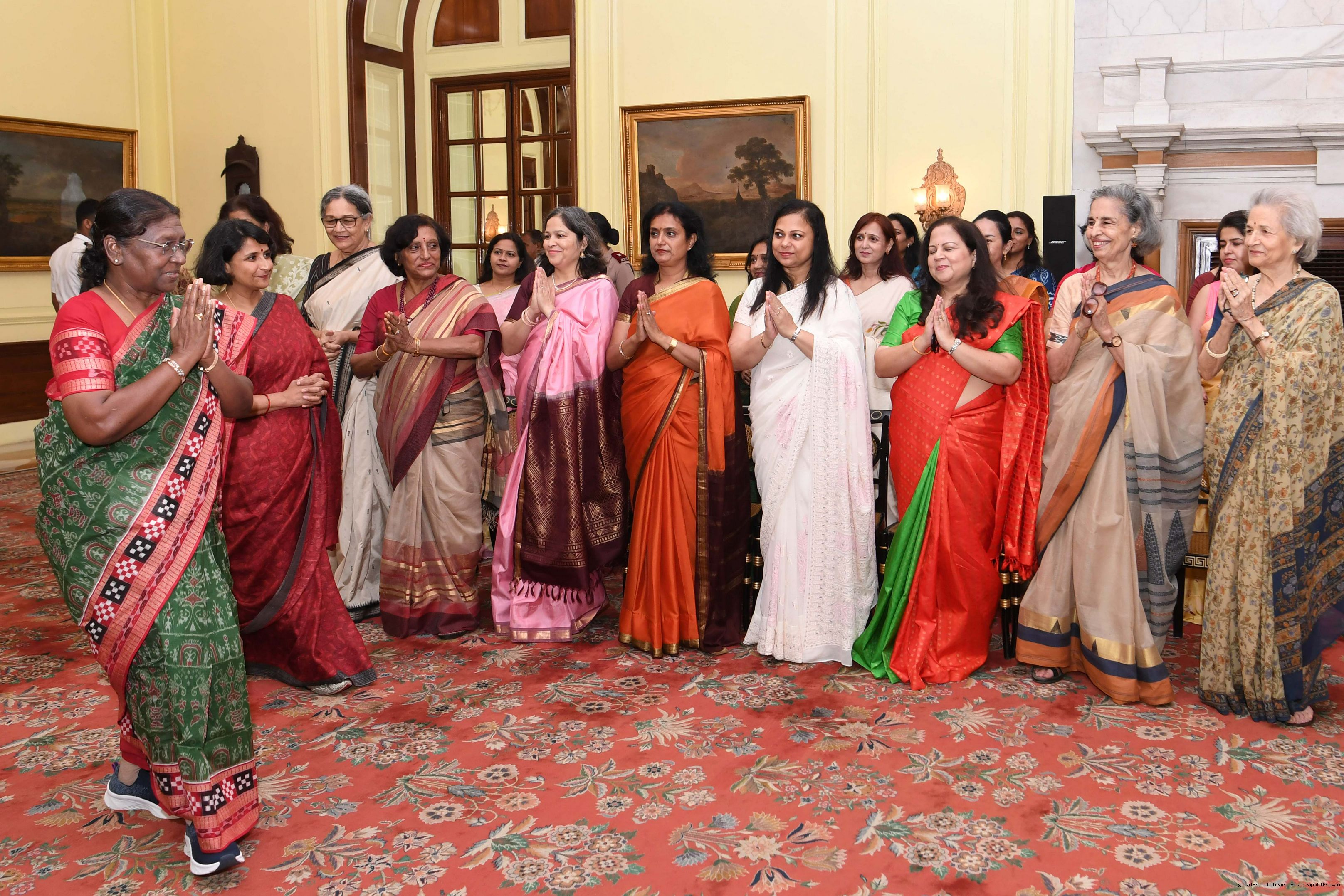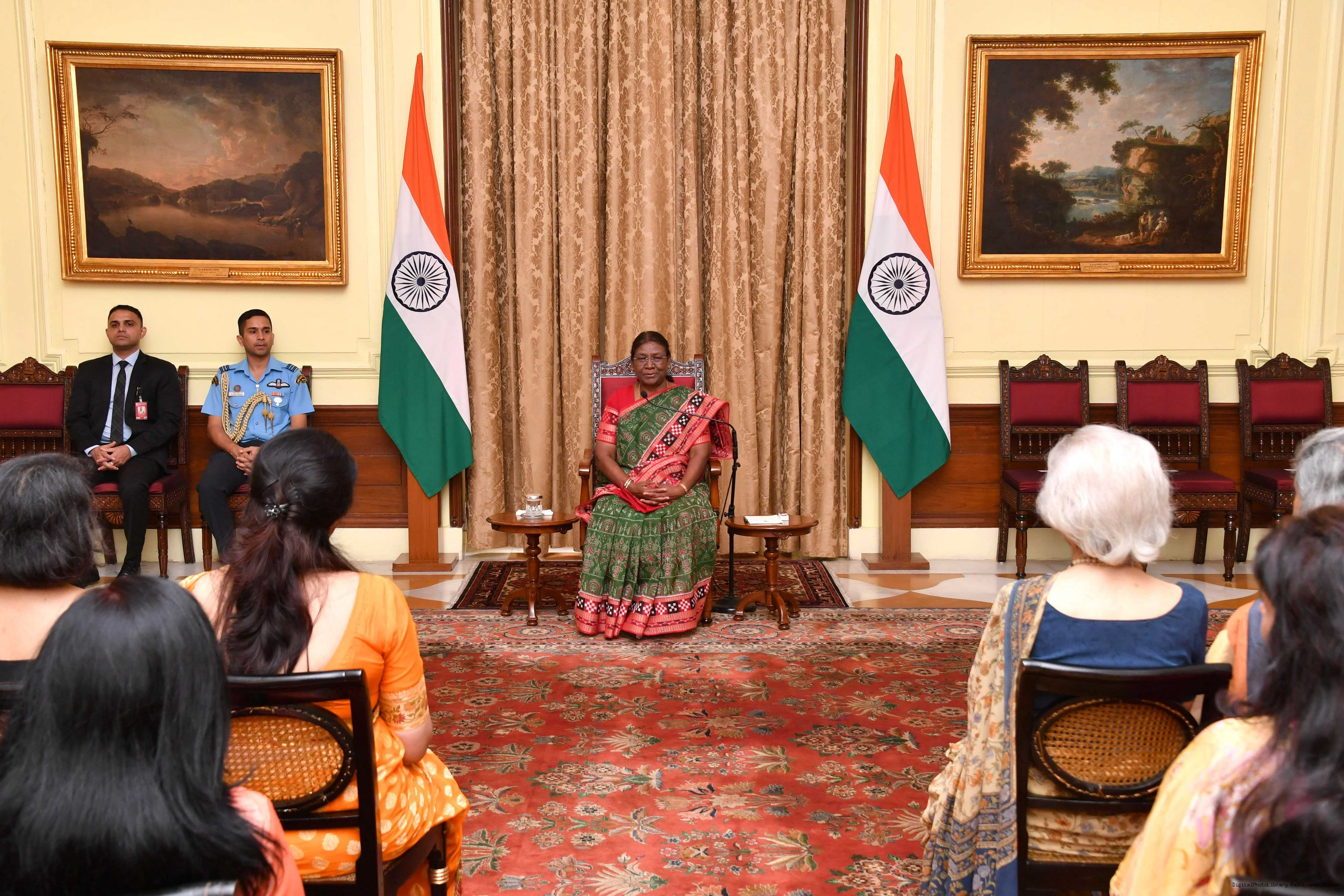 | Caption: | The President of India Smt. Droupadi Murmu Meet the members of the External Affairs Spouses' Association (EASA) at Rashtrapati Bhavan on August 25, 2023. |