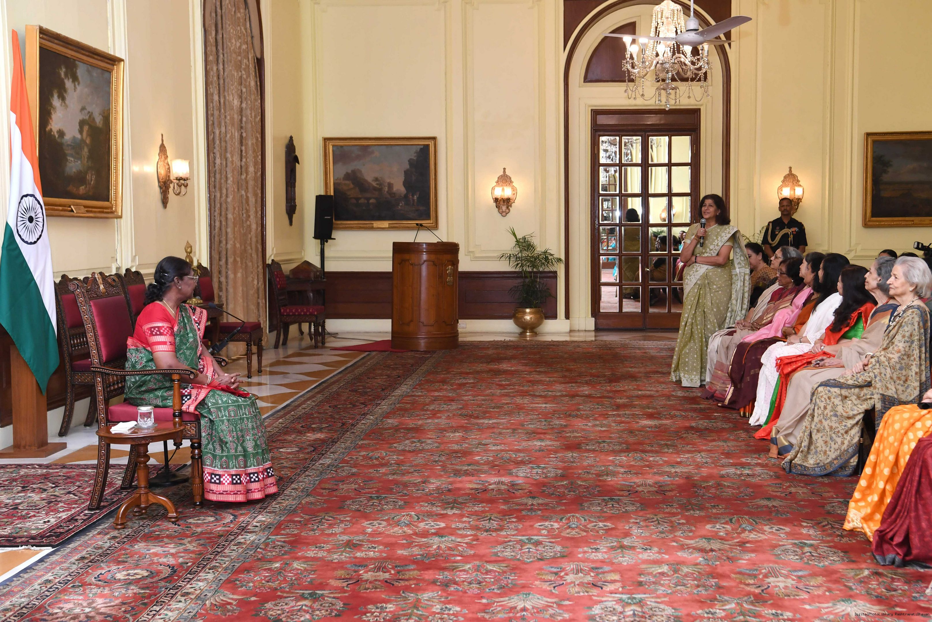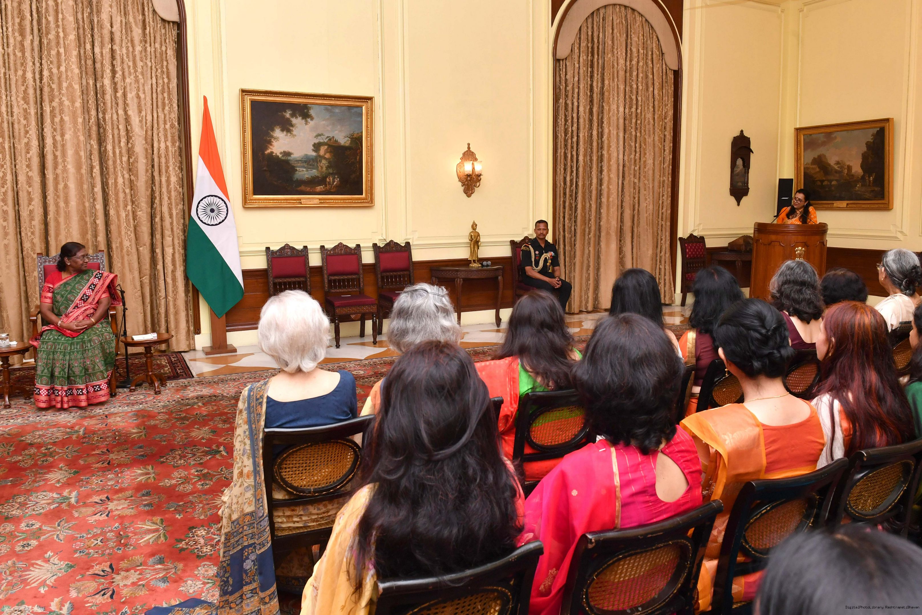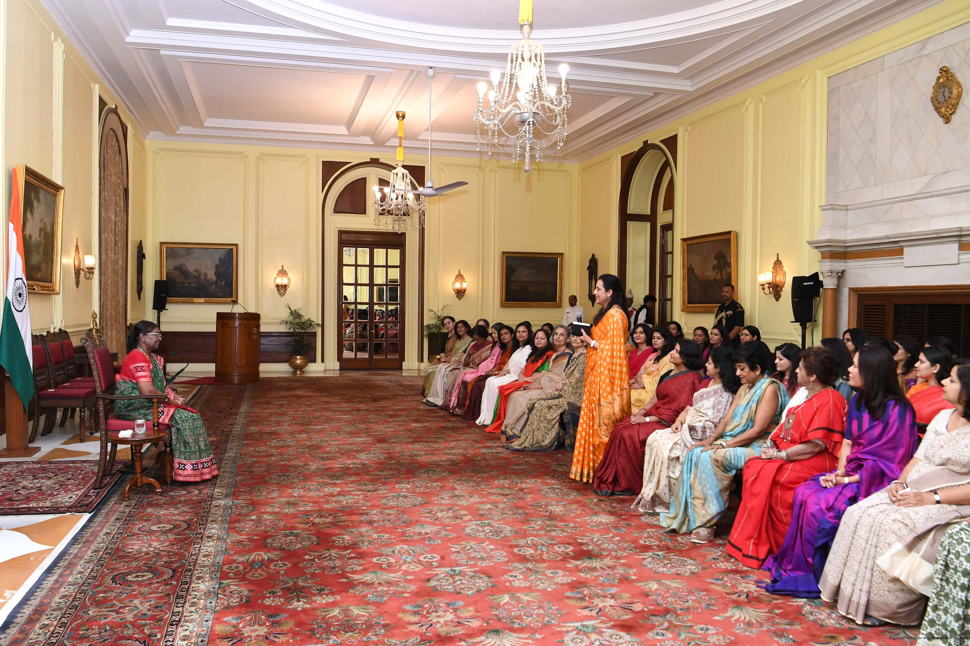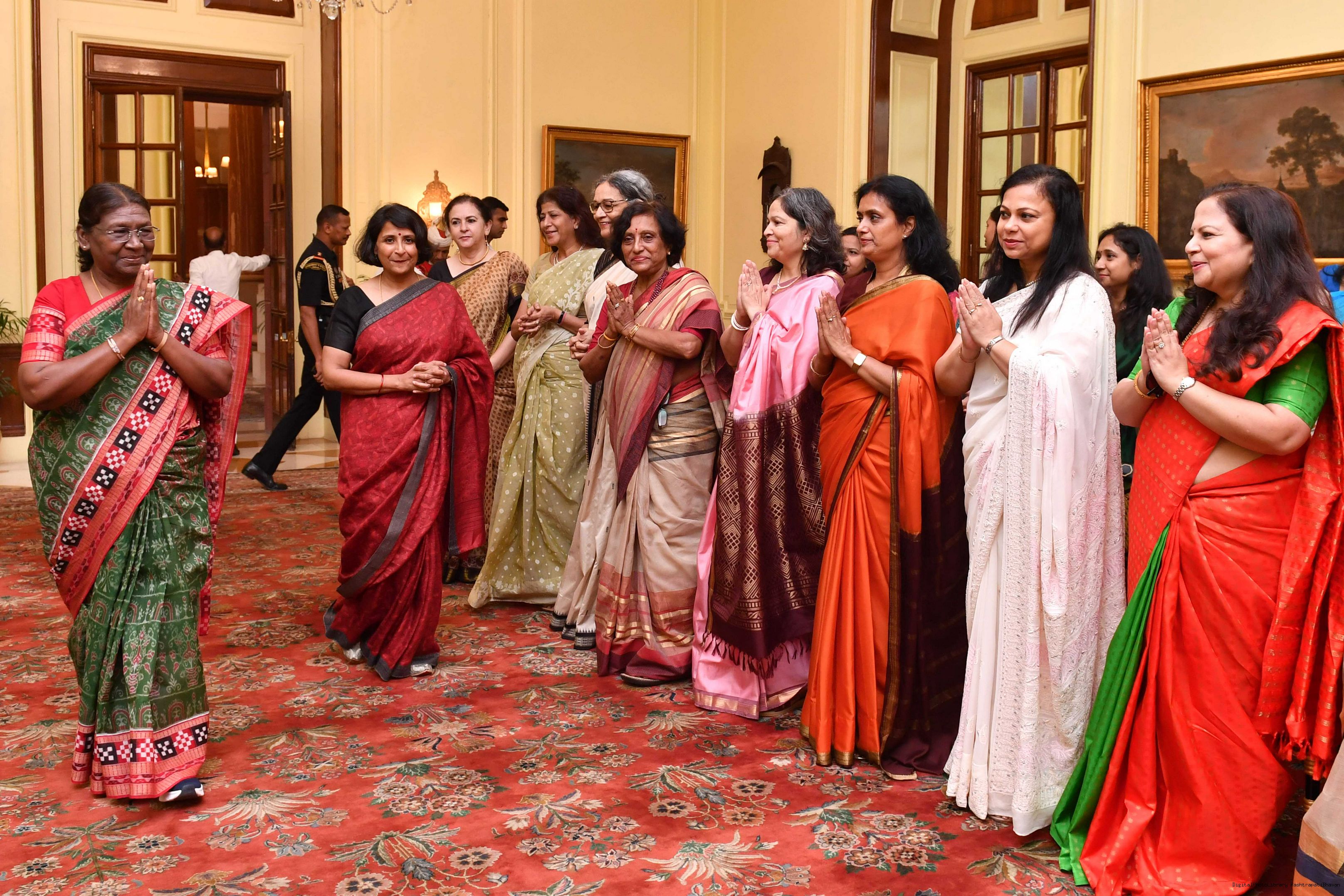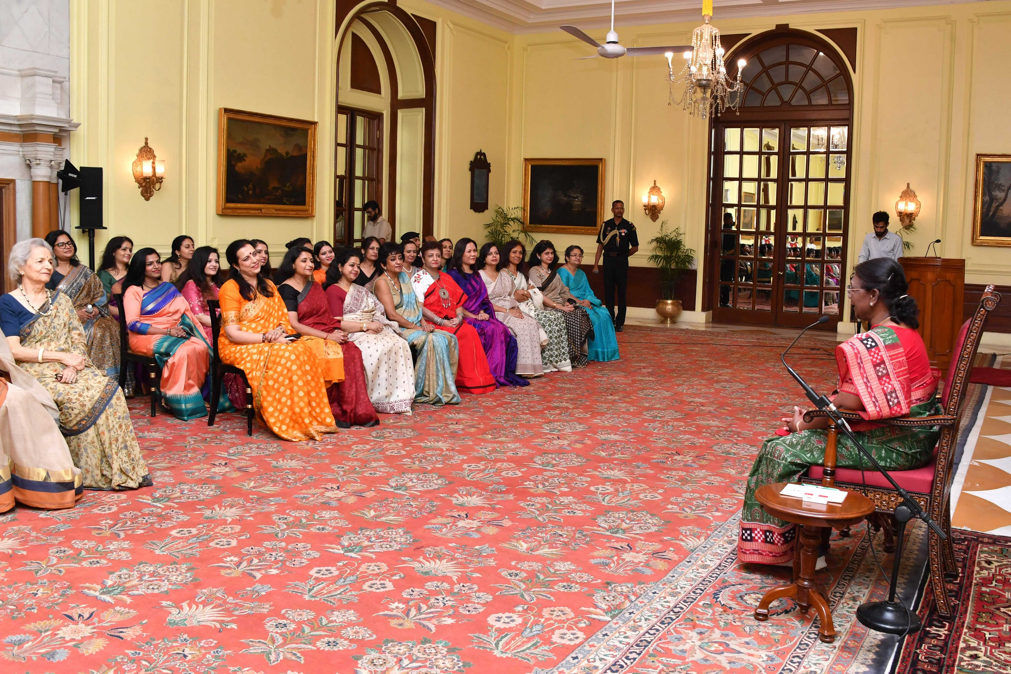 | Caption: | The President of India Smt. Droupadi Murmu Meet the members of the External Affairs Spouses' Association (EASA) at Rashtrapati Bhavan on August 25, 2023. |