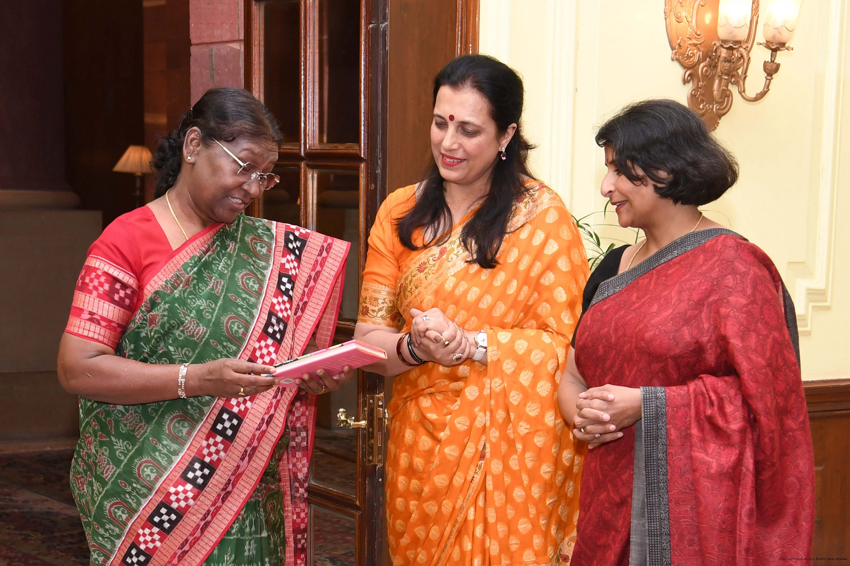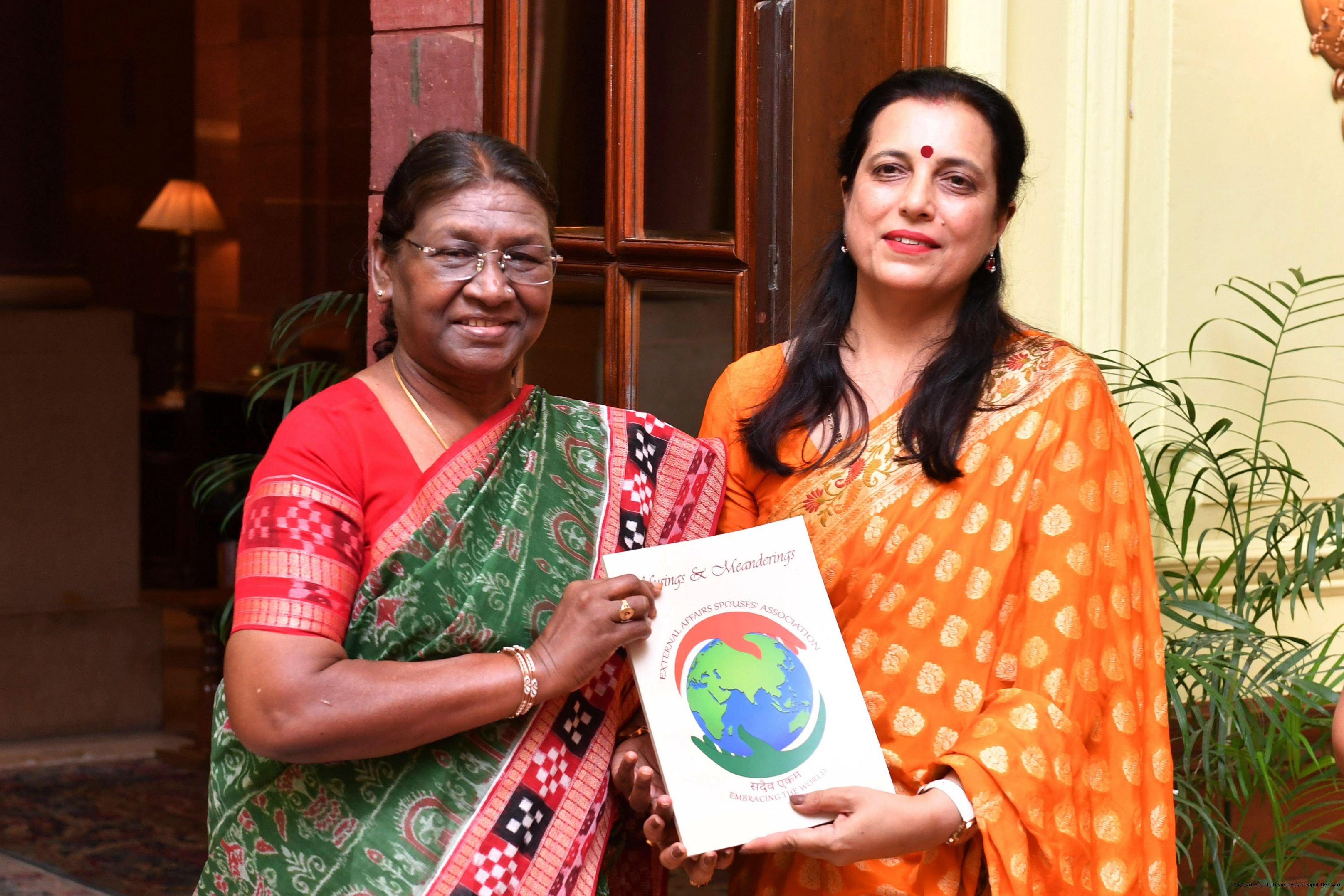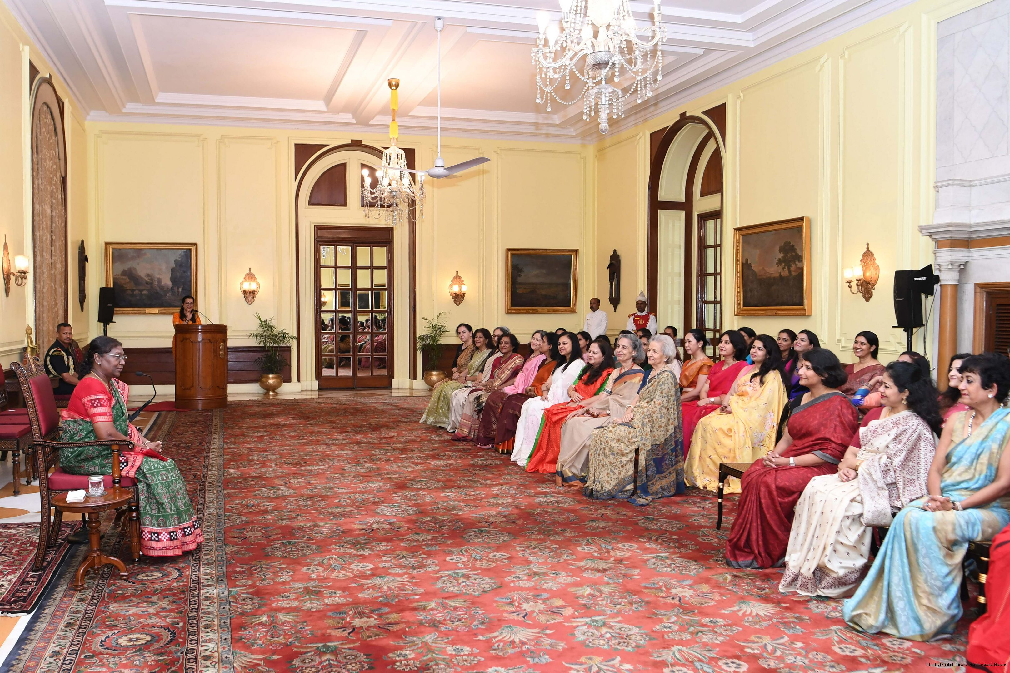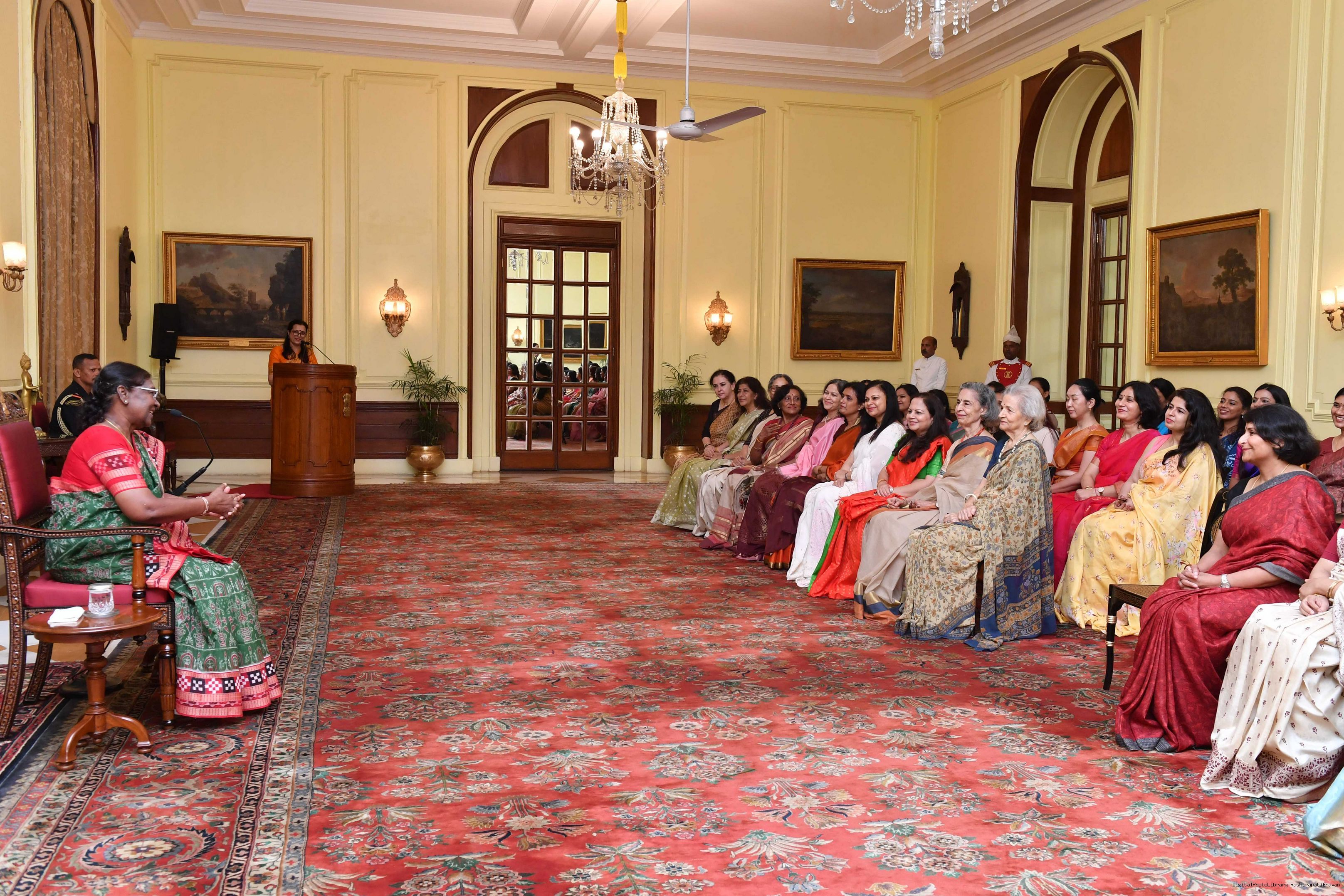 | Caption: | The President of India Smt. Droupadi Murmu Meet the members of the External Affairs Spouses' Association (EASA) at Rashtrapati Bhavan on August 25, 2023. |
