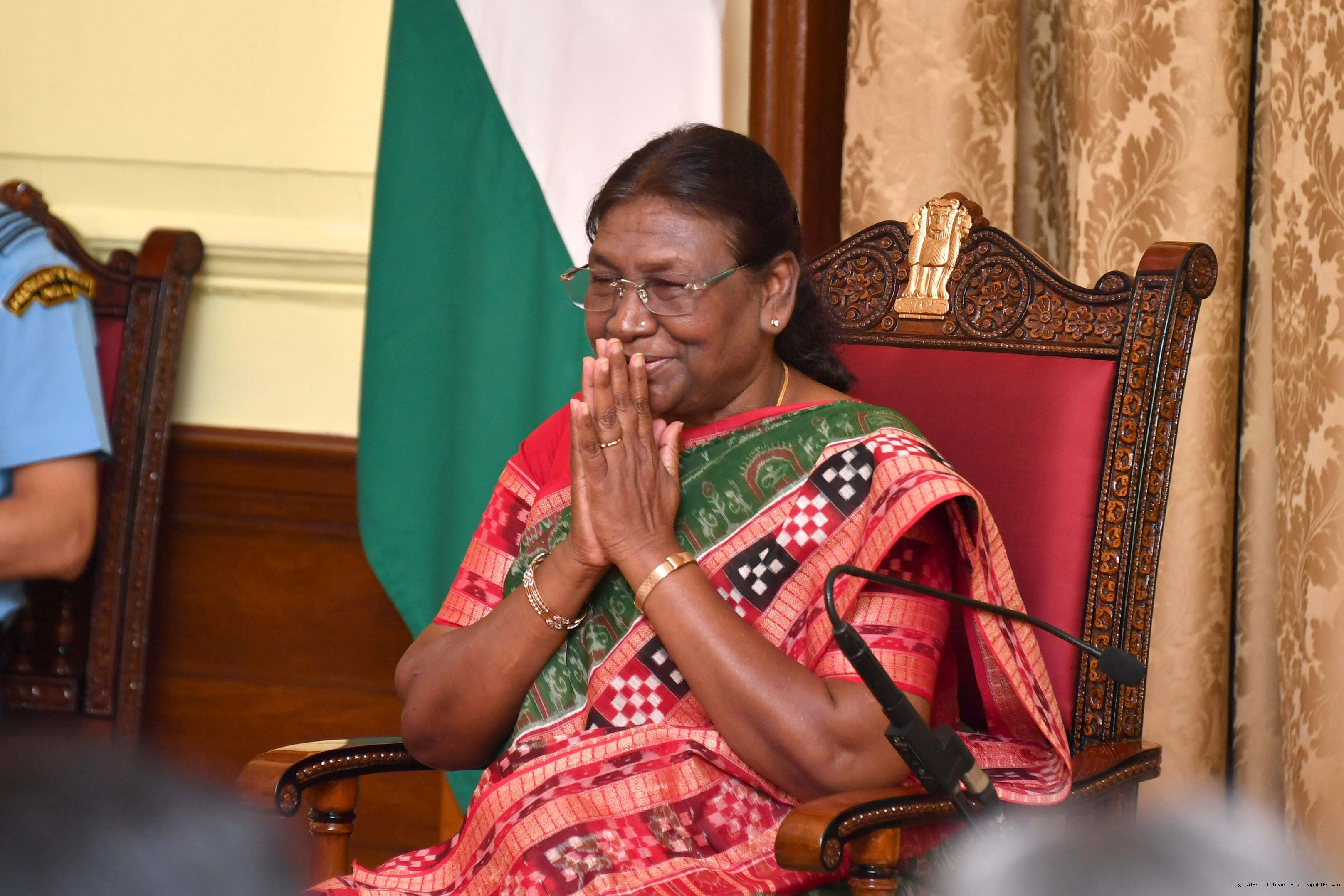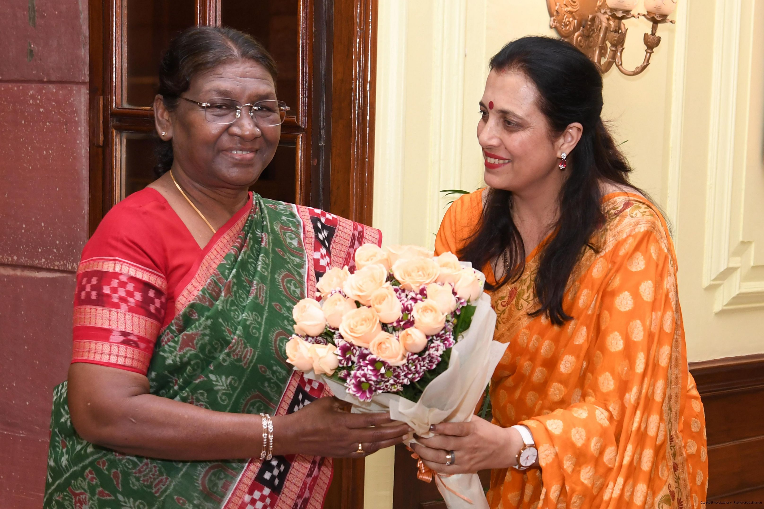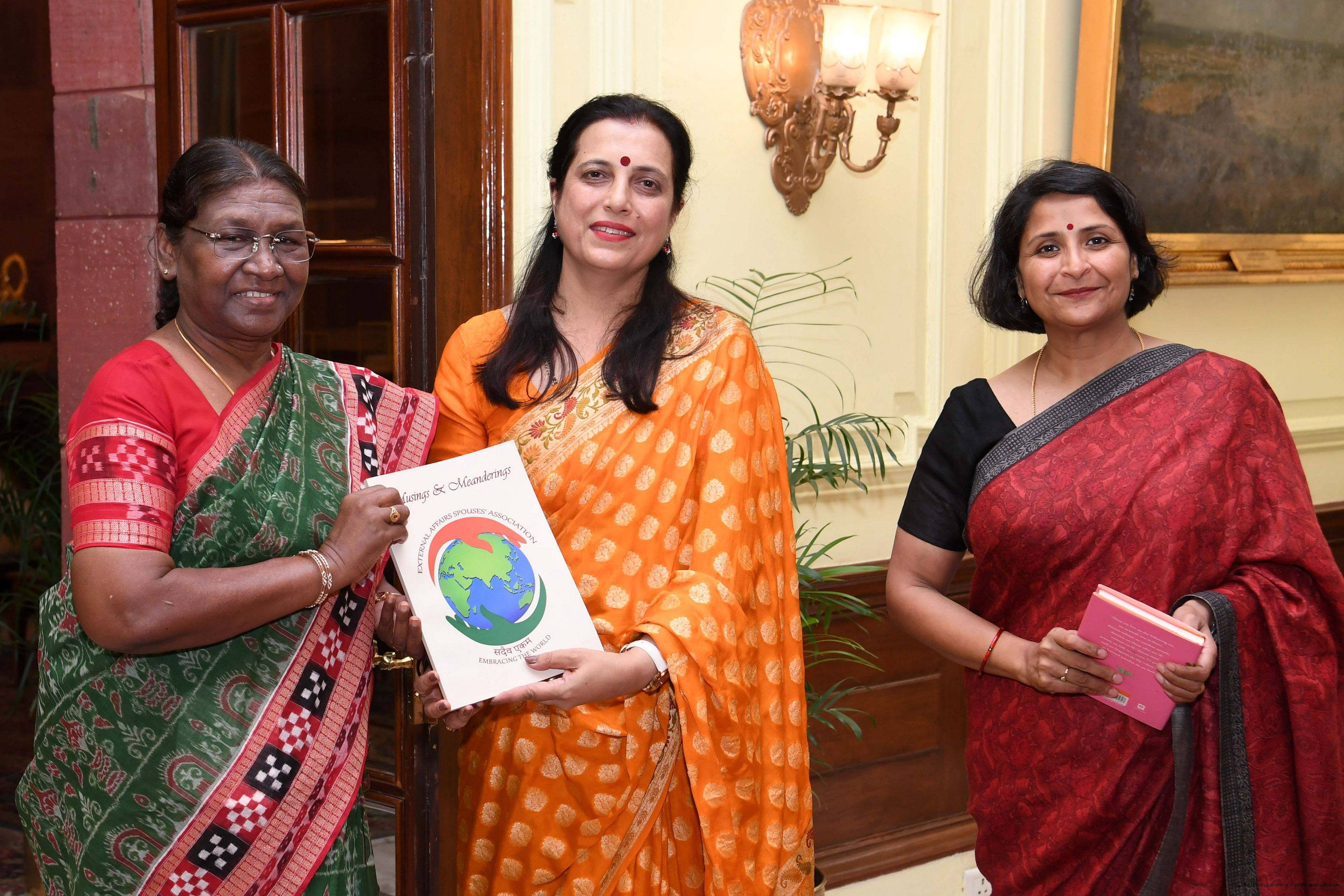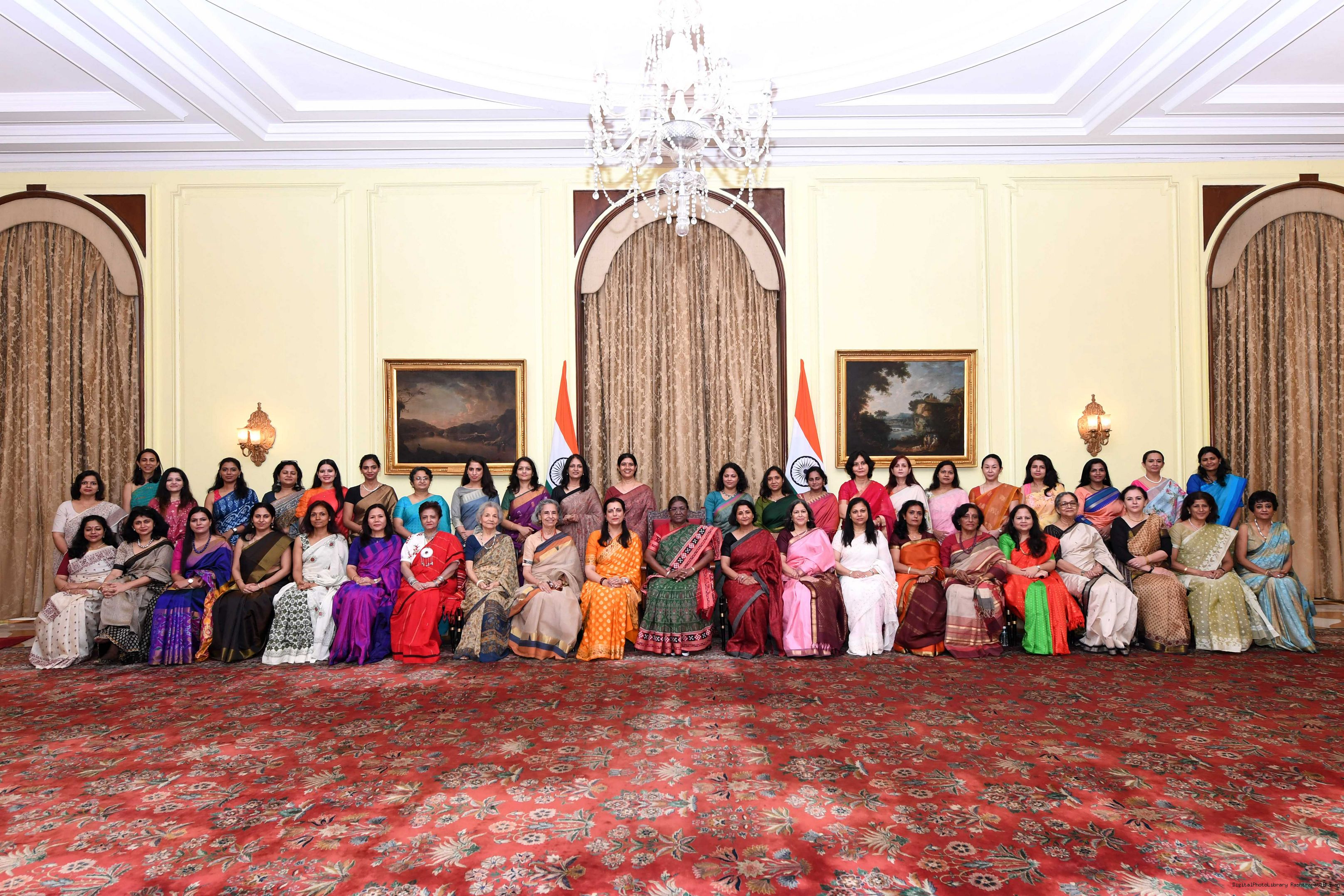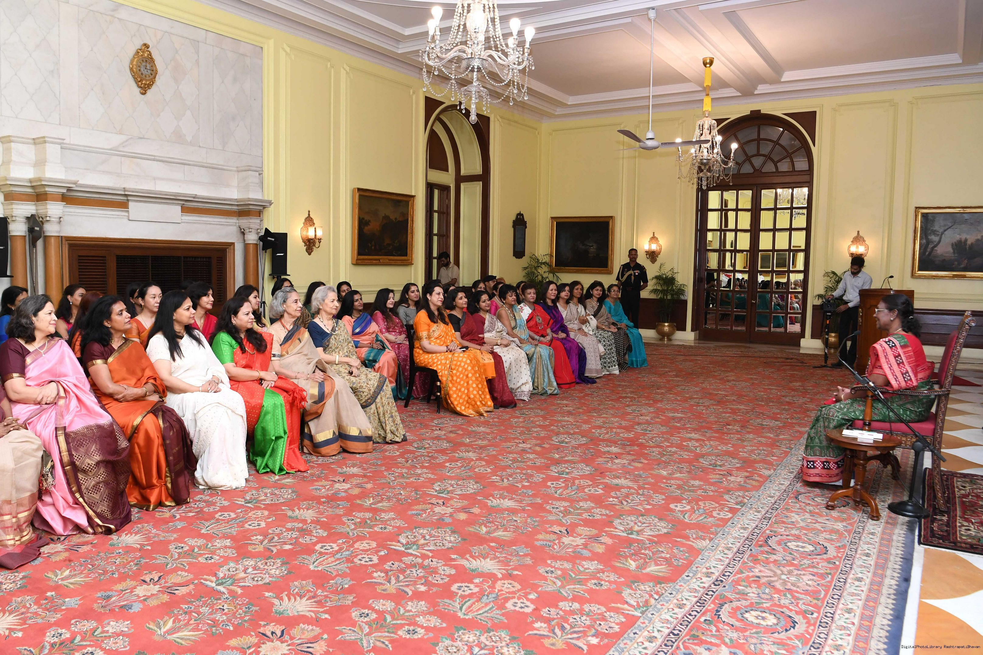 | Caption: | The President of India Smt. Droupadi Murmu Meet the members of the External Affairs Spouses' Association (EASA) at Rashtrapati Bhavan on August 25, 2023. |