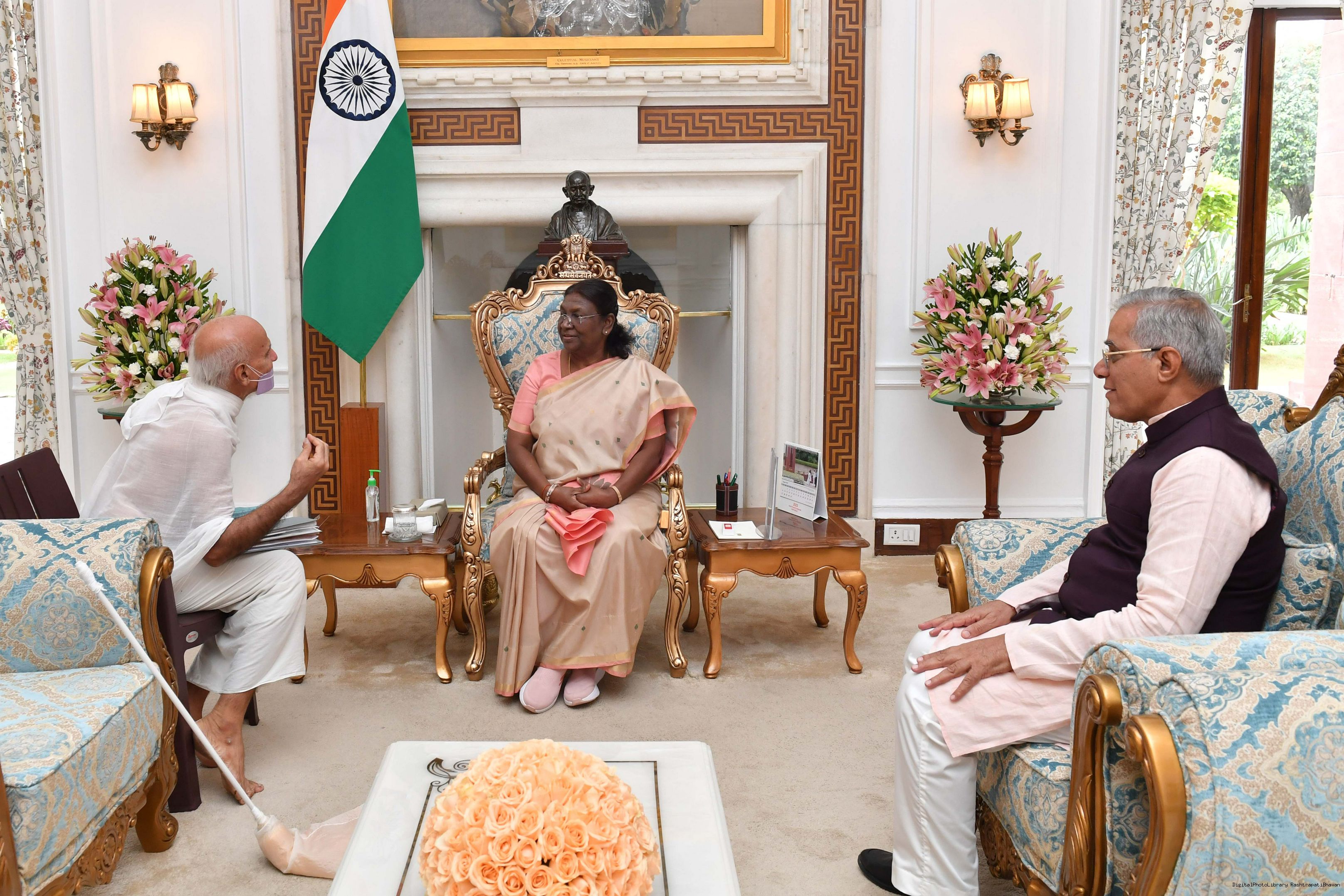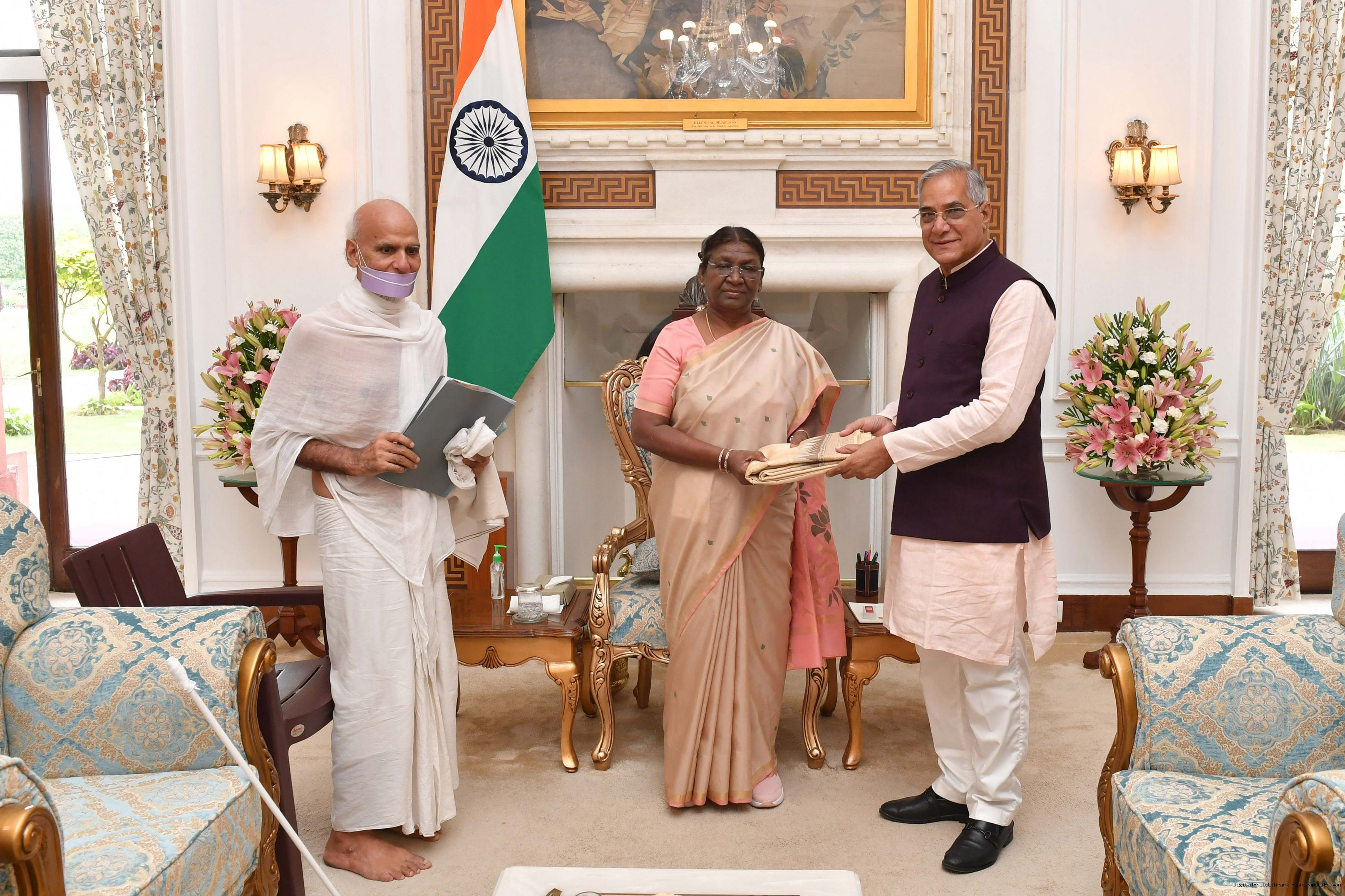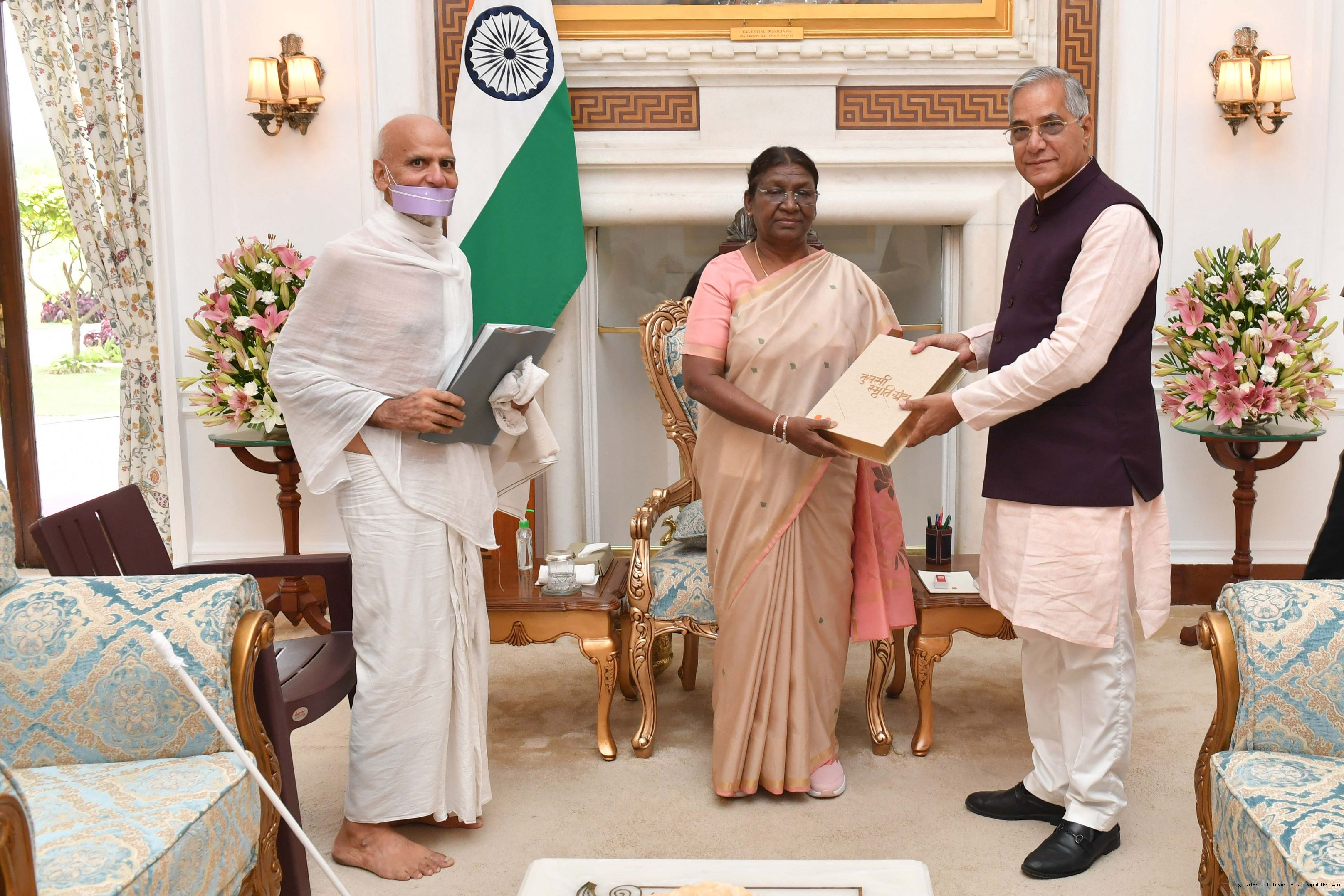 | Caption: | Muni Shri Kamal Kumar Ji along with Shri Lahar Singh Siroya, MP (Rajya Sabha) meeting with the President of India, Smt. Droupadi Murmu at Rashtrapati Bhavan on August 28, 2023. |