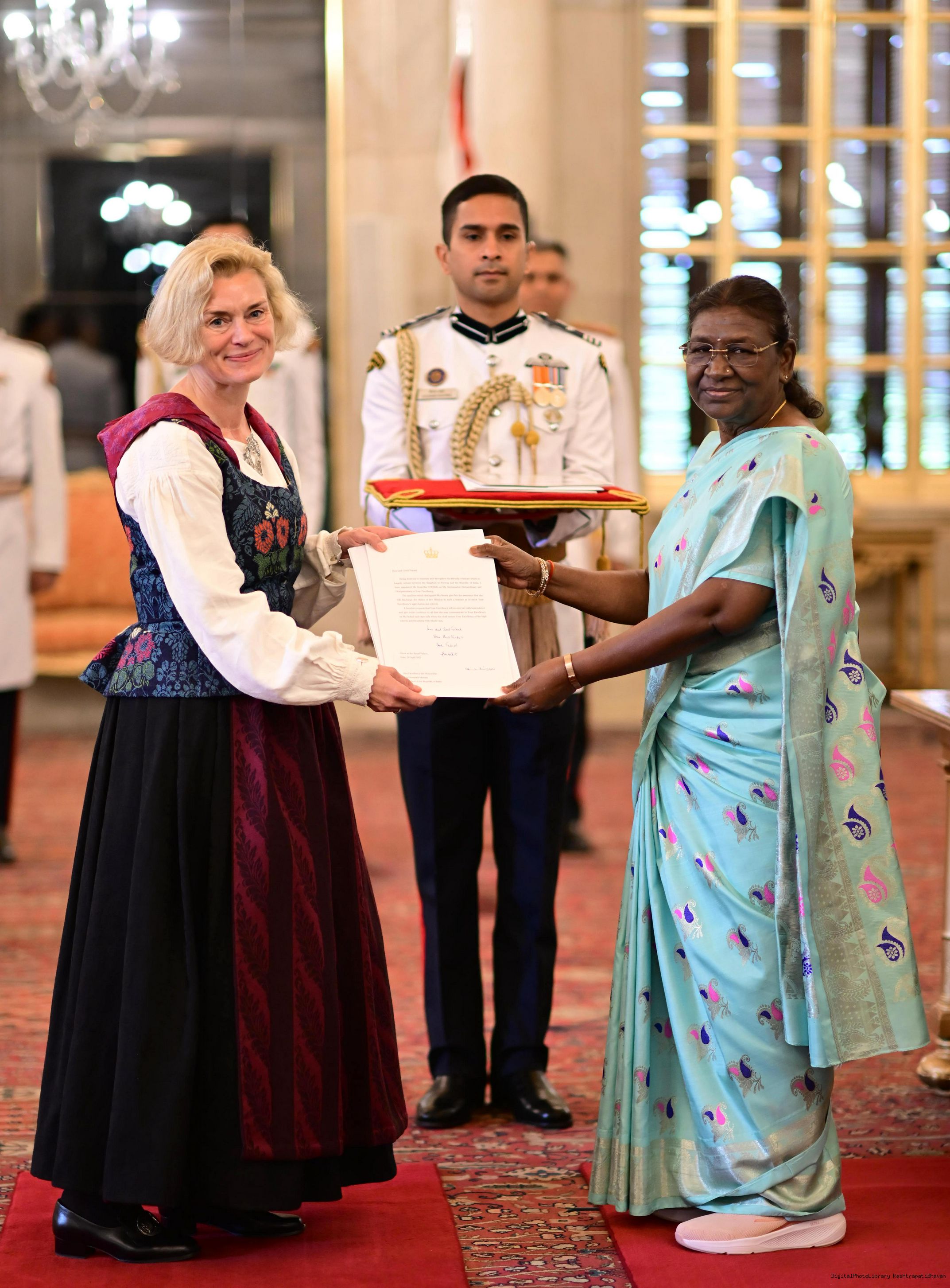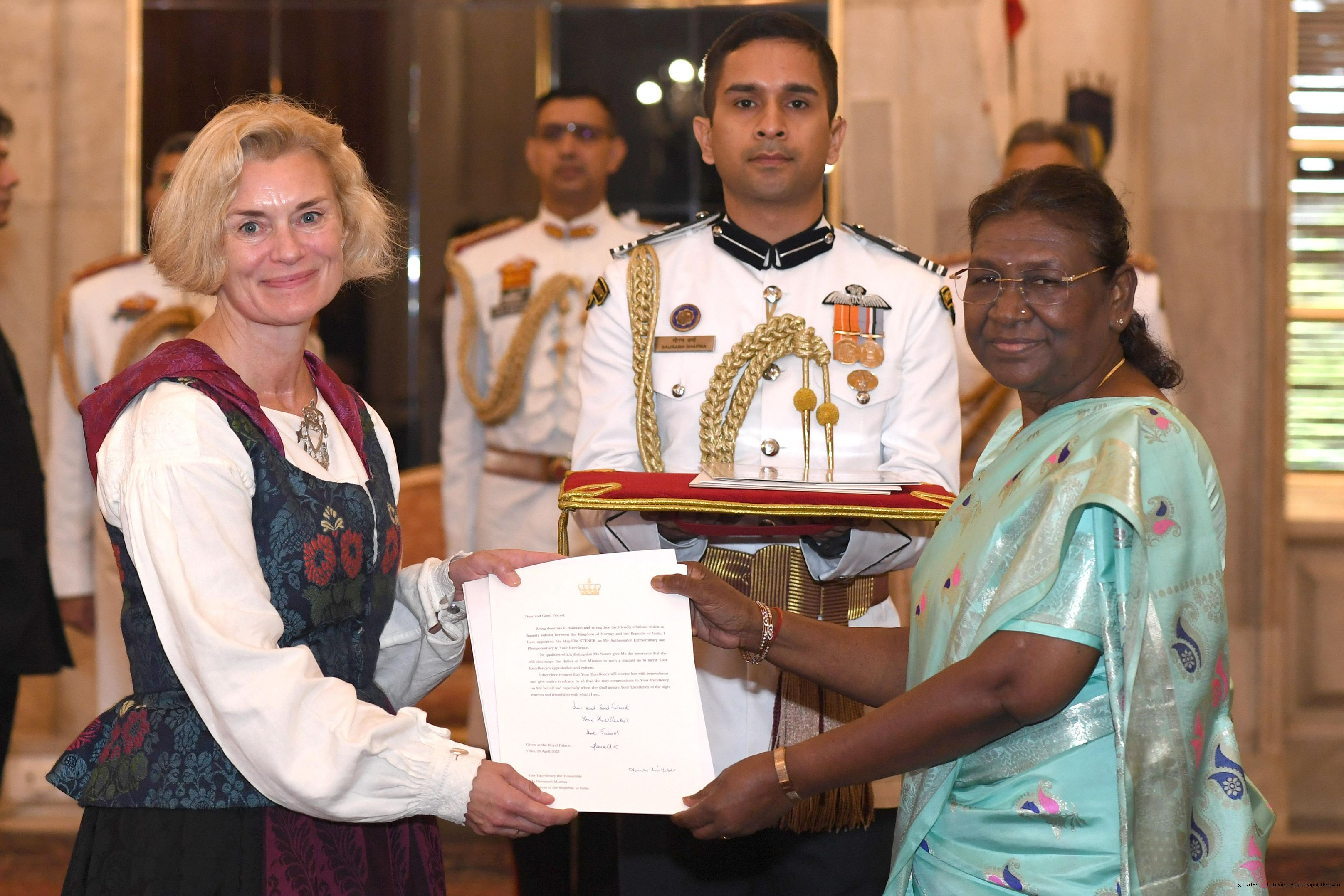 | Caption: | The Ambassador-designate of the Kingdom of Norway, H.E. Mrs May-Elin Stener presenting her credentials to the President of India, Smt Droupadi Murmu at Rashtrapati Bhavan on August 29, 2023. |