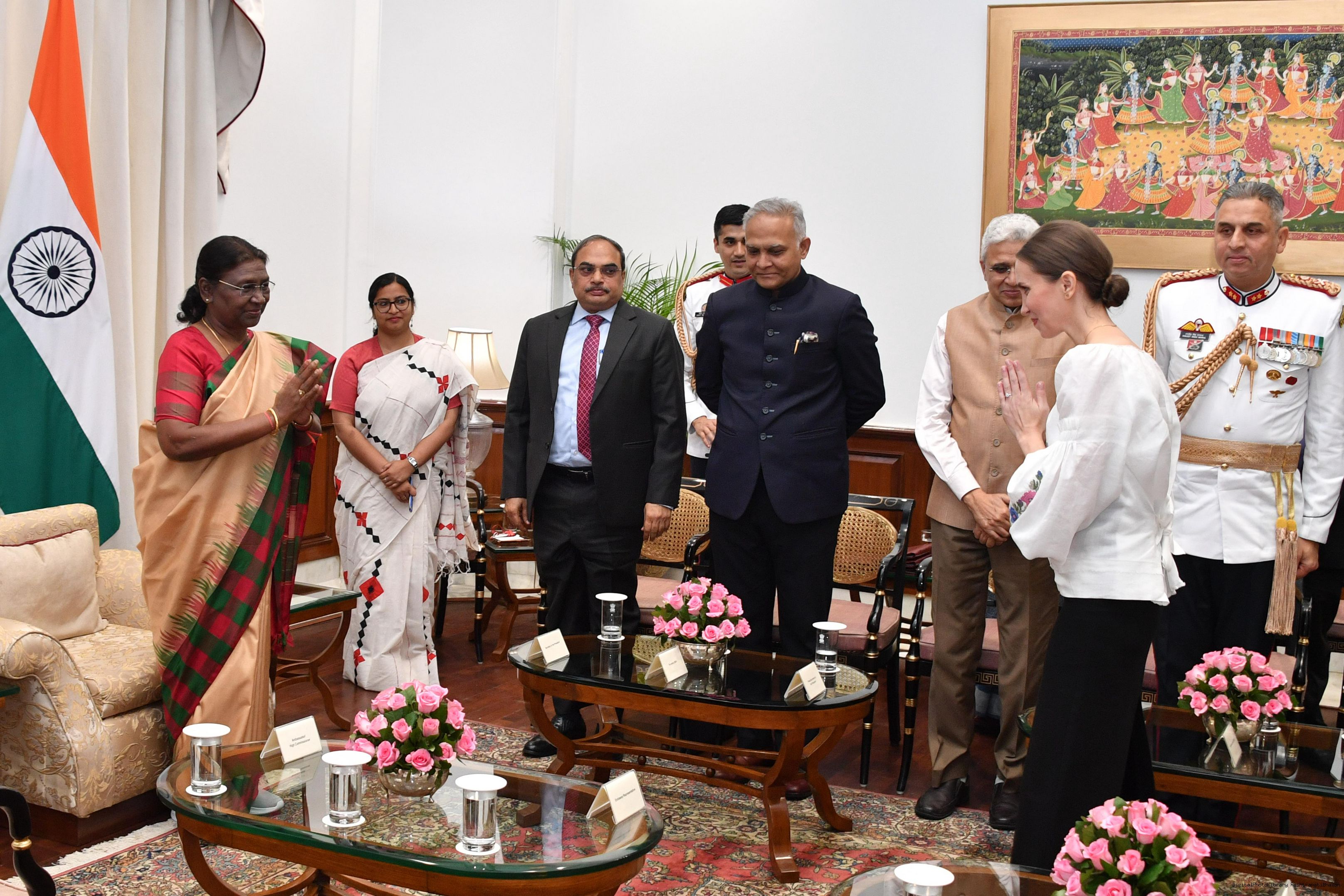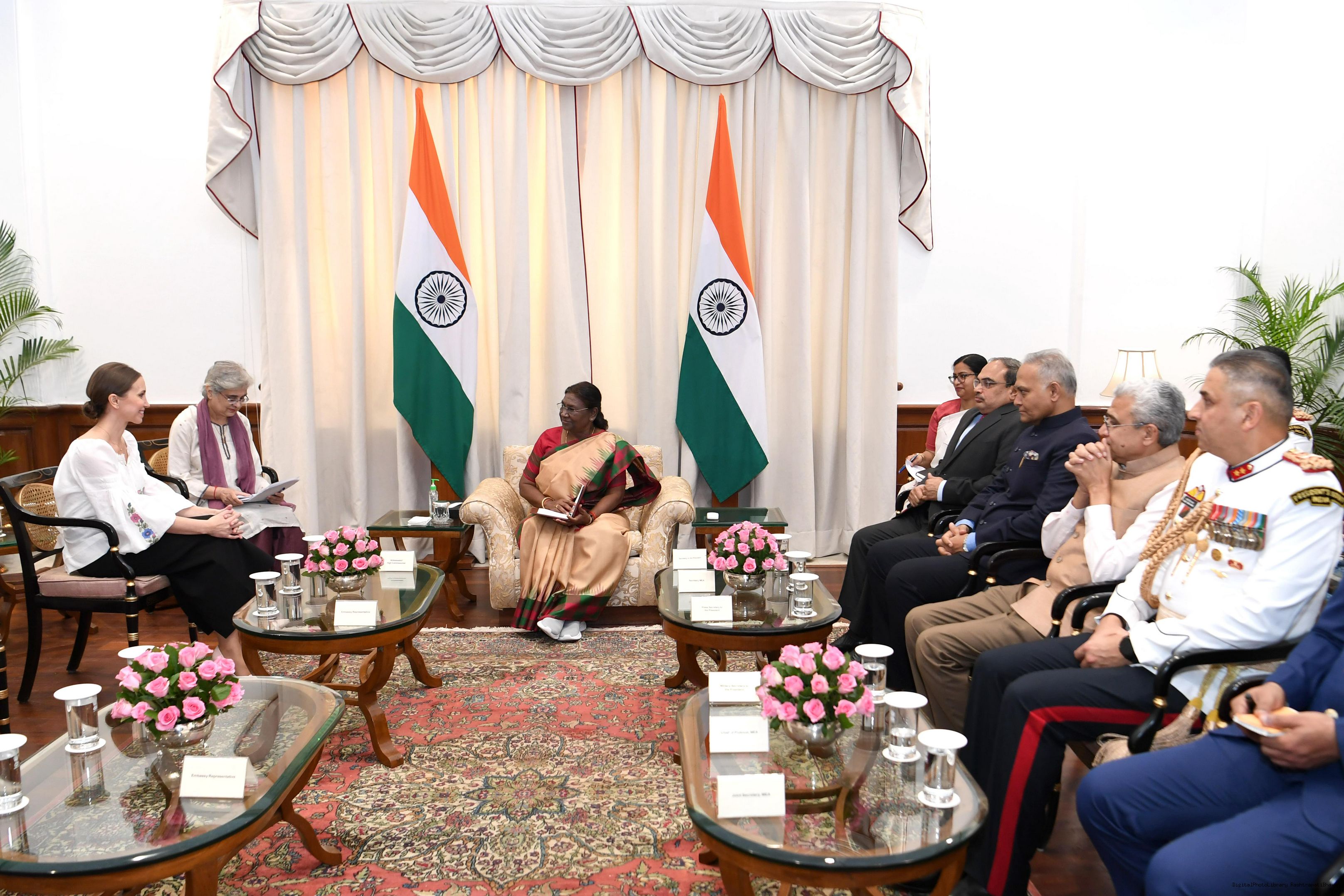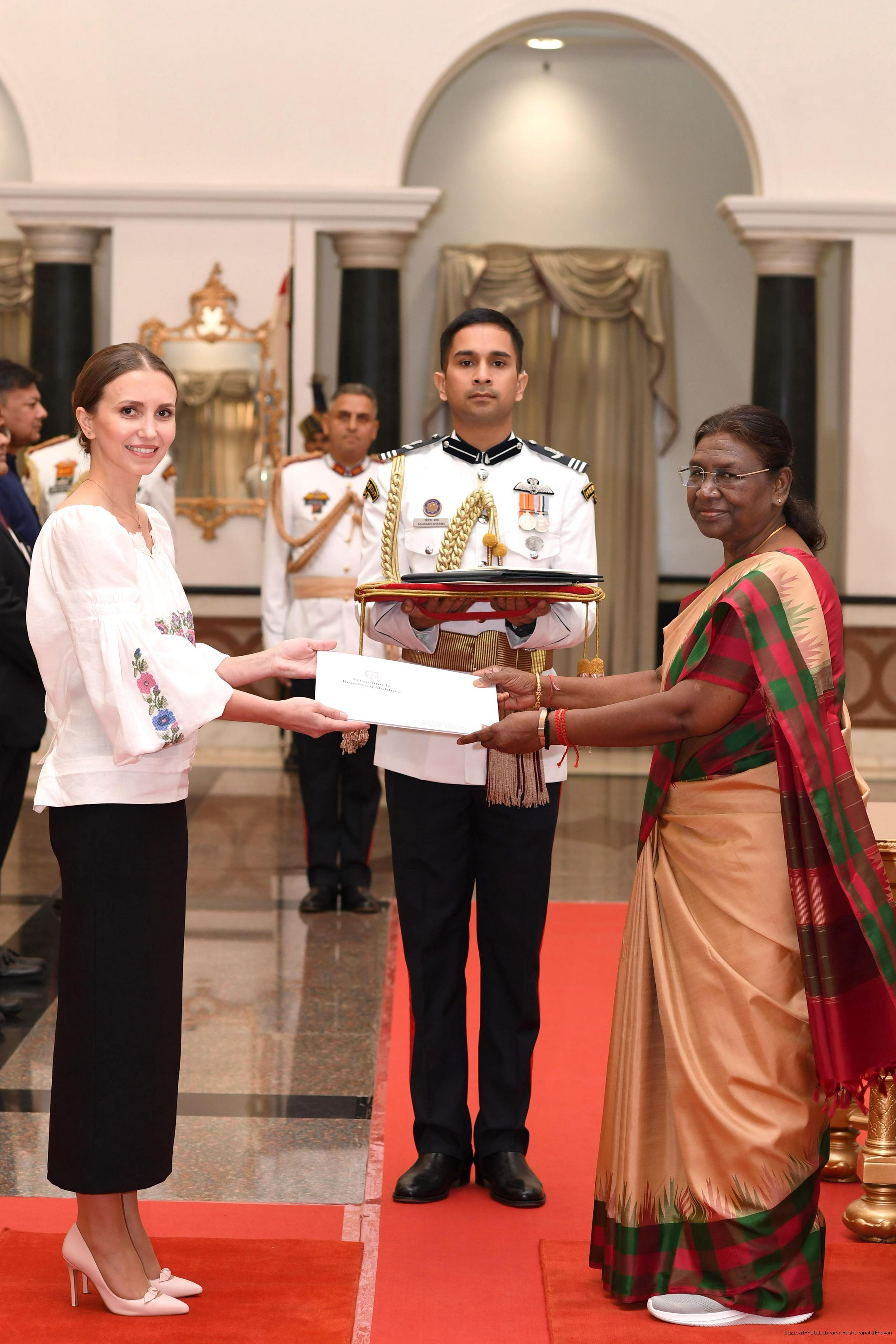 | Caption: | The Ambassador-Designate of the Republic of Moldova, H.E. Mrs Ana Taban presenting her credentials to the President of India, Smt Droupadi Murmu at Rashtrapati Bhavan on October 23, 2023. |