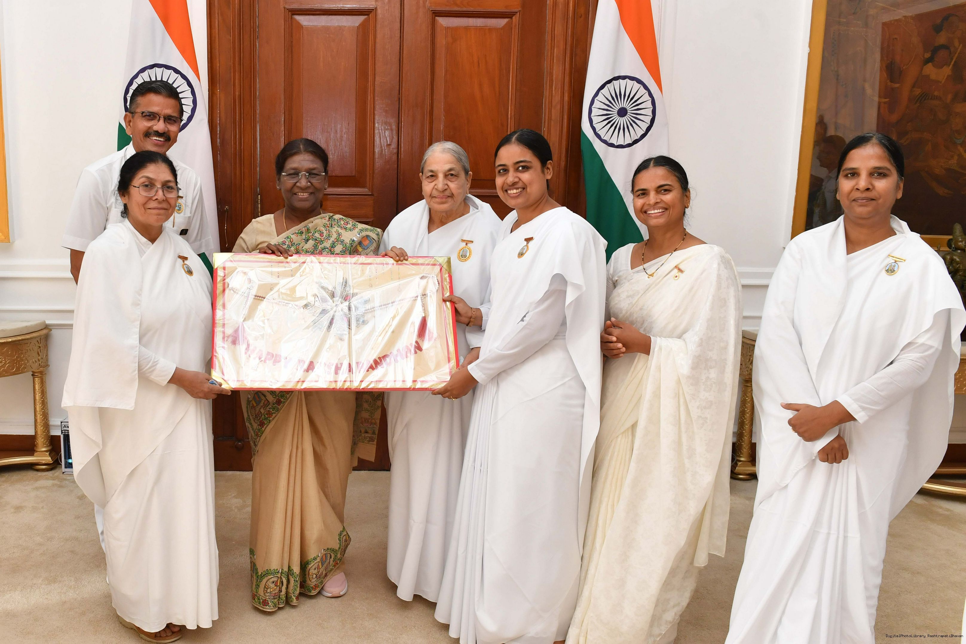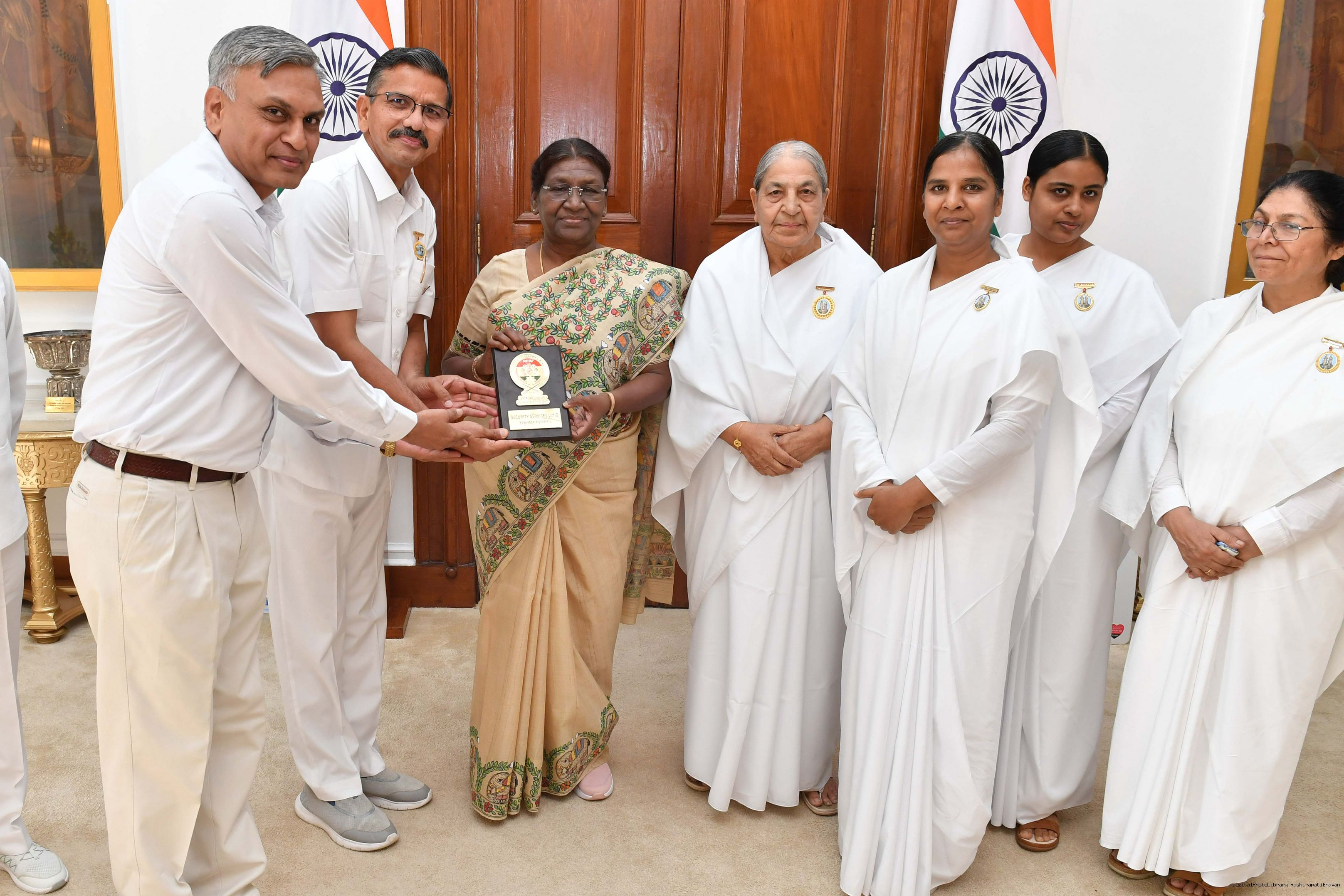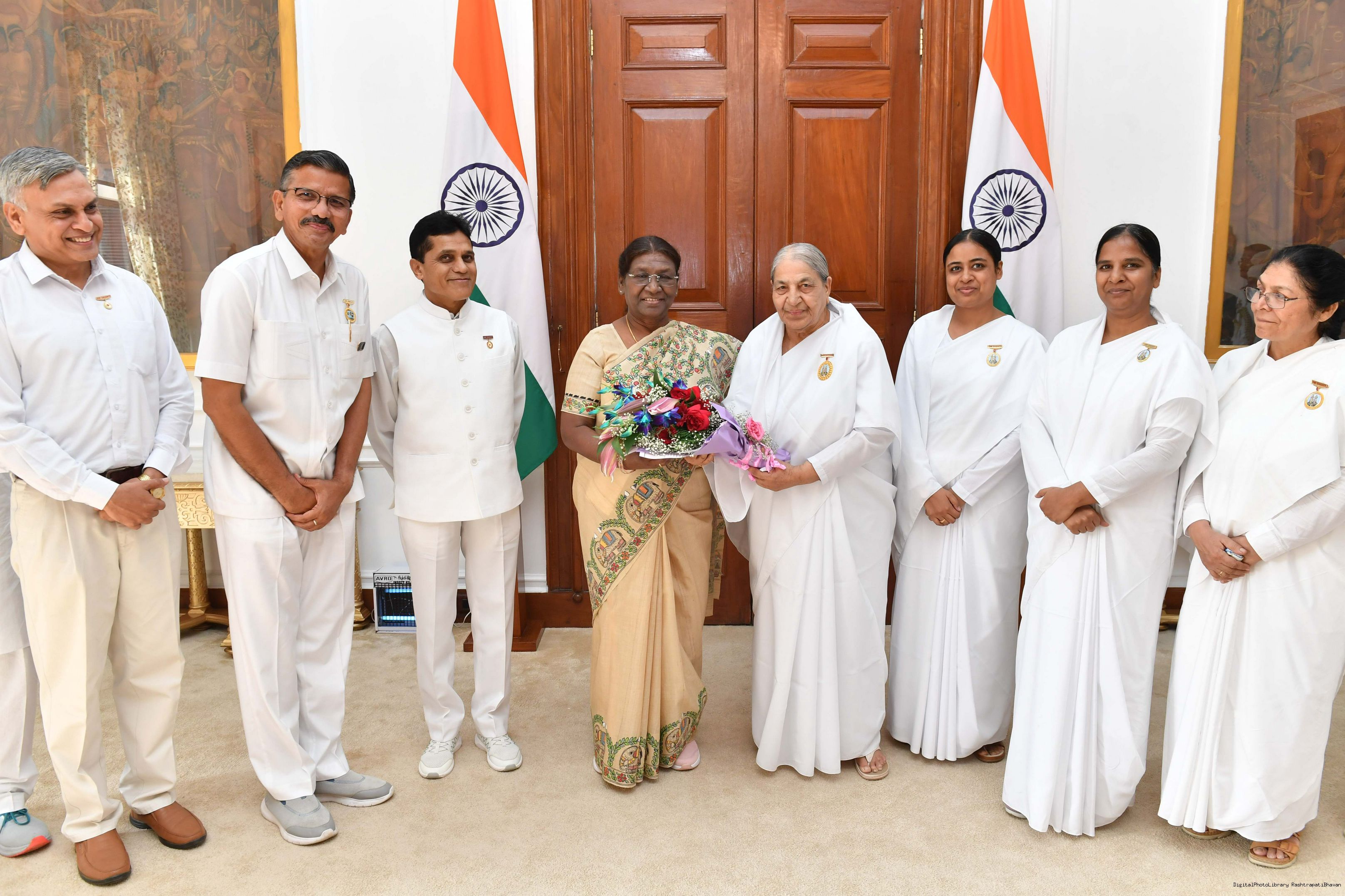 | Caption: | BK Shukla Didi along with others meeting with the President of India, Smt. Droupadi Murmu at Rashtrapati Bhavan on August 29, 2023. |