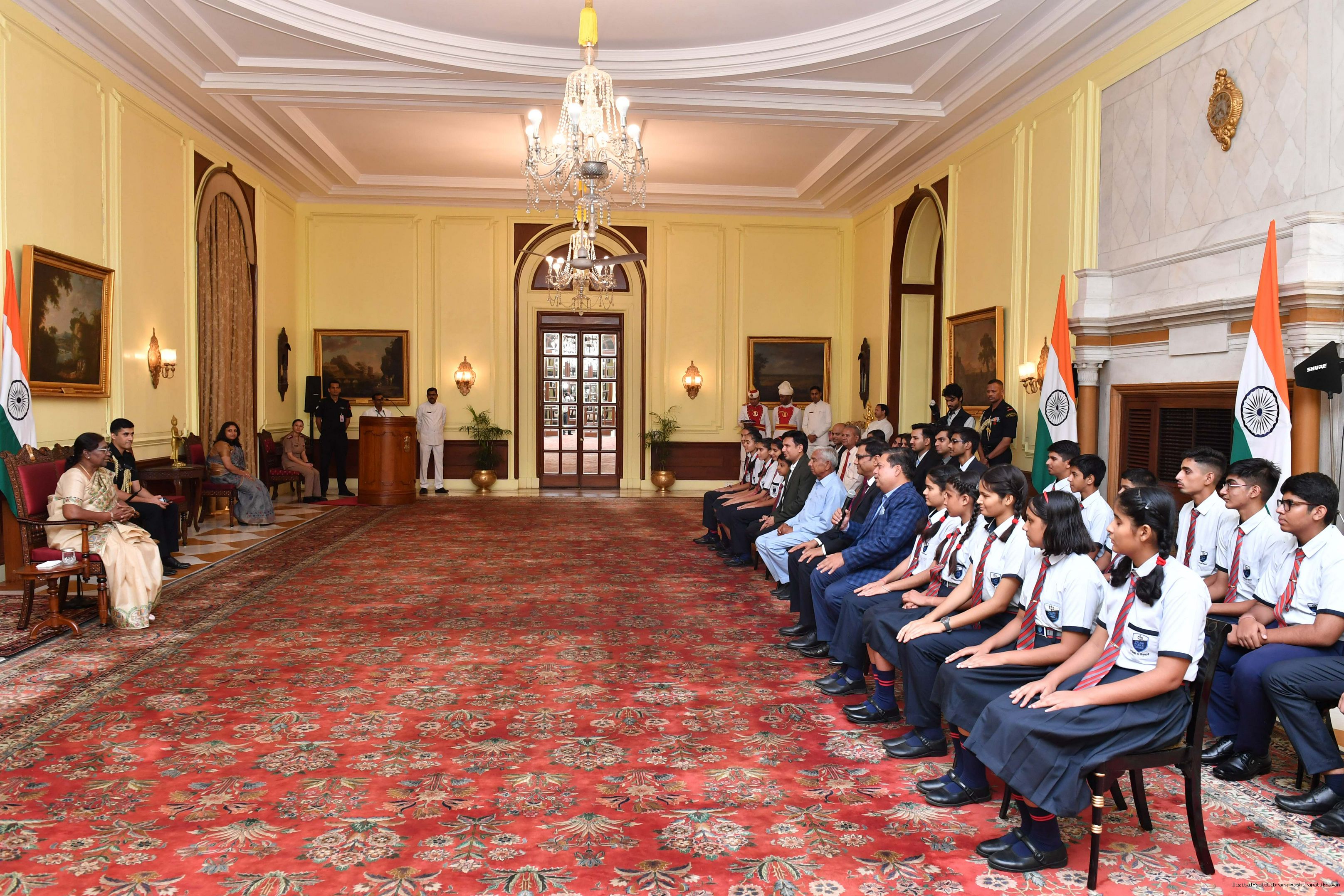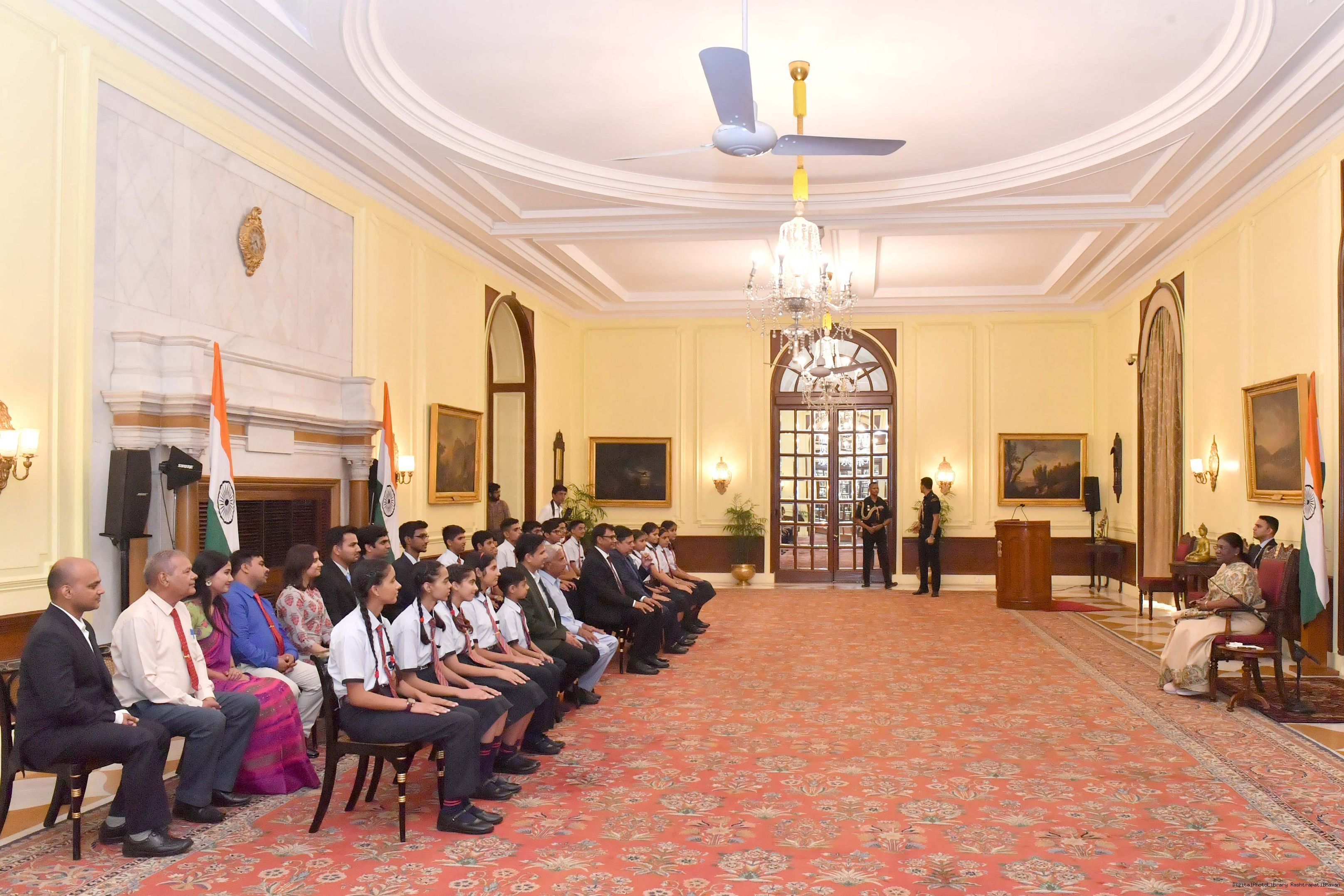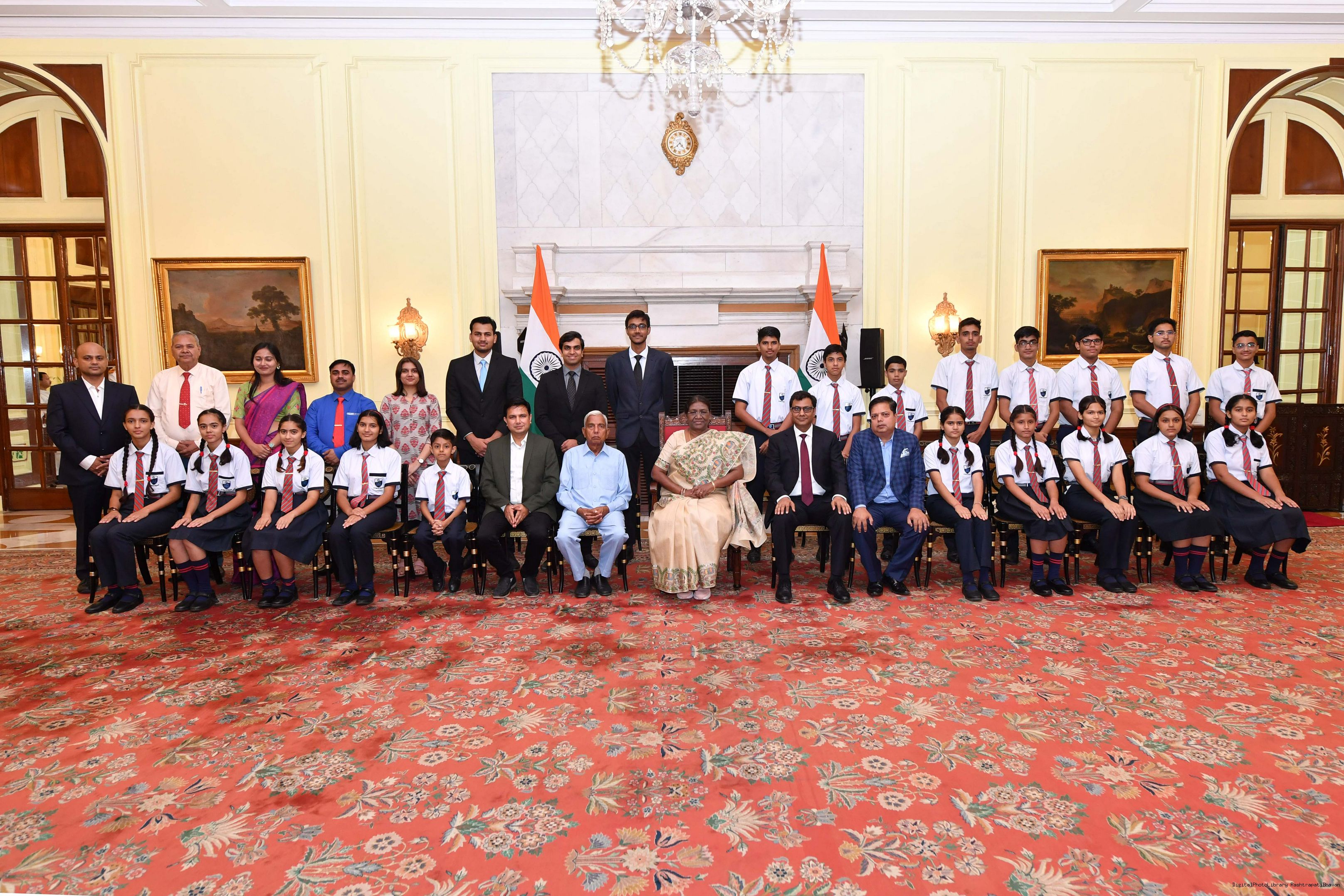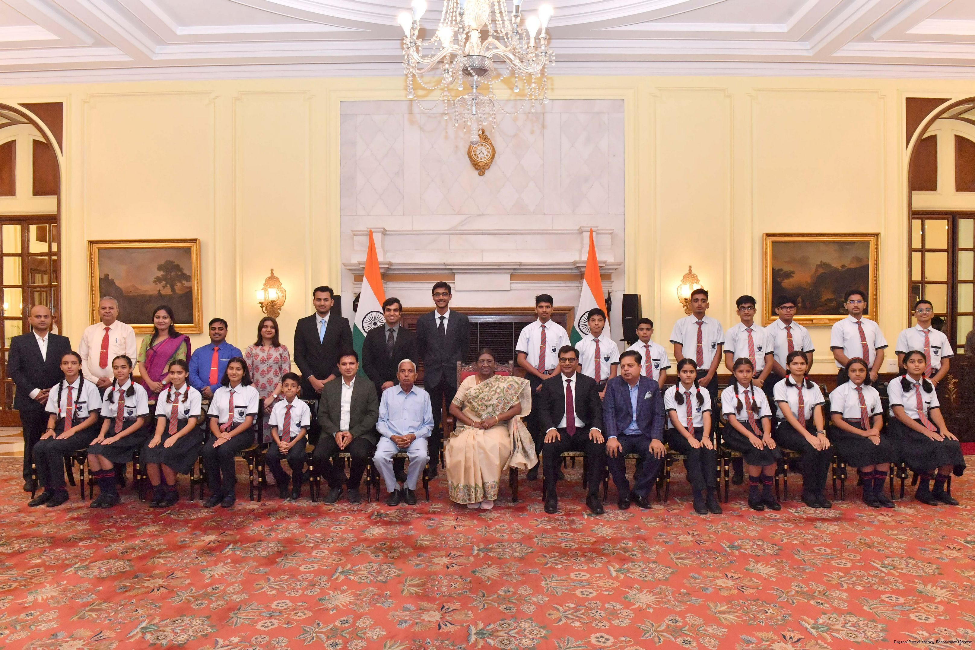 | Caption: | The President of India Smt. Droupadi Murmu posing a Group photograph with 20 students and 10 teachers and others at Rashtrapati Bhavan on August 29, 2023. |