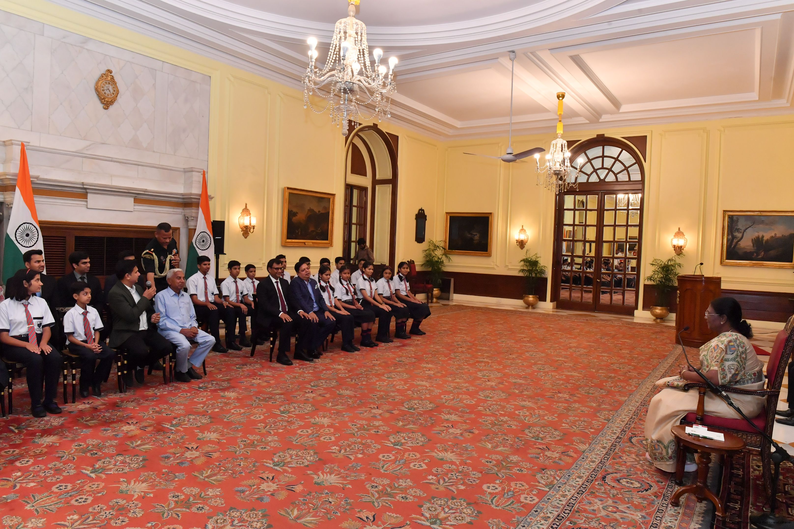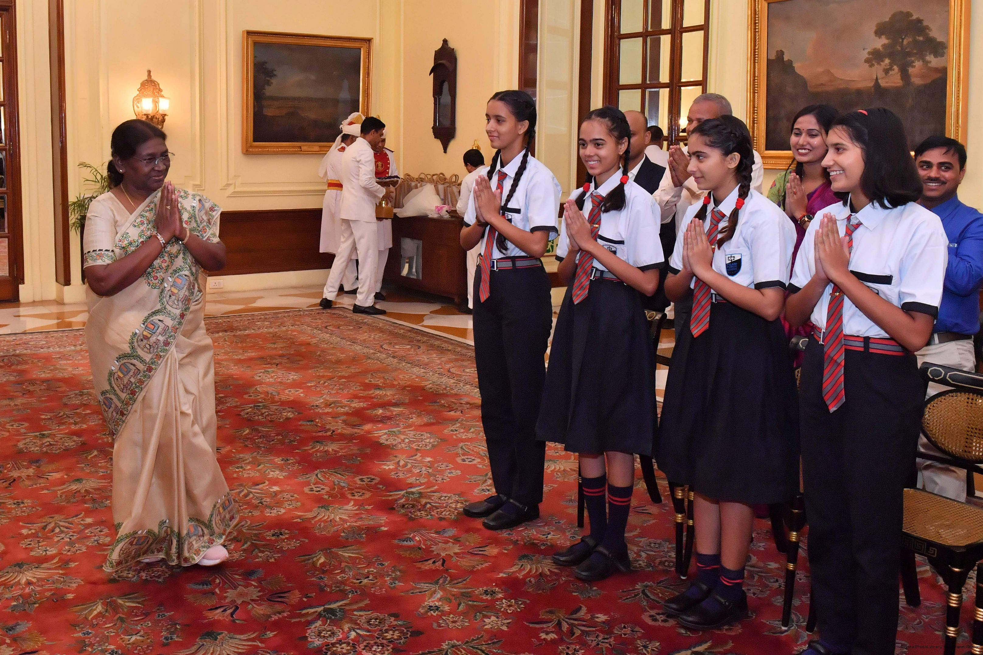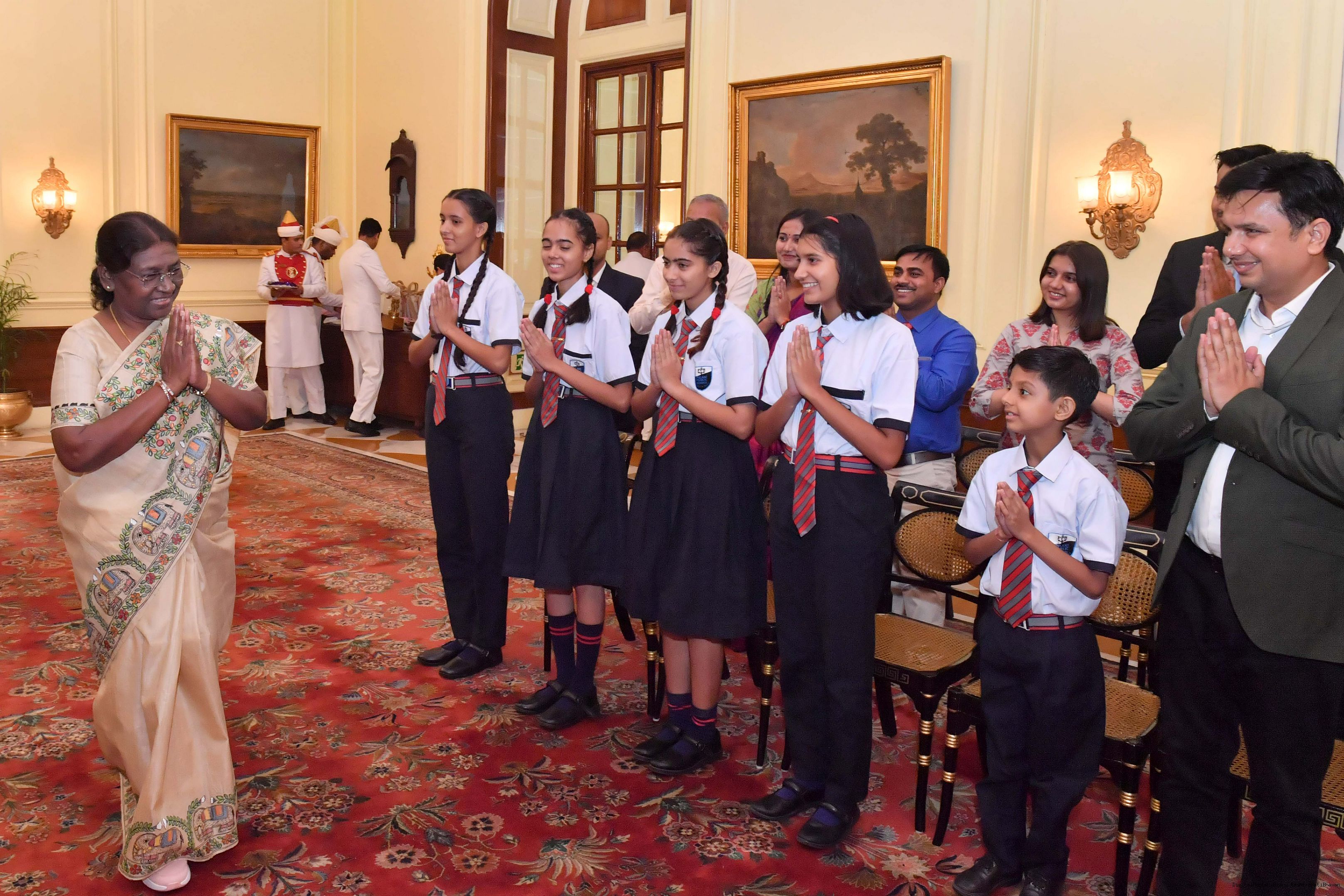 | Caption: | The President of India Smt. Droupadi Murmu posing a Group photograph with 20 students and 10 teachers and others at Rashtrapati Bhavan on August 29, 2023. |
