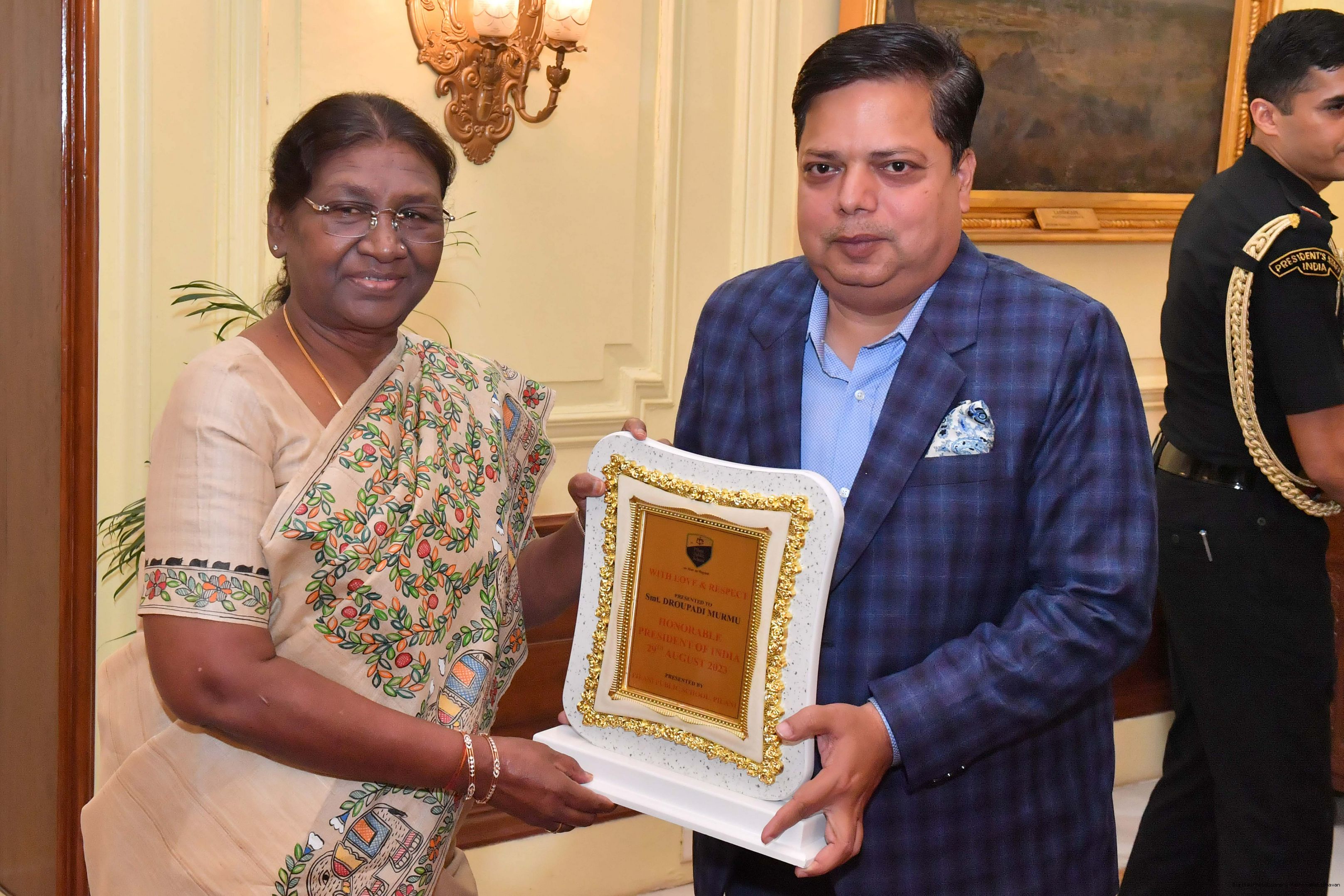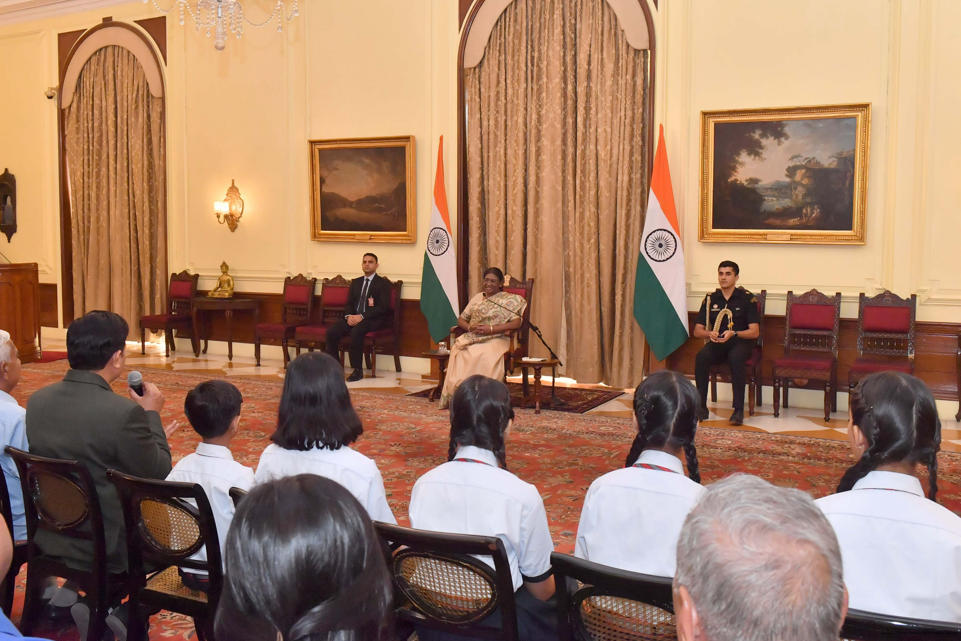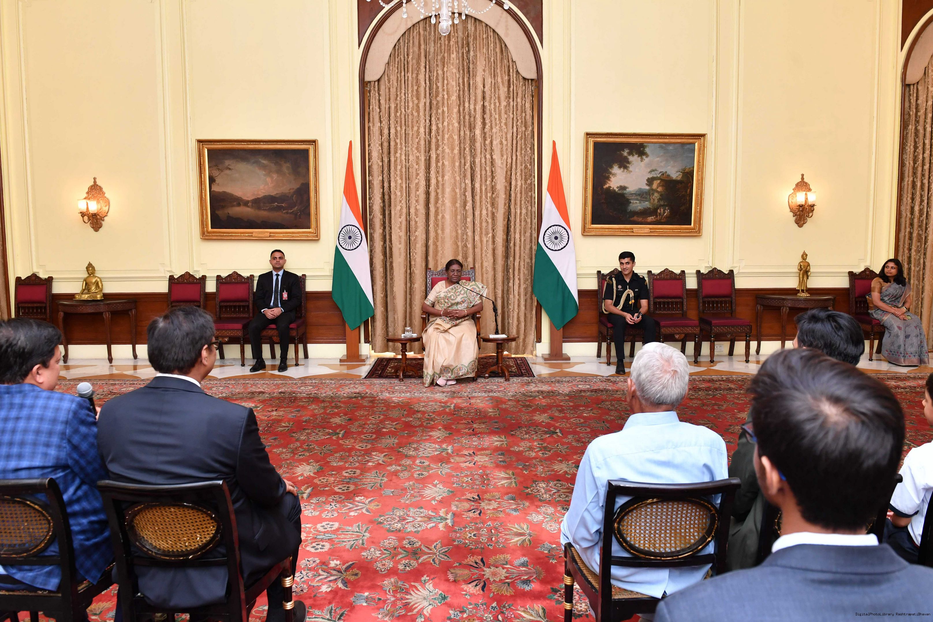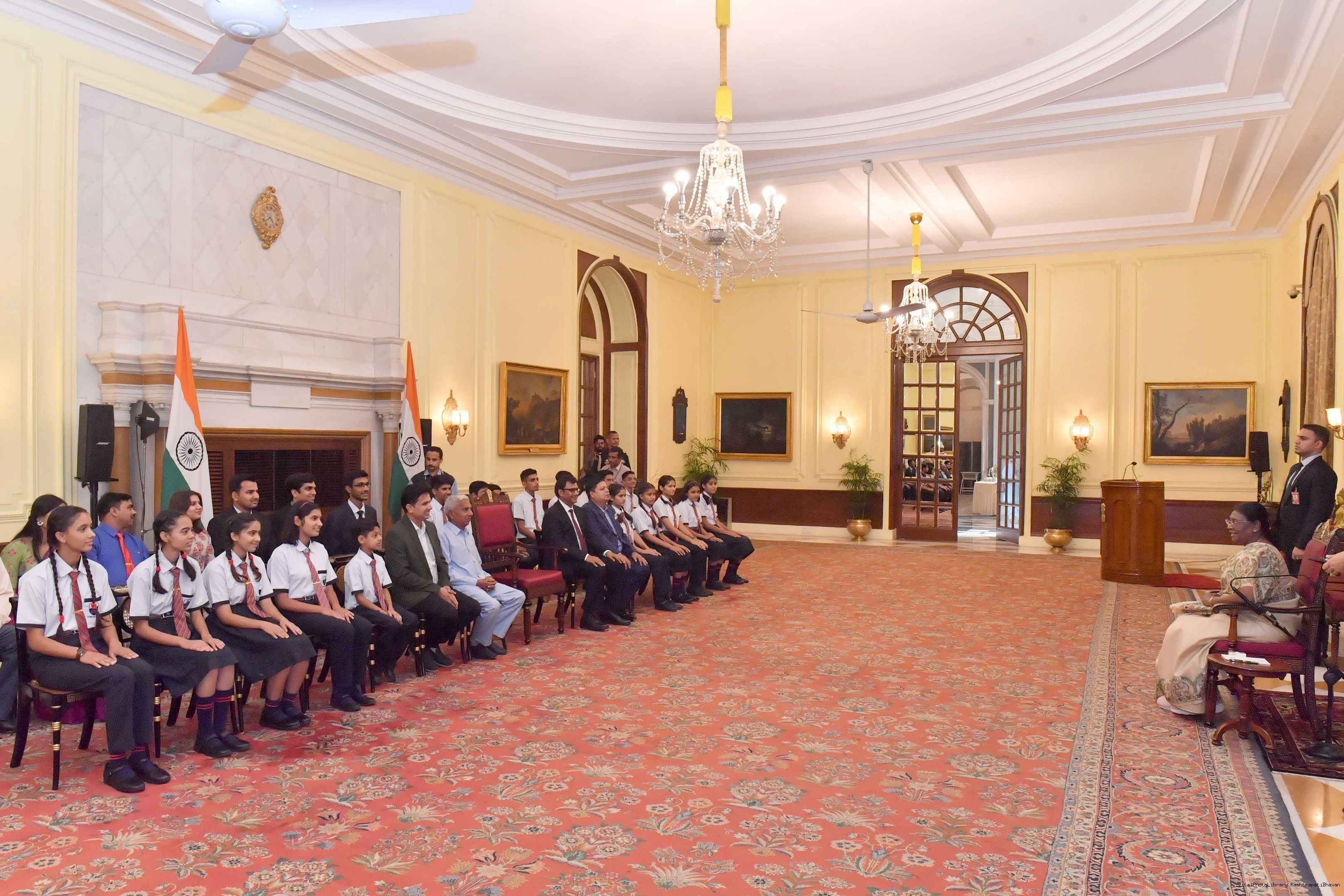 | Caption: | The President of India Smt. Droupadi Murmu posing a Group photograph with 20 students and 10 teachers and others at Rashtrapati Bhavan on August 29, 2023. |