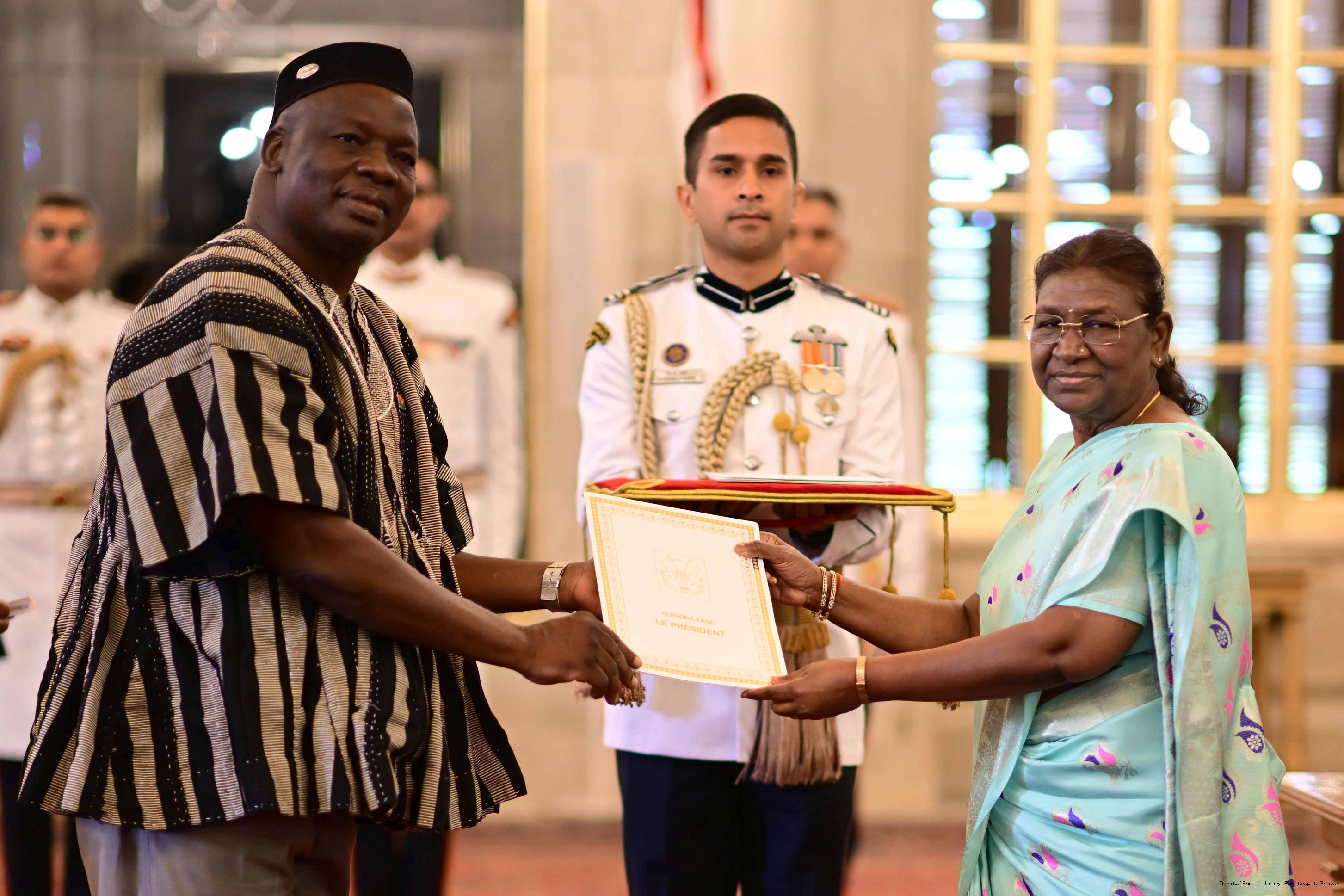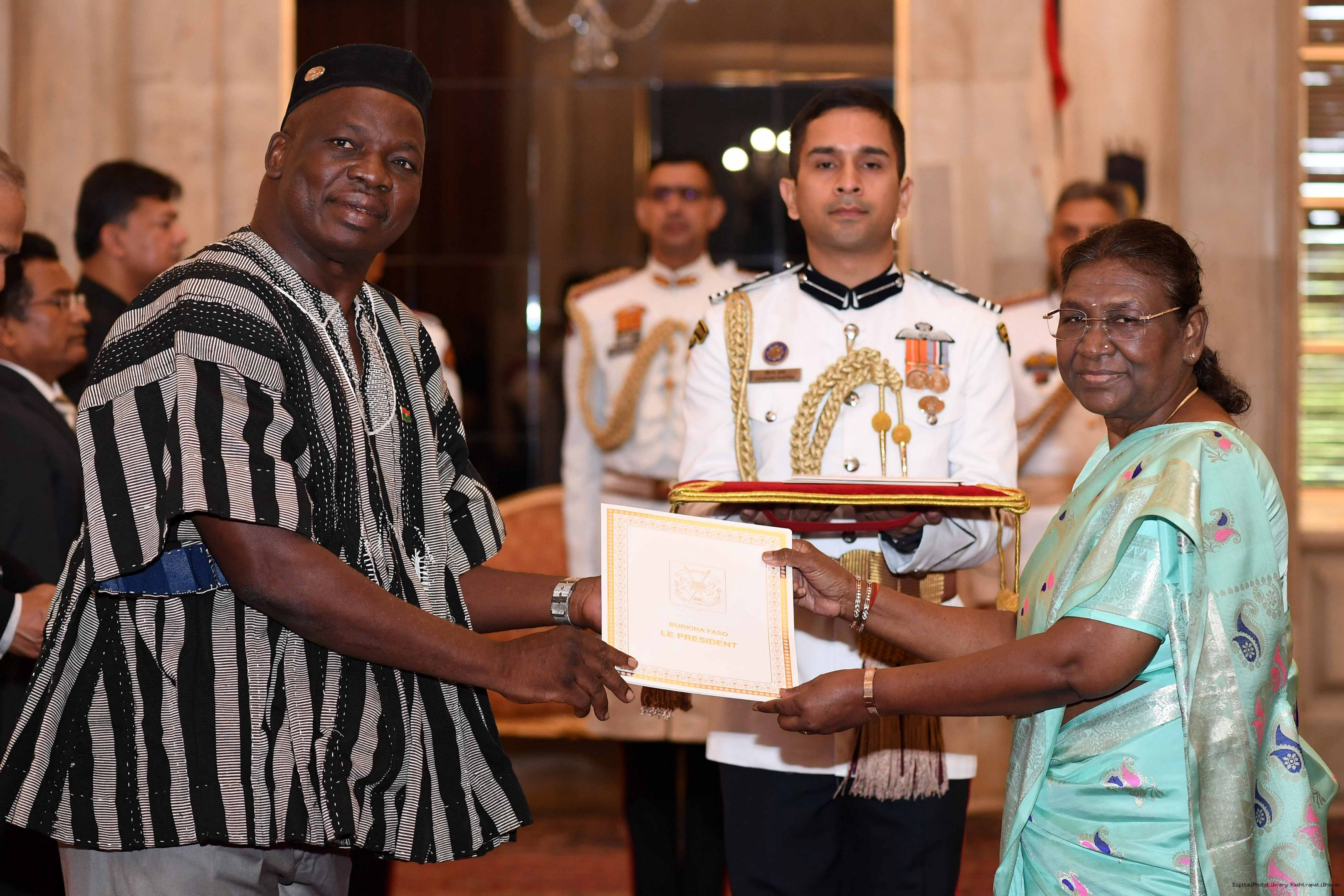 | Caption: | The Ambassador-designate of Burkina Faso, H.E. Dr Desire Boniface Some presenting his credentials to the President of India, Smt Droupadi Murmu at Rashtrapati Bhavan on August 29, 2023. |
