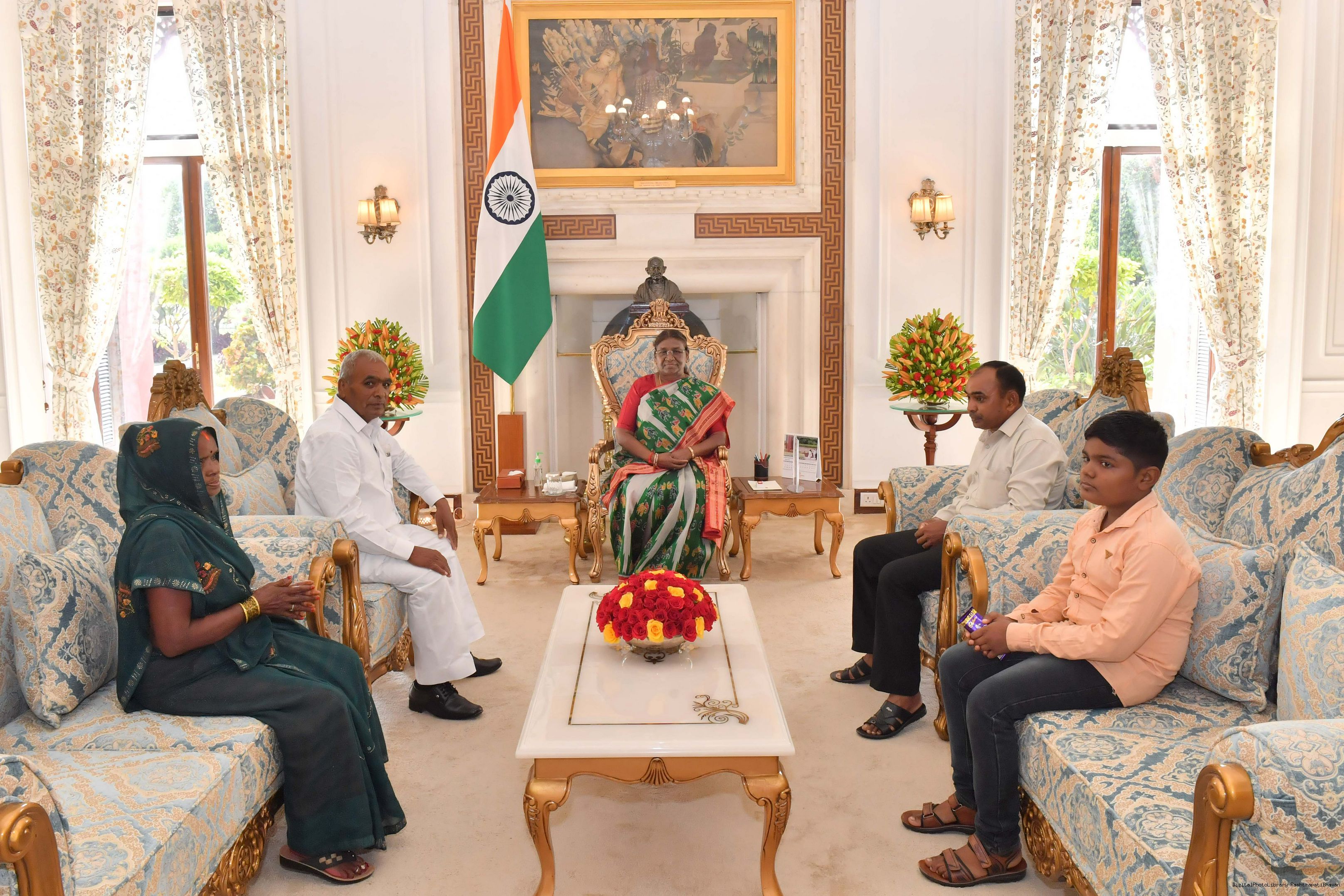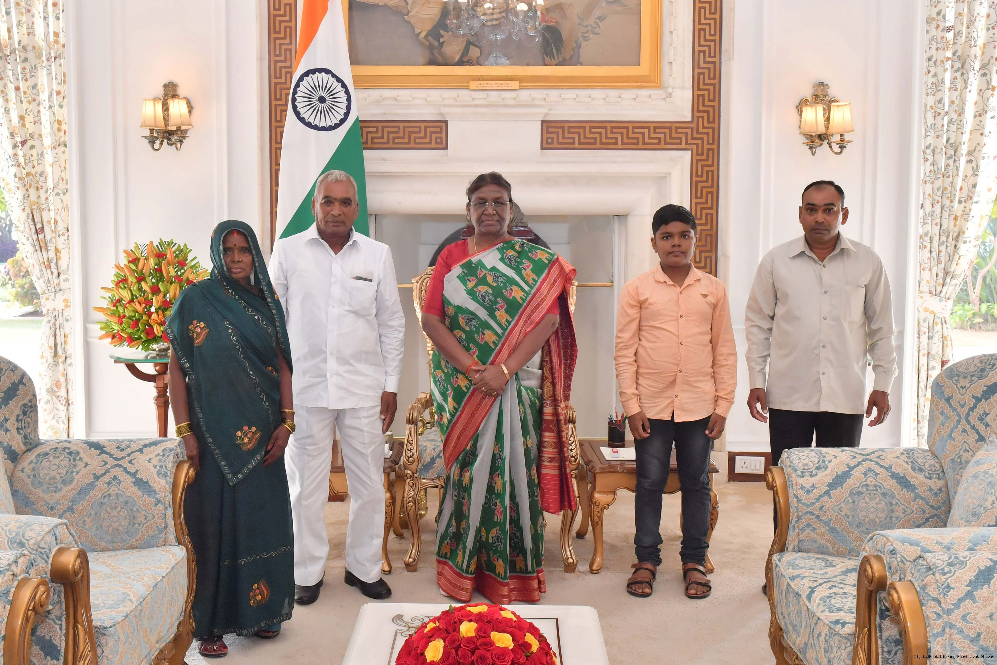 | Caption: | Shri Ram Naval, Senior Mali along with others meeting with the President of India, Smt. Droupadi Murmu at Rashtrapati Bhavan on August 30, 2023. |