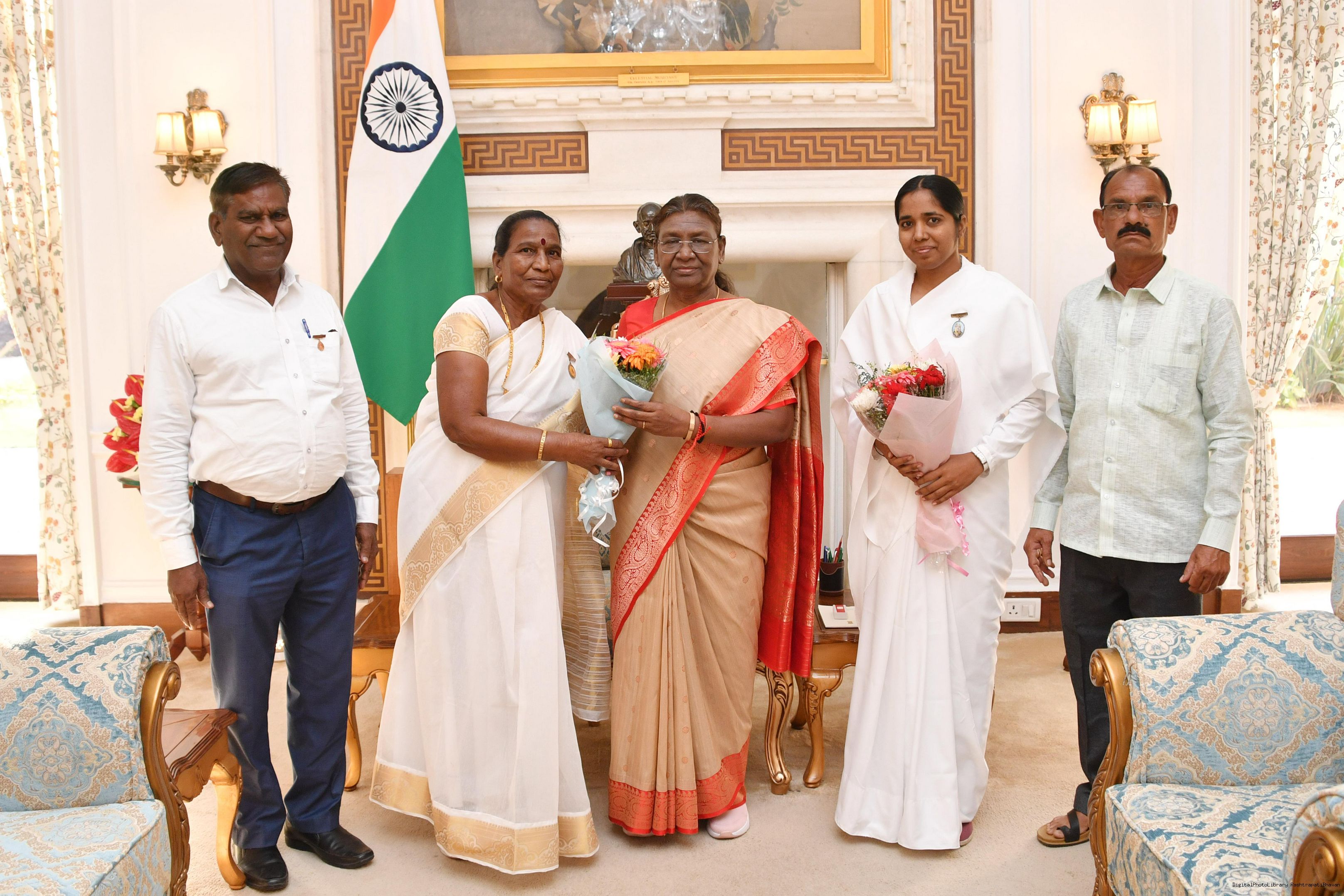 | Caption: | Smt. Bharti Dagdu Thorpe (Tongle) from Solapur District along with others meeting with the President of India, Smt. Droupadi Murmu at Rashtrapati Bhavan on October 25, 2023 |