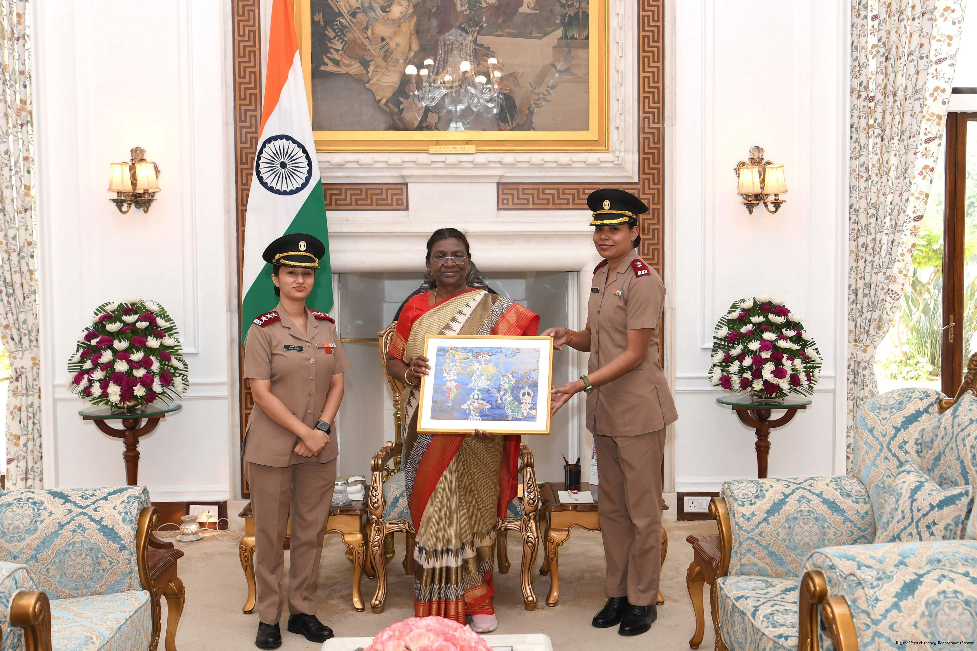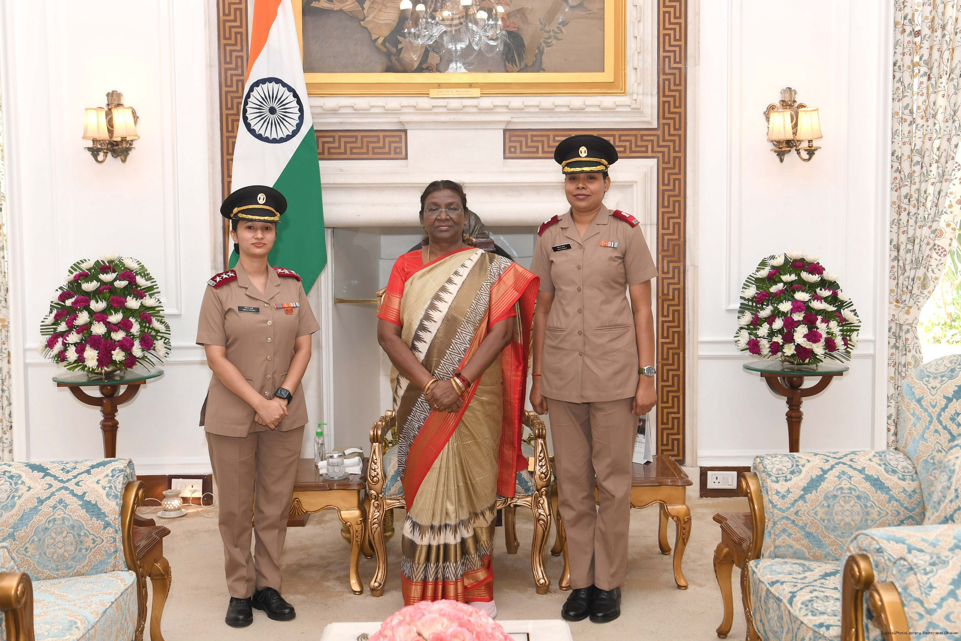 | Caption: | Maj Lipika Kumari and Capt Minal Sharma both from Base Hospital Delhi Cantt meeting with the President of India Smt. Droupadi Murmu, at Rashtrapati Bhawan on October 30, 2023. |