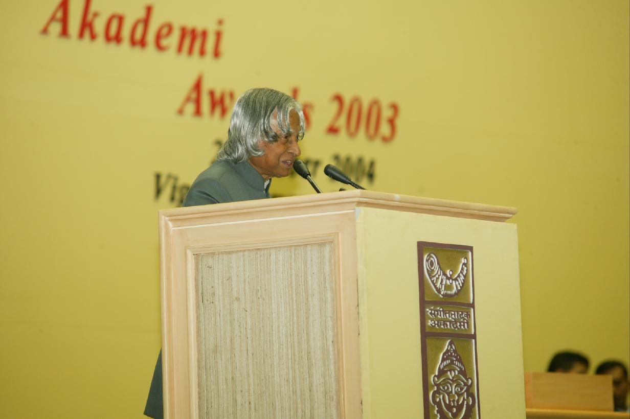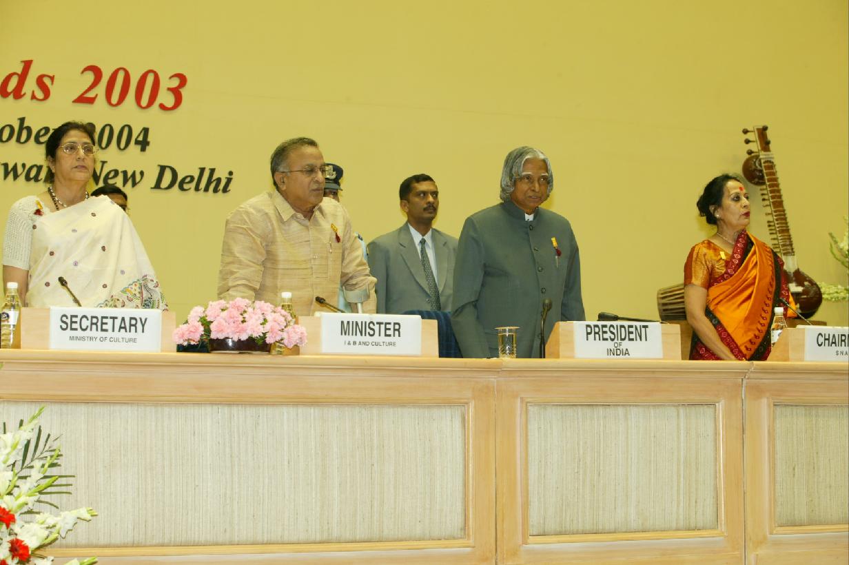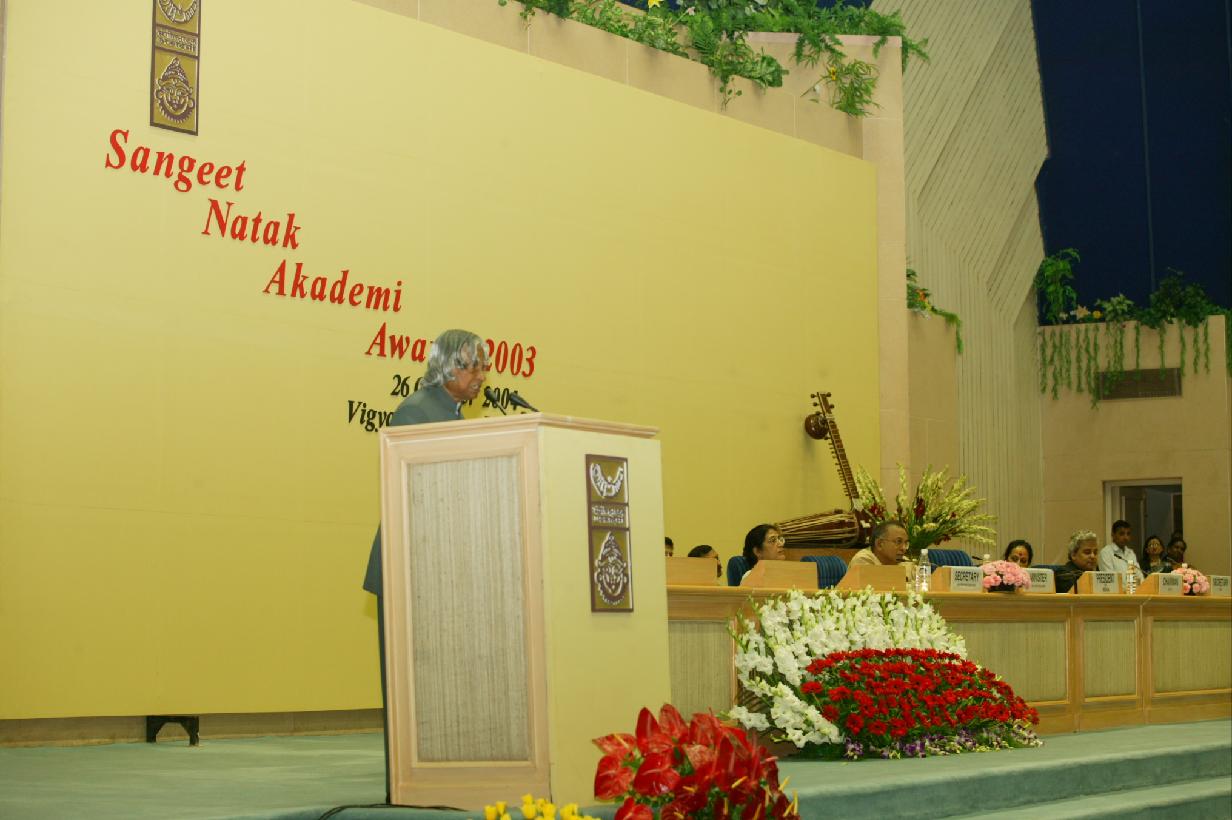 | Caption: | The President of India, Dr A P J Abdul Kalam conferring the Sangeet Natat Akademi Awards 2003 at Vigyan Bhavan in New Delhi on Oct 26, 2004 |