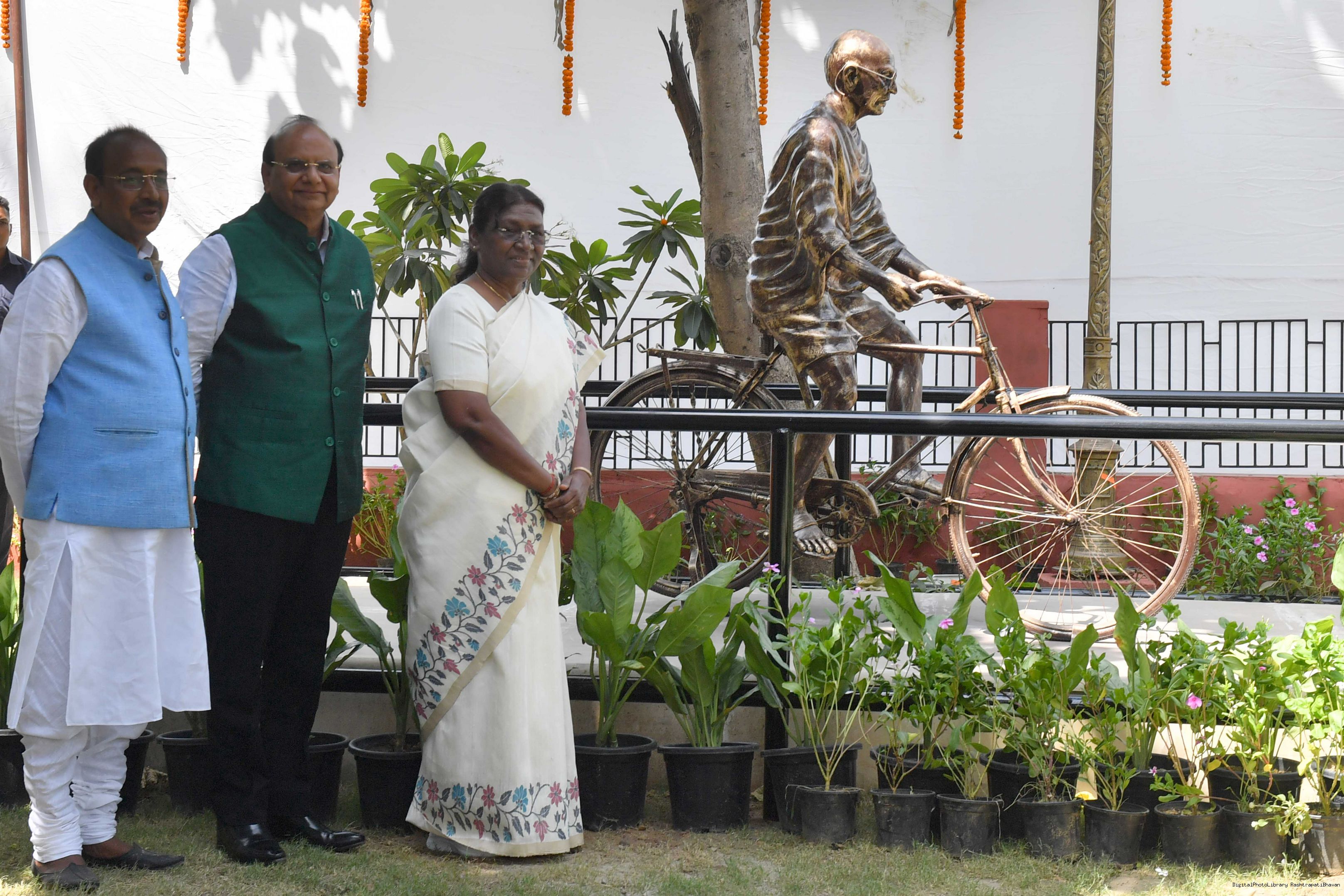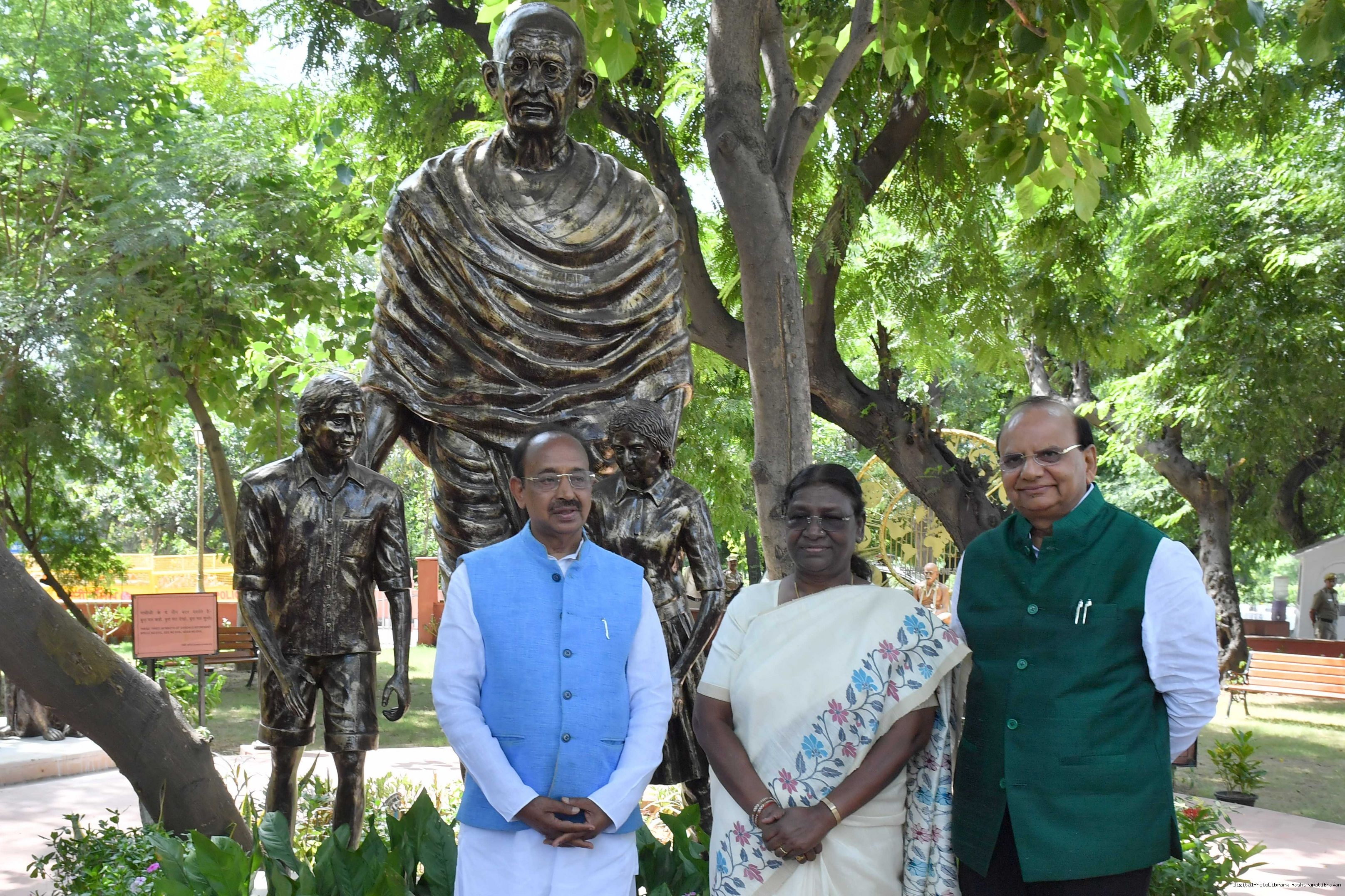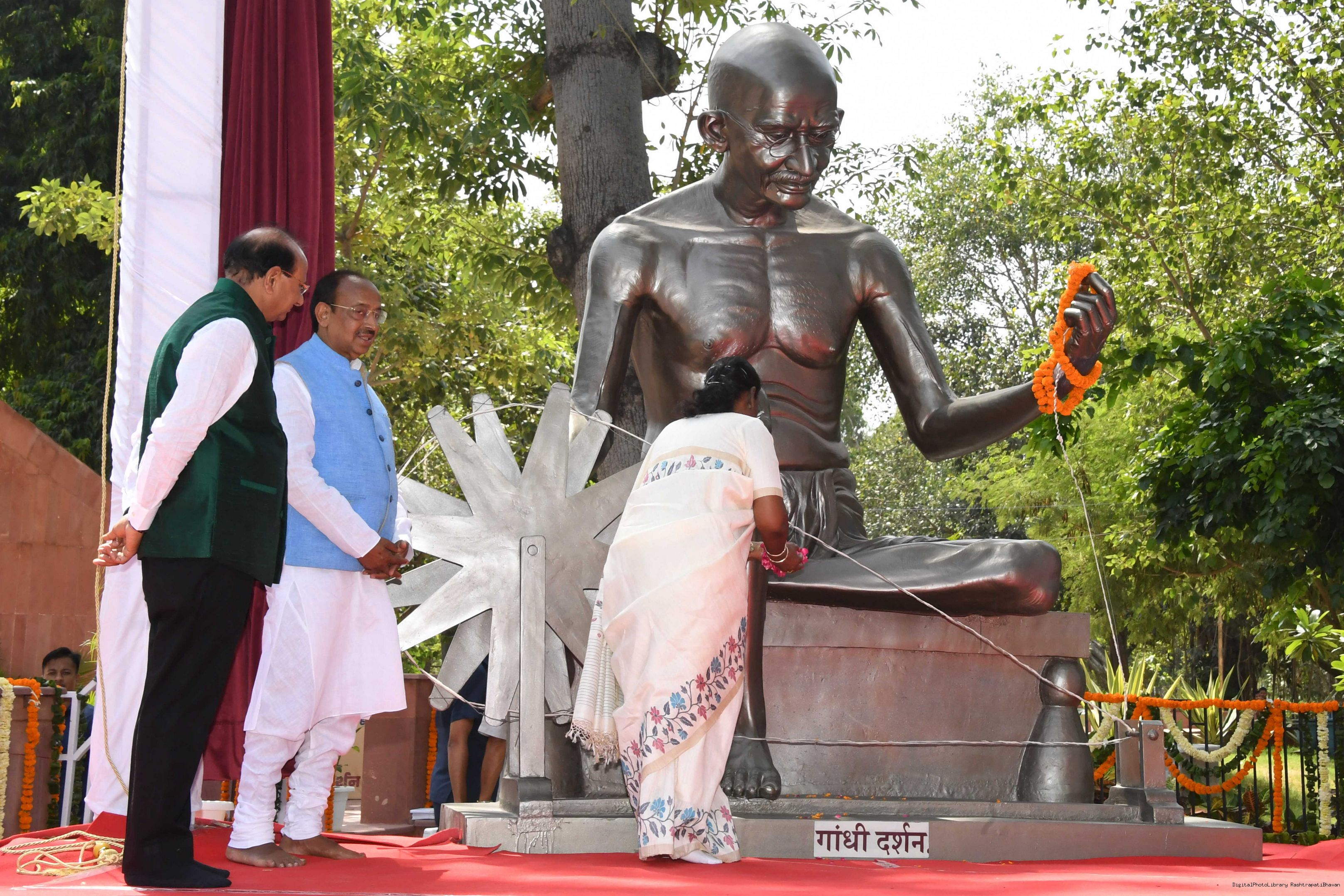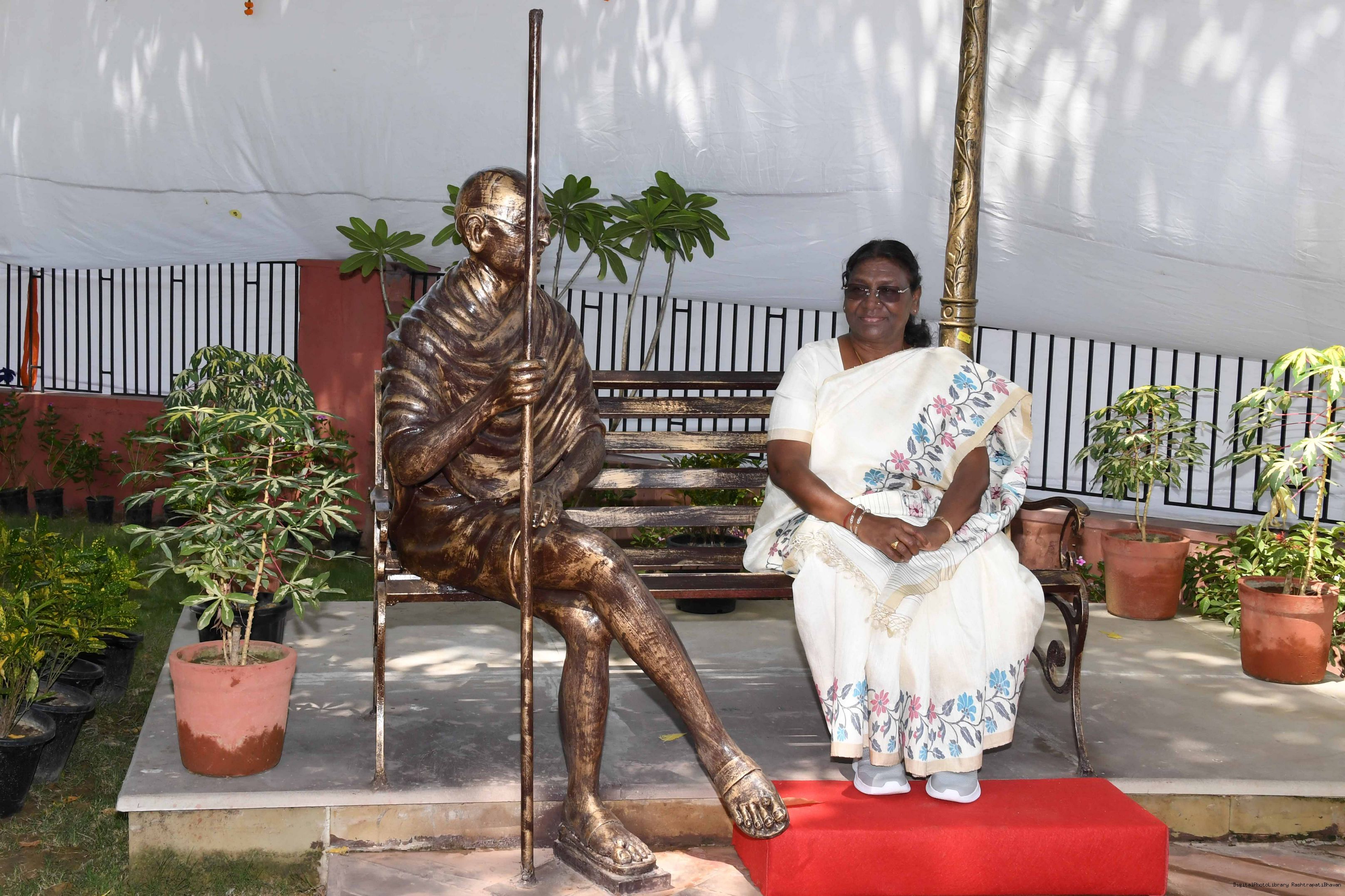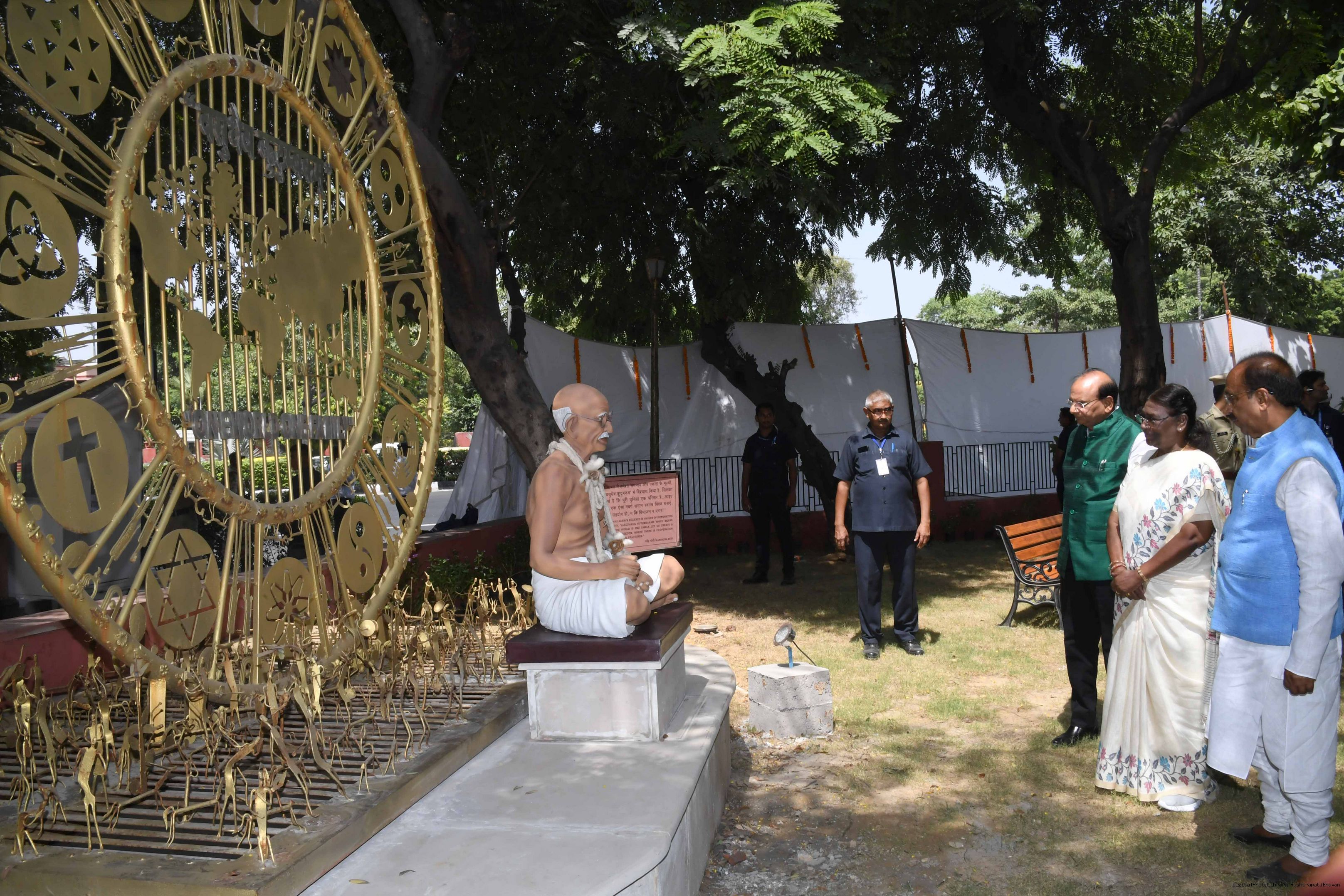 | Caption: | The President of India, Smt Droupadi Murmu unveiled the 12 feet high statue of Mahatma Gandhi and inaugurated ‘Gandhi Vatika’ at Gandhi Darshan, New Delhi on September 4, 2023. |