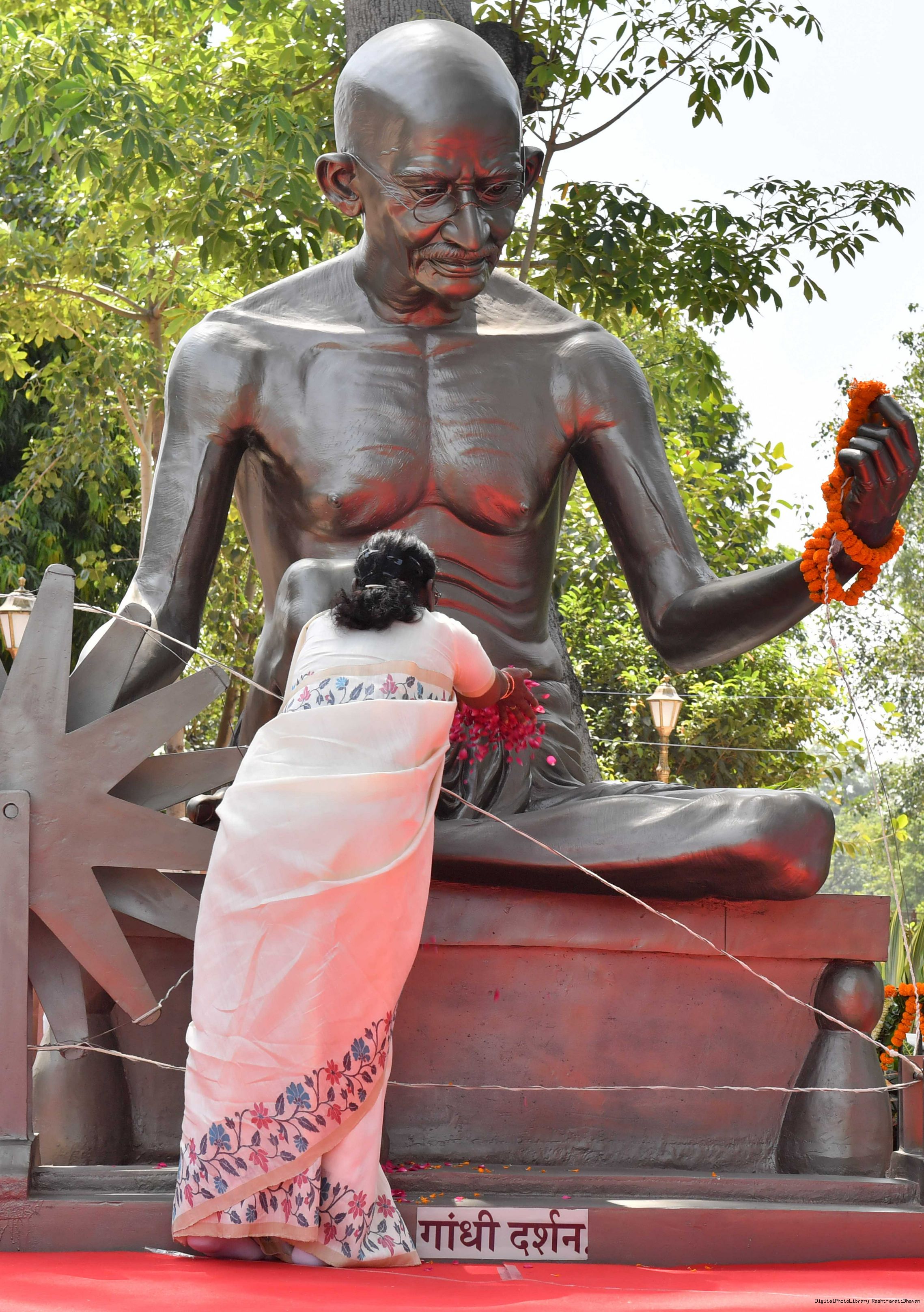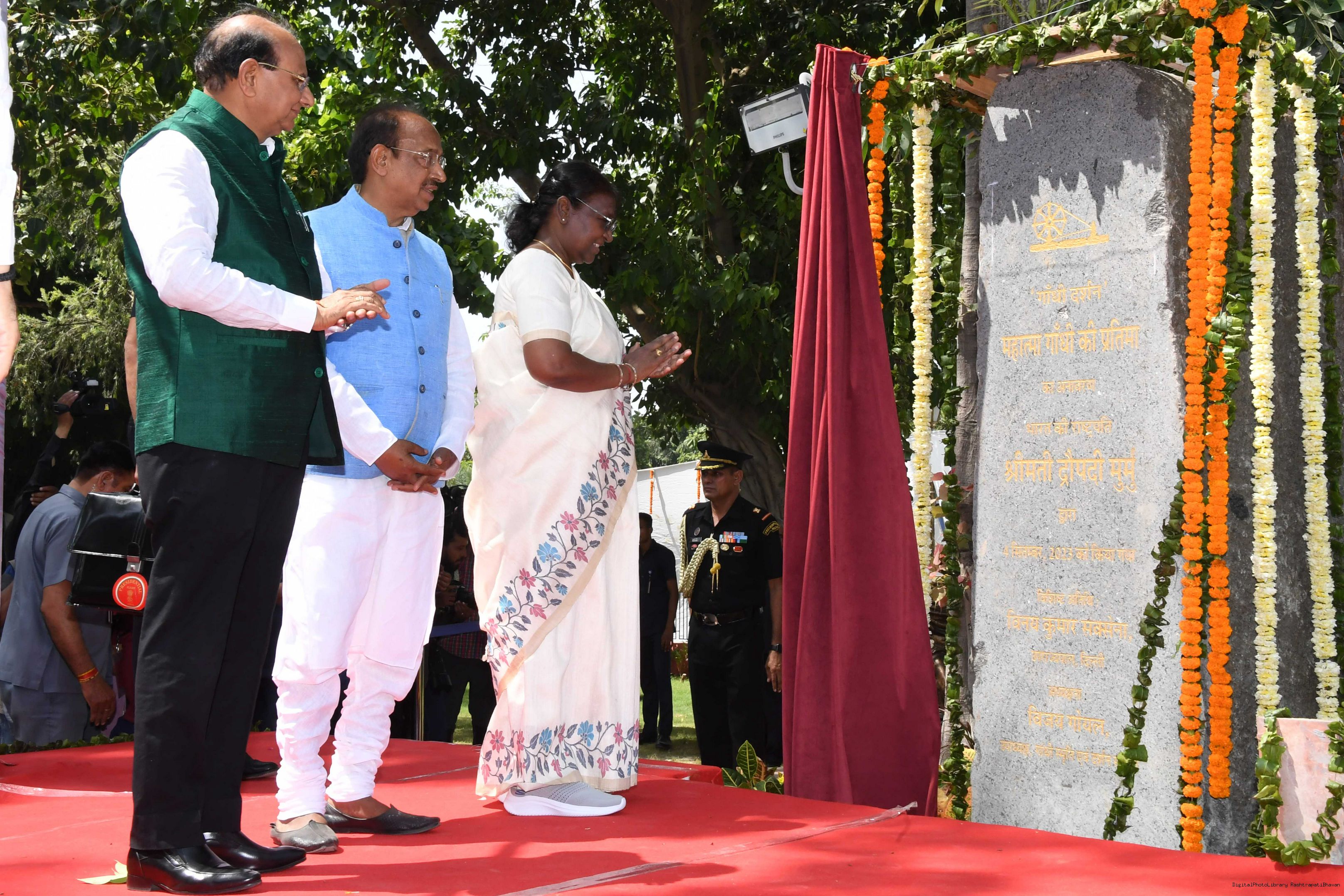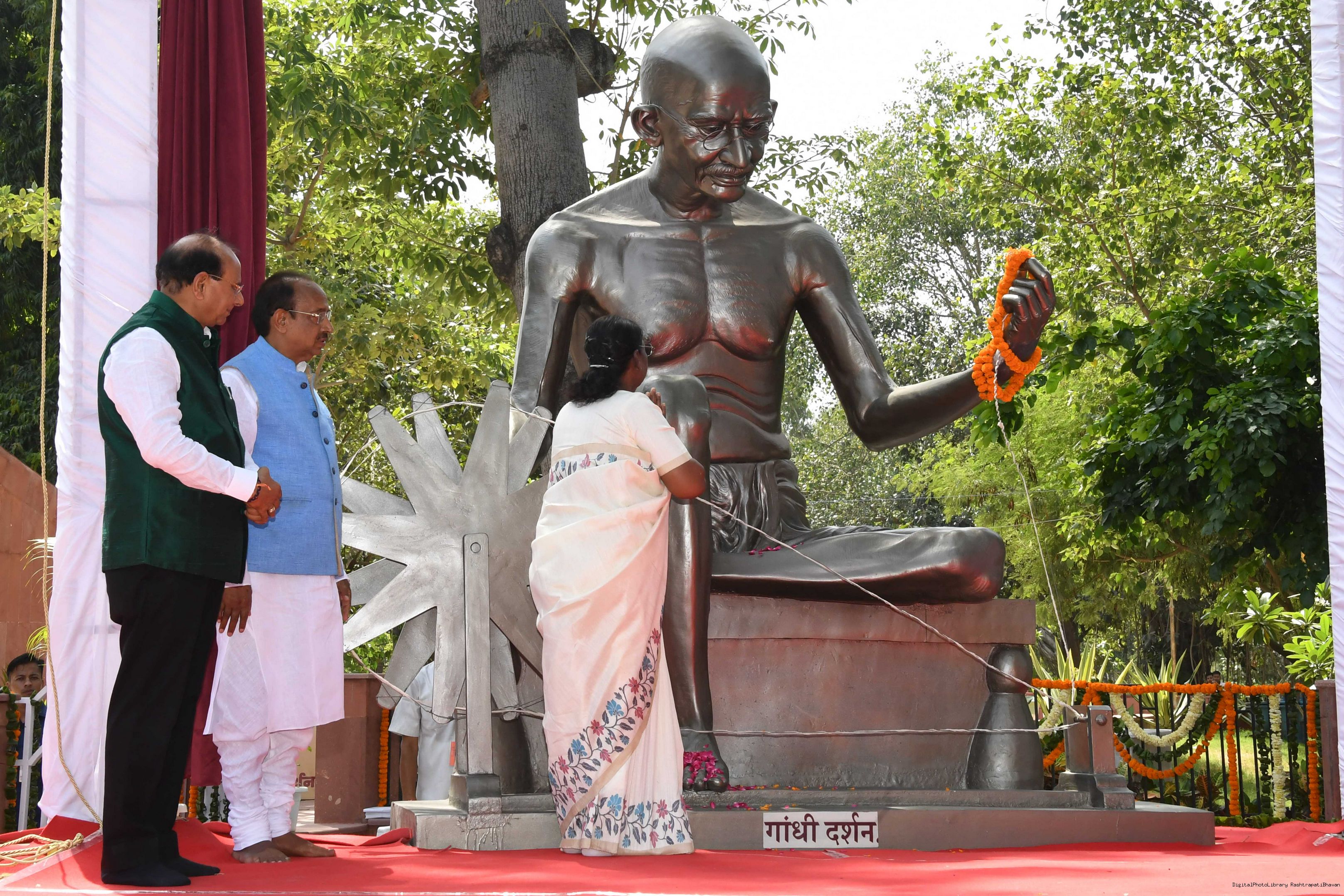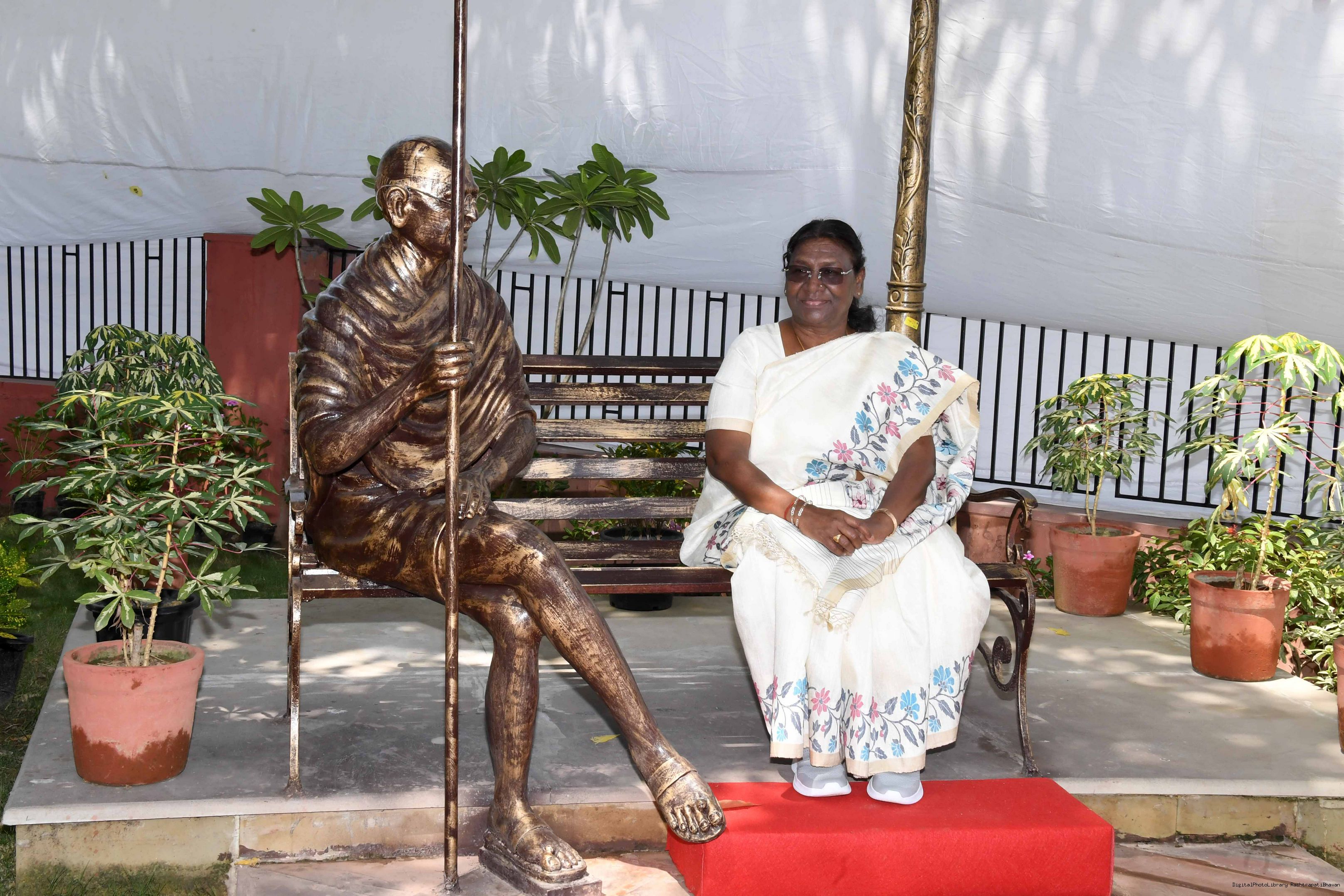 | Caption: | The President of India, Smt Droupadi Murmu unveiled the 12 feet high statue of Mahatma Gandhi and inaugurated ‘Gandhi Vatika’ at Gandhi Darshan, New Delhi on September 4, 2023. |