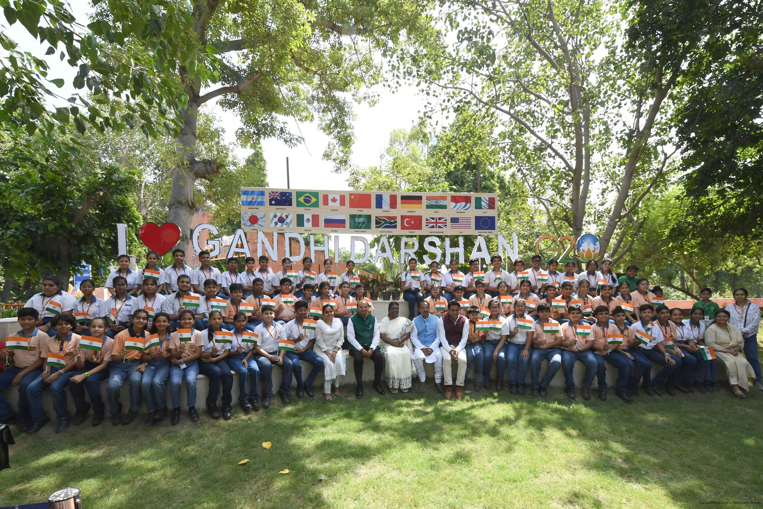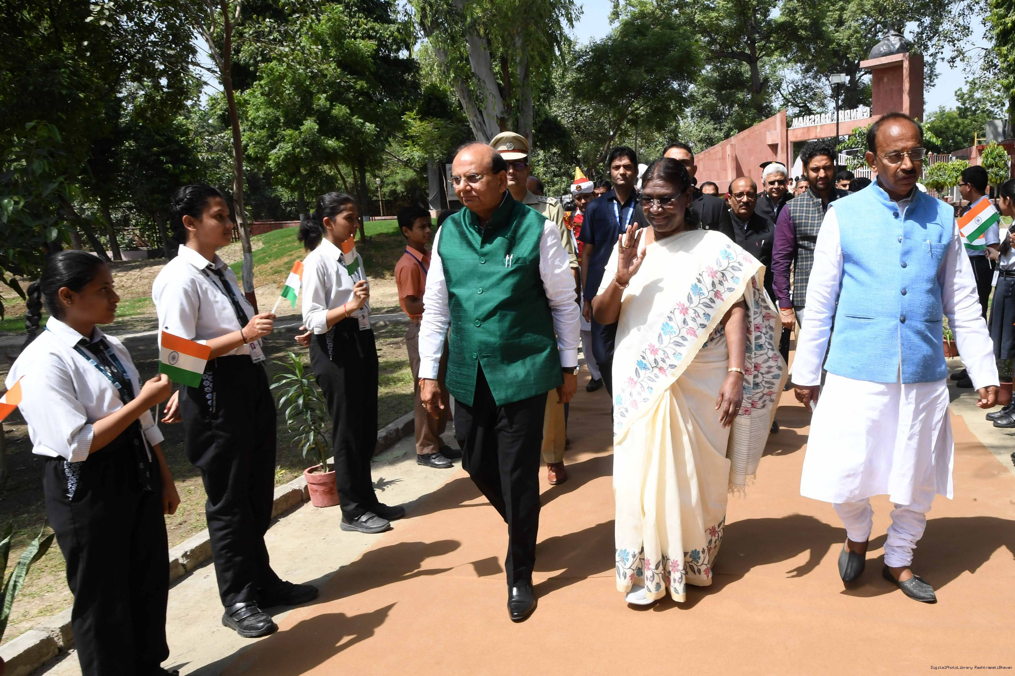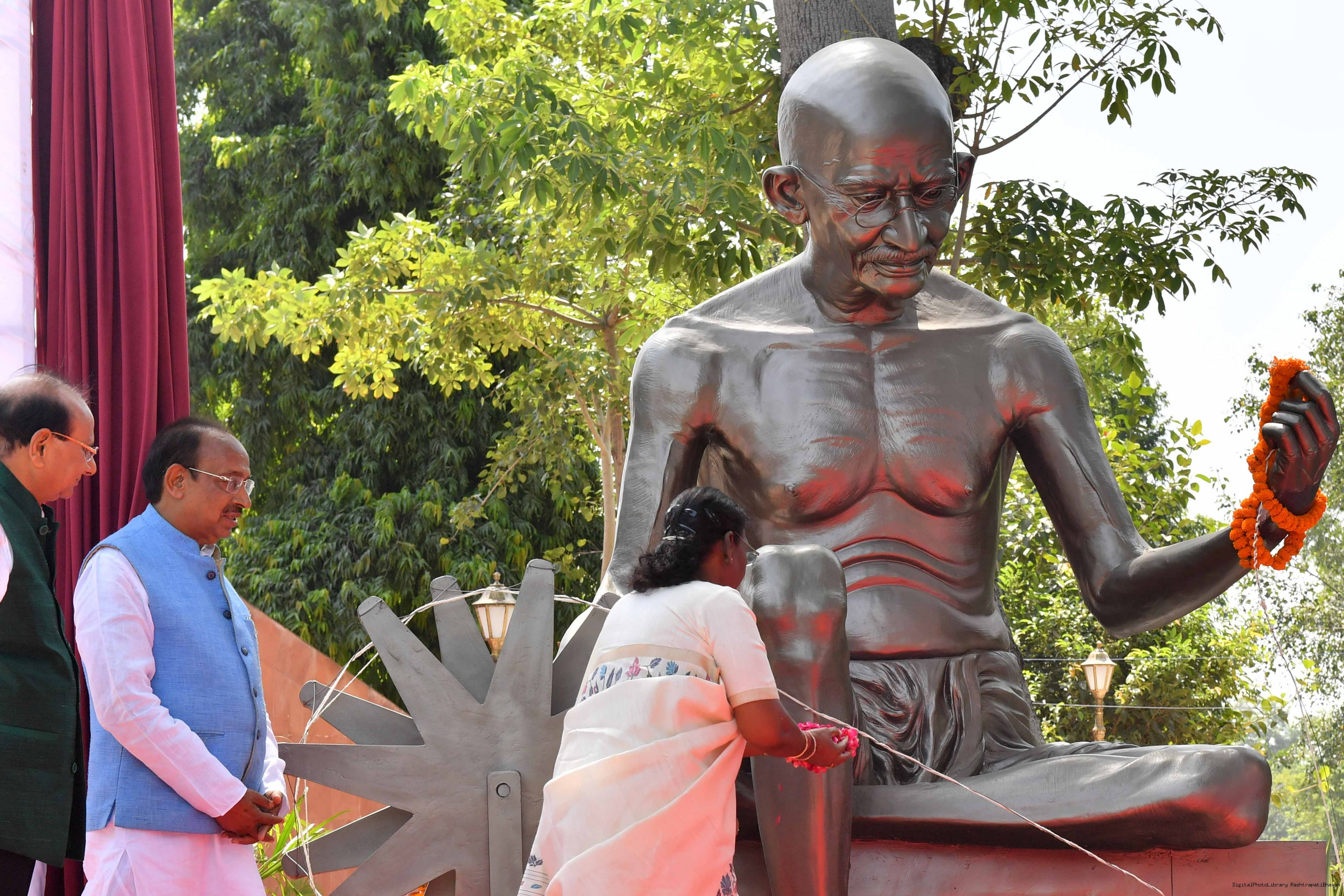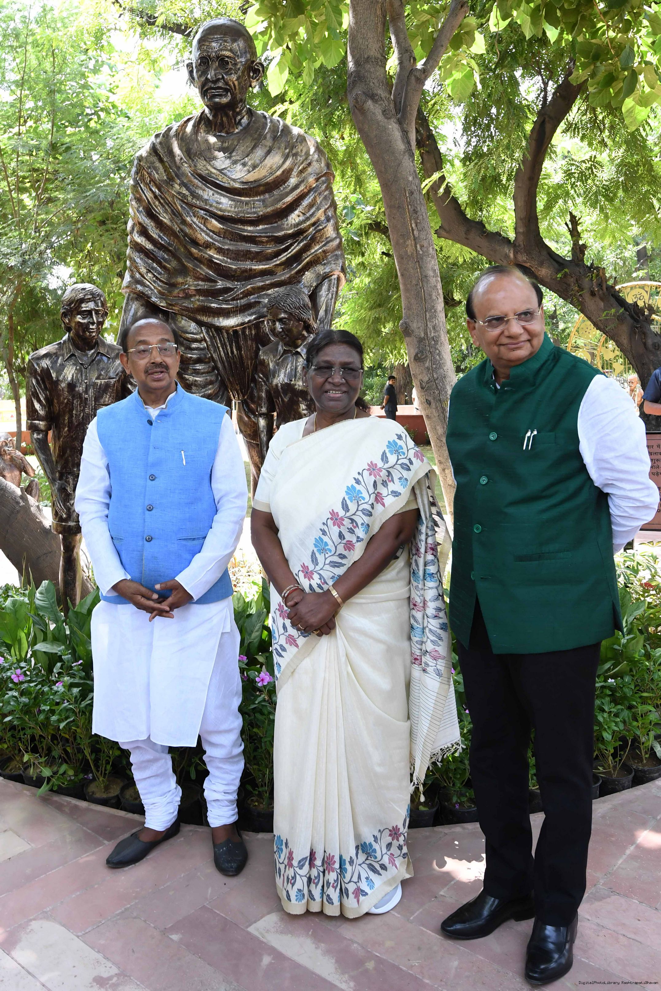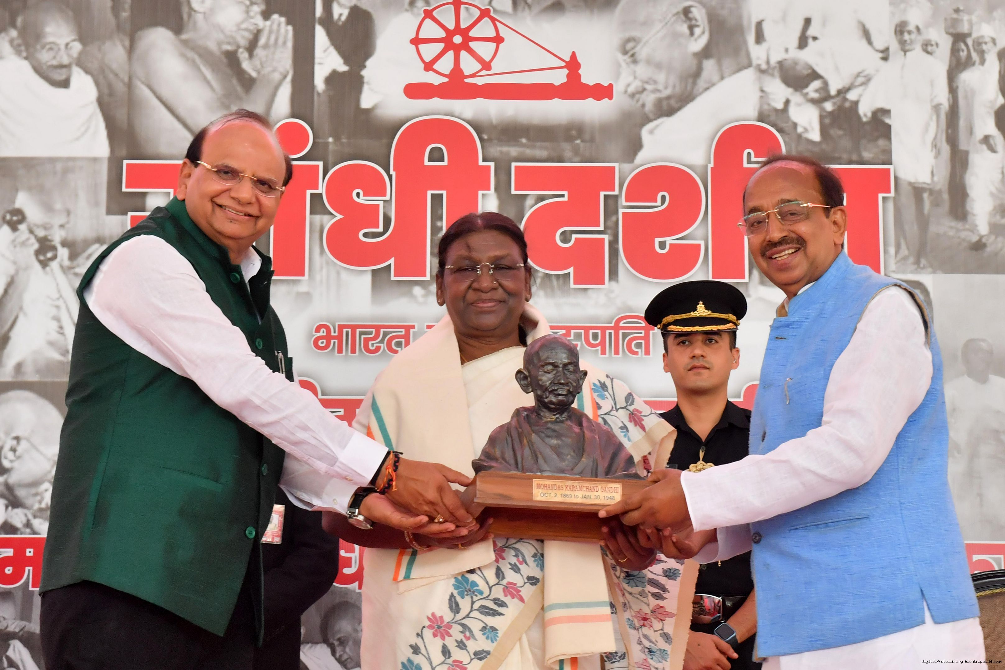 | Caption: | The President of India, Smt Droupadi Murmu unveiled the 12 feet high statue of Mahatma Gandhi and inaugurated ‘Gandhi Vatika’ at Gandhi Darshan, New Delhi on September 4, 2023. |