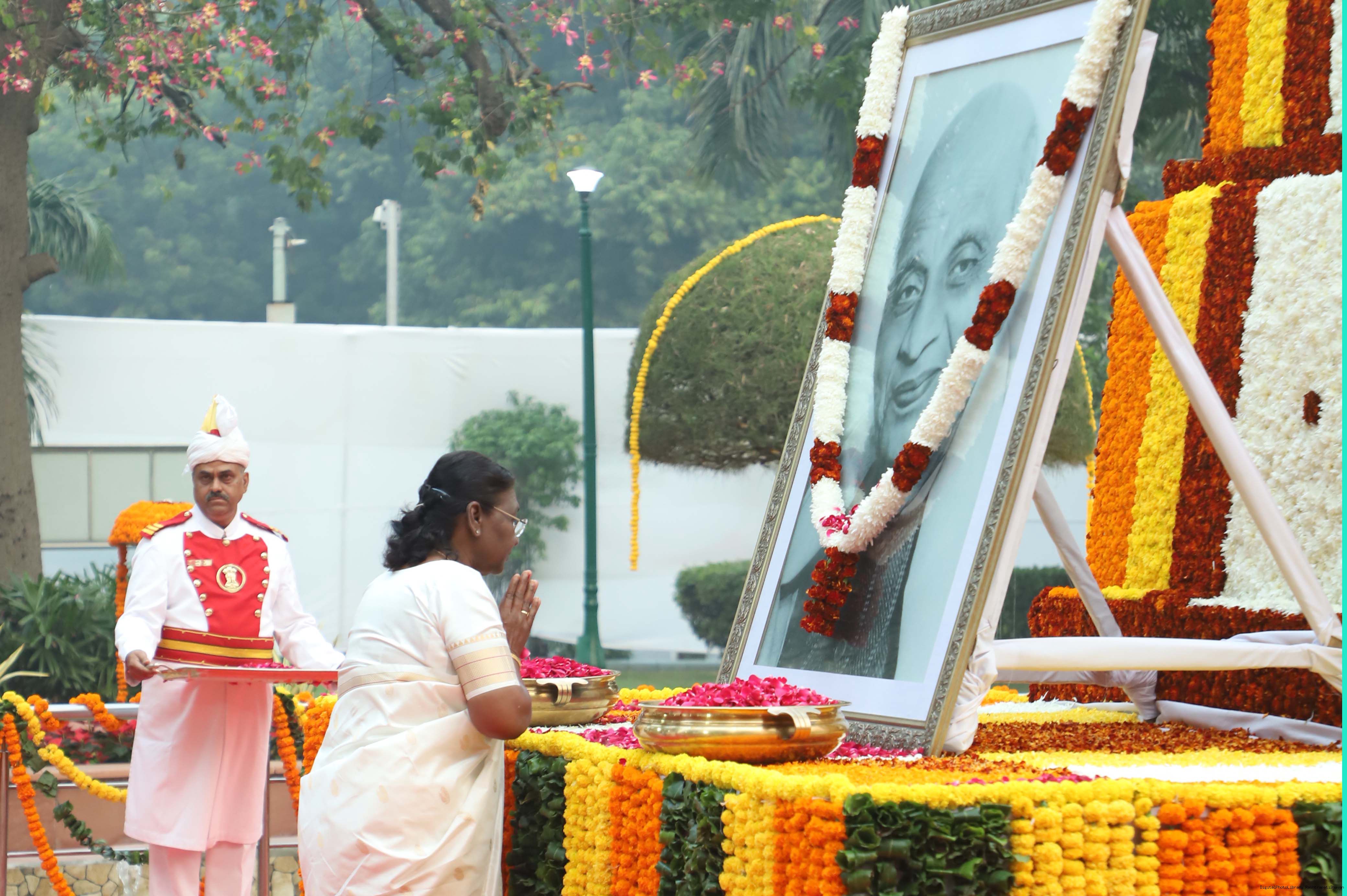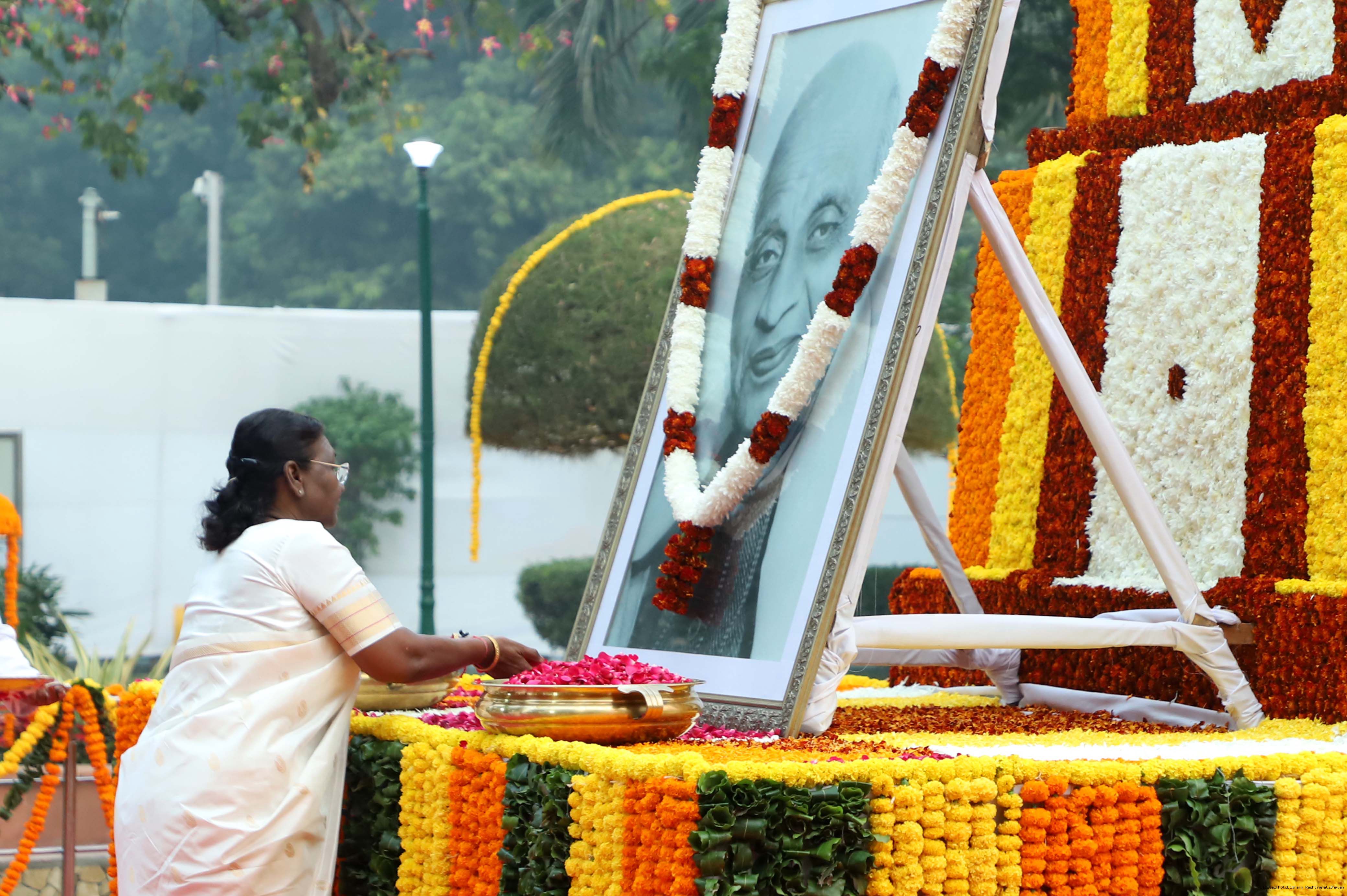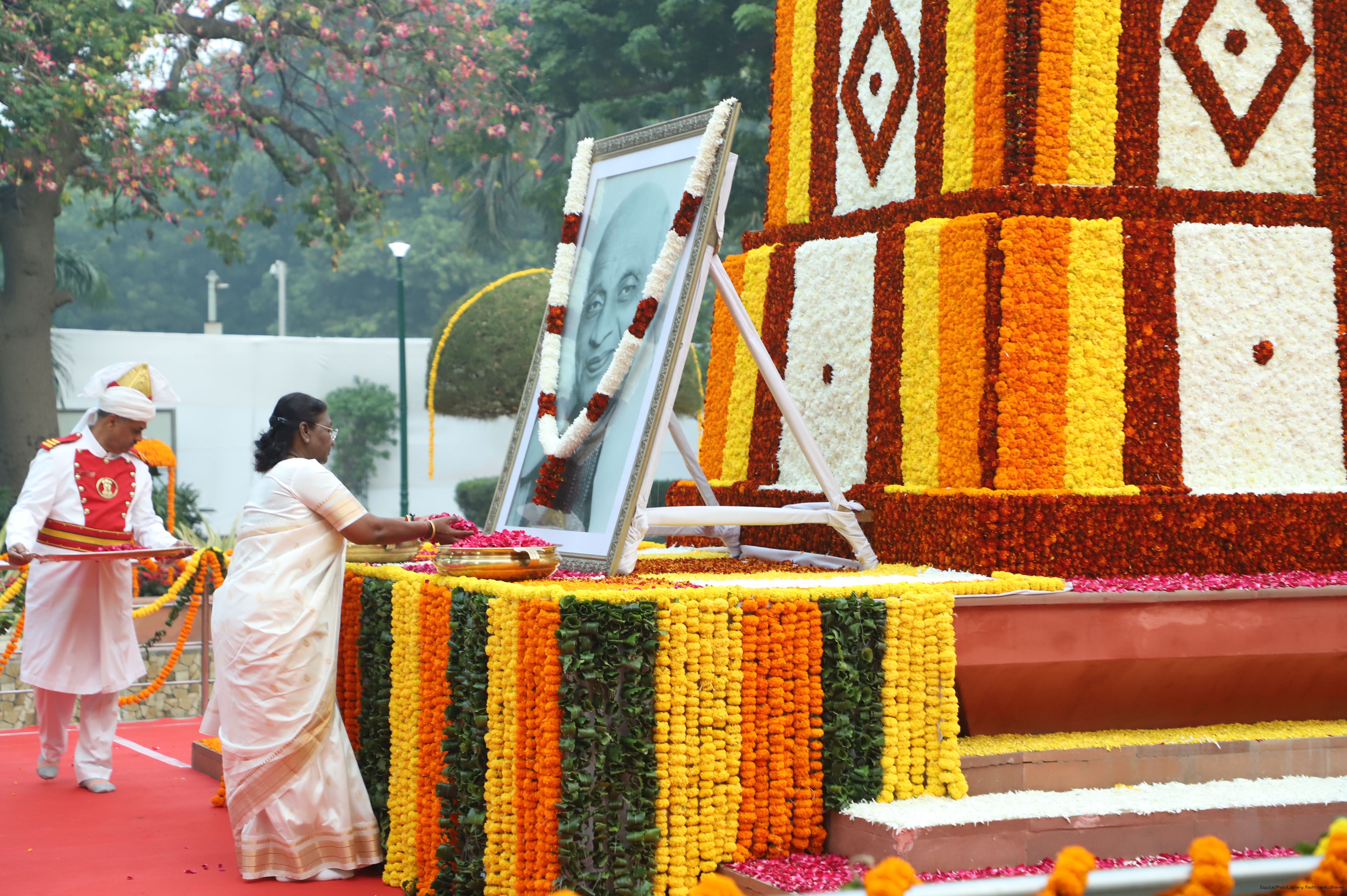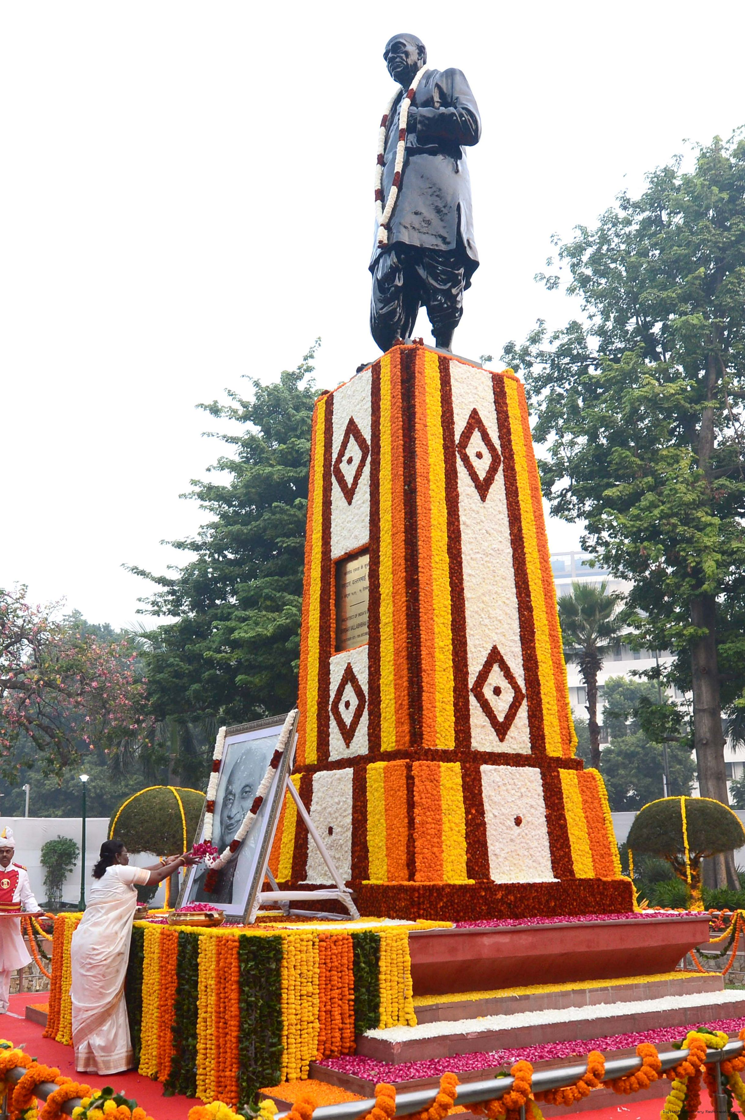 | Caption: | The President of India Smt. Droupadi Murmu, Paying floral tributes at the statue of Sardar Vallabhbhai Patel on his Birth Anniversary observed as Rashtriya Ekta Diwas at Rashtrapati Bhawan on October 30, 2023. |
