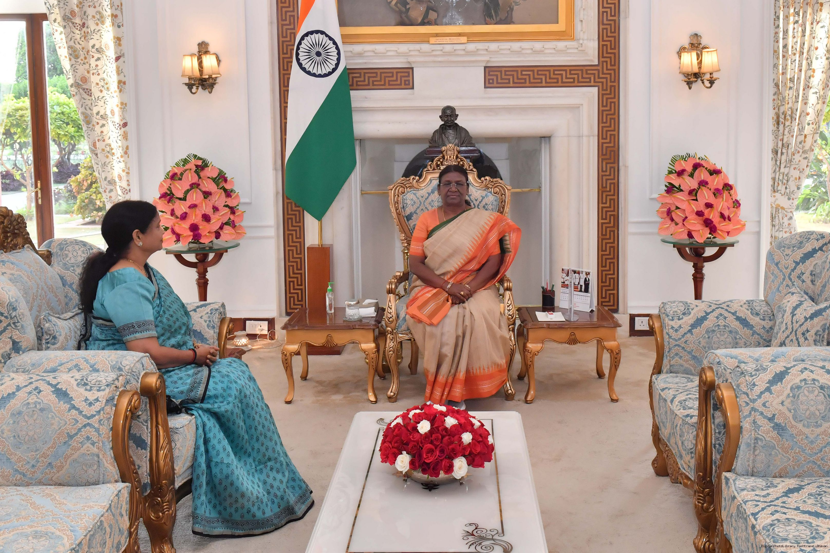 | Caption: | Smt. Krishna Raj, former Union Minister of State, Govt of India meeting with the President of India, Smt. Droupadi Murmu at Rashtrapati Bhavan on September 04, 2023. |
