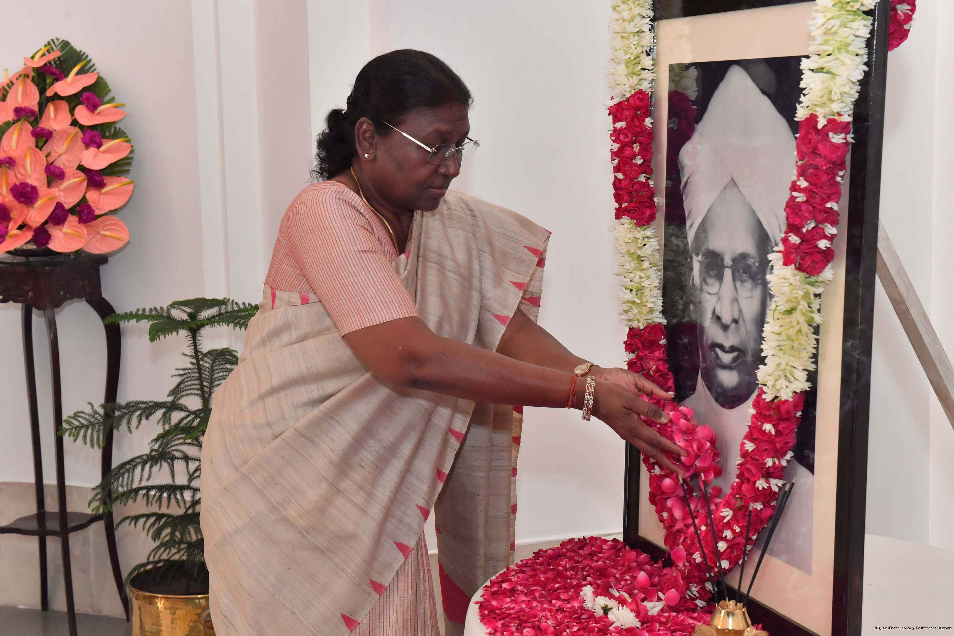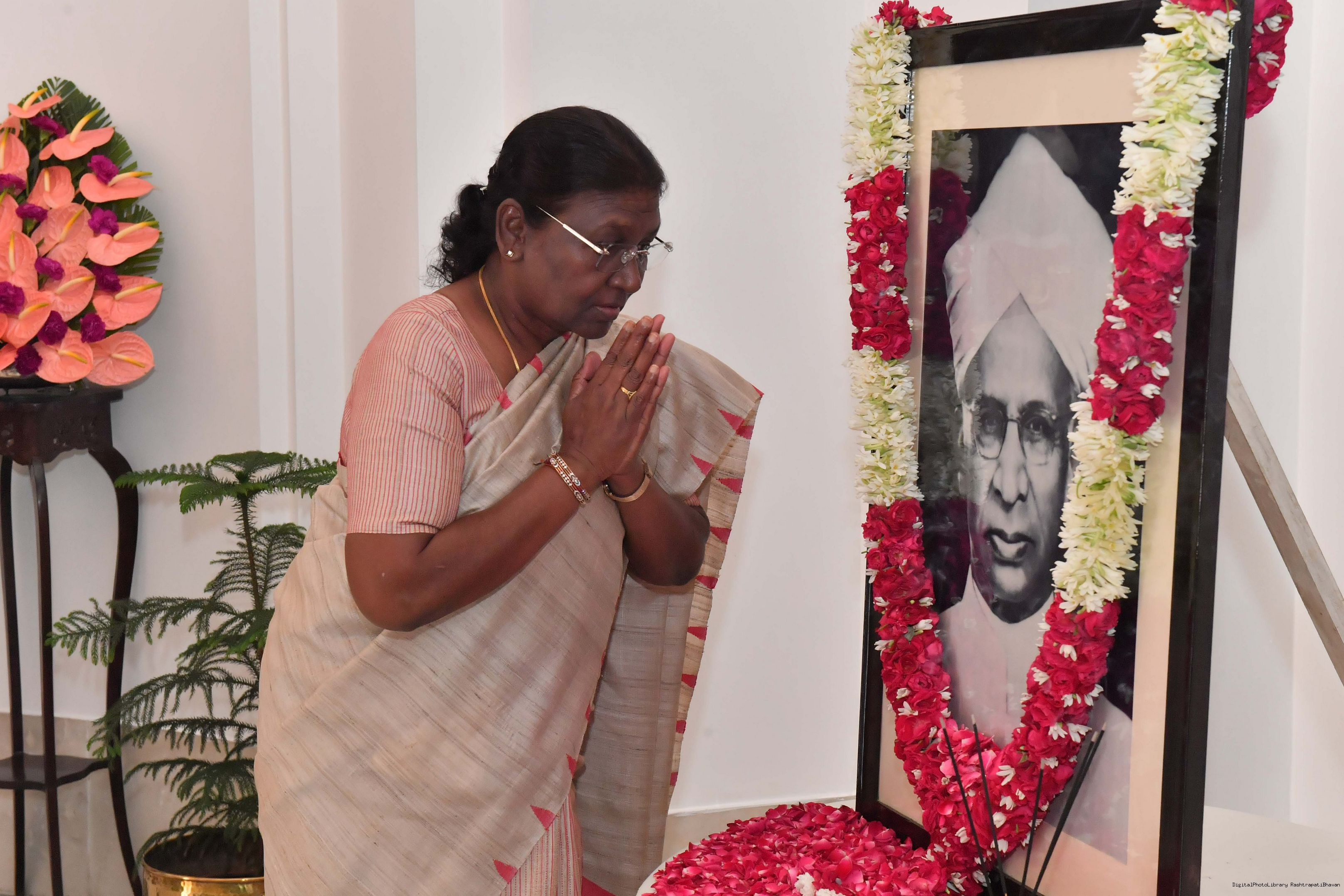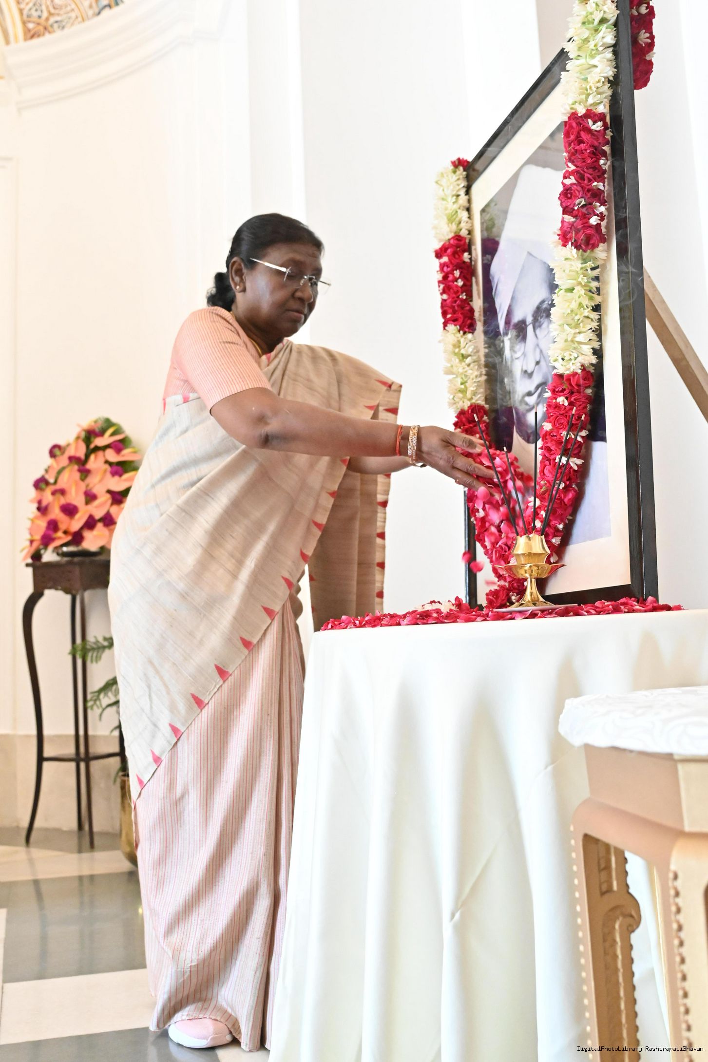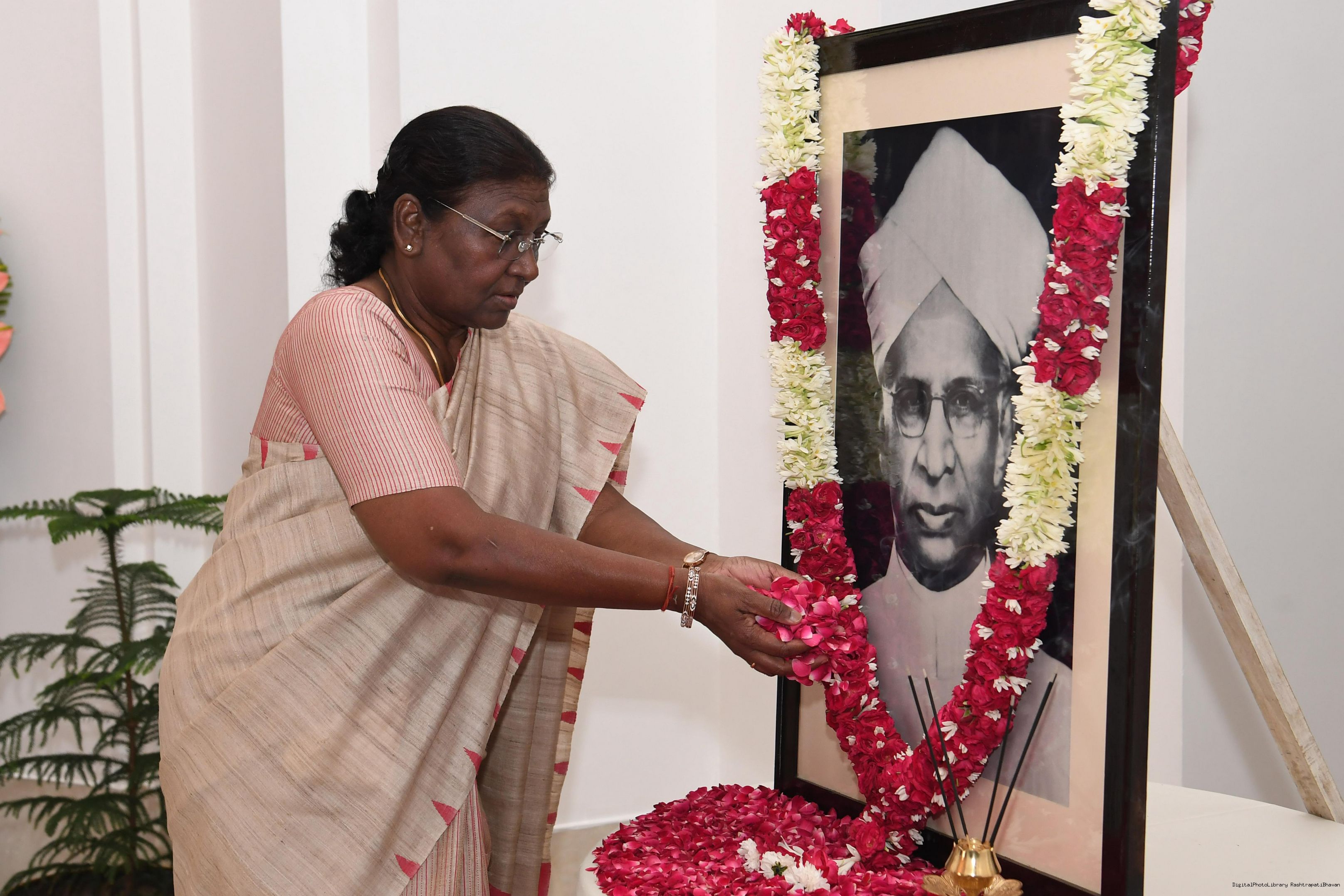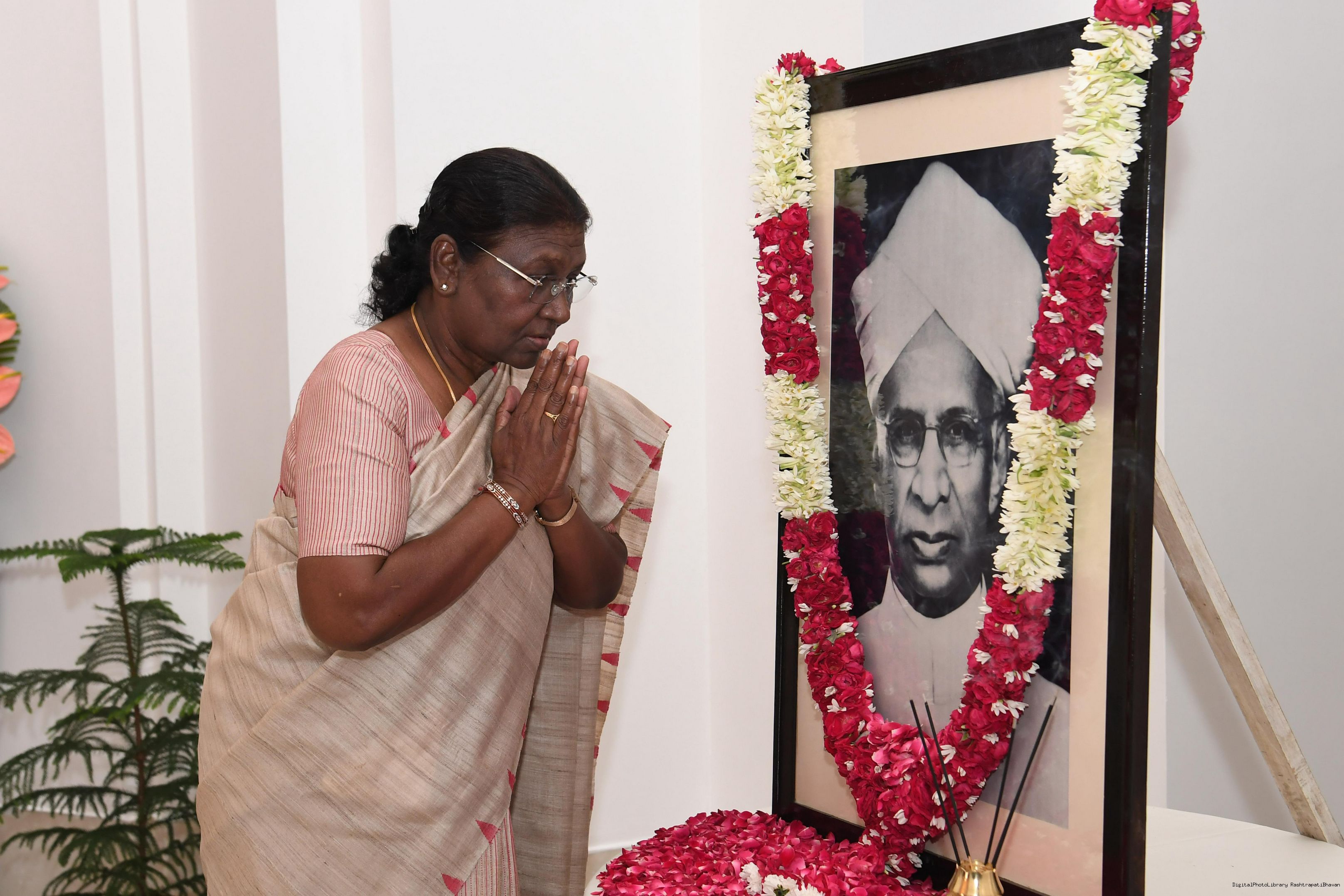 | Caption: | The President of India, Smt Droupadi Murmu paid floral tributes to Dr Sarvepalli Radhakrishnan, former President of India on his birth anniversary at Rashtrapati Bhavan on September 5, 2023. |