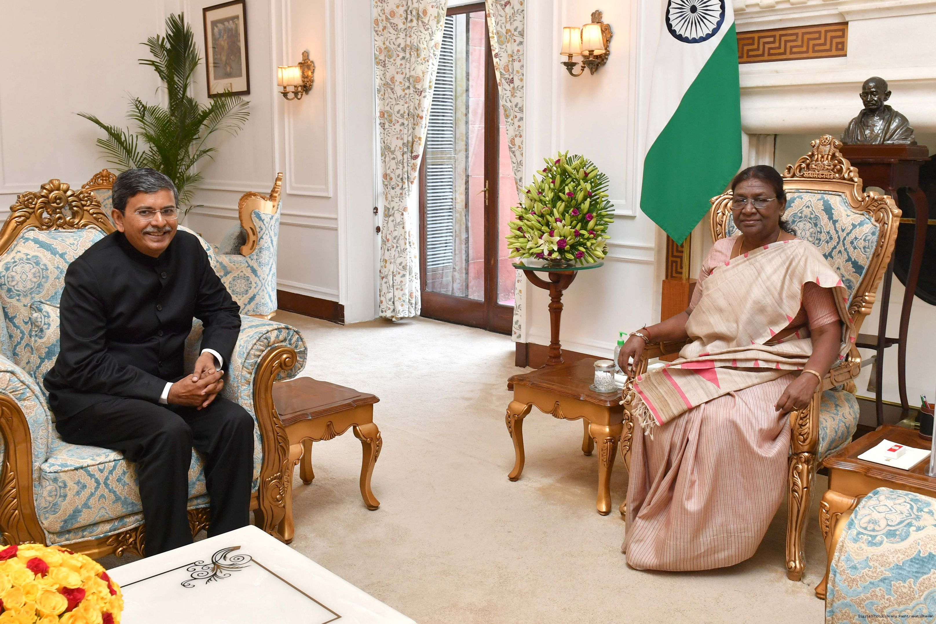 | Caption: | The High Commissioner-designate of India to South Africa, Shri Prabhat Kumar meeting with the President of India, Smt. Droupadi Murmu at Rashtrapati Bhavan on September 5, 2023. |