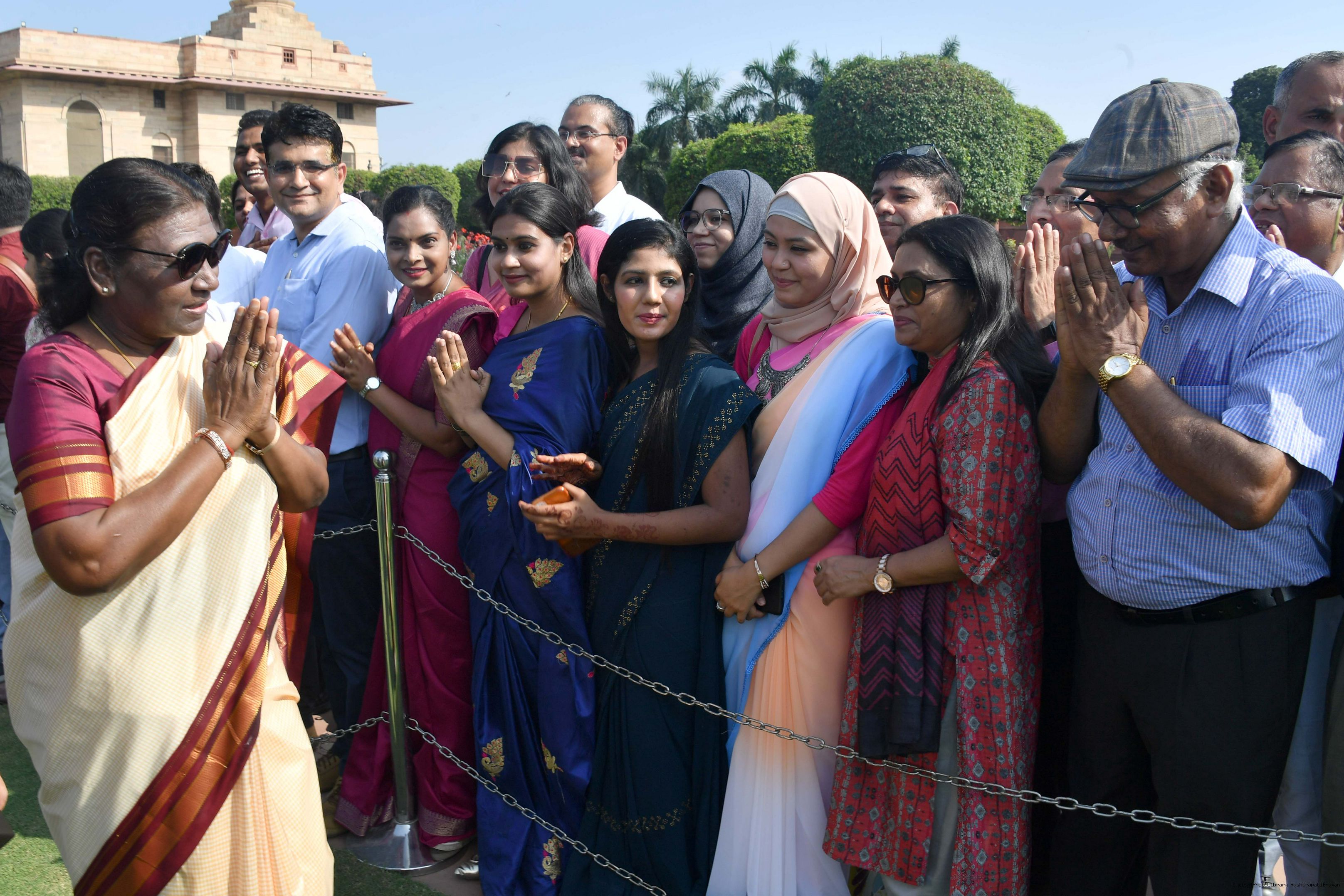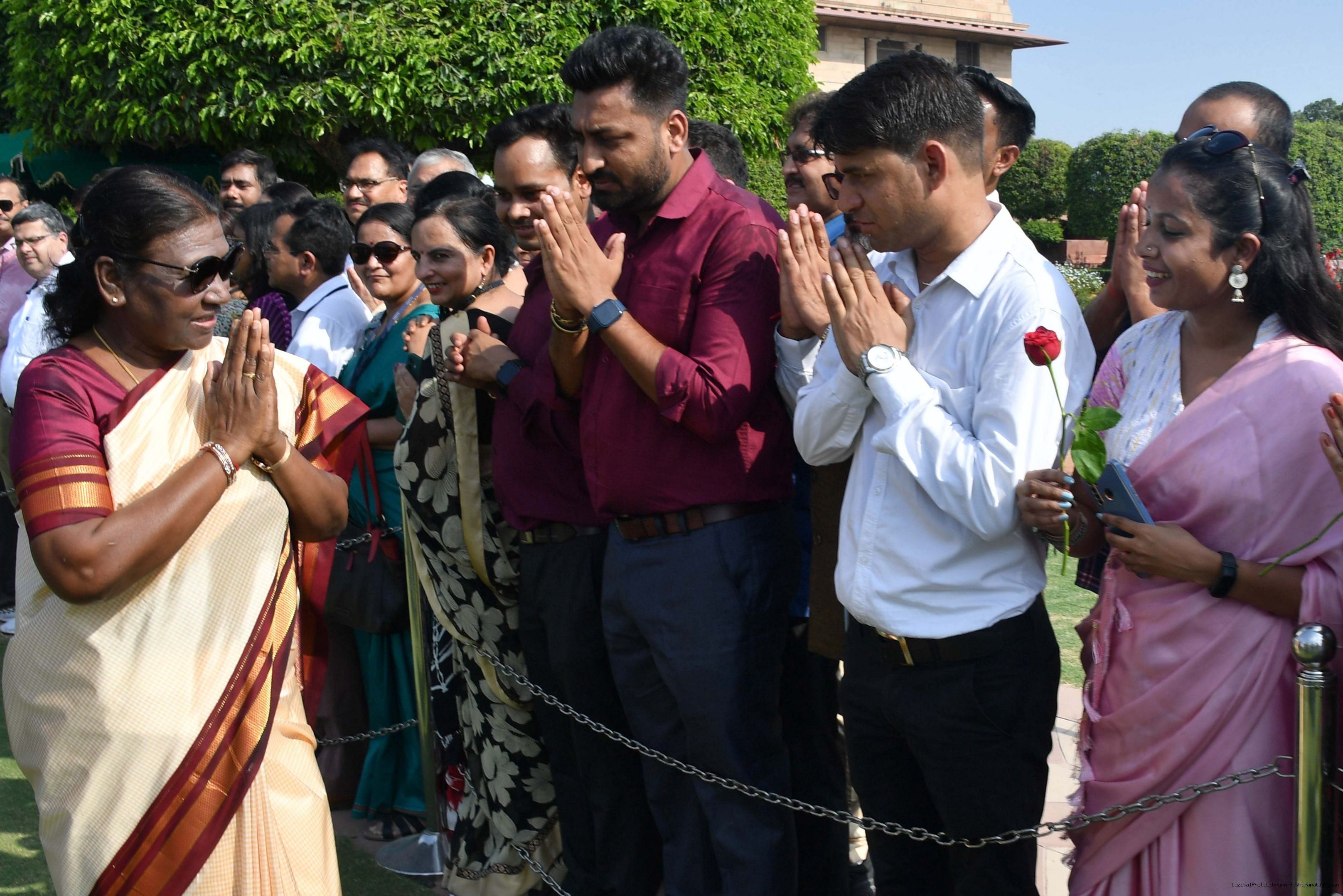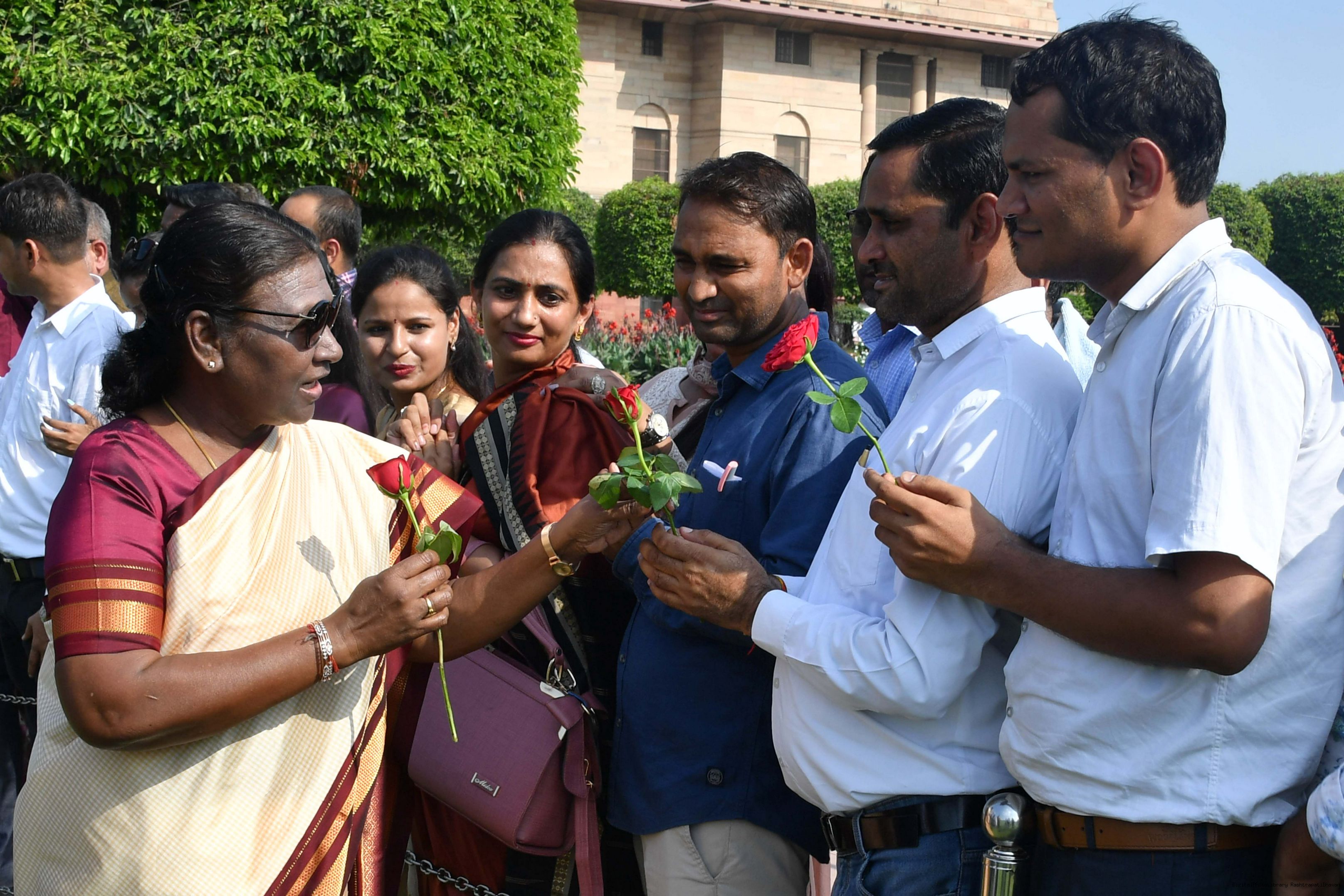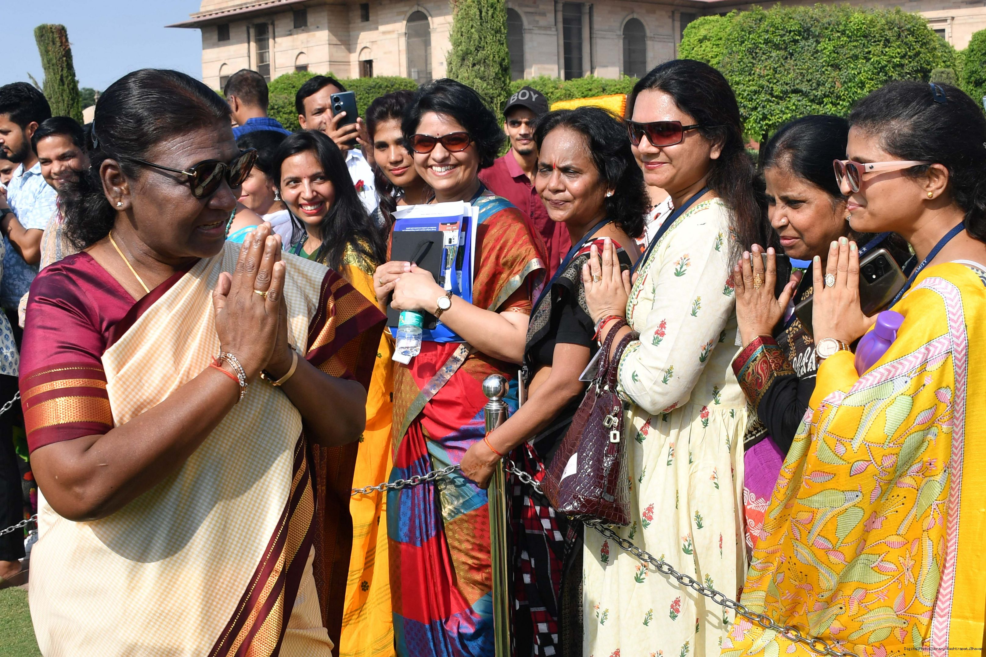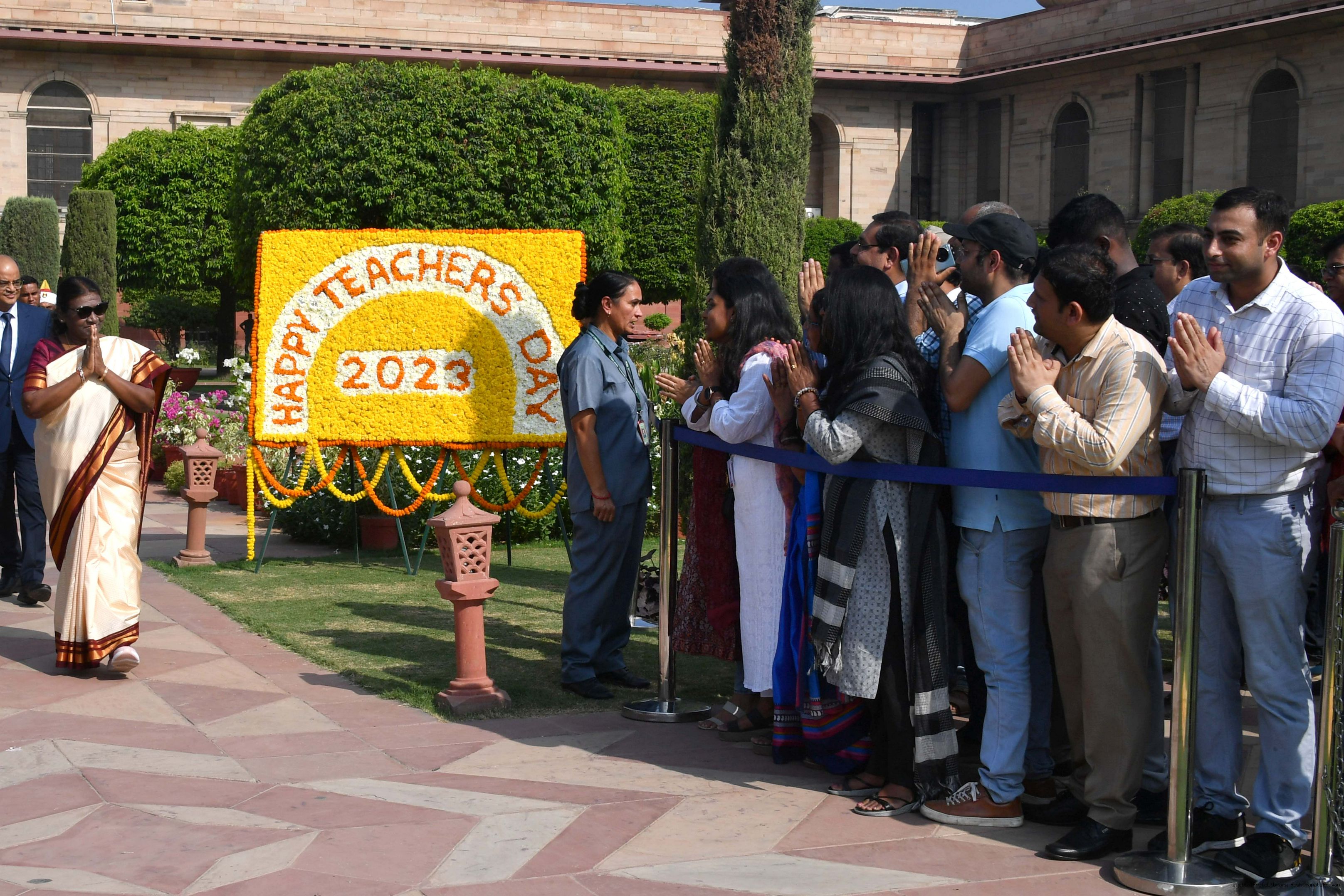 | Caption: | The President of India Smt. Droupadi Murmu Interacted with the teachers invited to visit the Amrit Udyan as special invitees at Rashtrapati Bhavan on September 05, 2023. |