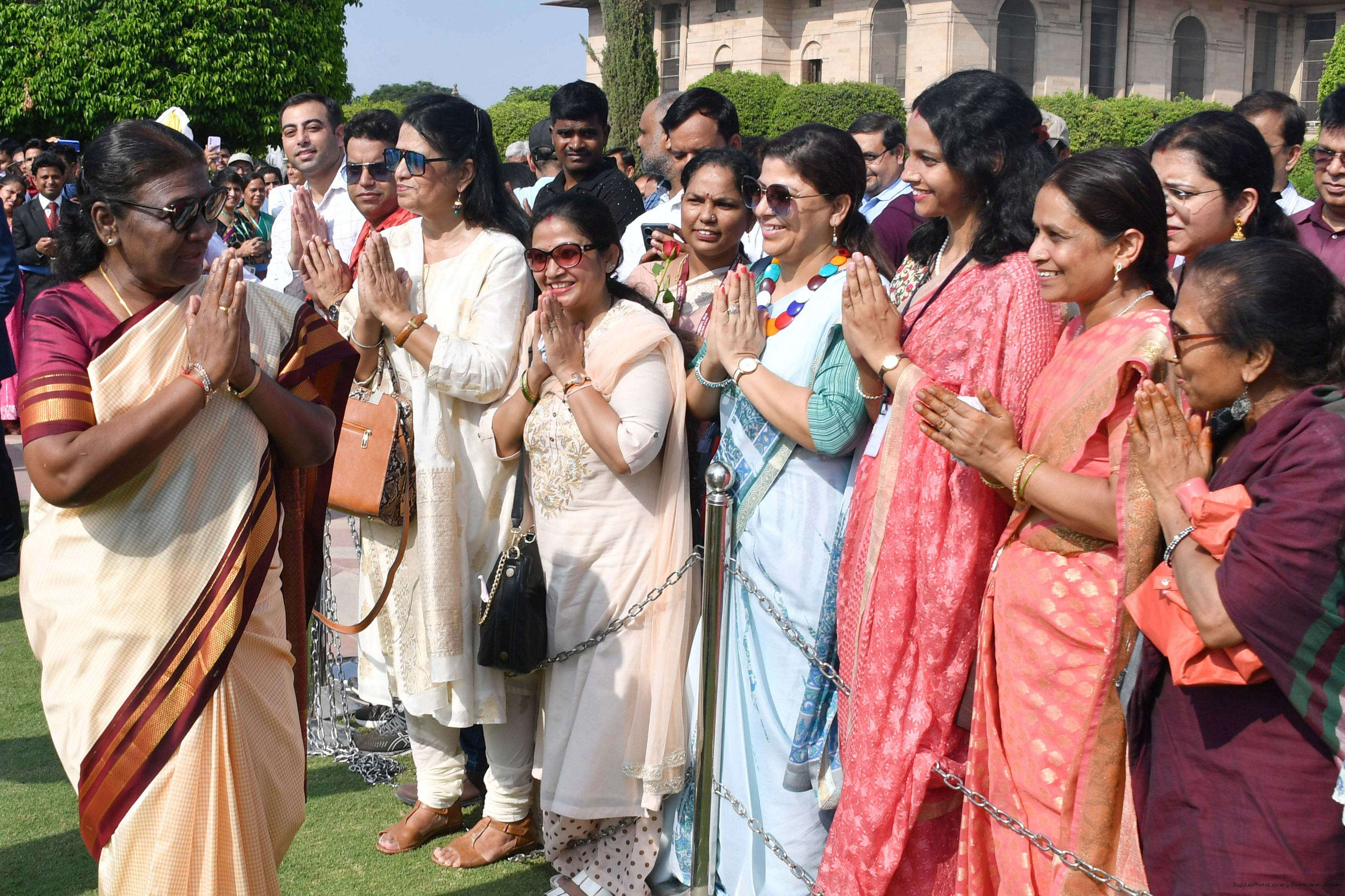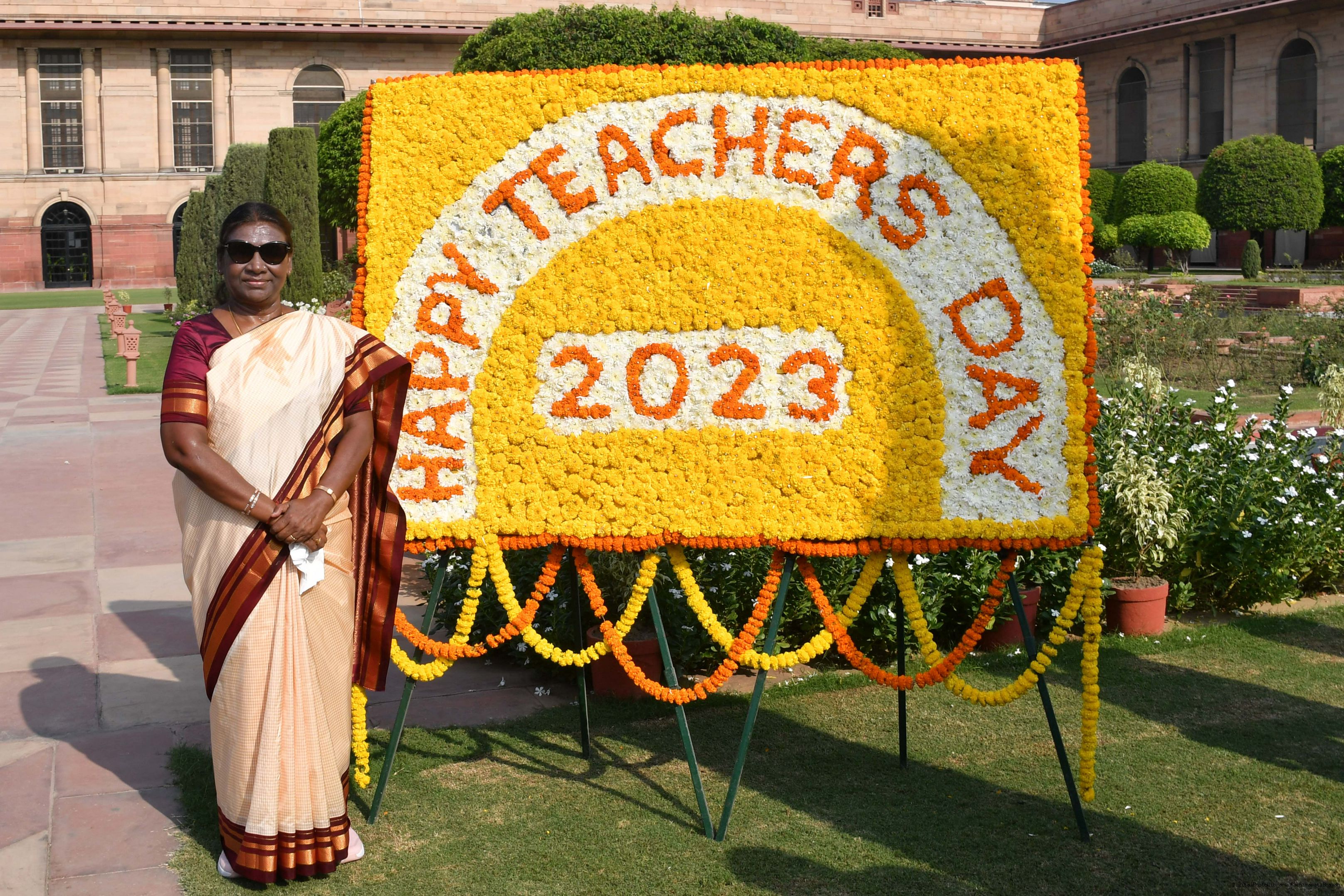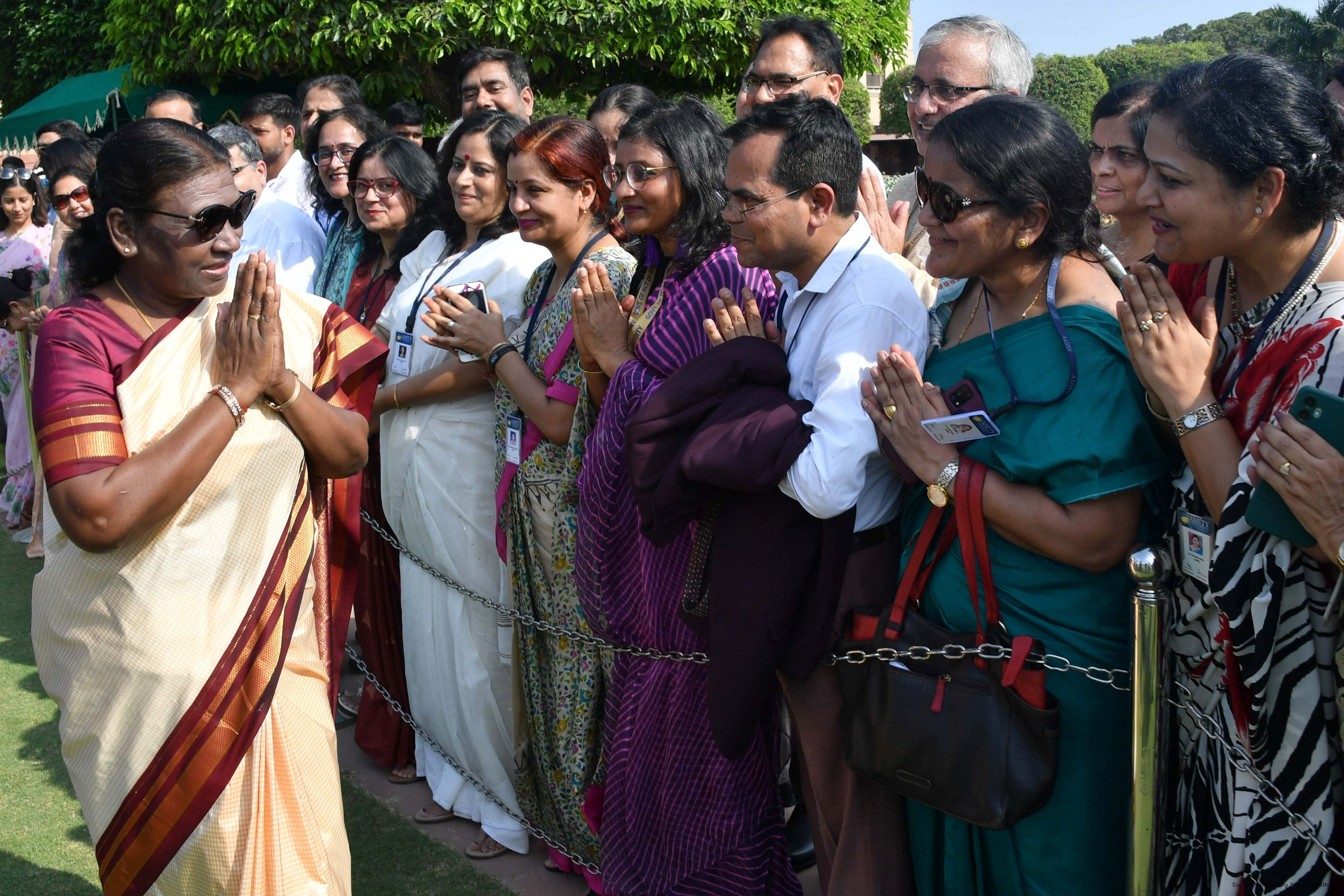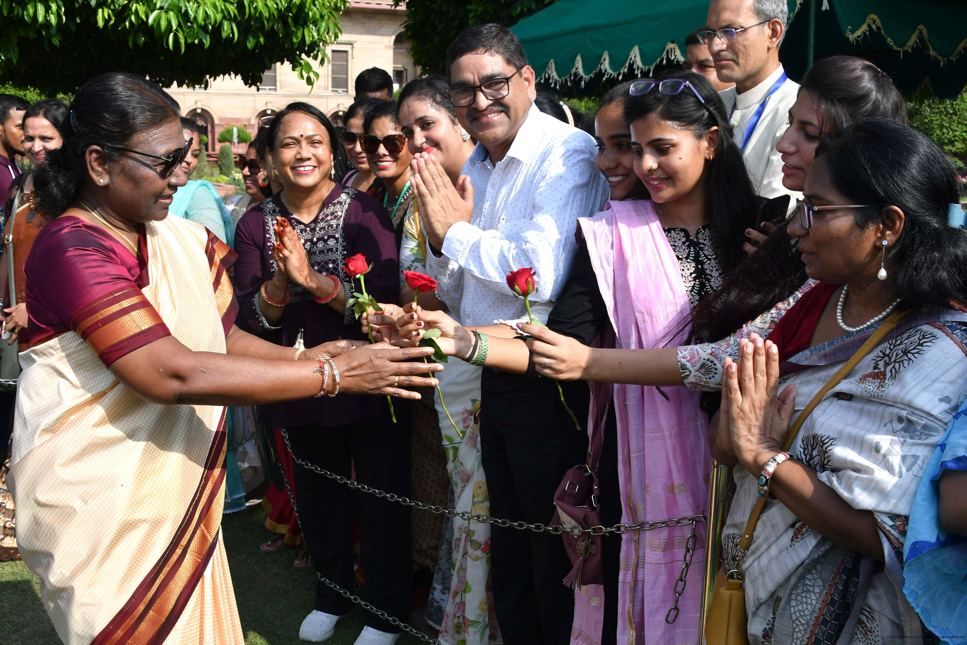 | Caption: | The President of India Smt. Droupadi Murmu Interacted with the teachers invited to visit the Amrit Udyan as special invitees at Rashtrapati Bhavan on September 05, 2023. |