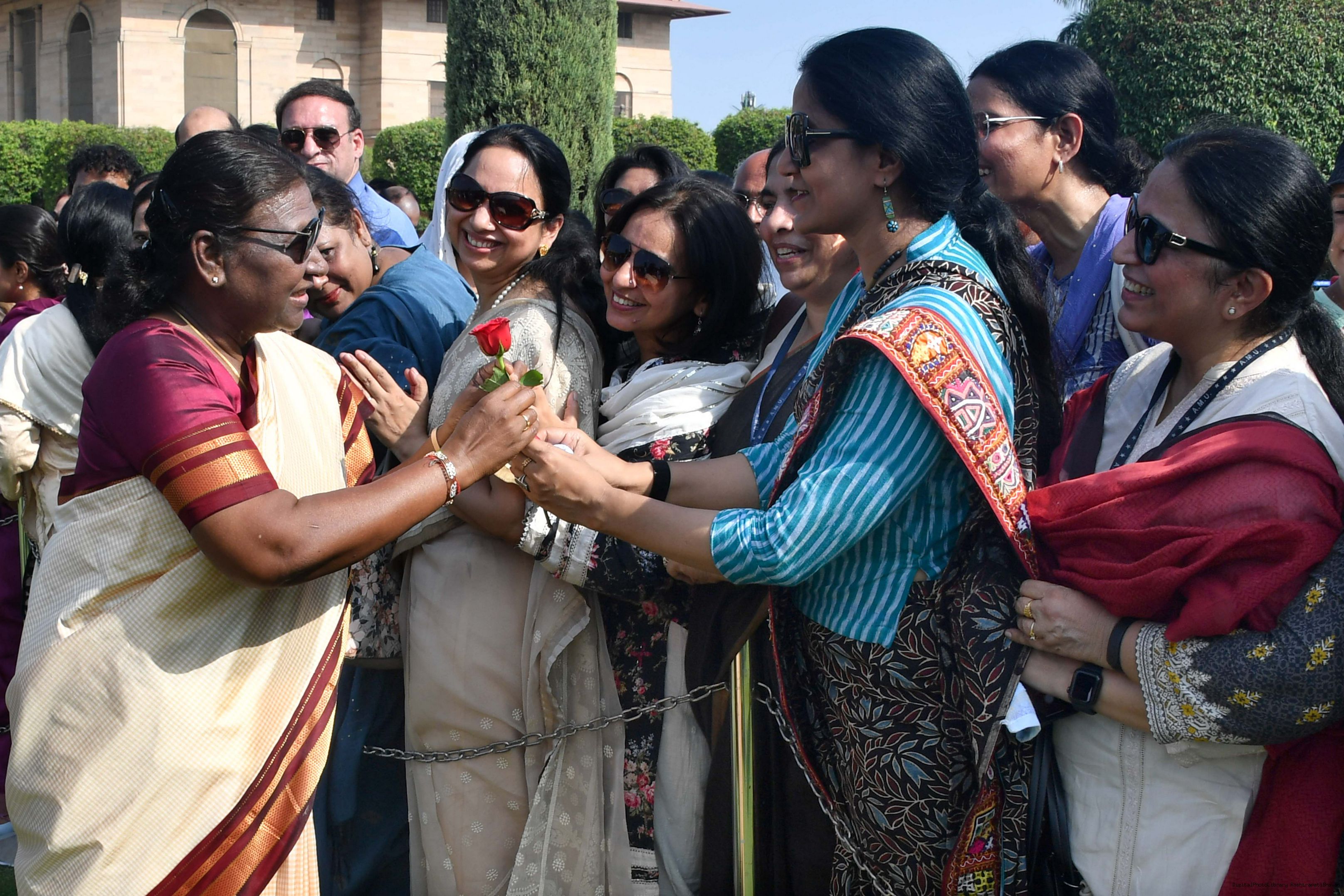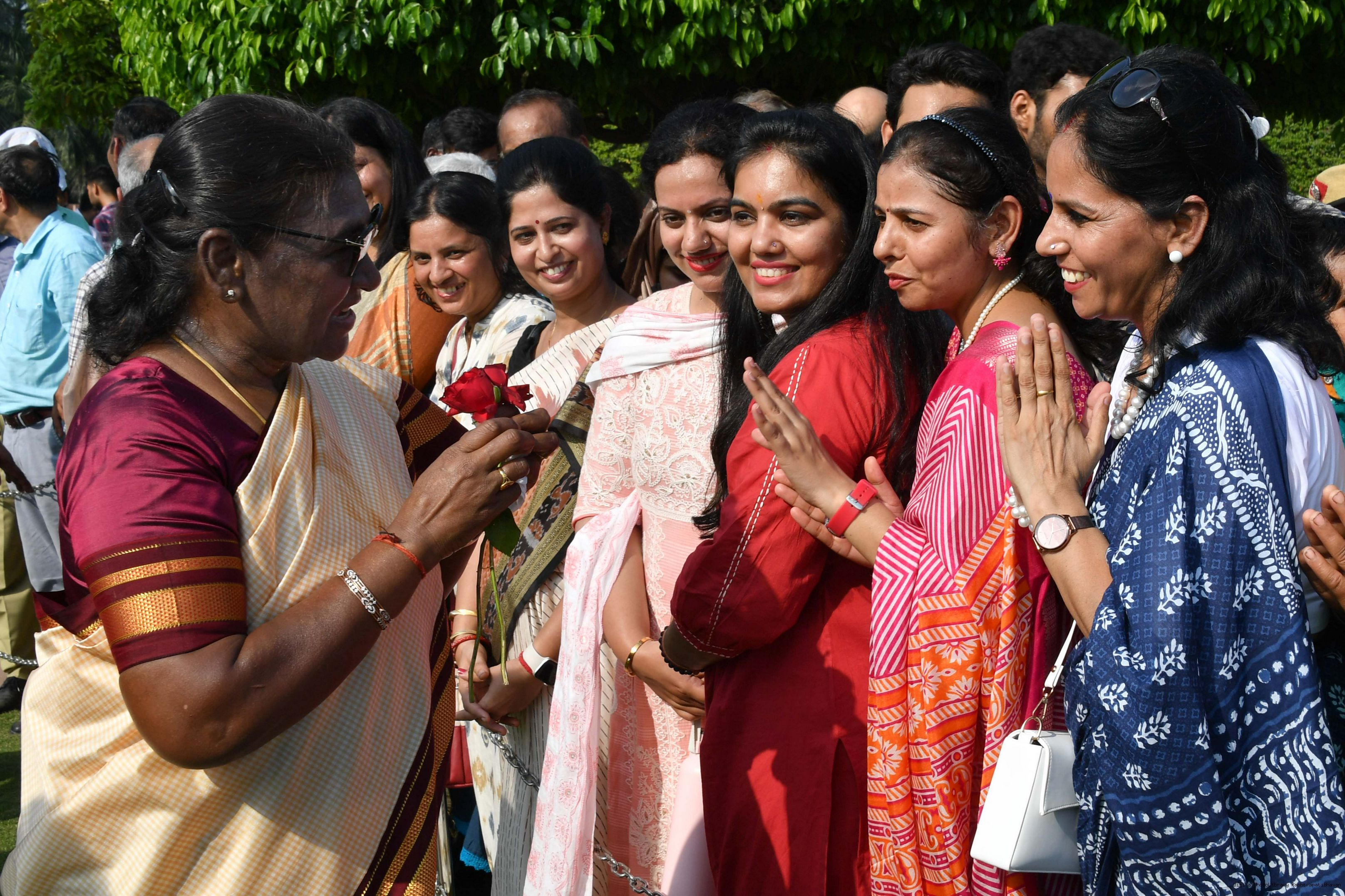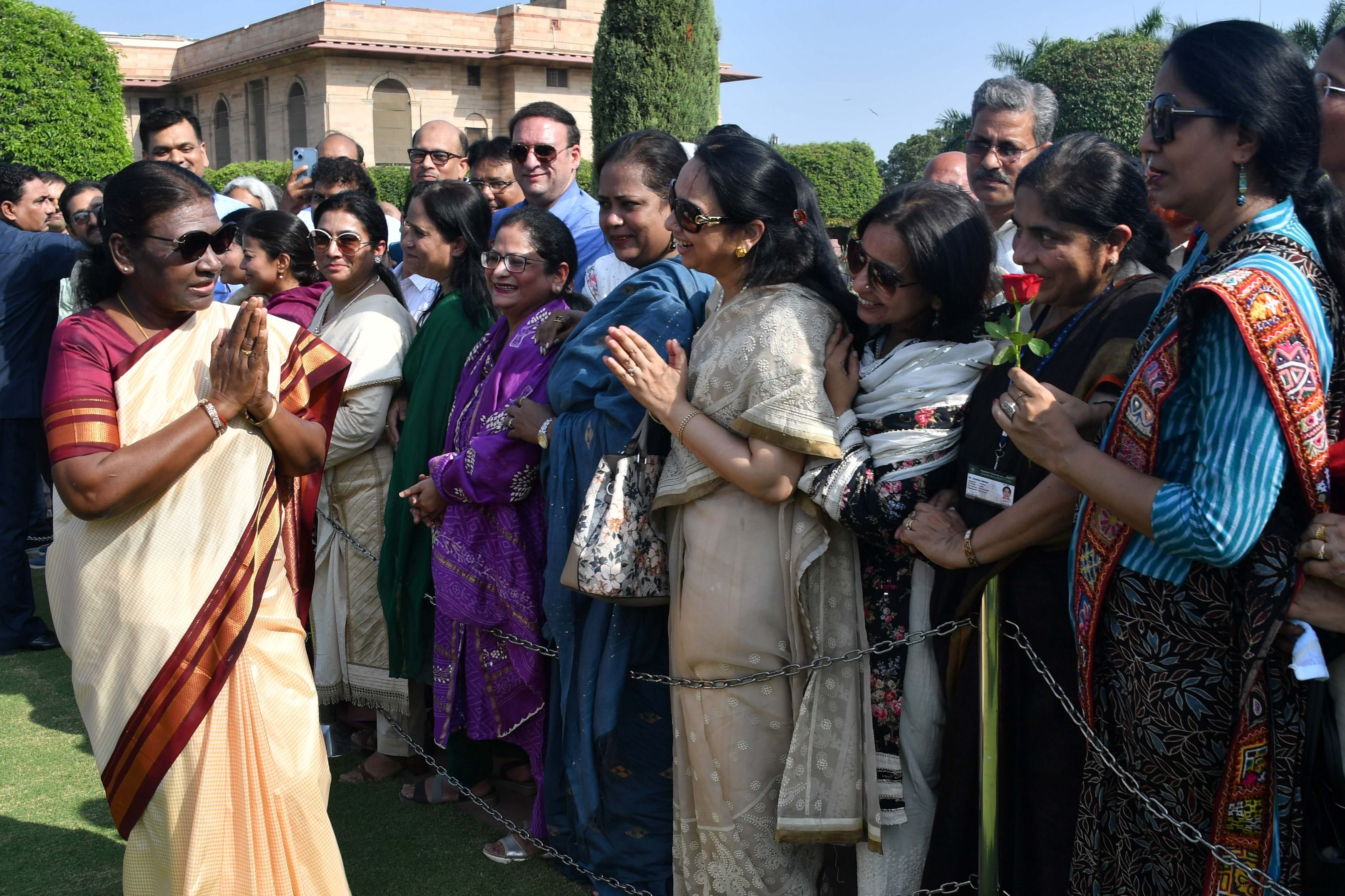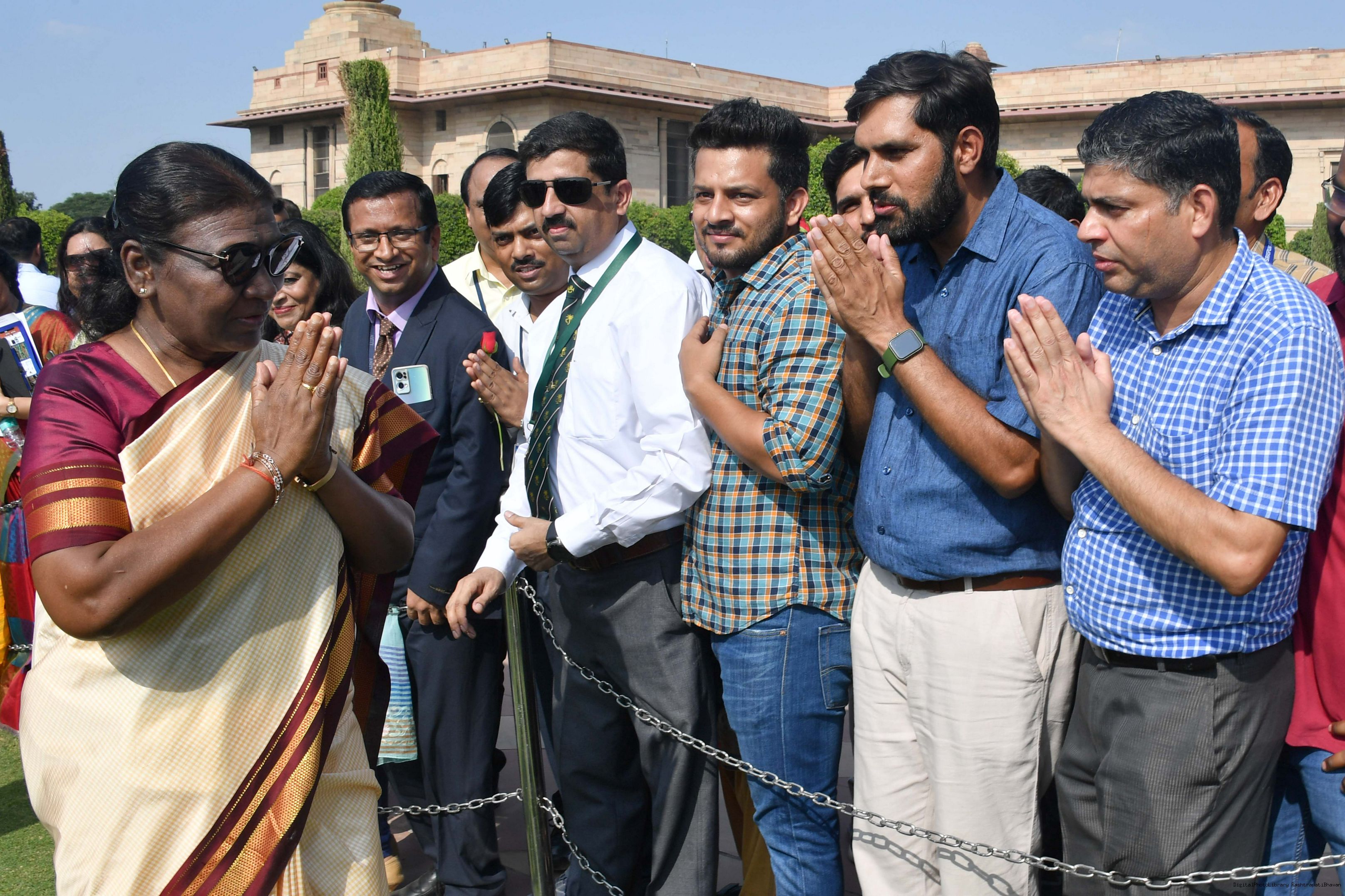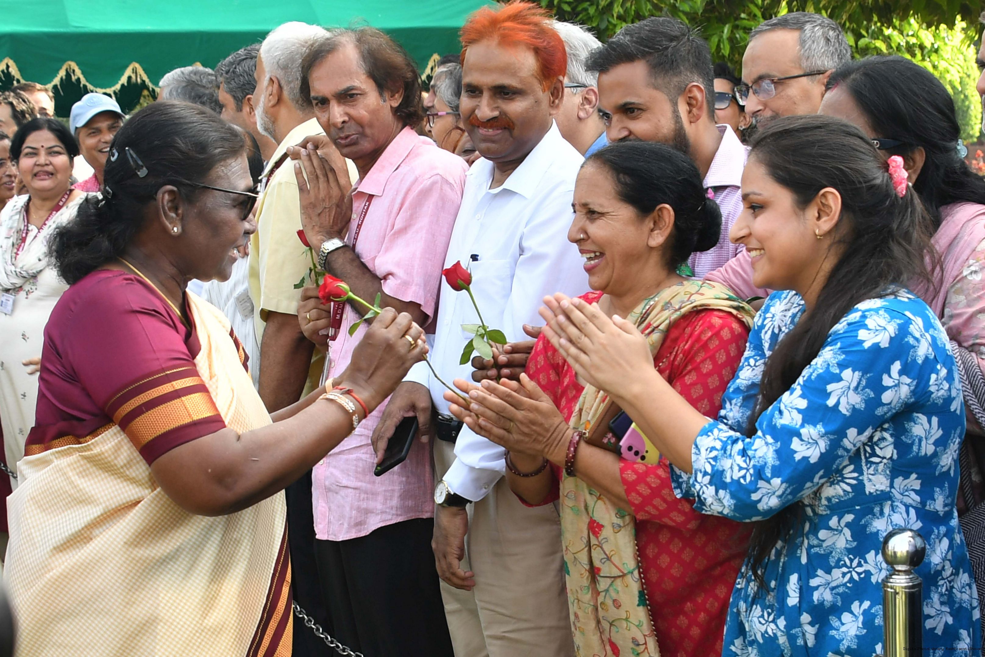 | Caption: | The President of India Smt. Droupadi Murmu Interacted with the teachers invited to visit the Amrit Udyan as special invitees at Rashtrapati Bhavan on September 05, 2023. |