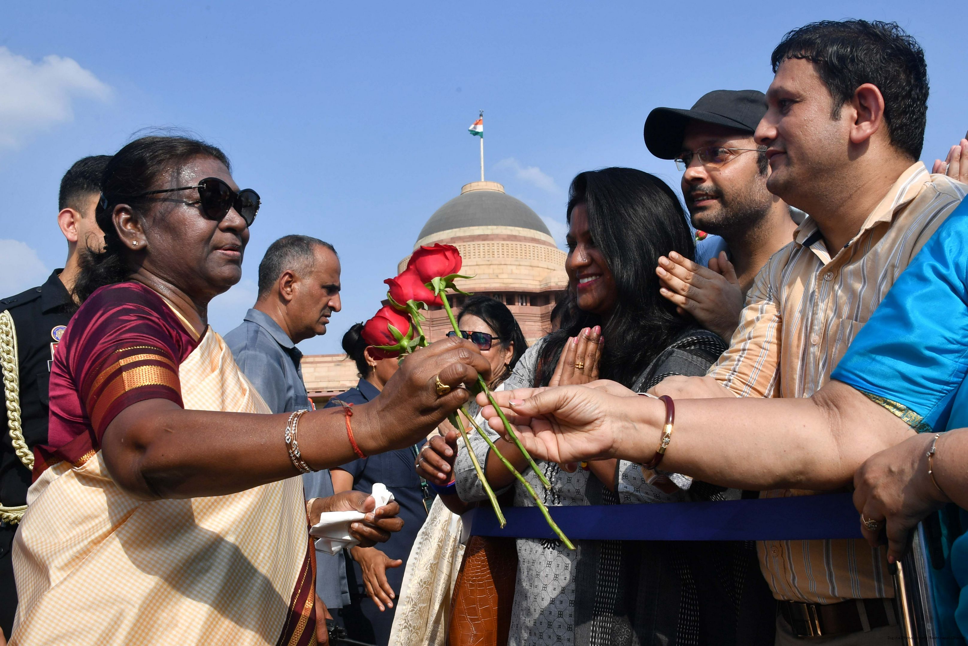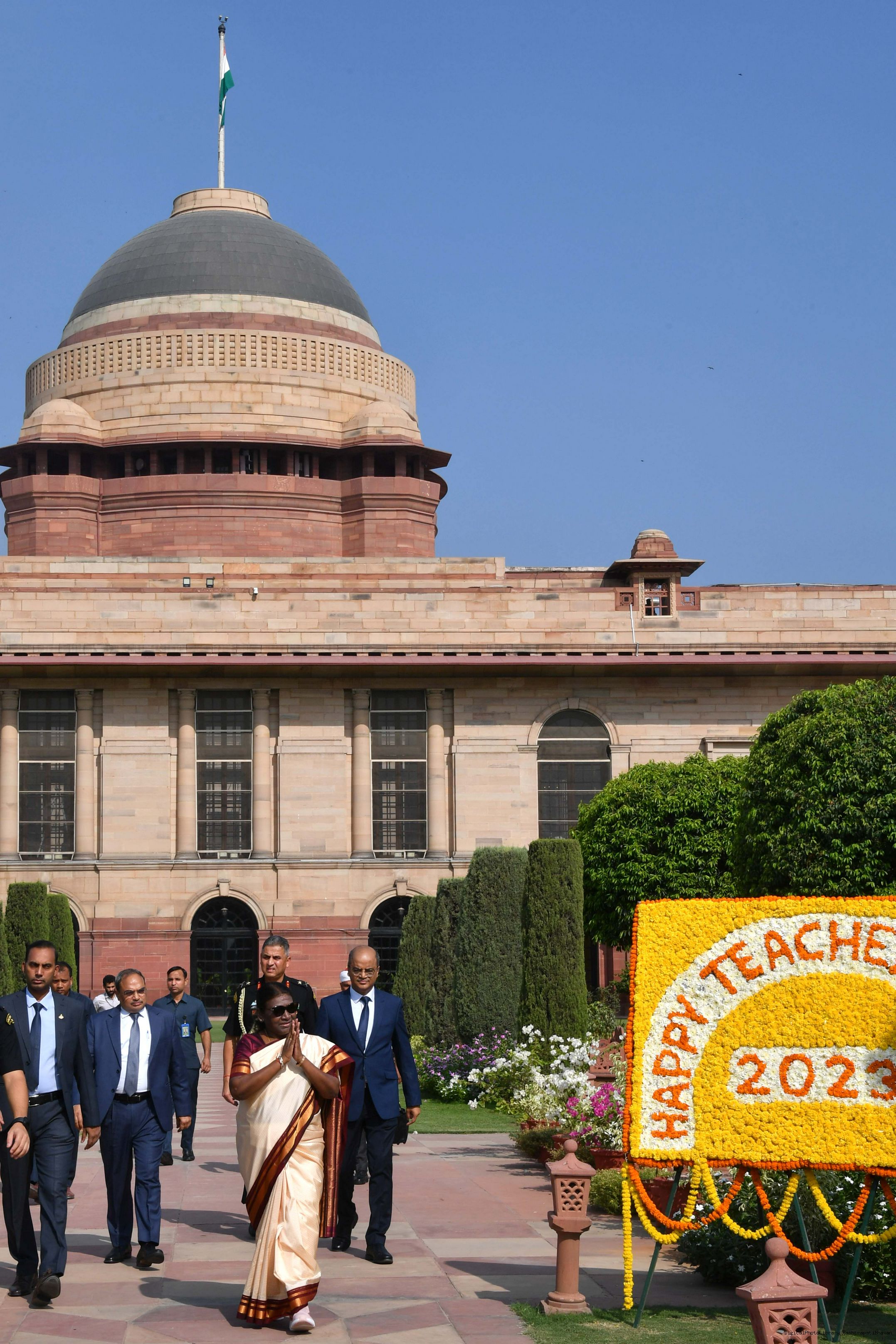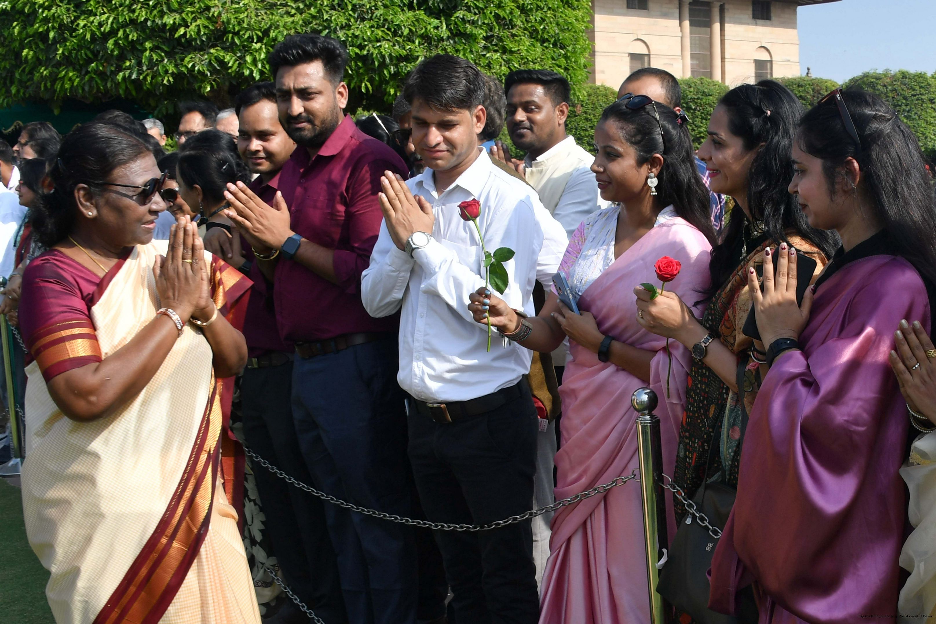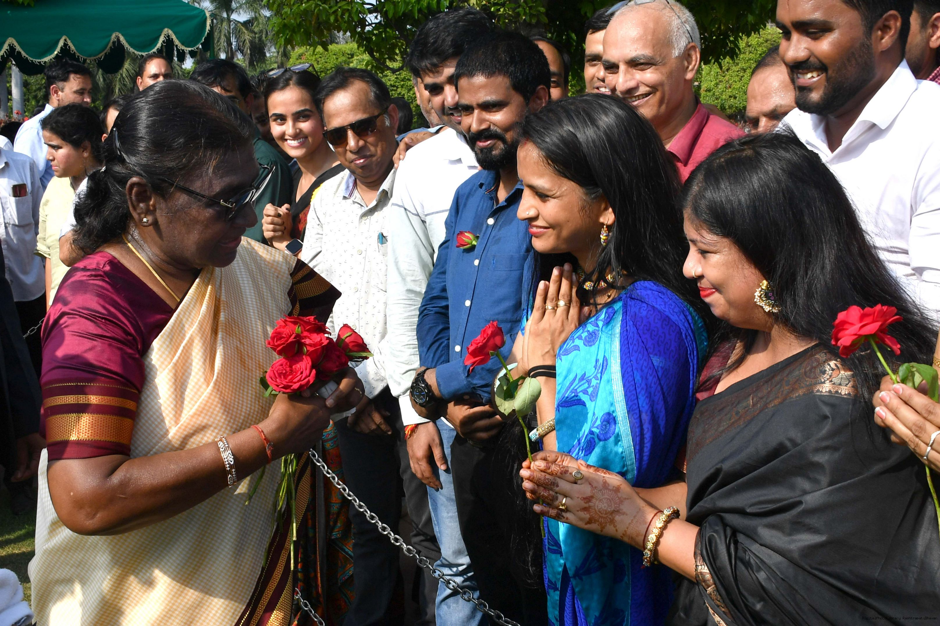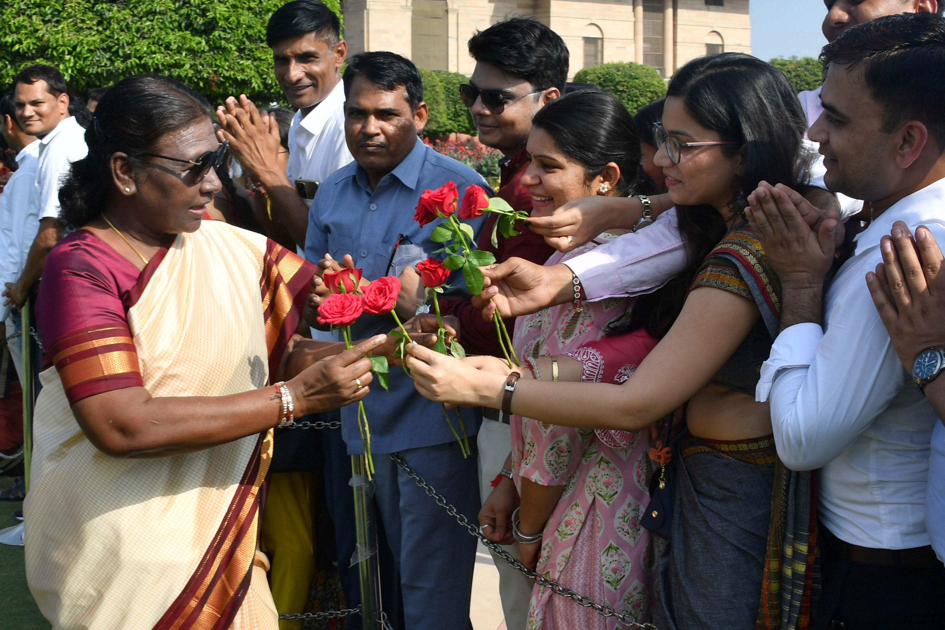 | Caption: | The President of India Smt. Droupadi Murmu Interacted with the teachers invited to visit the Amrit Udyan as special invitees at Rashtrapati Bhavan on September 05, 2023. |