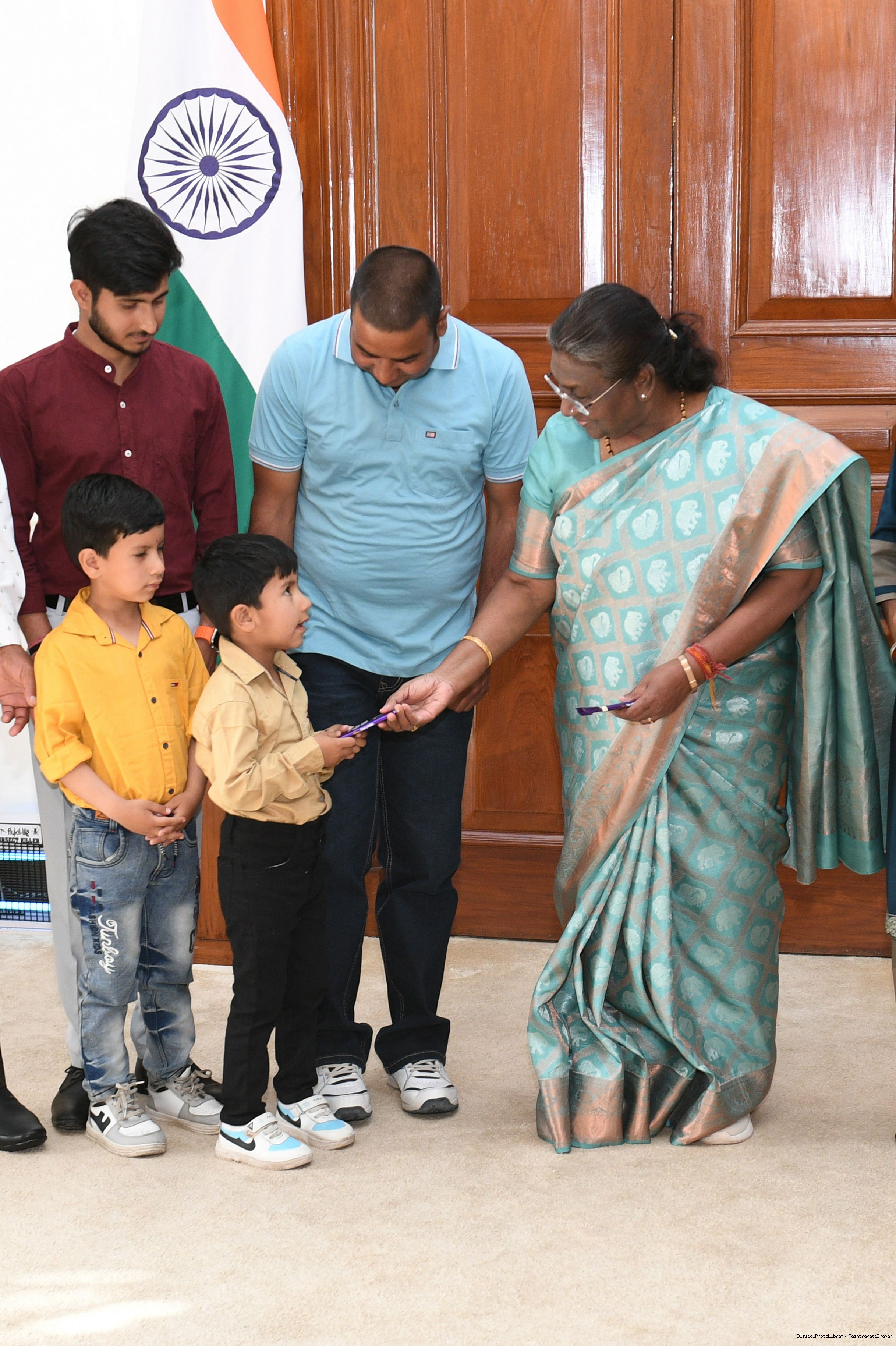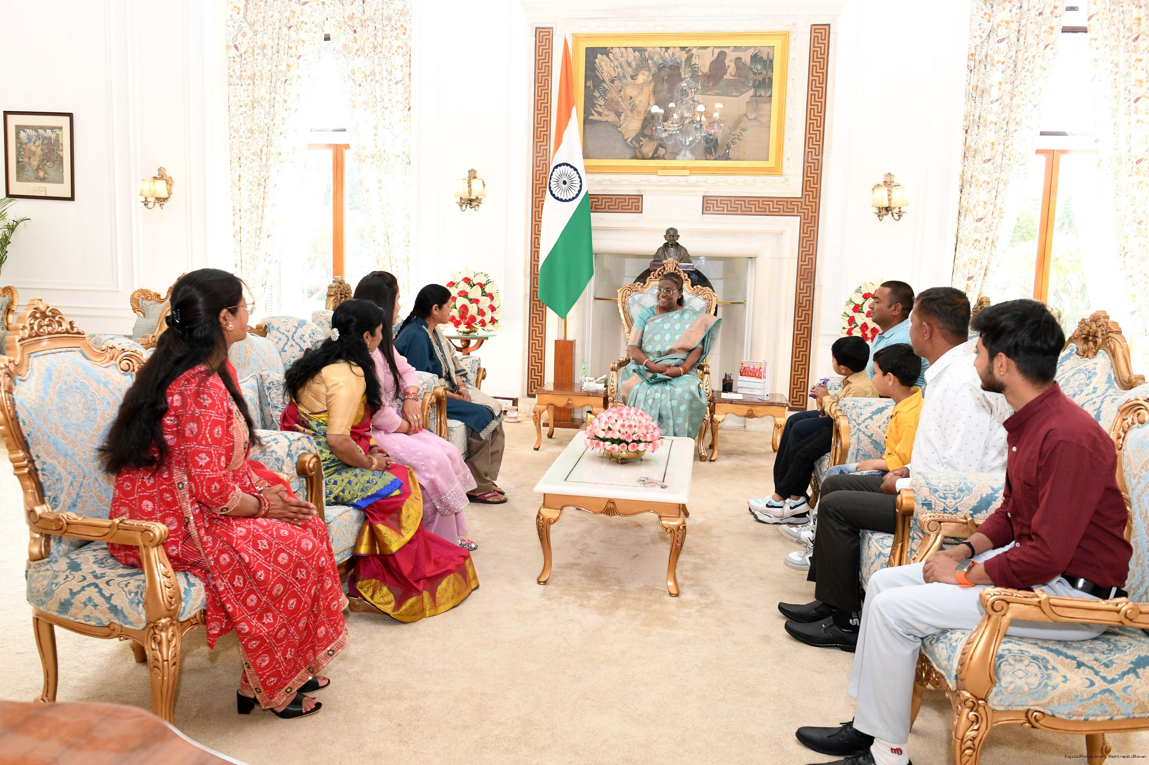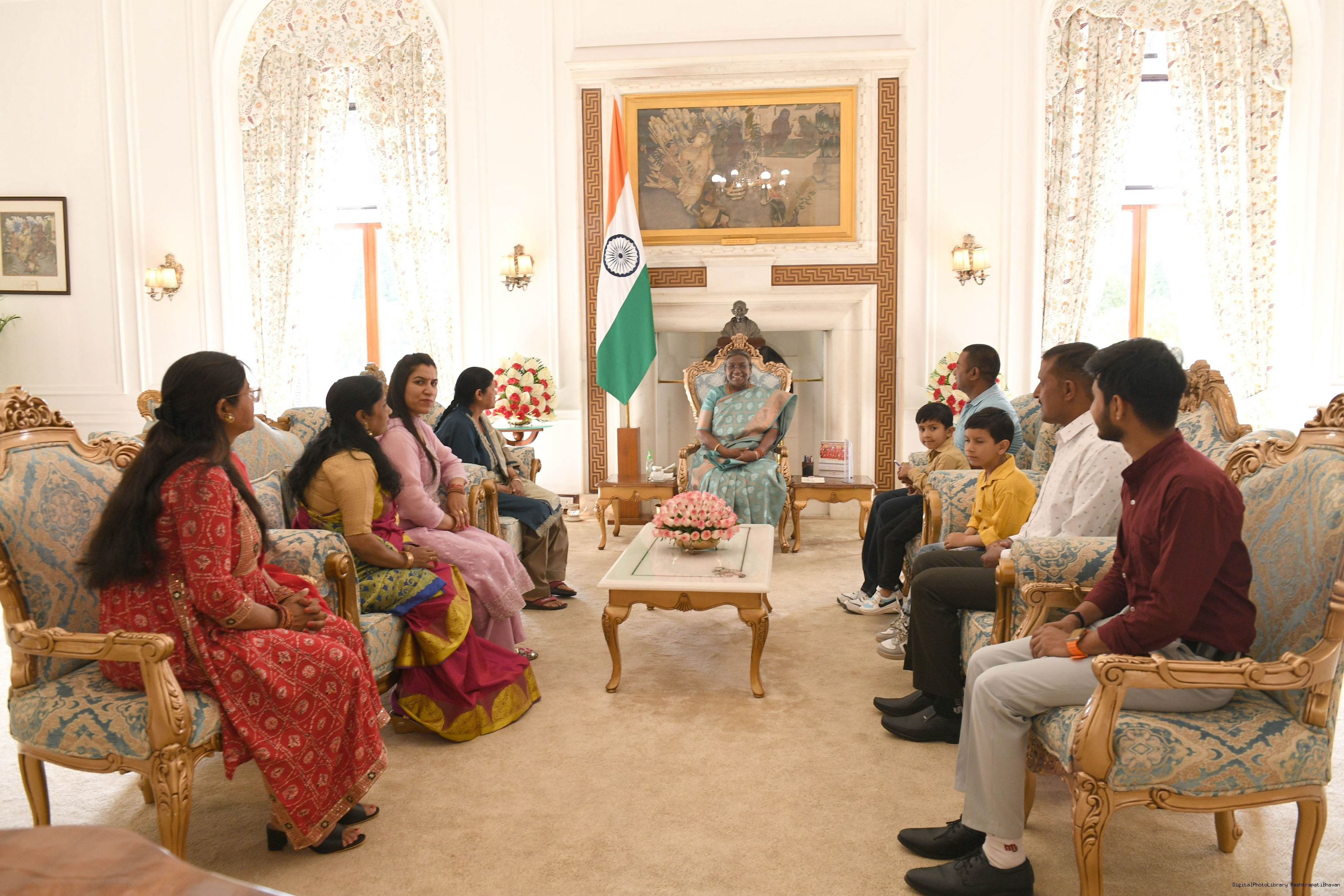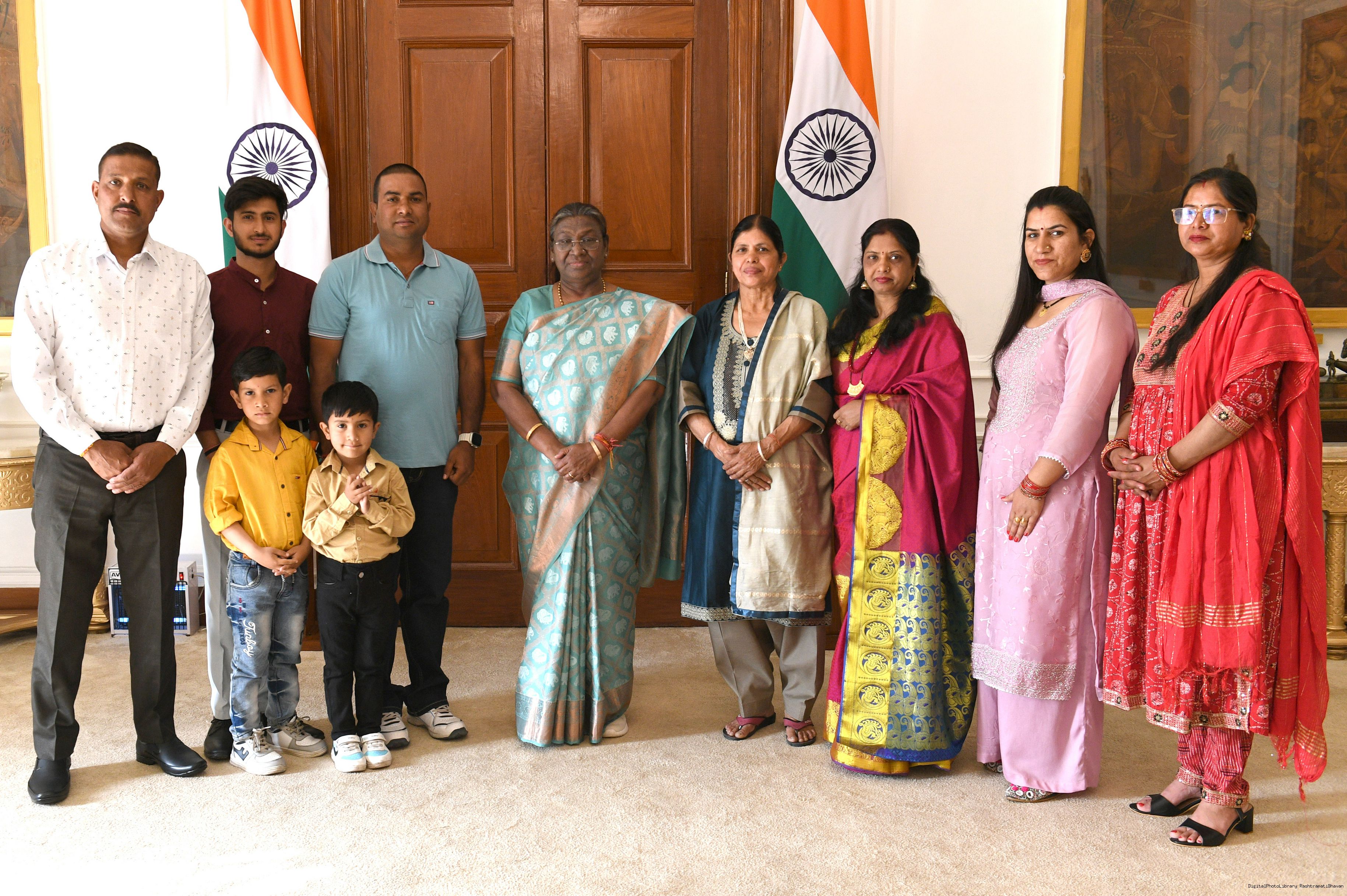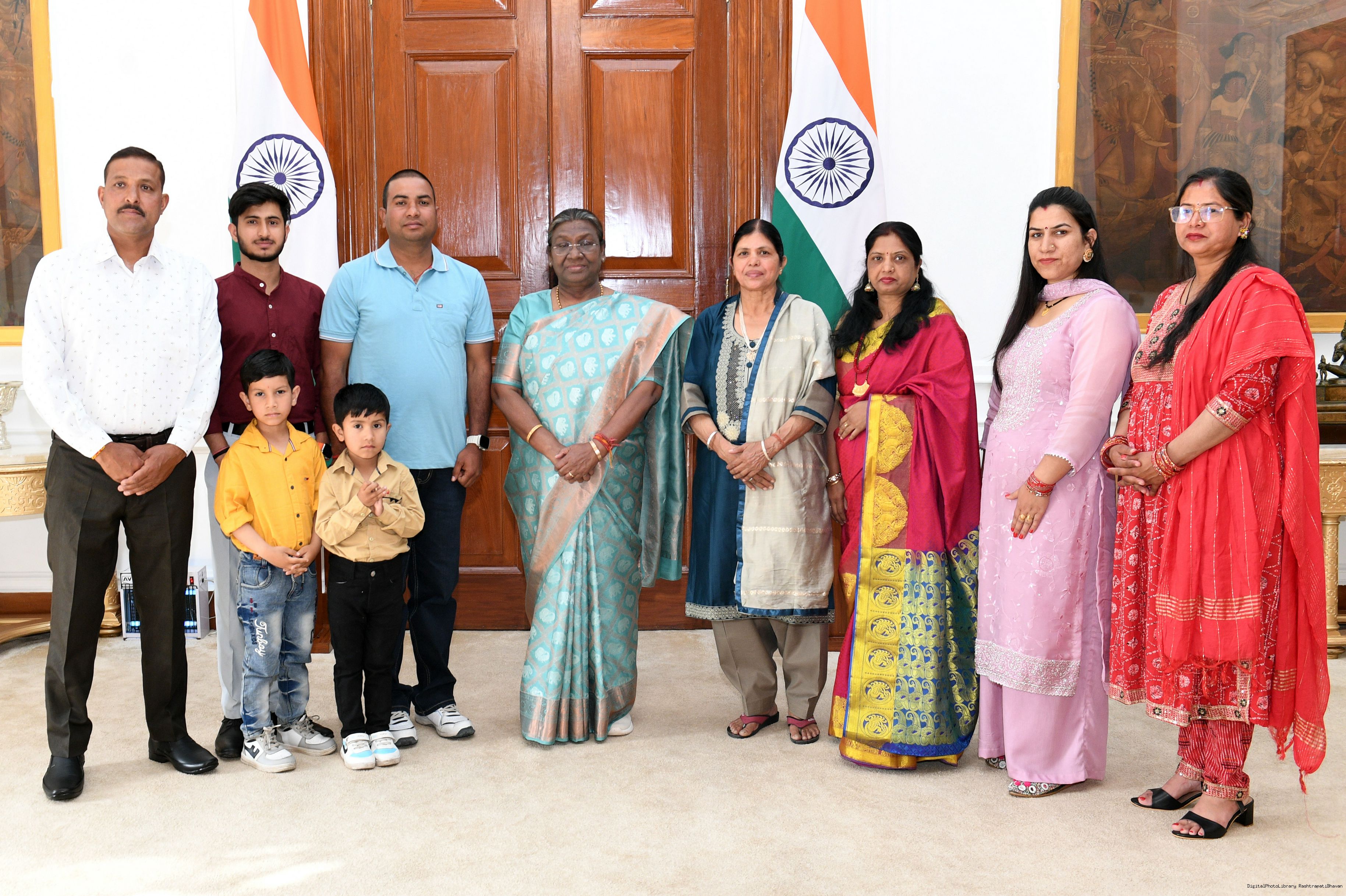 | Caption: | Smt. Sunita Devi, Senior Household Attendant along with others meeting with the President of India Smt. Droupadi Murmu, at Rashtrapati Bhawan on April 02, 2024. |