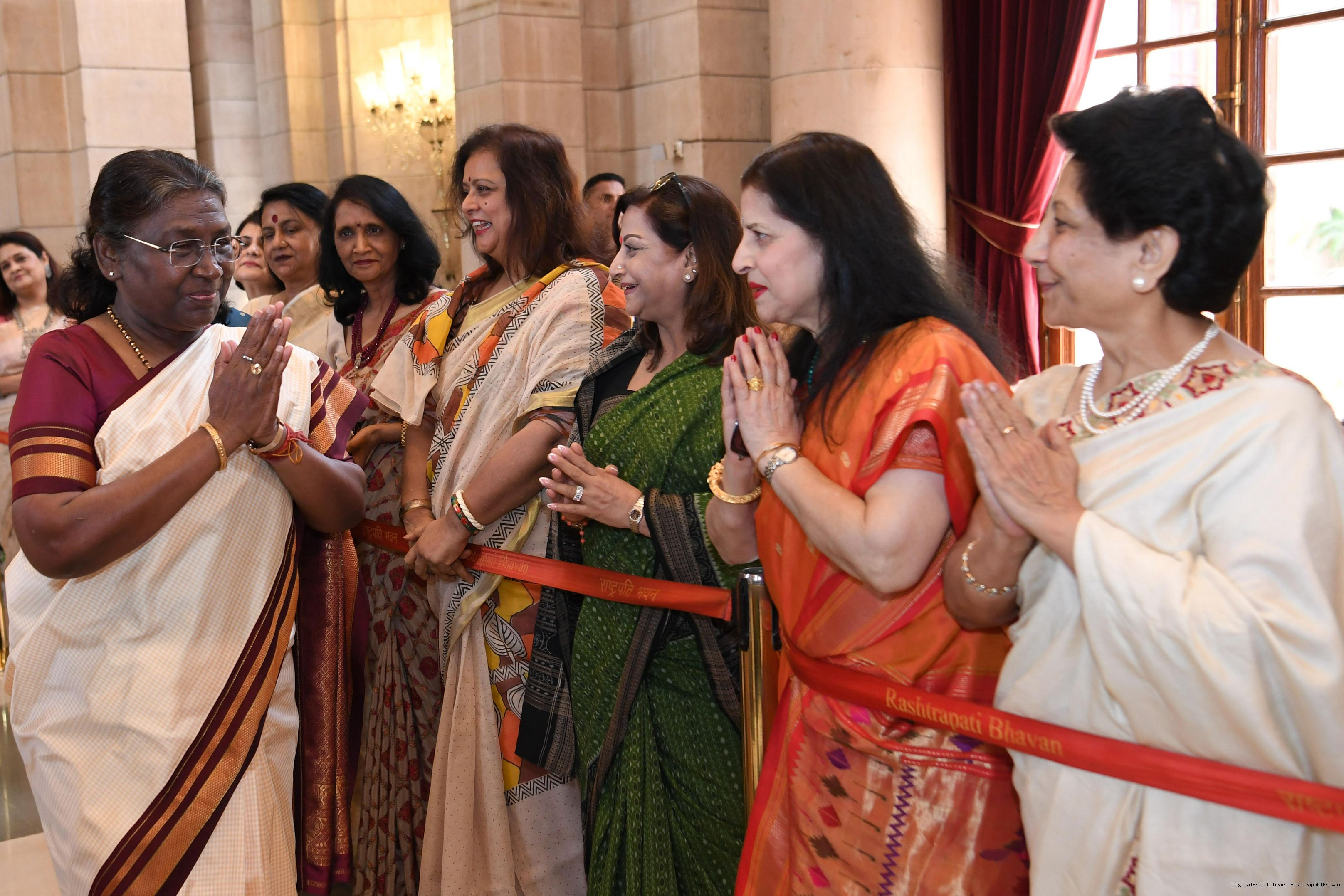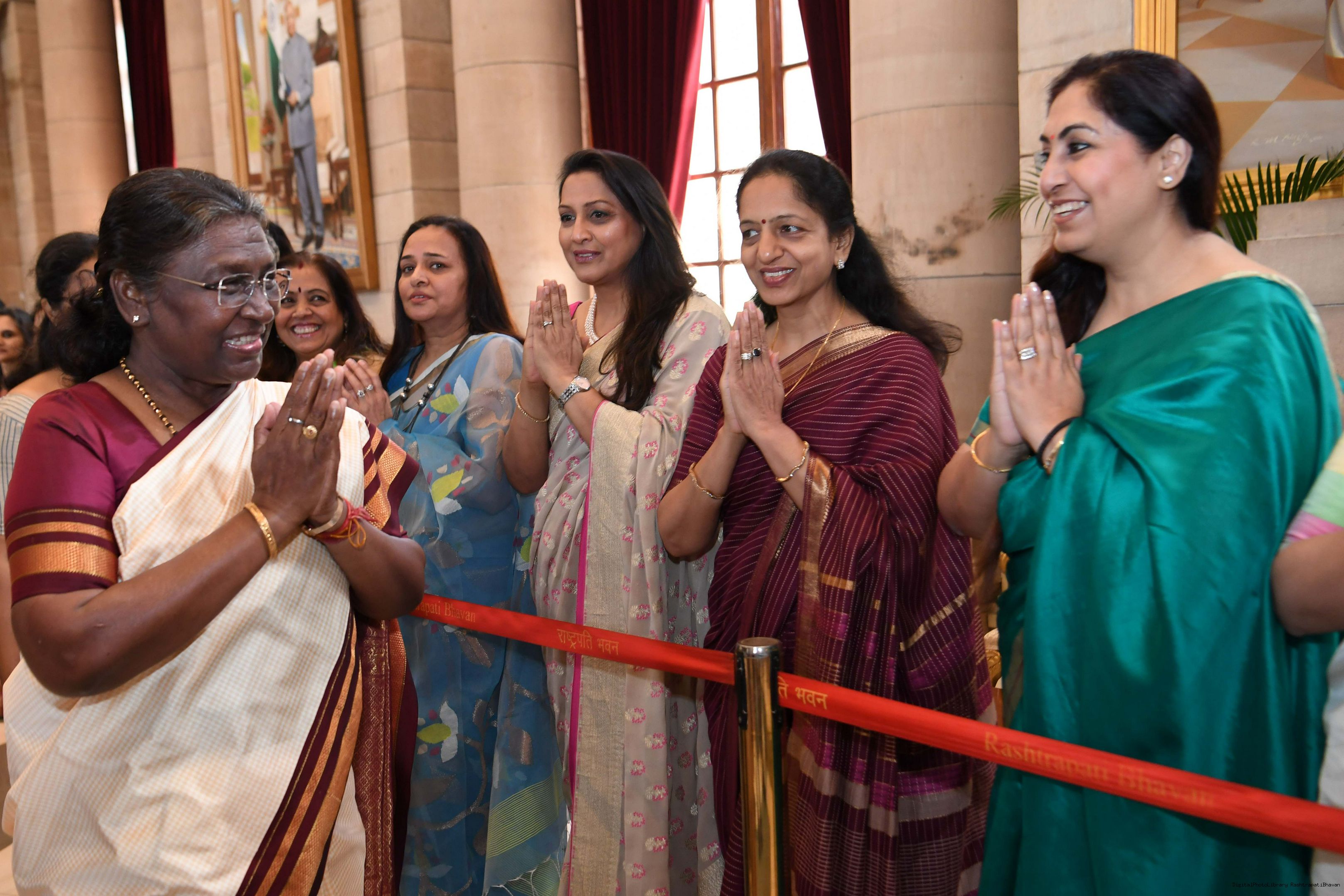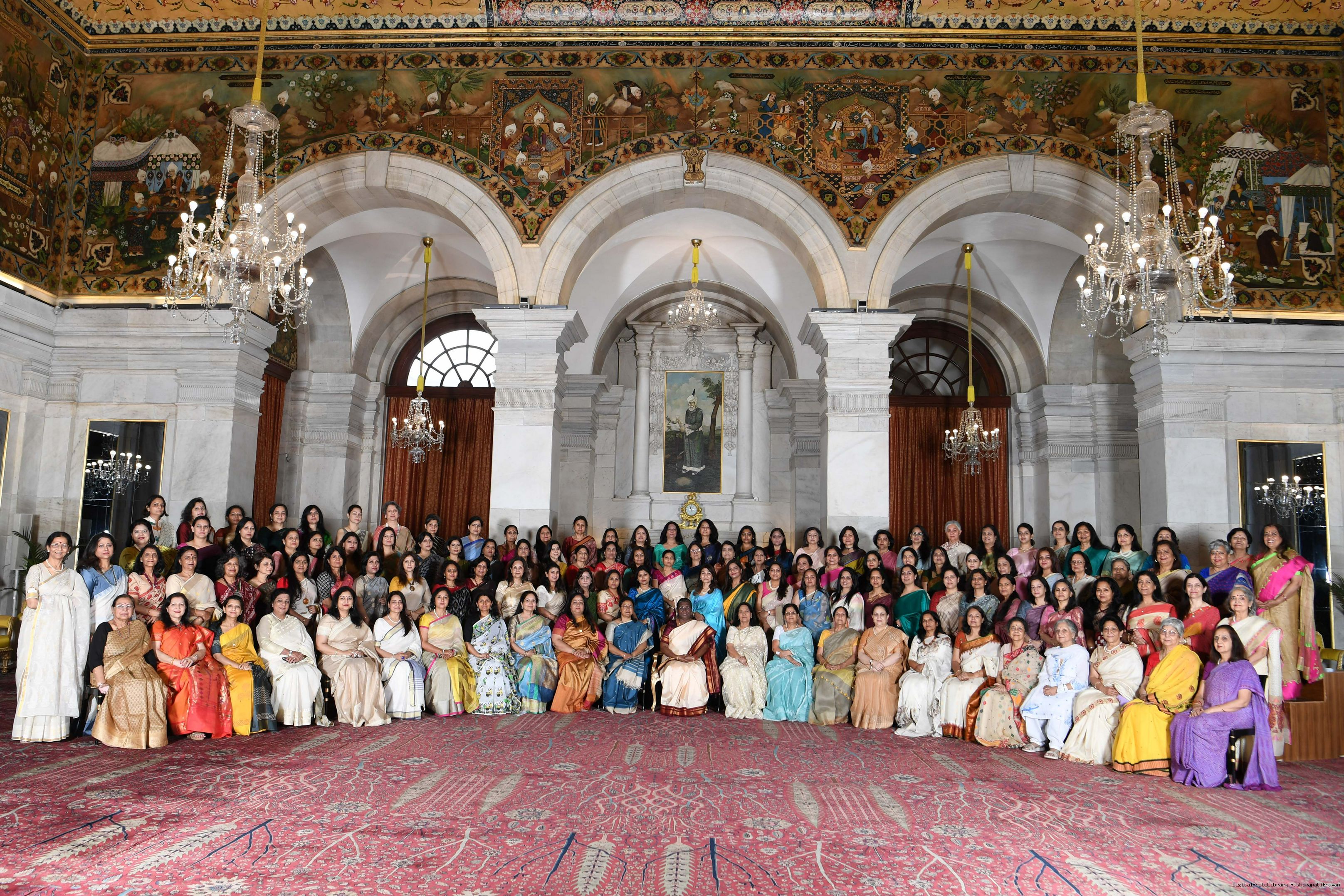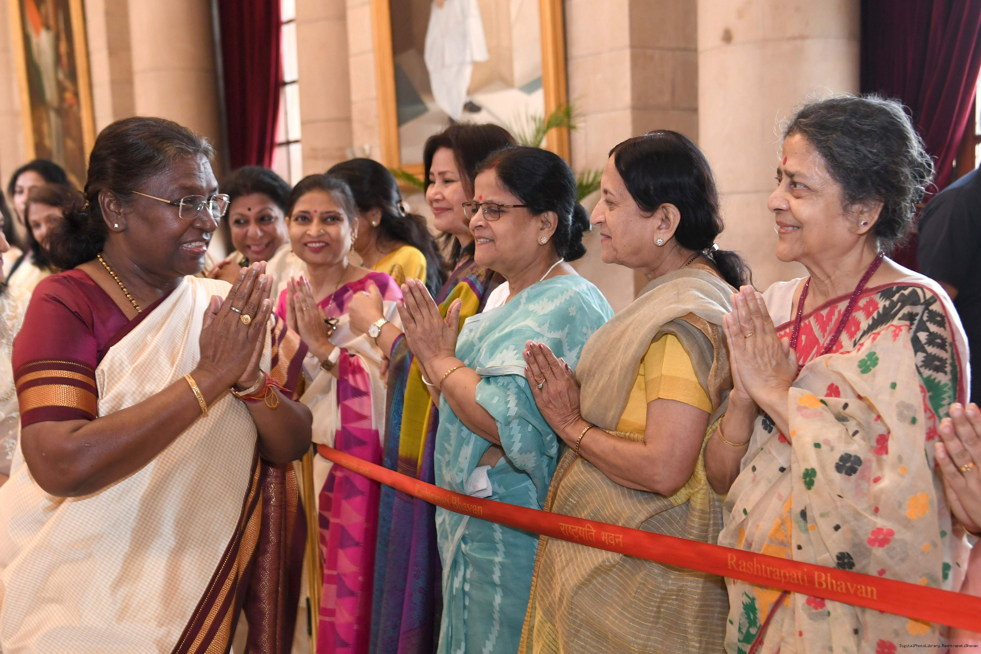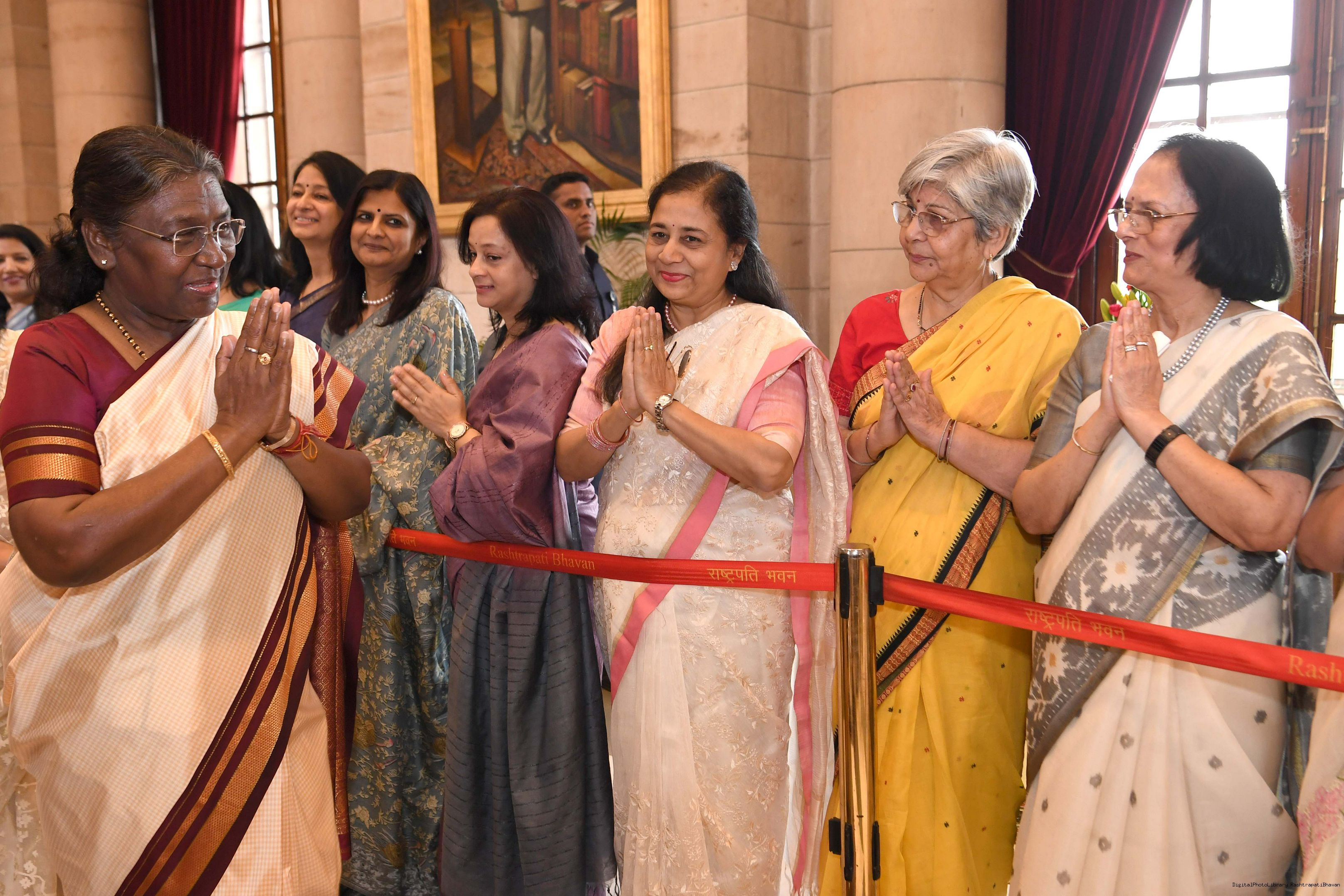 | Caption: | The President of India Smt. Droupadi Murmu posing a Group Photo and Meeting with the members of IPS officer's Wives Welfare Association (IPSWWA) at Rashtrapati Bhawan on April 03, 2024. |