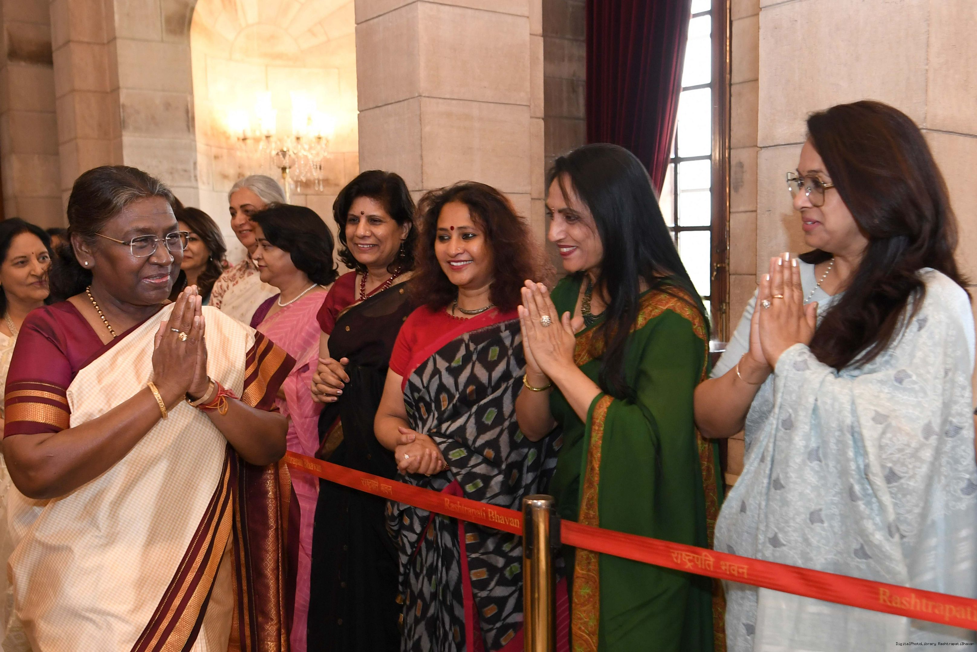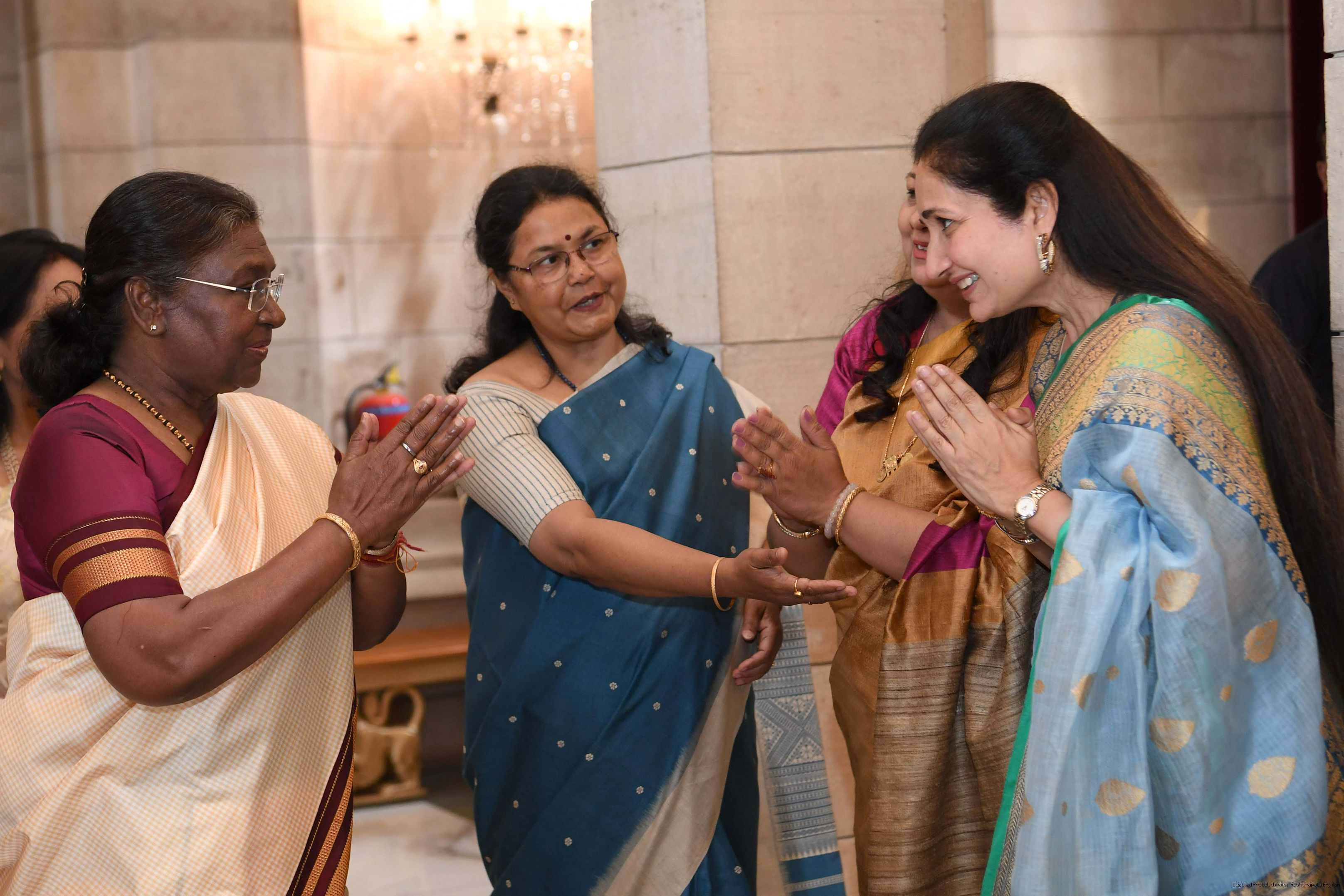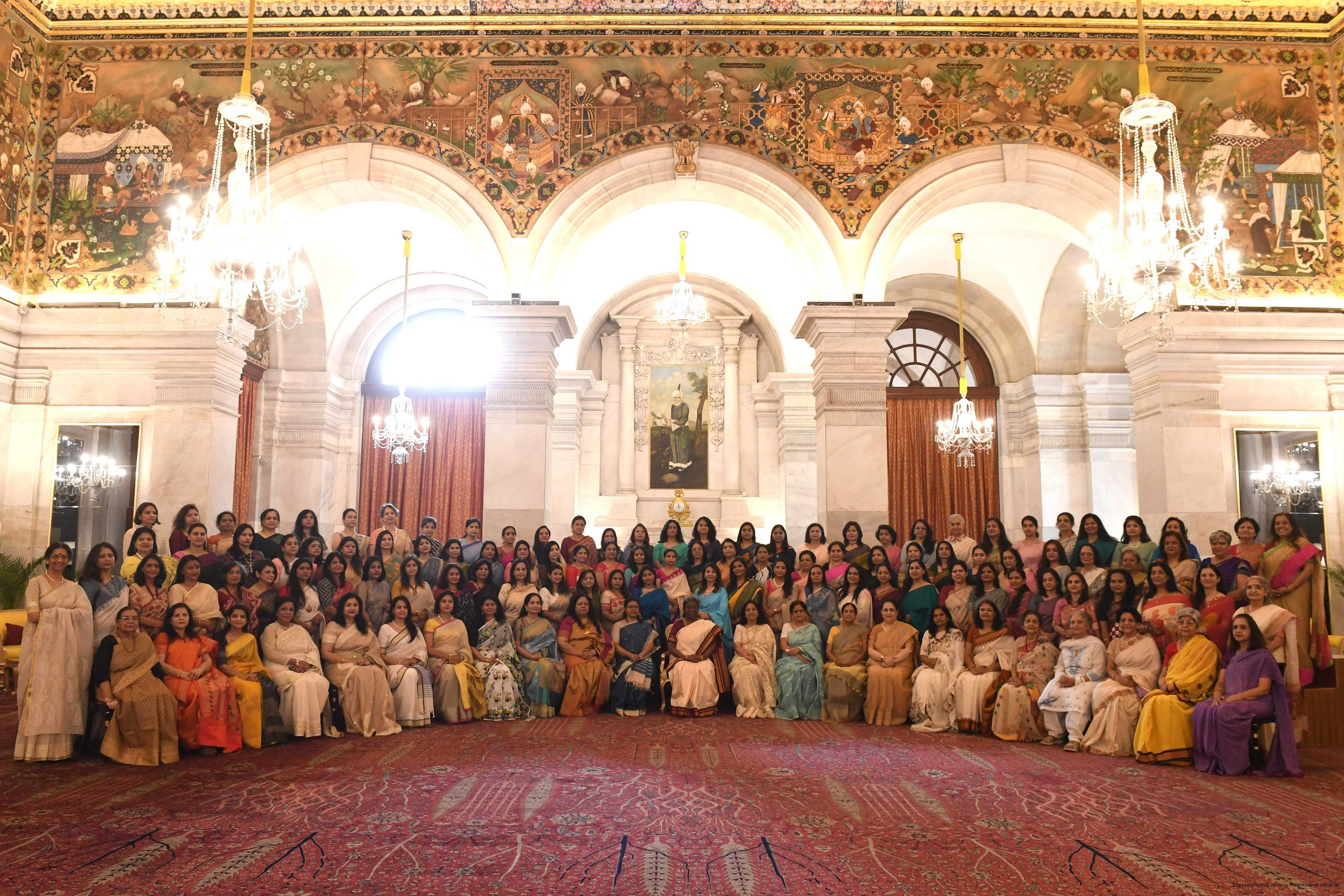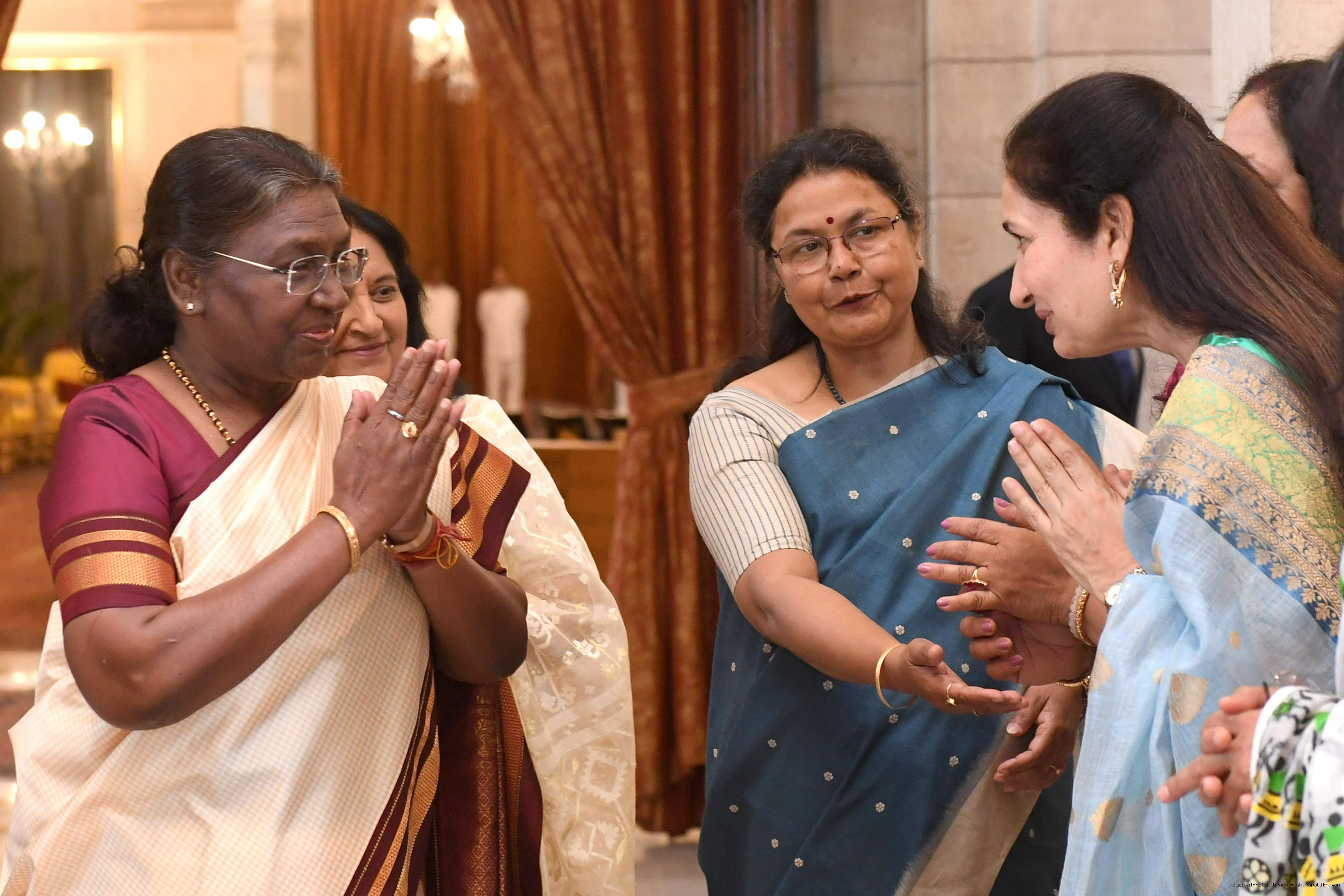 | Caption: | The President of India Smt. Droupadi Murmu posing a Group Photo and Meeting with the members of IPS officer's Wives Welfare Association (IPSWWA) at Rashtrapati Bhawan on April 03, 2024. |
